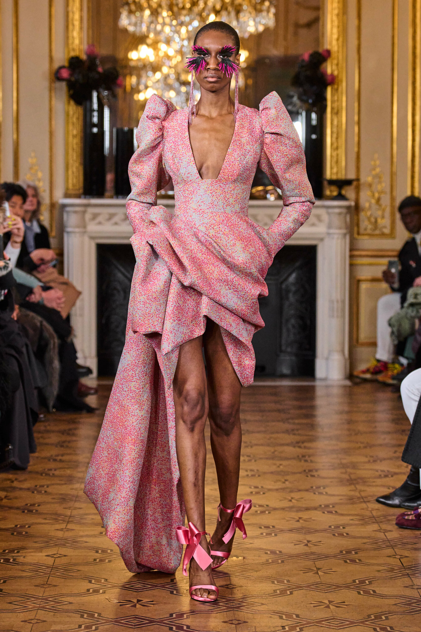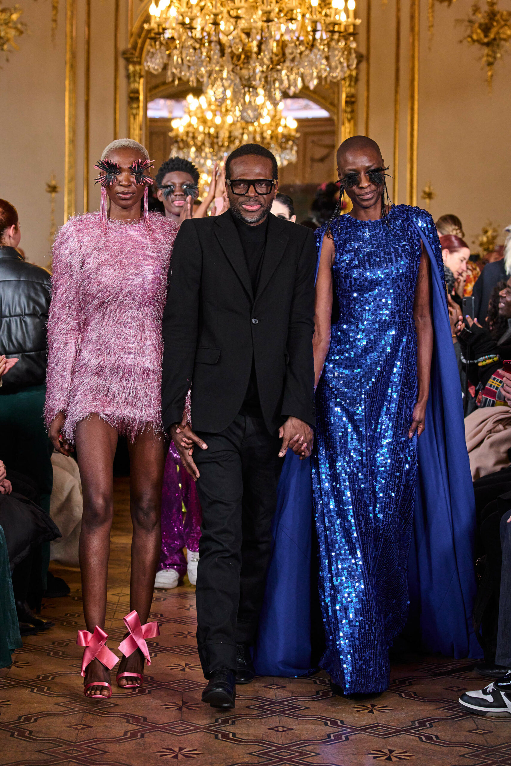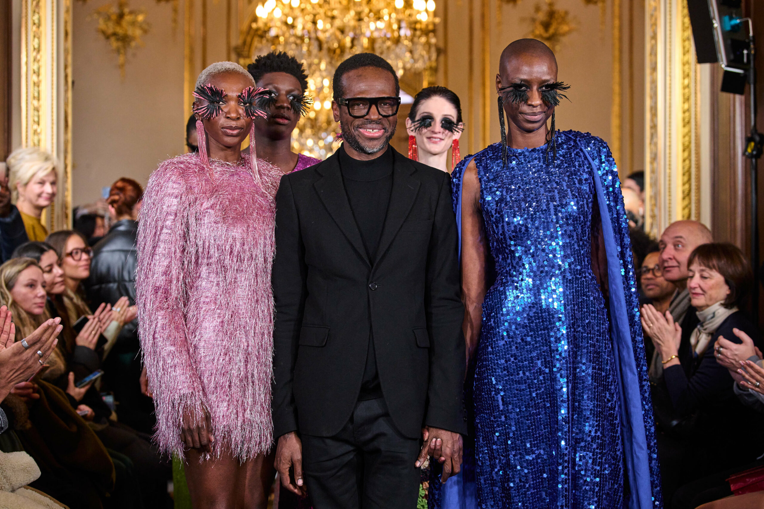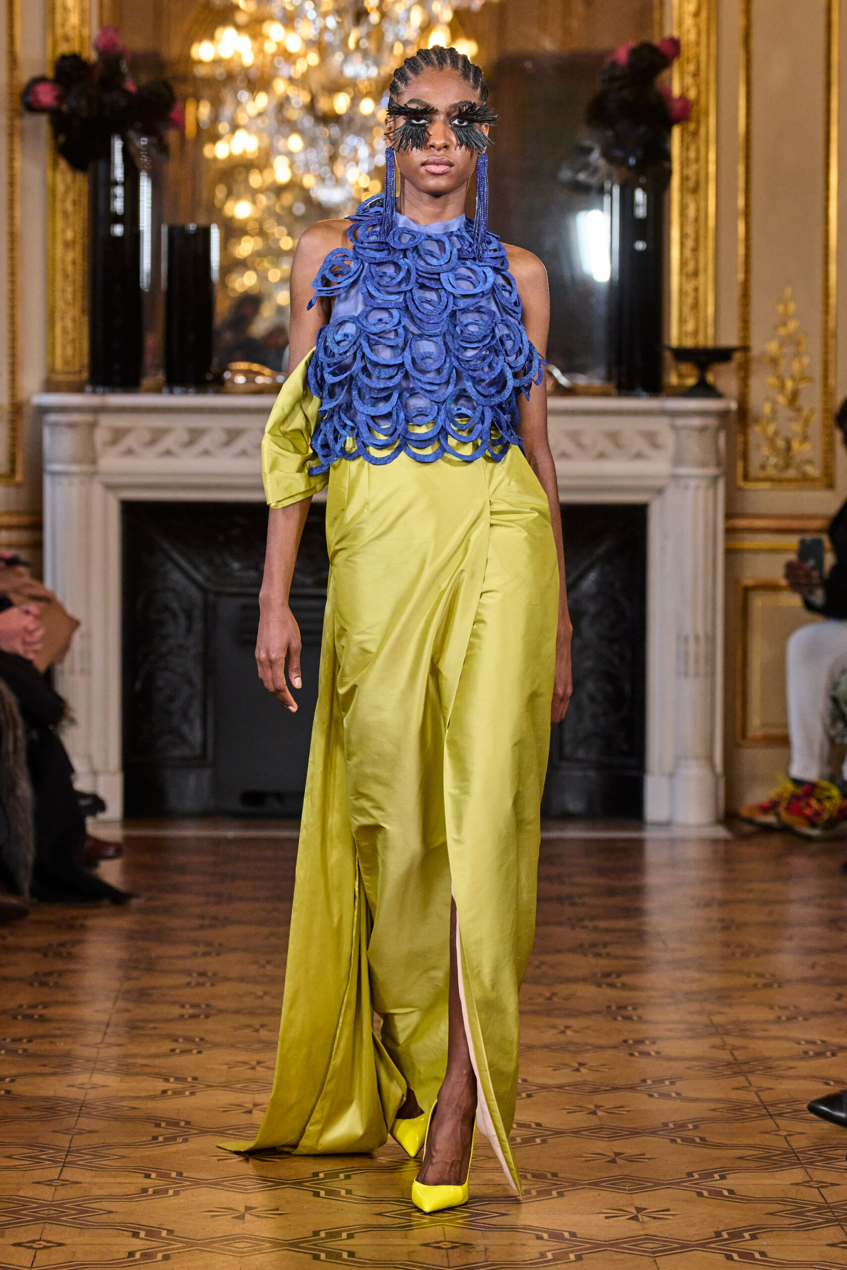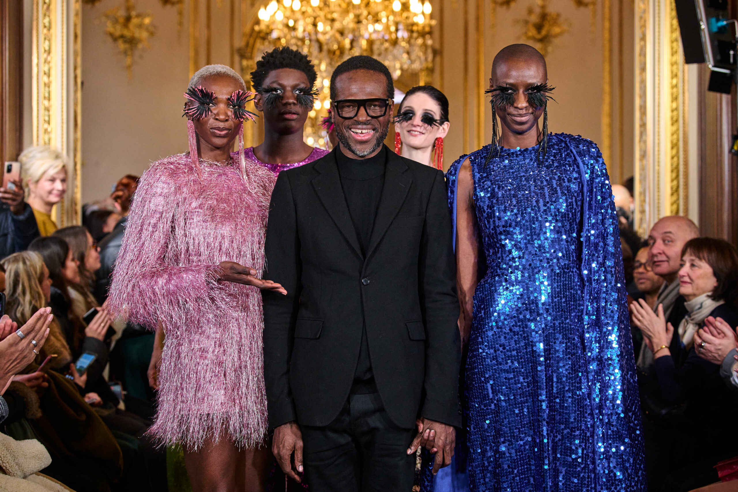 La femme Imane Ayissi ose la couleur avec des tons vibrants tels que le fuchsia, l’orange et le bleu électrique. La sobriété est également présente avec la robe noire emblématique du créateur. Les différentes longueurs des vêtements contrastent avec l’asymétrie qui ne laisse personne indifférent. La beauté métissée est l’objectif de cette collection. Les faux-cils en fibre de raphia, imaginés par Marcello Costa, donnent une touche d’originalité à chaque look.