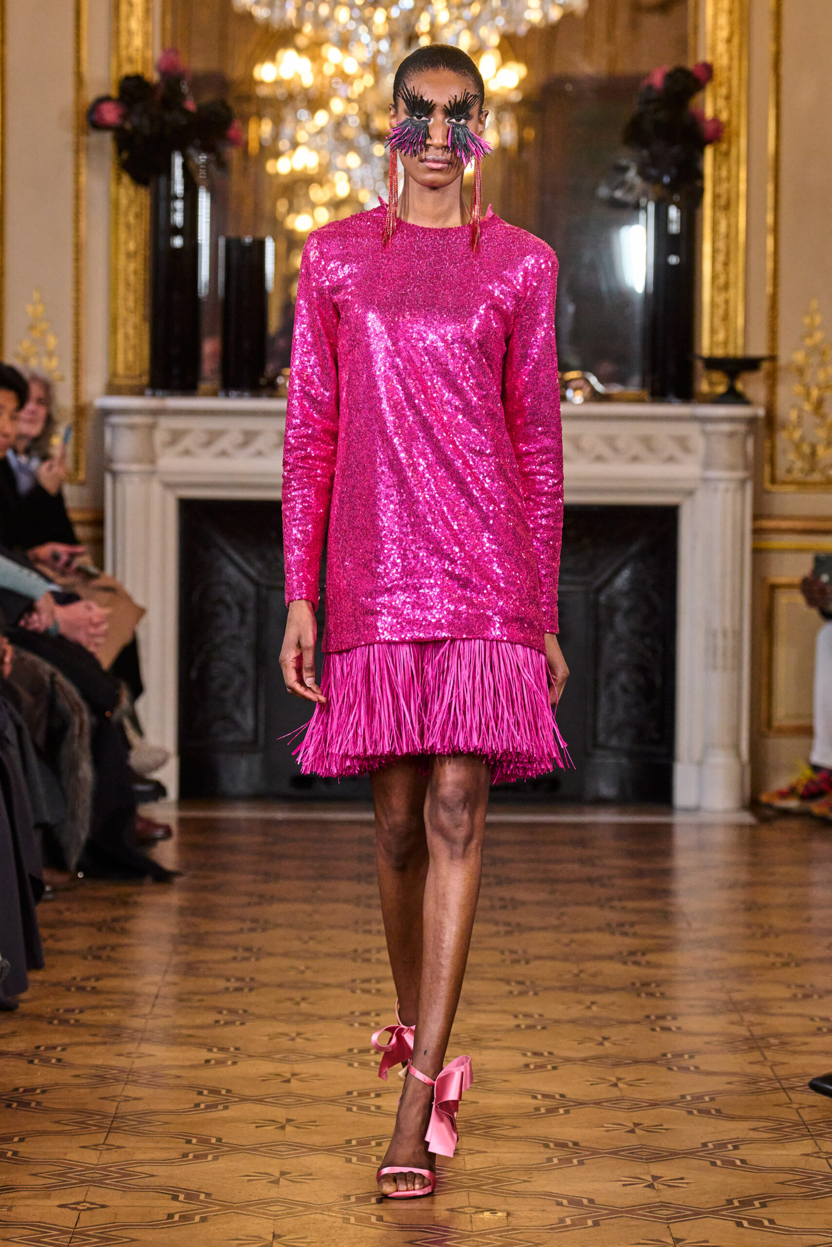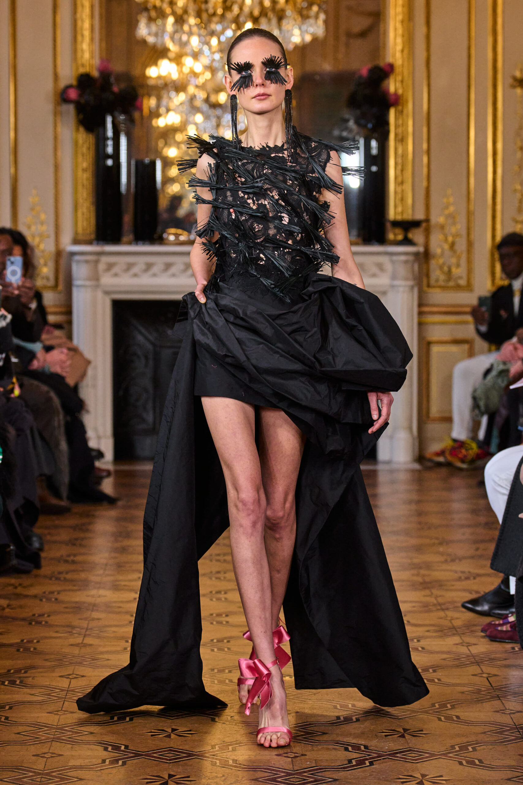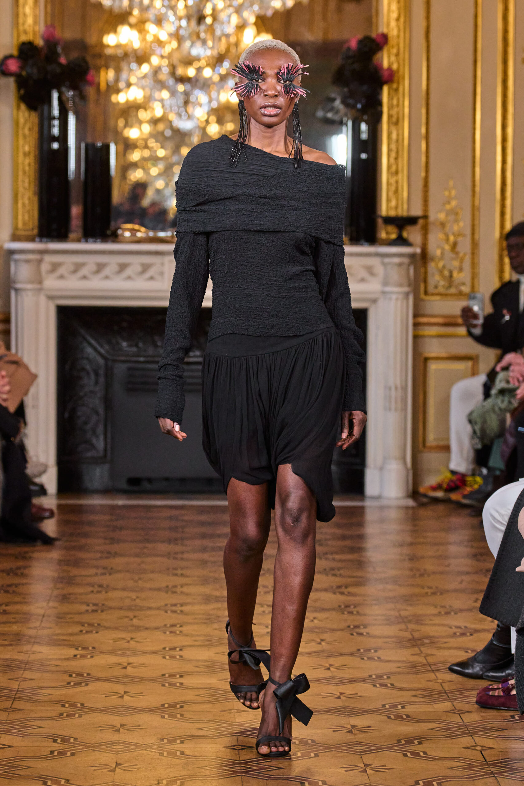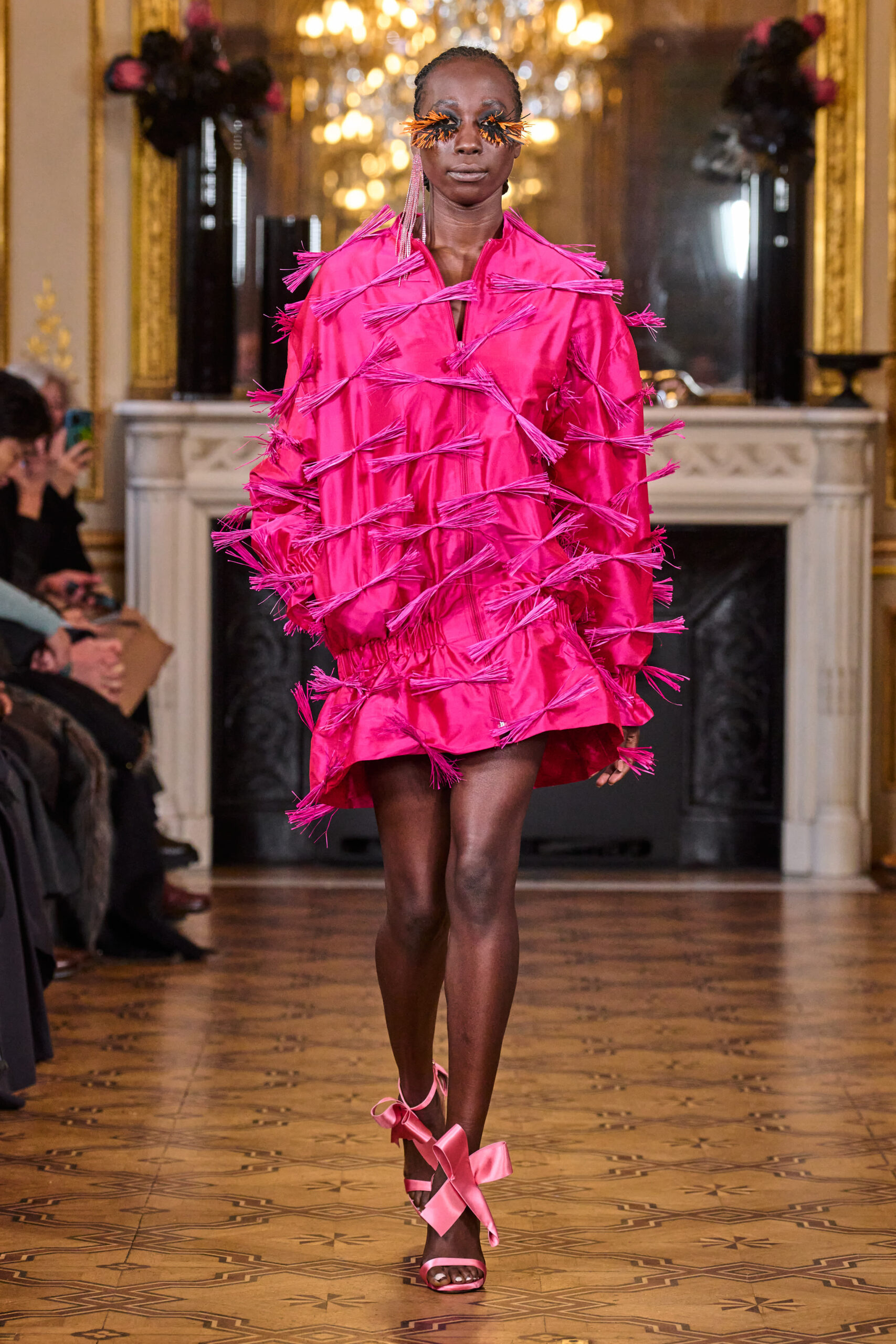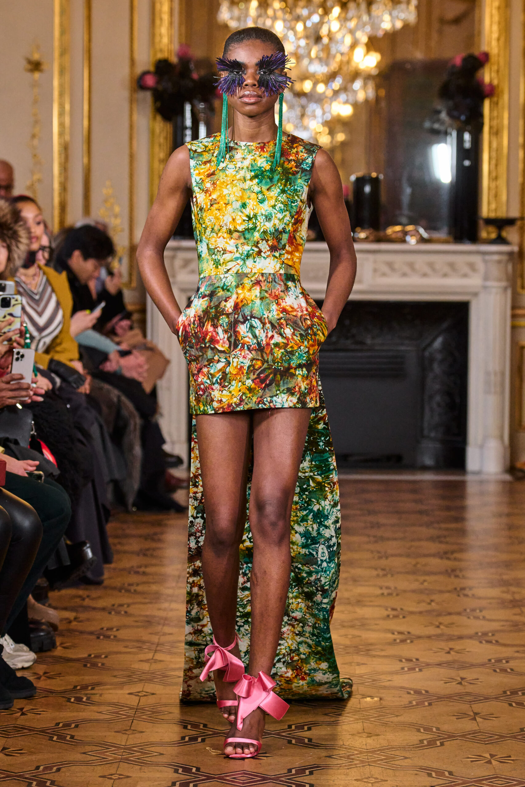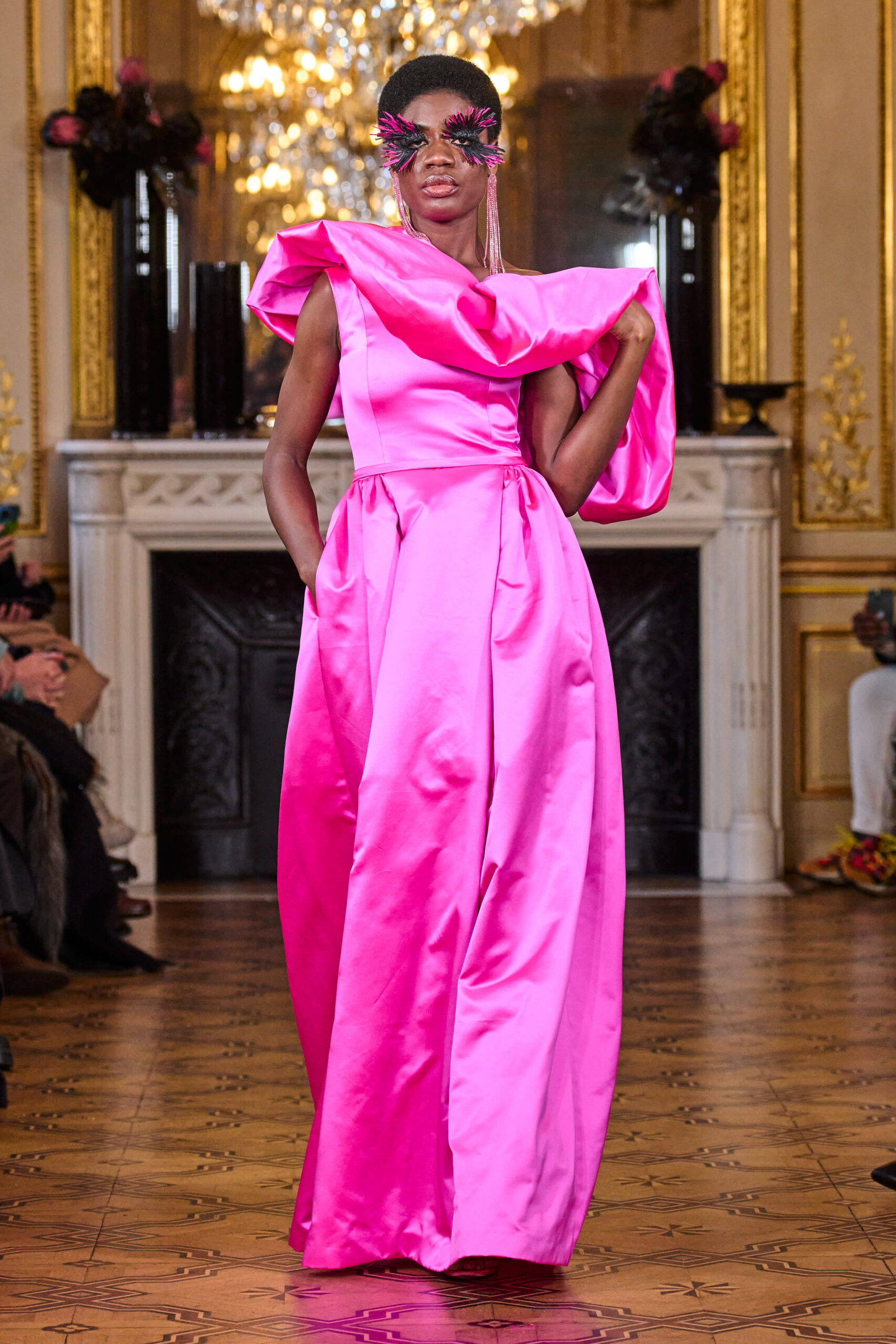 La femme Imane Ayissi ose la couleur avec des tons vibrants tels que le fuchsia, l’orange et le bleu électrique. La sobriété est également présente avec la robe noire emblématique du créateur. Les différentes longueurs des vêtements contrastent avec l’asymétrie qui ne laisse personne indifférent. La beauté métissée est l’objectif de cette collection. Les faux-cils en fibre de raphia, imaginés par Marcello Costa, donnent une touche d’originalité à chaque look.