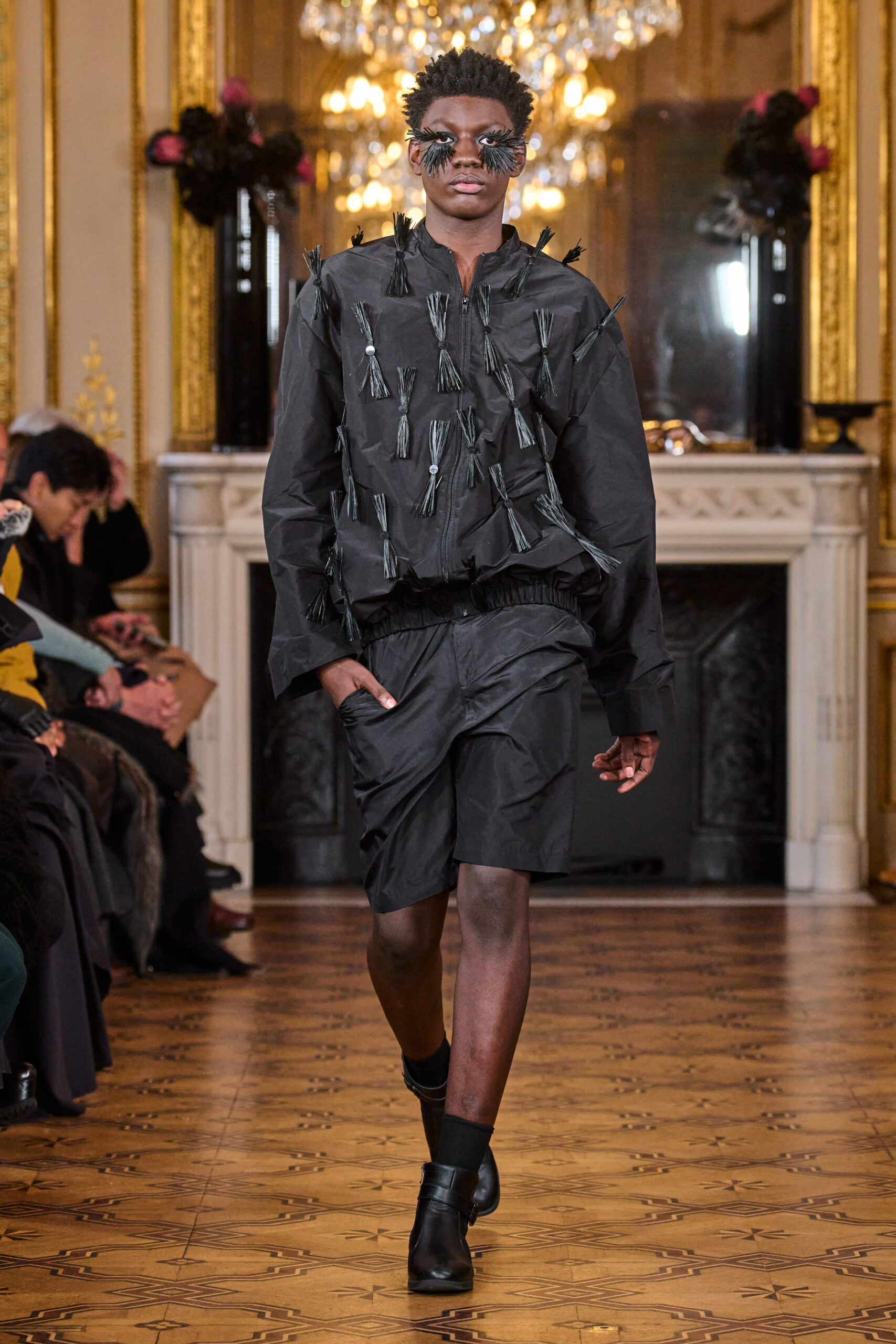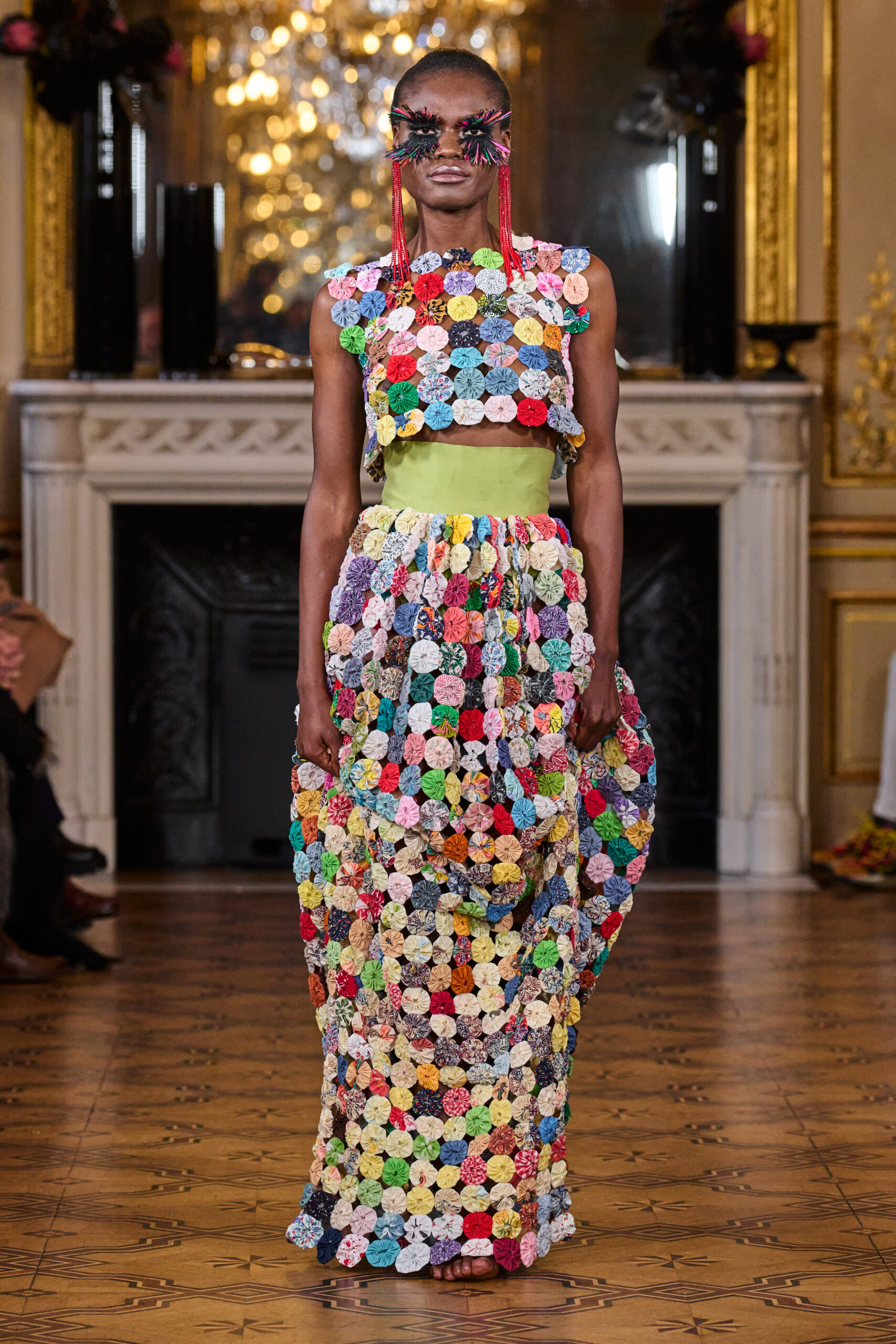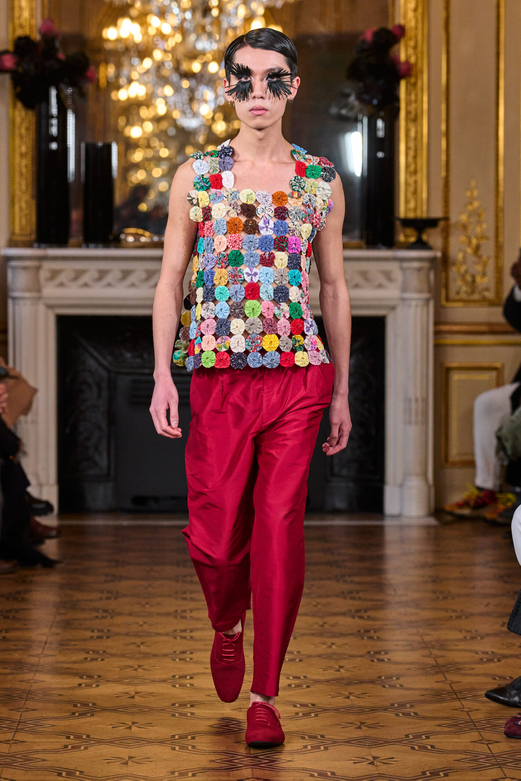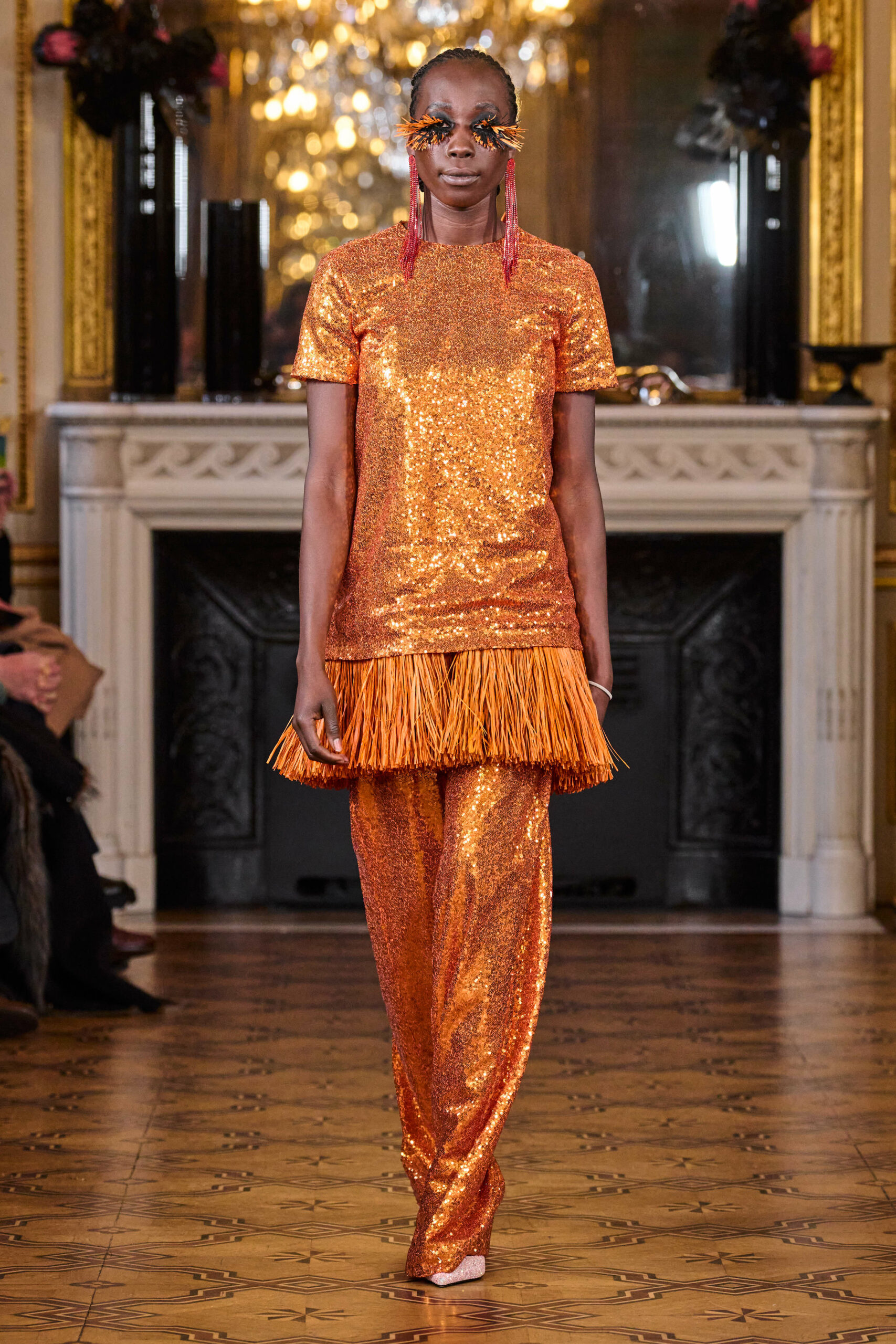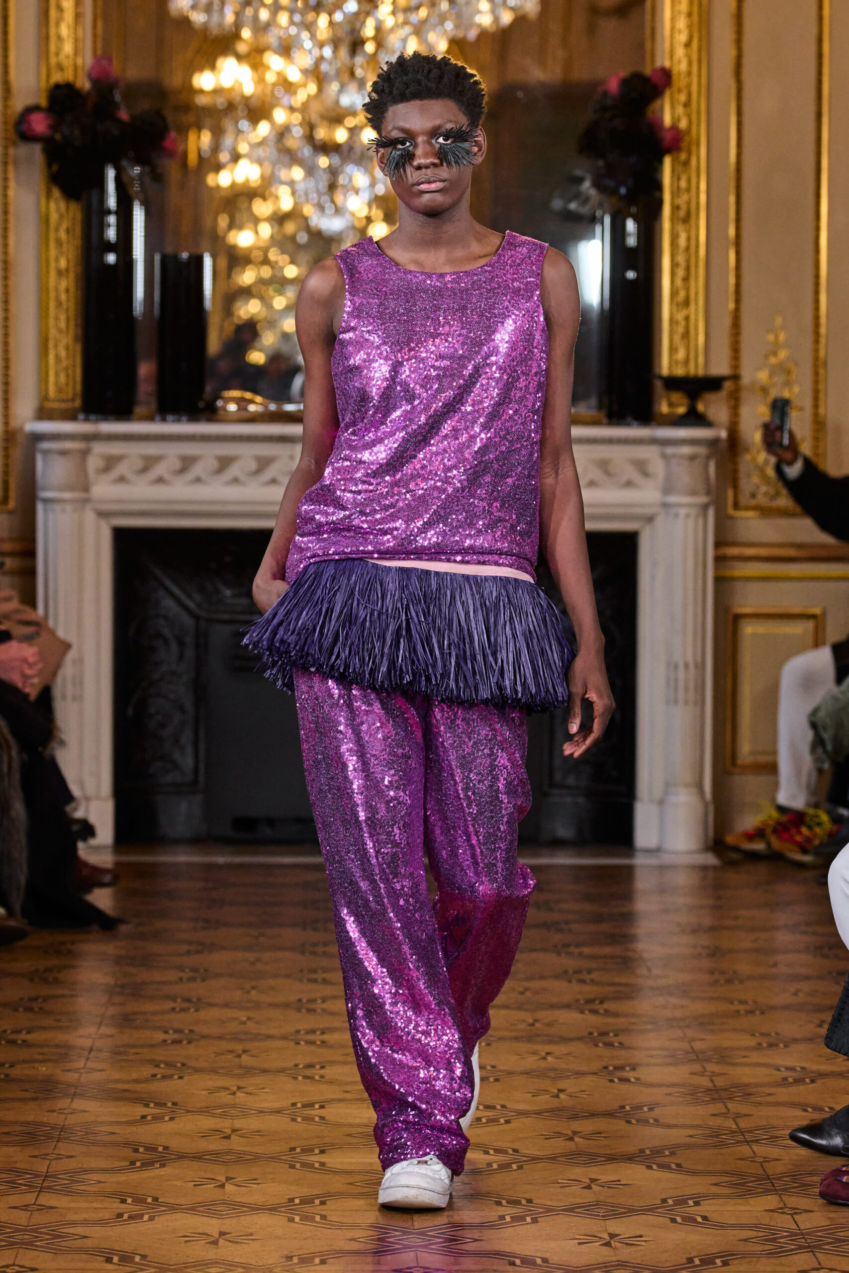 La femme Imane Ayissi ose la couleur avec des tons vibrants tels que le fuchsia, l’orange et le bleu électrique. La sobriété est également présente avec la robe noire emblématique du créateur. Les différentes longueurs des vêtements contrastent avec l’asymétrie qui ne laisse personne indifférent. La beauté métissée est l’objectif de cette collection. Les faux-cils en fibre de raphia, imaginés par Marcello Costa, donnent une touche d’originalité à chaque look.