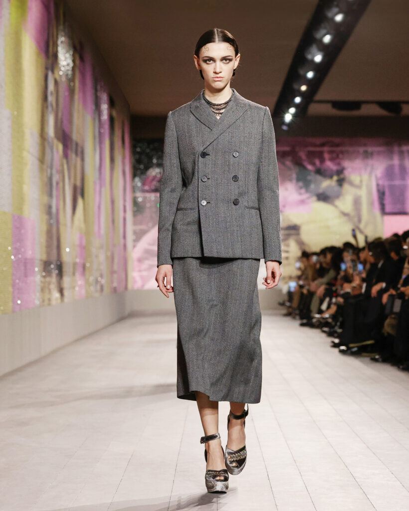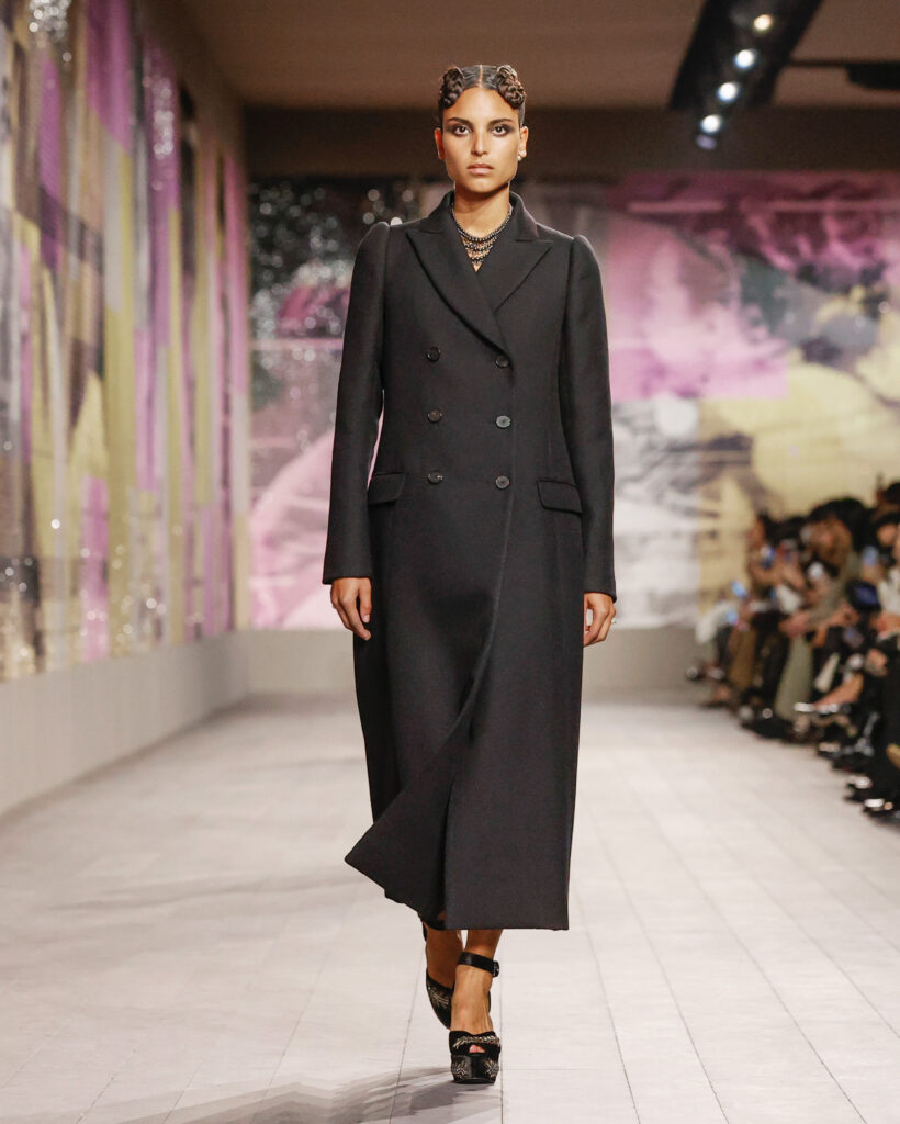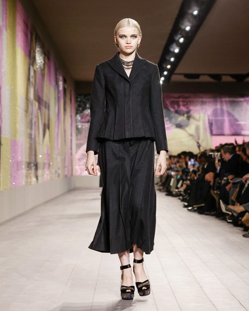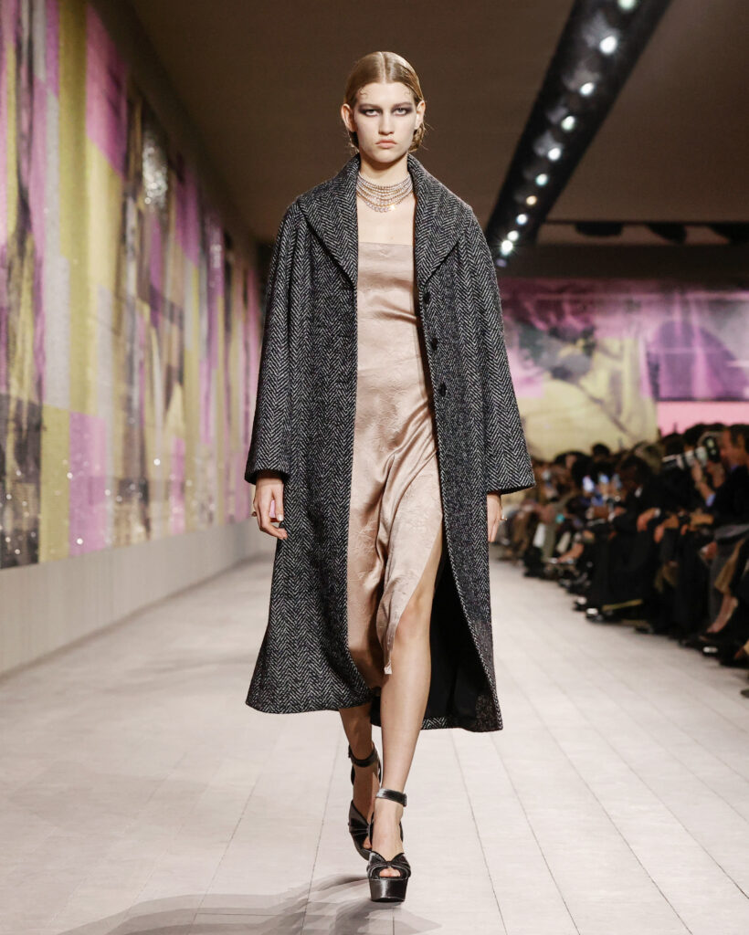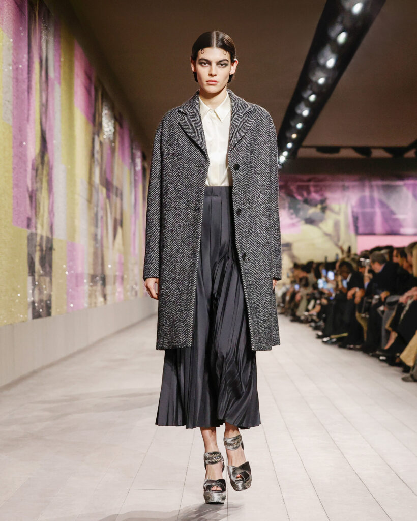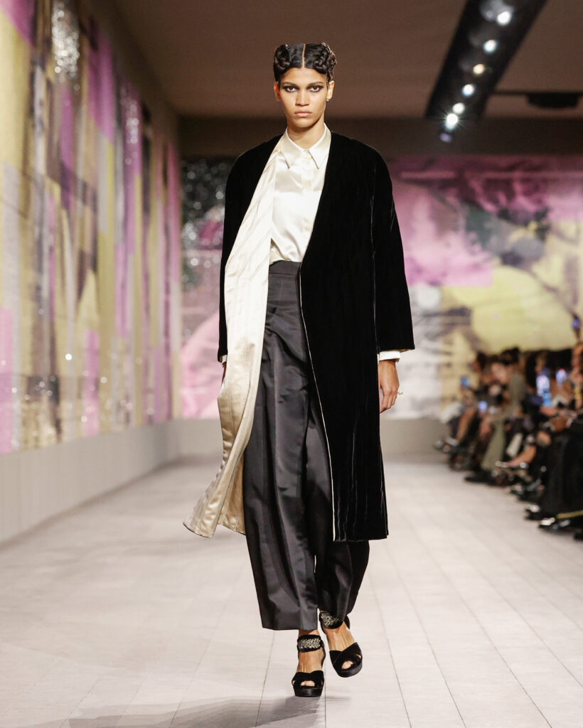 Les tailleurs et les manteaux rendent hommage aux tissus masculins chers à Monsieur Dior, avec une longueur toujours au-dessus de la cheville pour dévoiler des chaussures à talon à la semelle imposante. Le lieu confortable et intime de la loge est évoqué par une série de manteaux en velours froissé et dynamique, ou matelassé, qui s’ouvrent sur des sous-vêtements légers, véritables protagonistes de la collection.