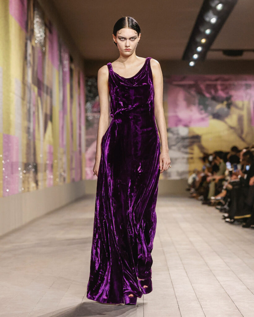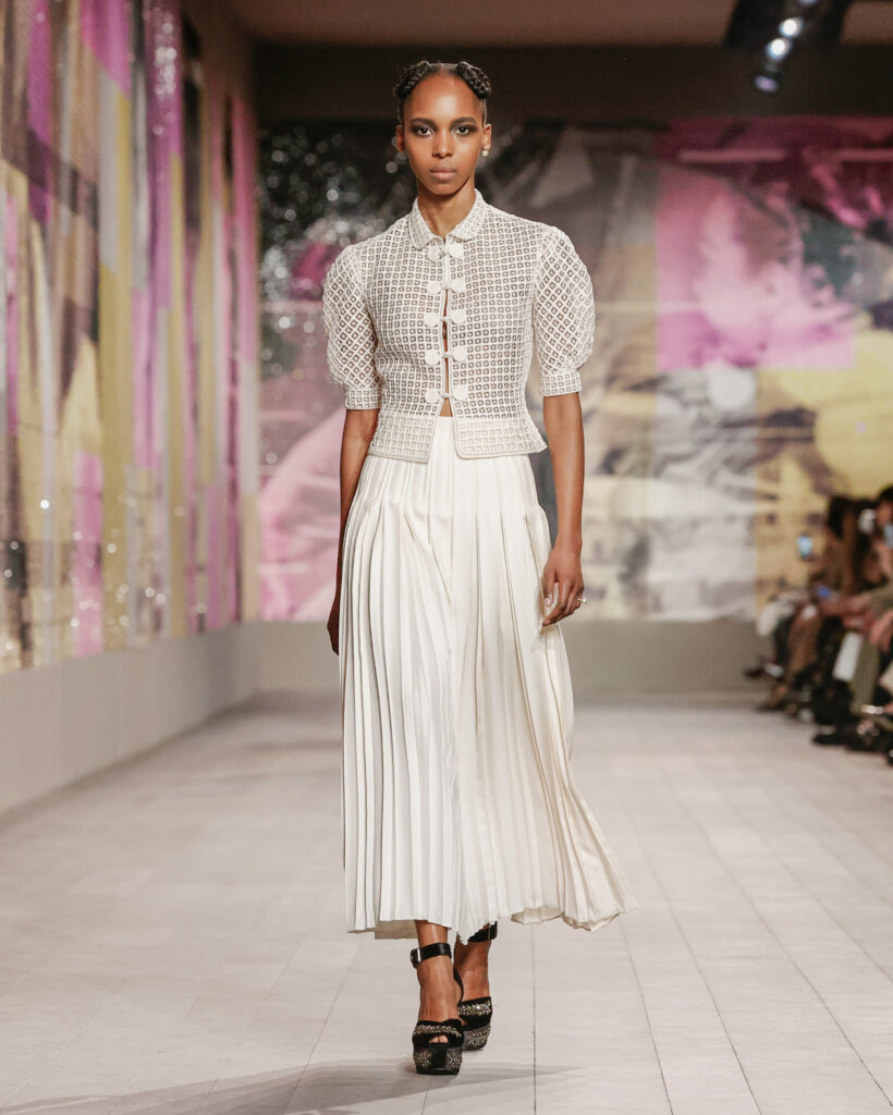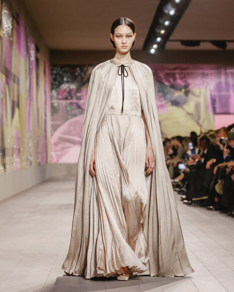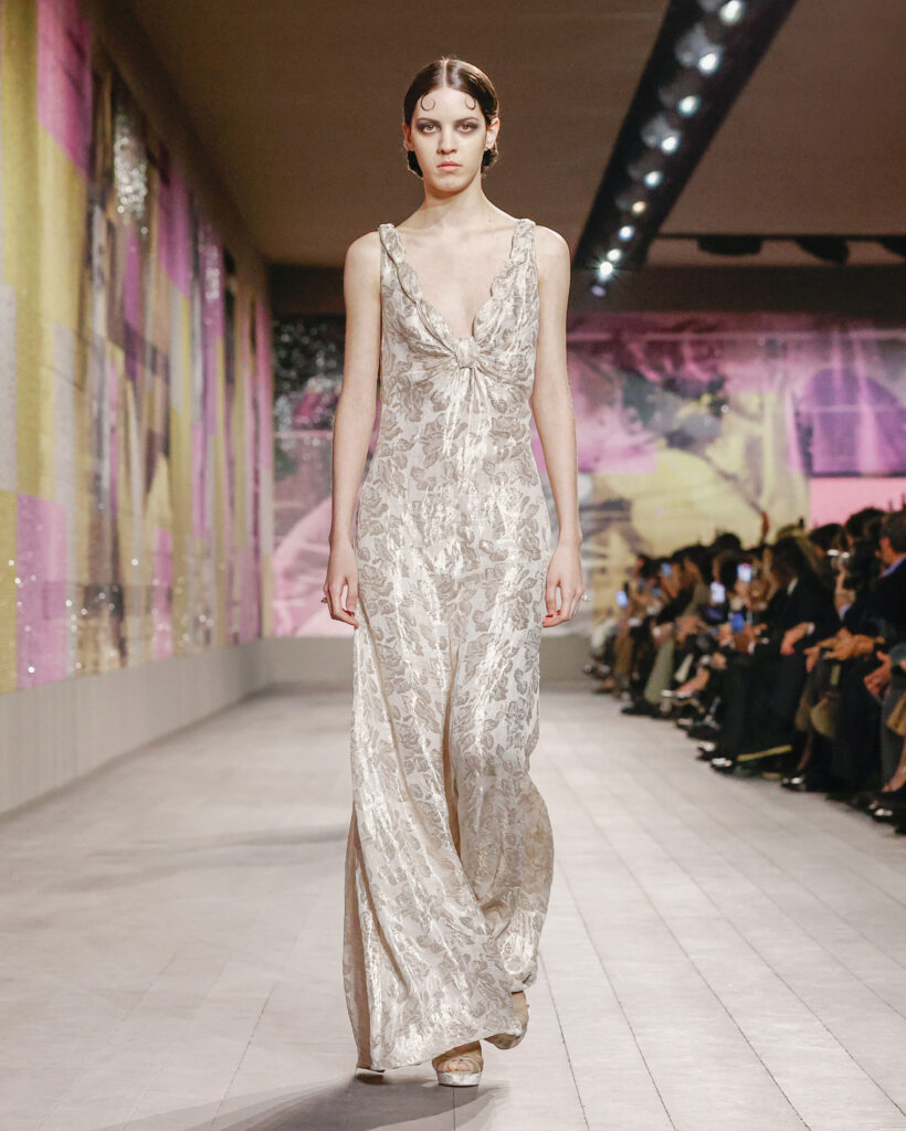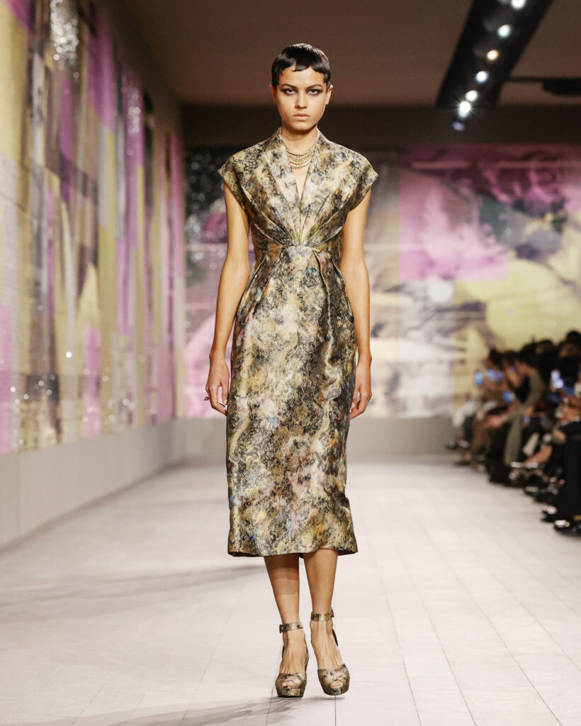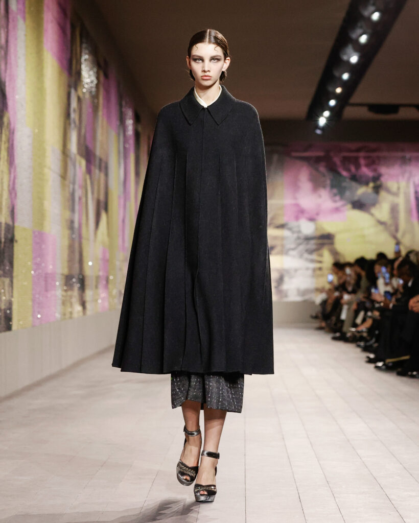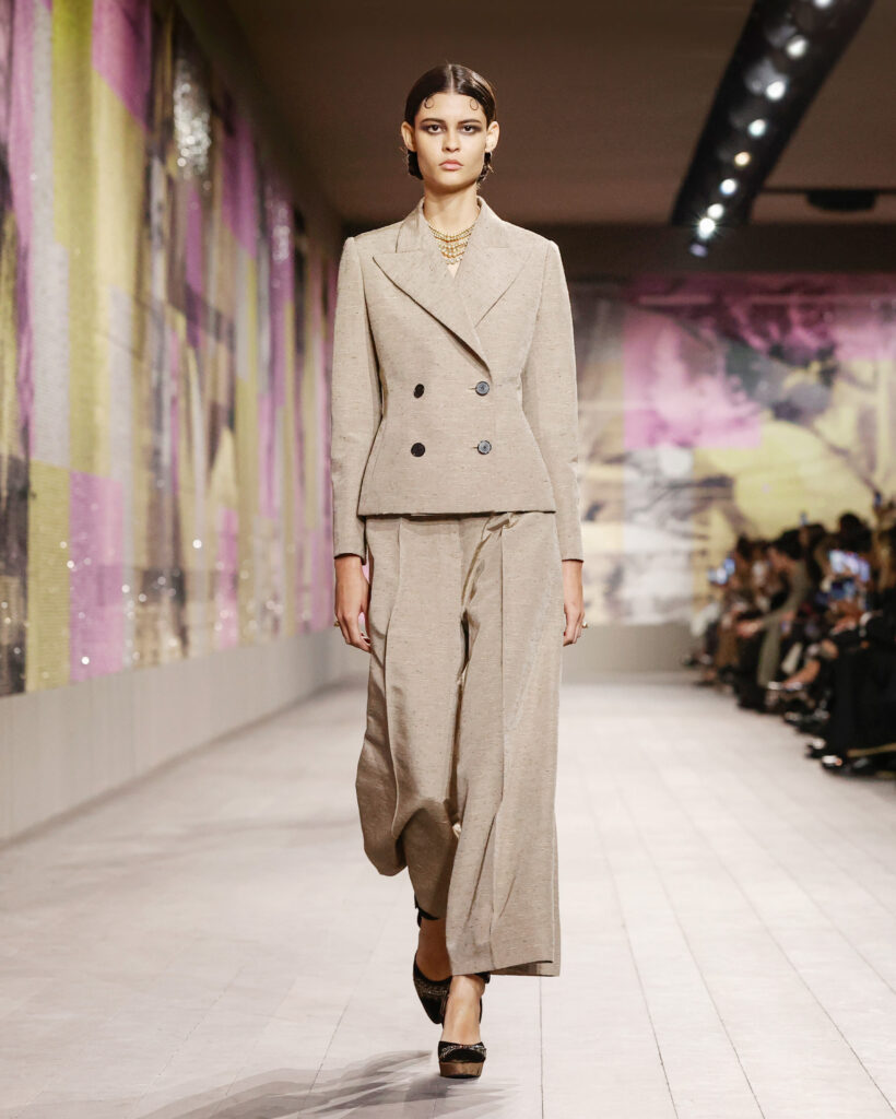 Les tailleurs et les manteaux rendent hommage aux tissus masculins chers à Monsieur Dior, avec une longueur toujours au-dessus de la cheville pour dévoiler des chaussures à talon à la semelle imposante. Le lieu confortable et intime de la loge est évoqué par une série de manteaux en velours froissé et dynamique, ou matelassé, qui s’ouvrent sur des sous-vêtements légers, véritables protagonistes de la collection.