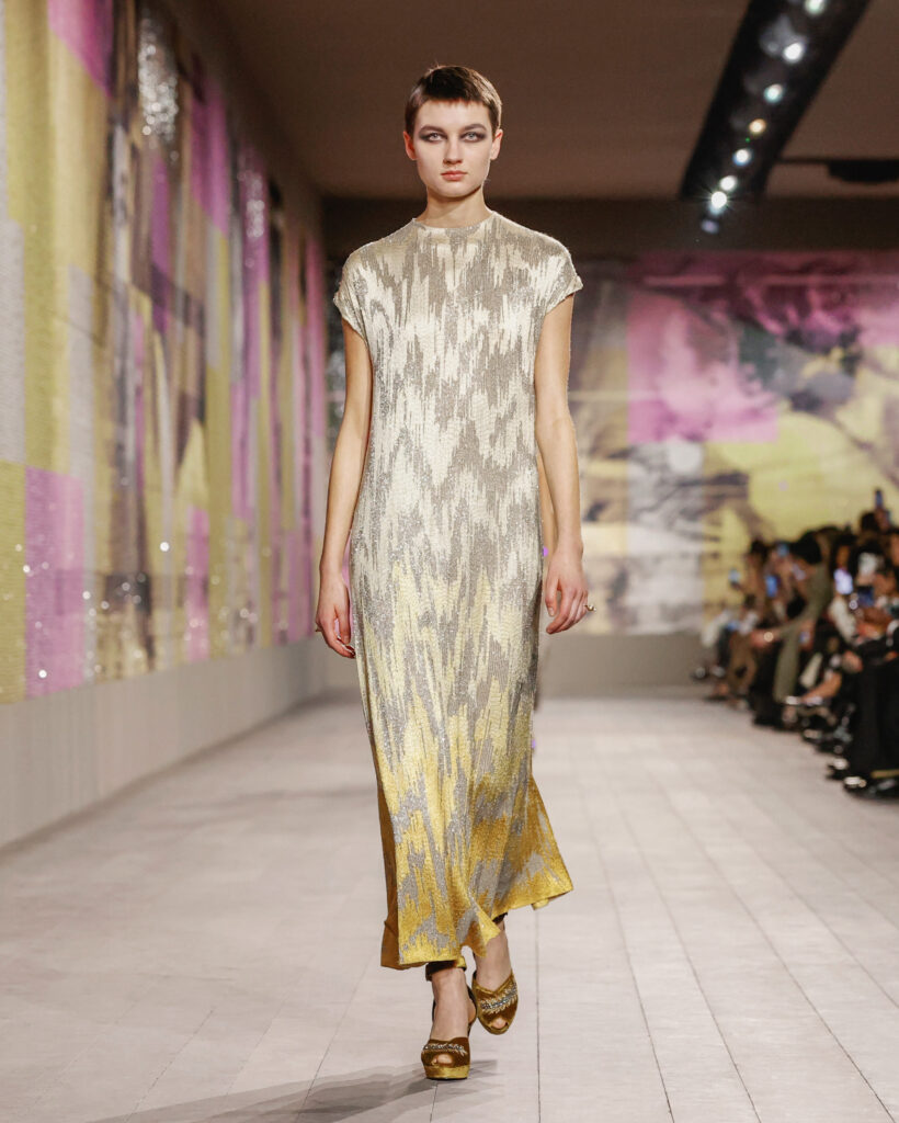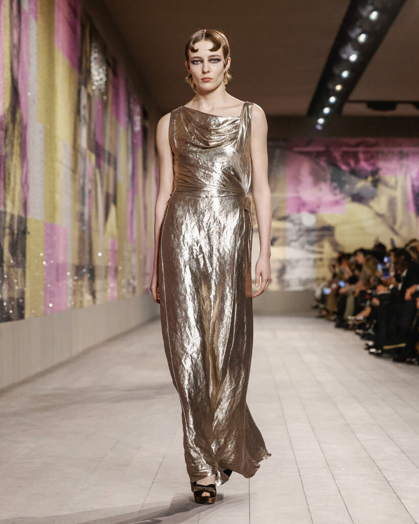 Les sous-vêtements légers en satin, déclinés en couleurs poudrées jusqu’au noir, sont l’interprétation contemporaine des tenues des années 1950. Les broderies sont fines et de petits clous argentés ainsi que des minuscules paillettes investissent l’espace pour refléter la lumière du podium sur le public. Les franges en dégradé d’argent et d’or magnifient les chorégraphies des mouvements esquissés par le corps.