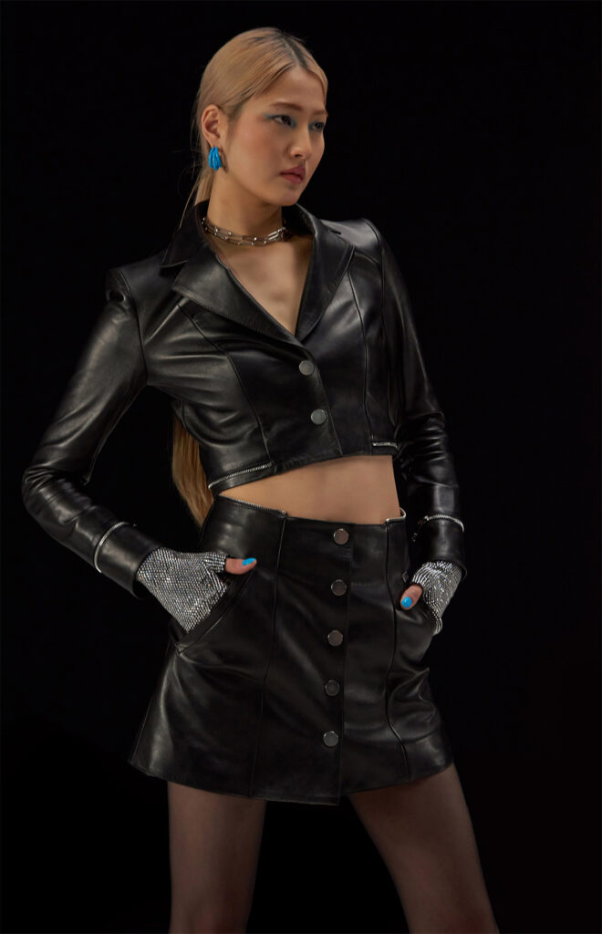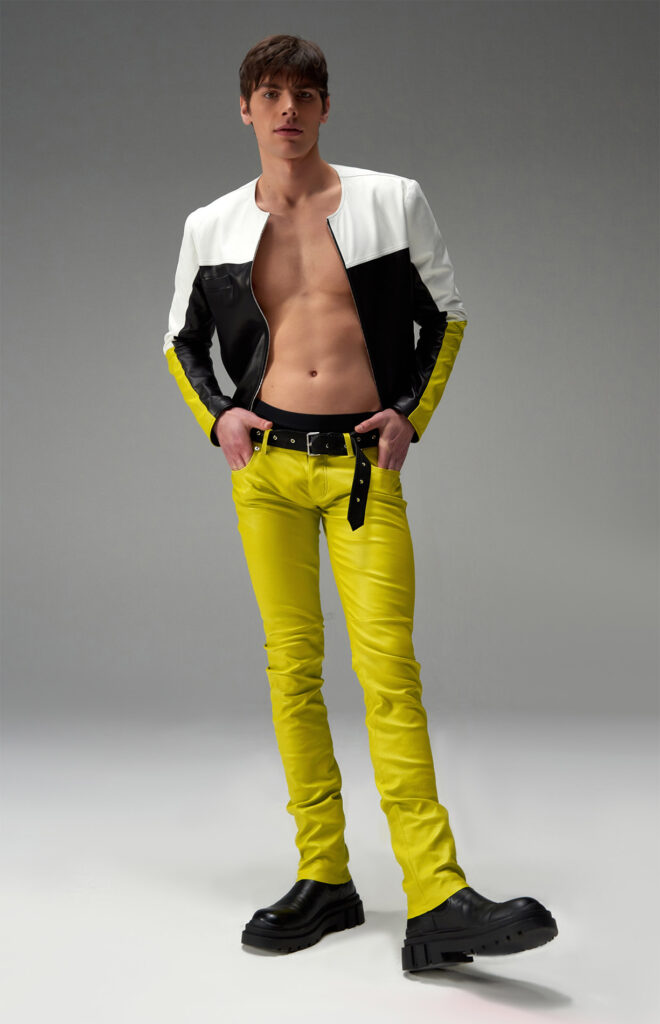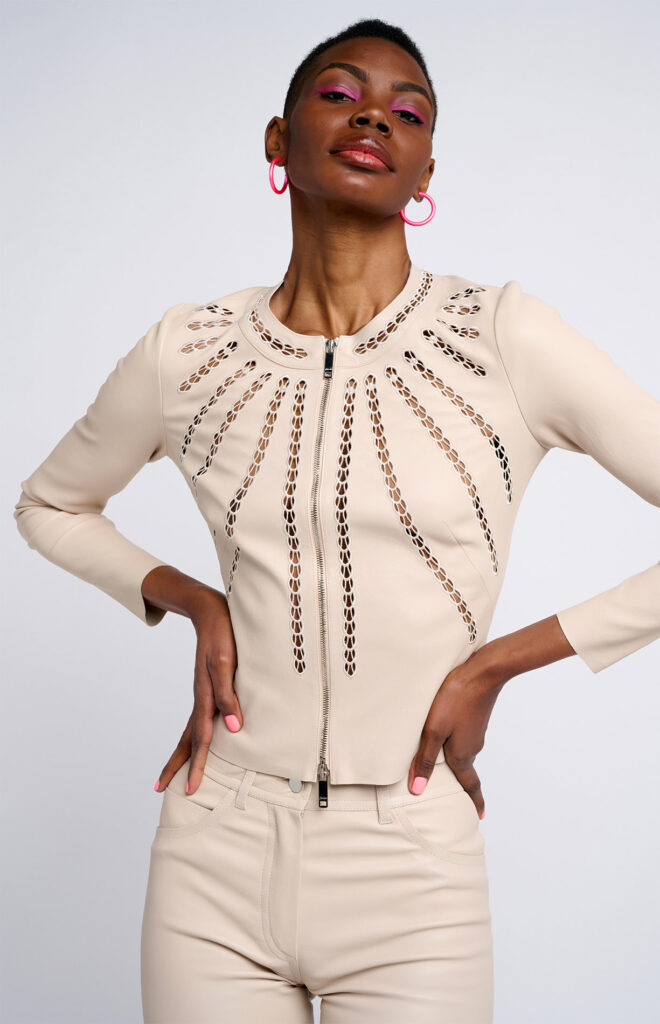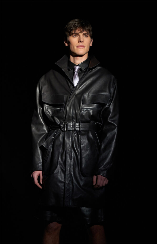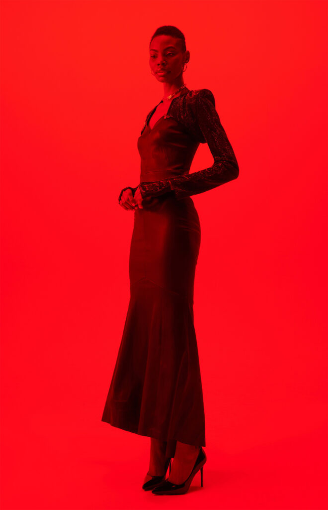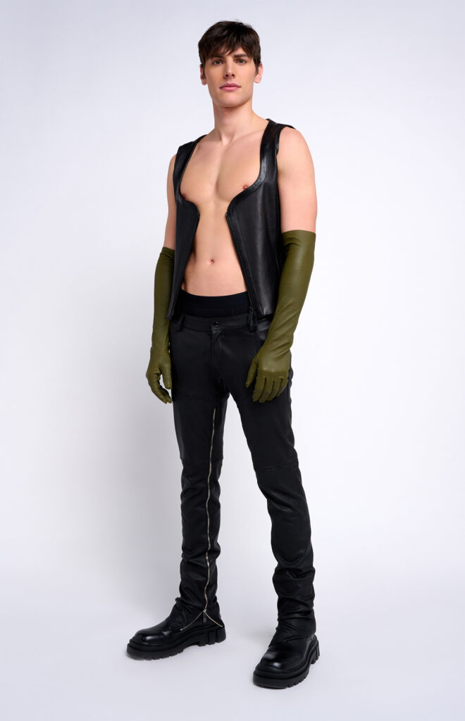 La fermeture éclair apparente, un élément fétiche de Jitrois, a trouvé de nouvelles esthétiques dans la collection AH23/24, permettant à la personne qui la porte d’être toujours plus maîtresse de son apparence. Les vestes peuvent être ouvertes à la taille ou aux manches, les robes de l’encolure à l’ourlet, et tout du long sur certaines pièces, pour dissimuler ou révéler la surface de peau ou de corps requise selon l’occasion. Dans ce mariage texturé de matériaux technique contre la peau, le cuir stretch donne un effet contemporain qui dégage une sexualité intemporelle pour tous. De fines broderies de cuir sont également utilisées pour dessiner des motifs sur la peau, parfois par le biais de formes découpées de manière complexe, ou de motifs audacieux sur résille. Les pièces font un clin d’œil subtil à la rébellion historique des tatouages, mais par le biais de la couture.