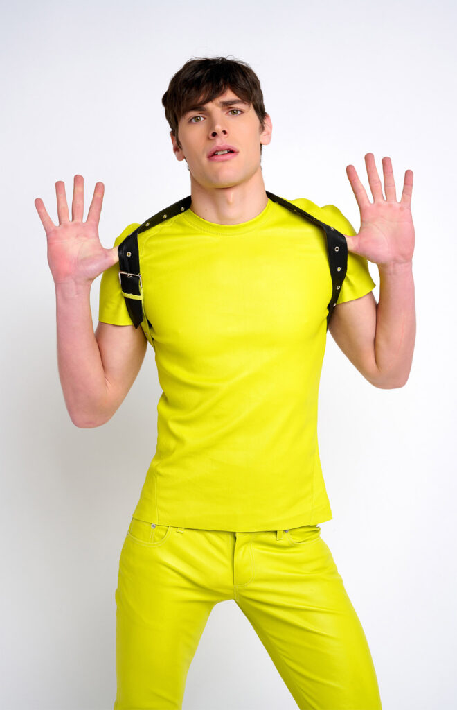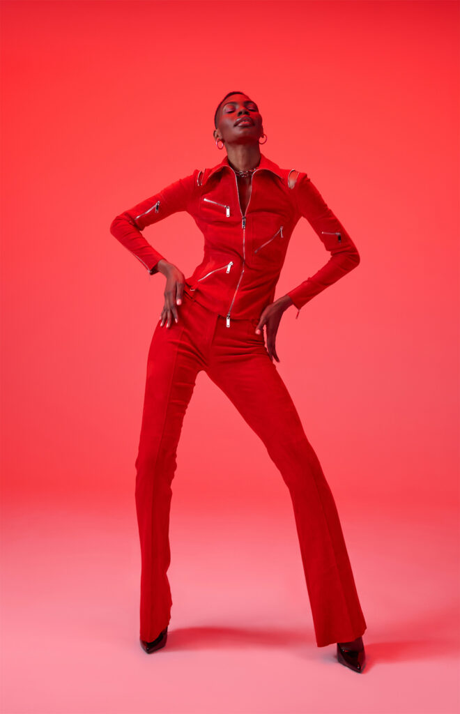 L’éclat des fêtes et des possibilités brille dans l’obscurité des nuits d’automne et d’hiver. Grâce aux anoblissements en cristal Swarovski et aux cuirs métalliques rayonnants en lilas et en or rose, Jitrois transpose sur la scène moderne la décadence du Saint-Tropez légendaire des années 1980. Ces matières lumineuses exhalent la réputation sulfureuse et l’histoire chérie de la maison. Présents dans des robes, des boléros, des guêtres, des gants, des écharpes, etc., ces pièces et ces accents confèrent à la collection un niveau élevé de glamour et de luxe qui attire le regard du public et l’éclat des lumières stroboscopiques, ici sur fond de nuit et de couleurs vives et sensuelles pour une énergie débordante. Ces pièces pleines d’énergie permettent à celui qui les porte d’être la version la plus étincelante de lui-même.