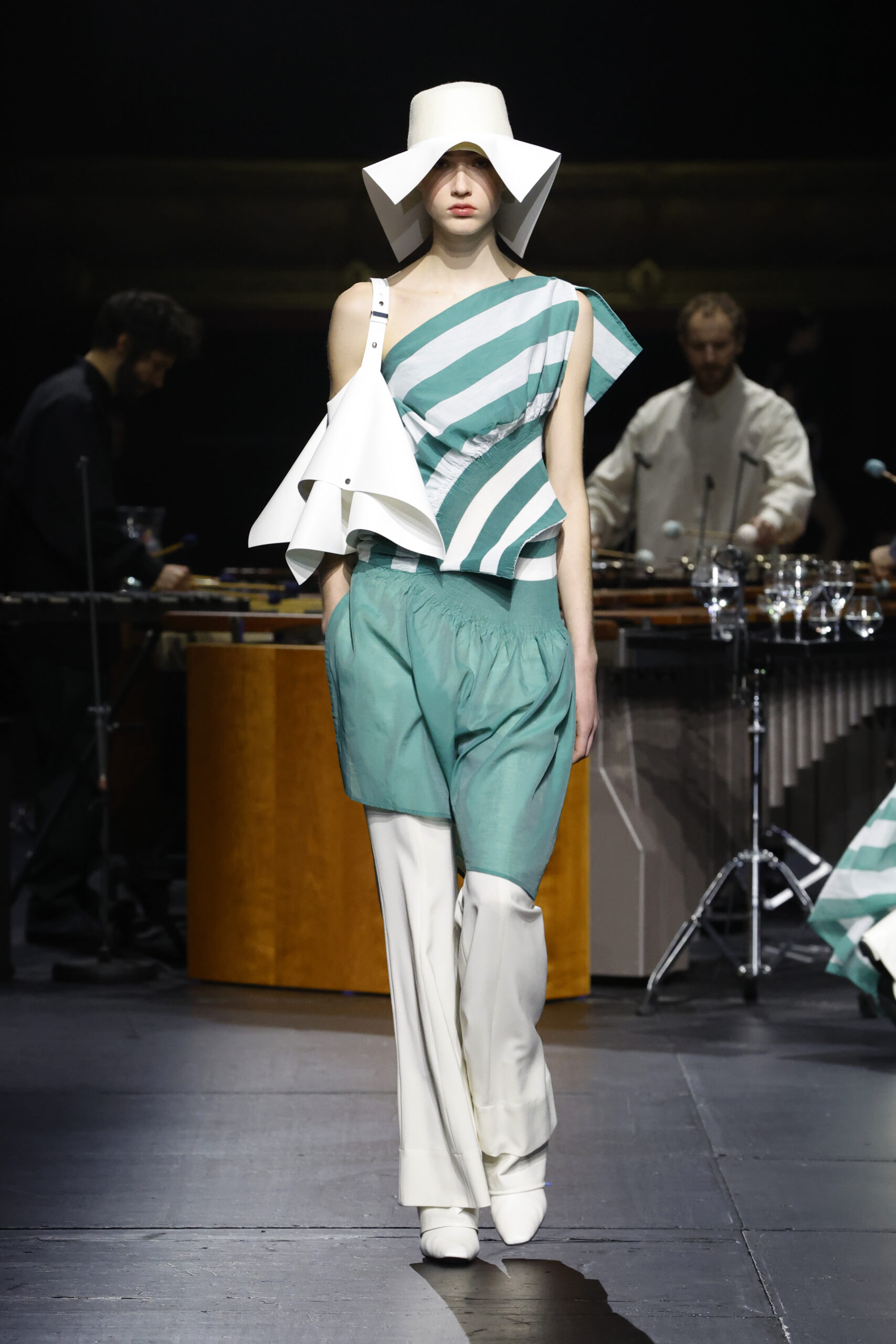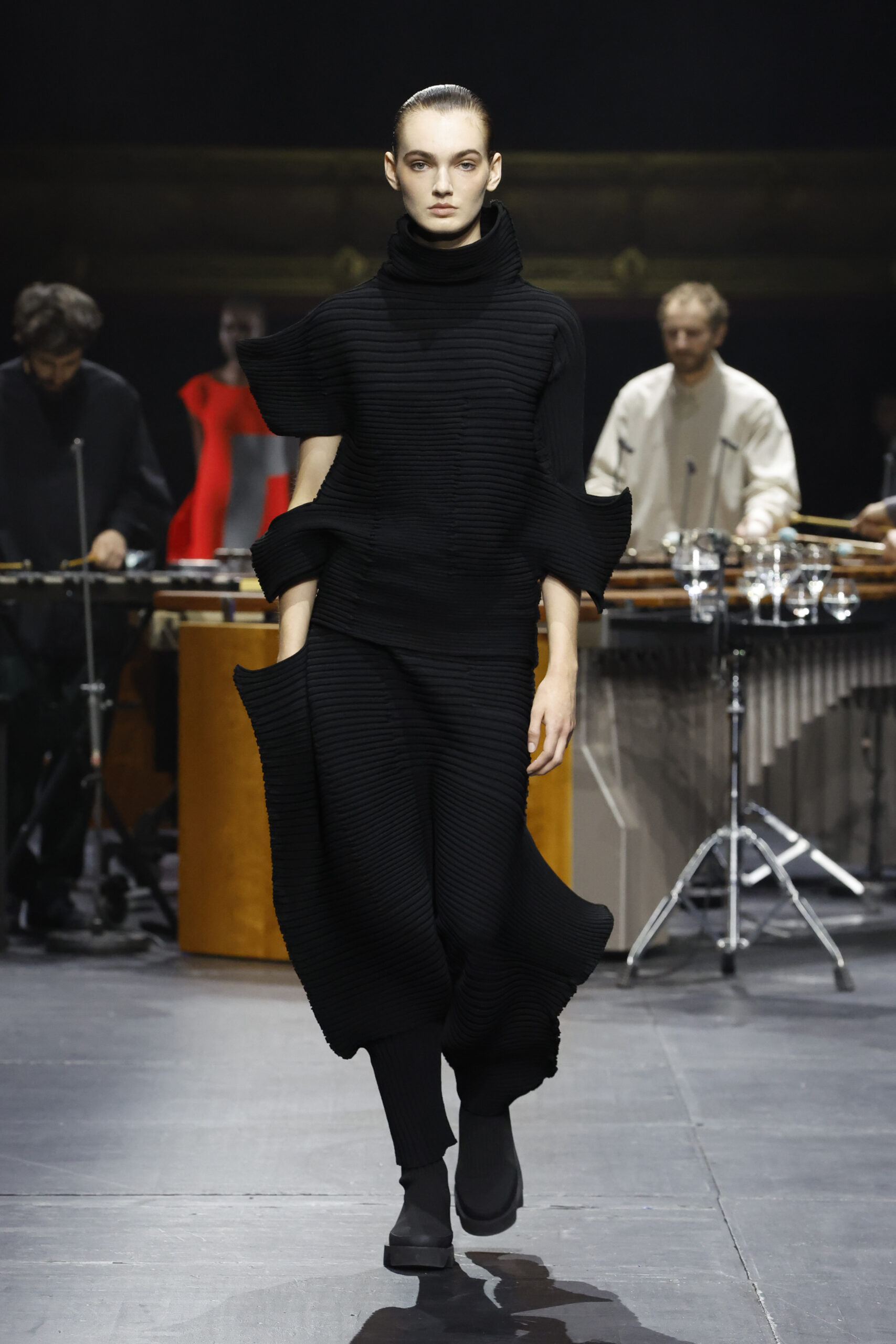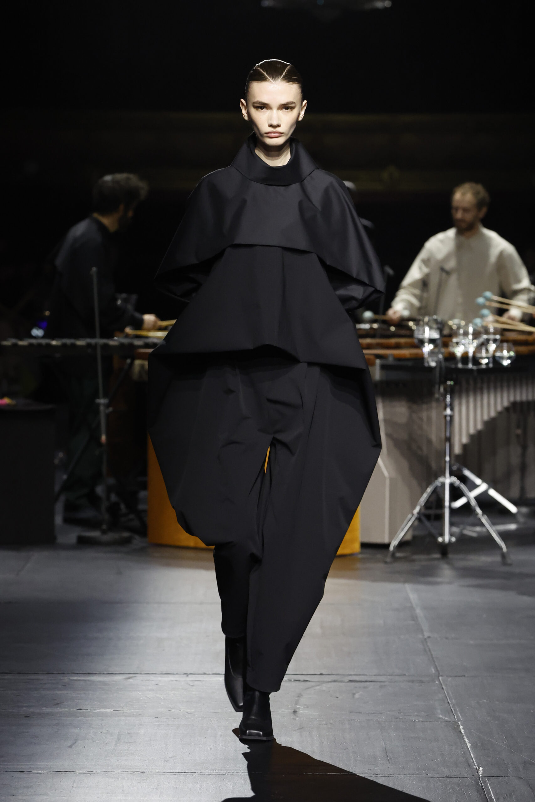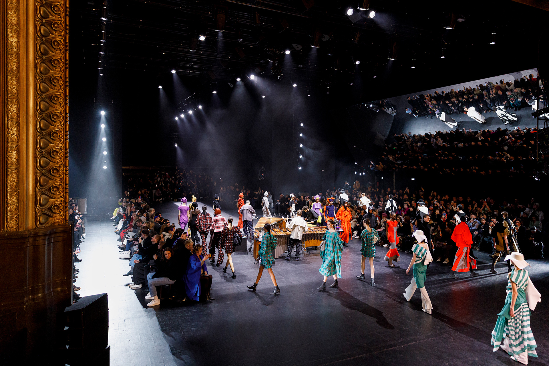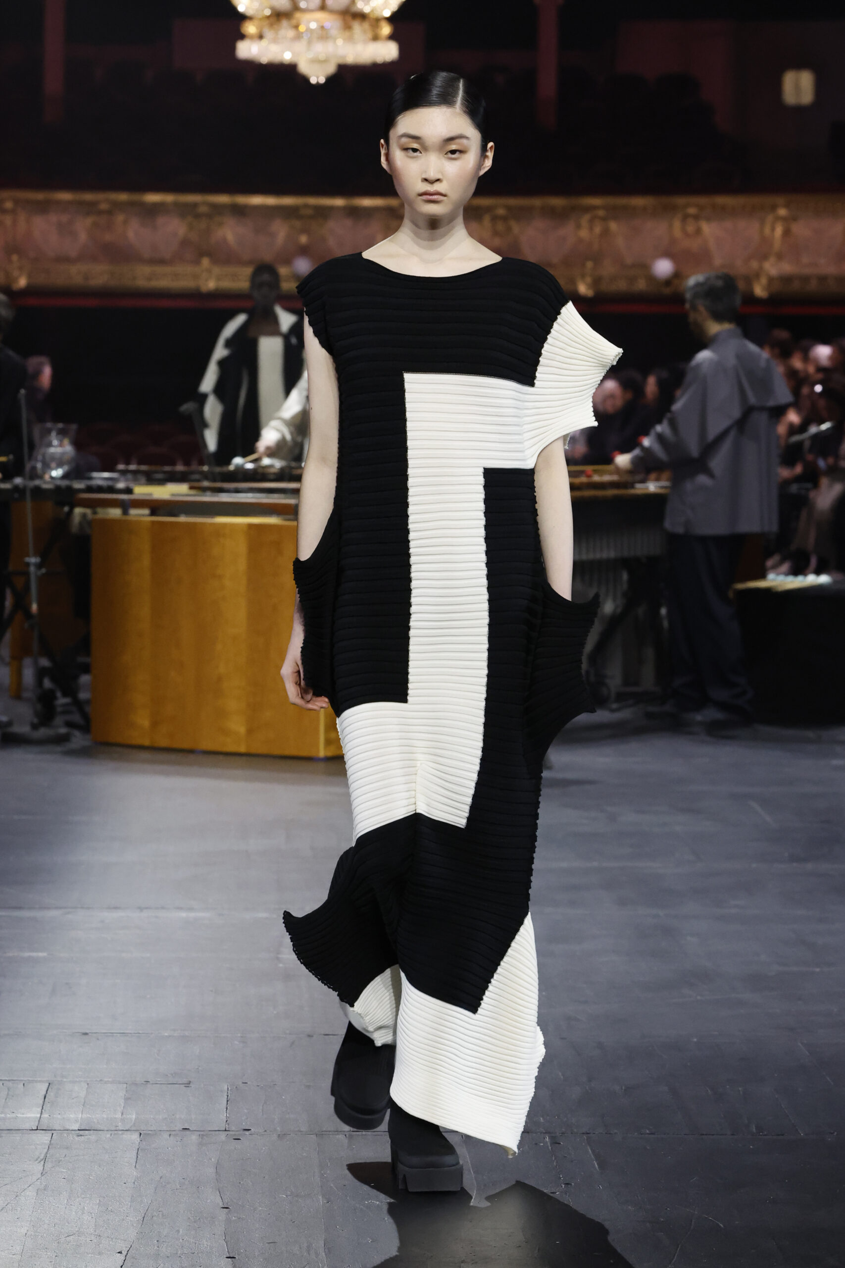 Le défilé a commencé par une performance de marimbas menée par l’ensemble de percussions Trio SR9 sur la scène du théâtre. Les mannequins ont suivi des chemins tracés par la lumière les menant vers un final ayant pour toile de fond le théâtre vide.