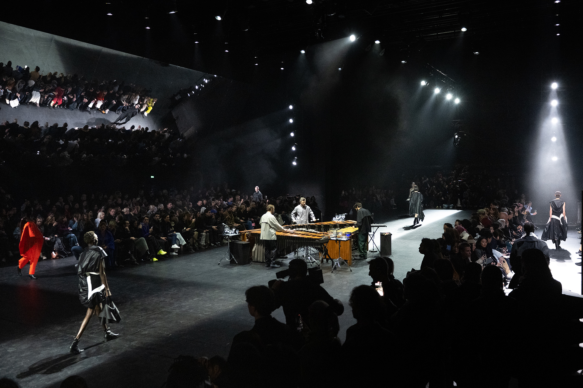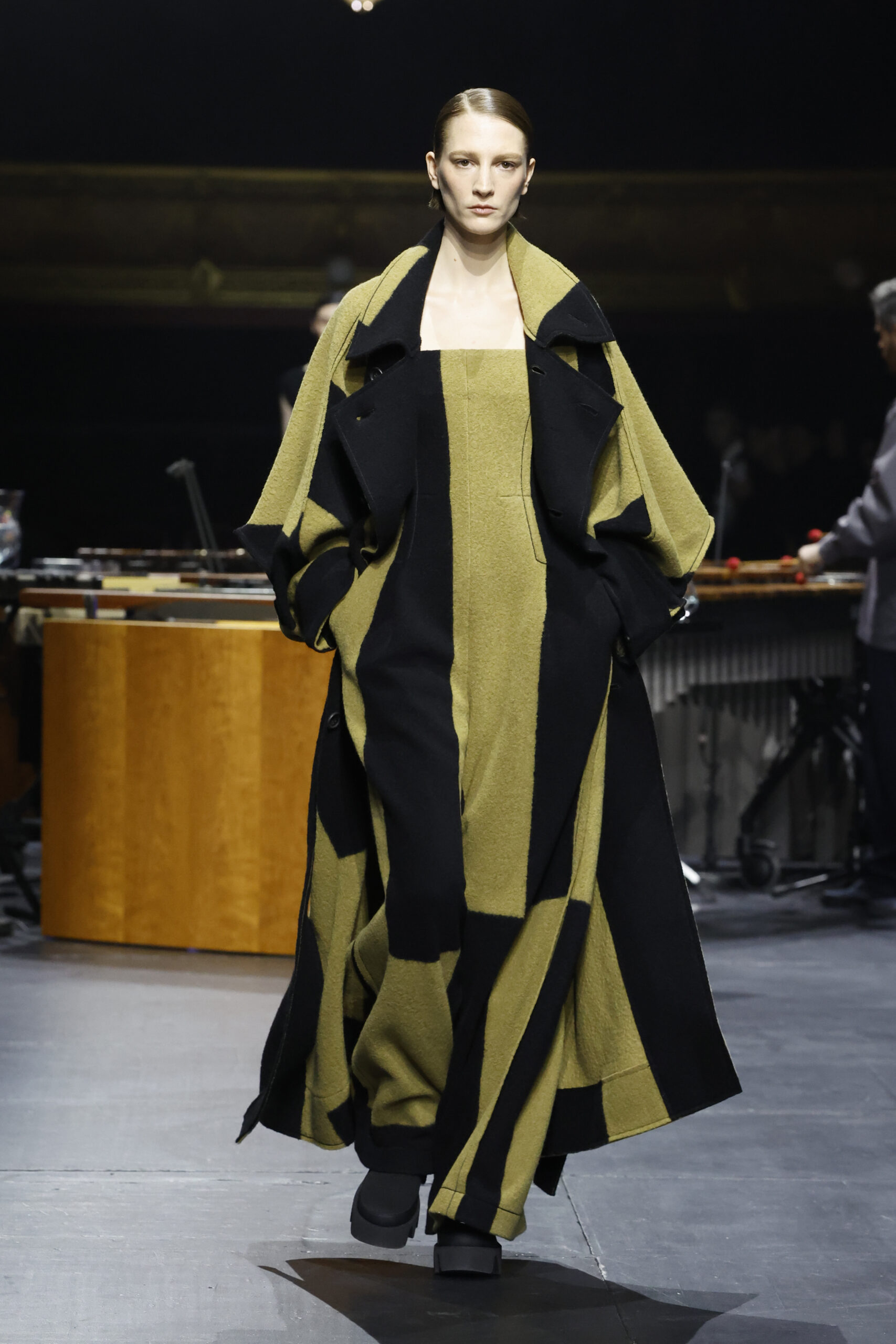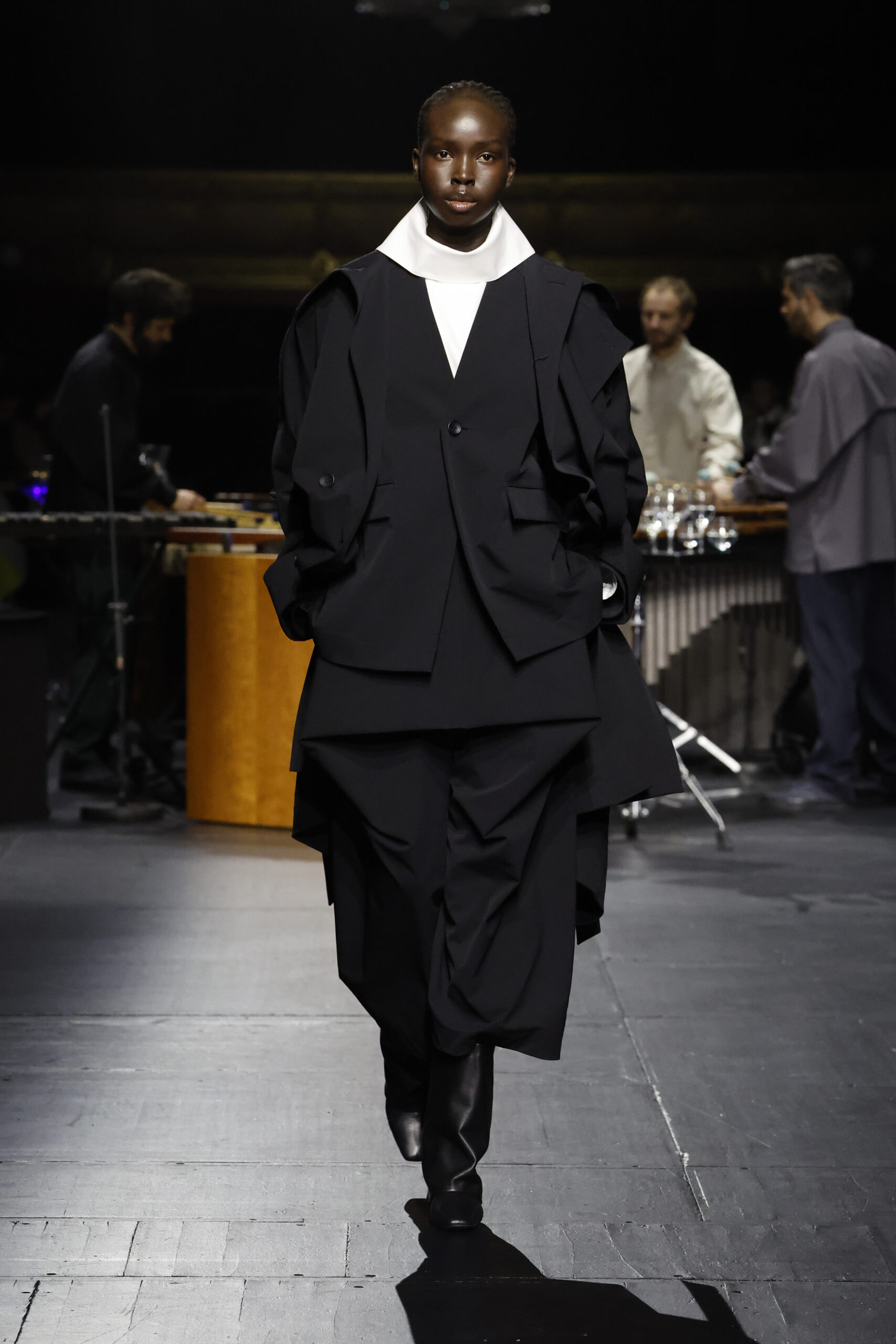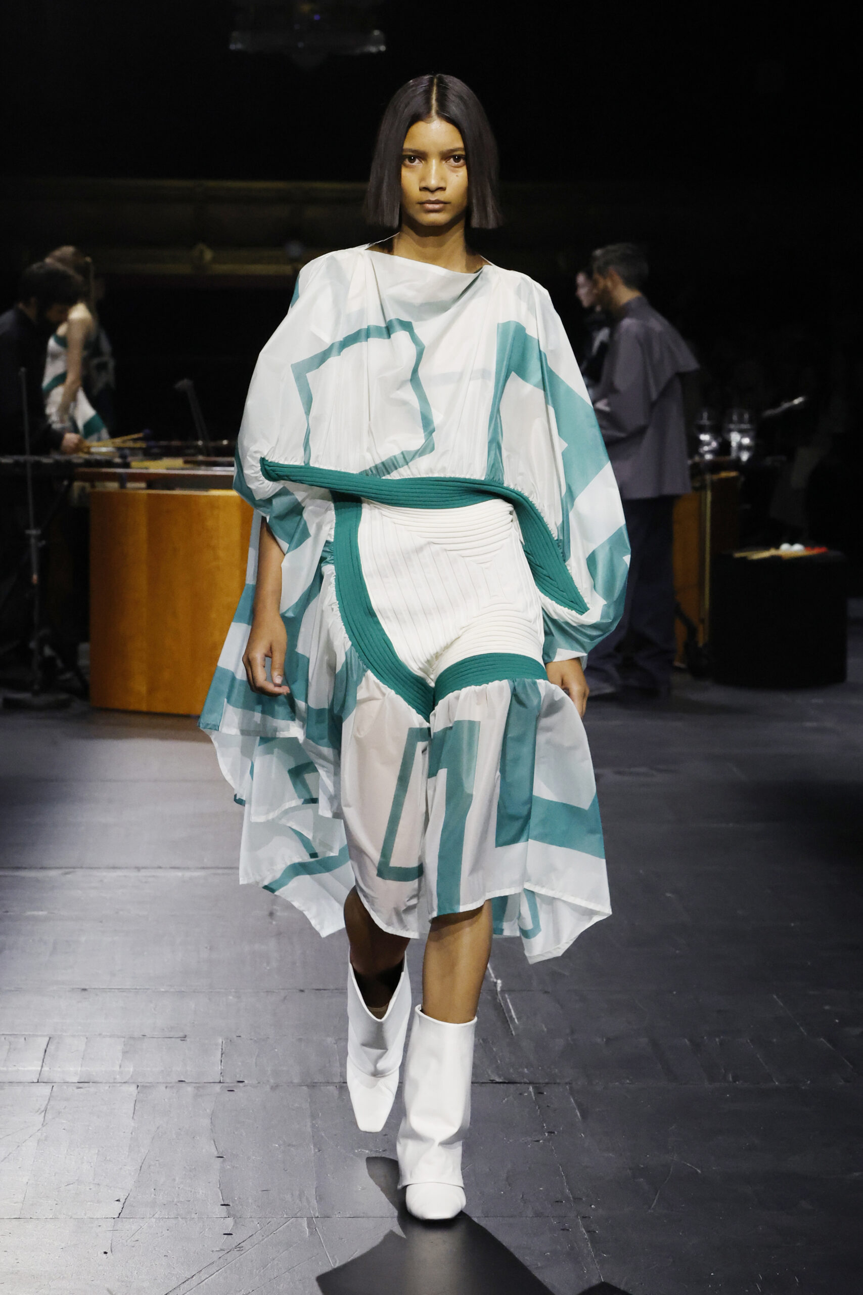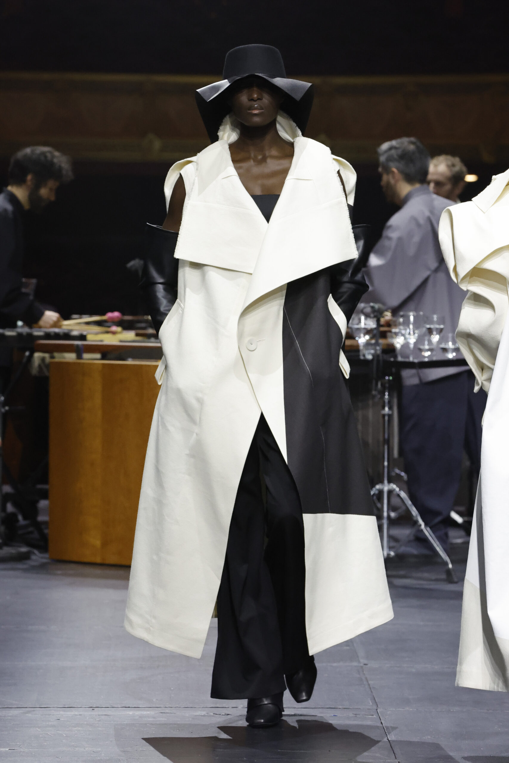 Le défilé a commencé par une performance de marimbas menée par l’ensemble de percussions Trio SR9 sur la scène du théâtre. Les mannequins ont suivi des chemins tracés par la lumière les menant vers un final ayant pour toile de fond le théâtre vide.