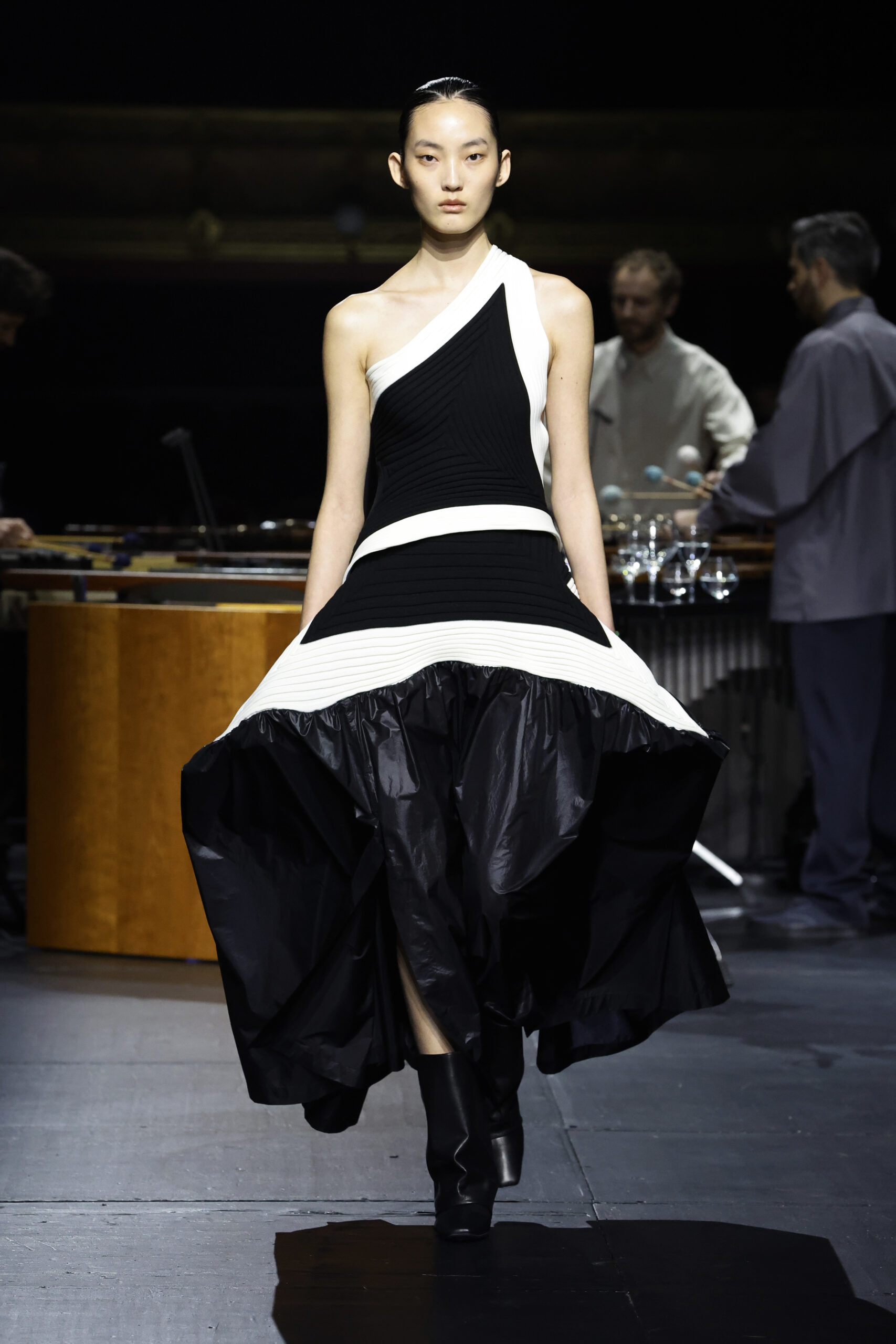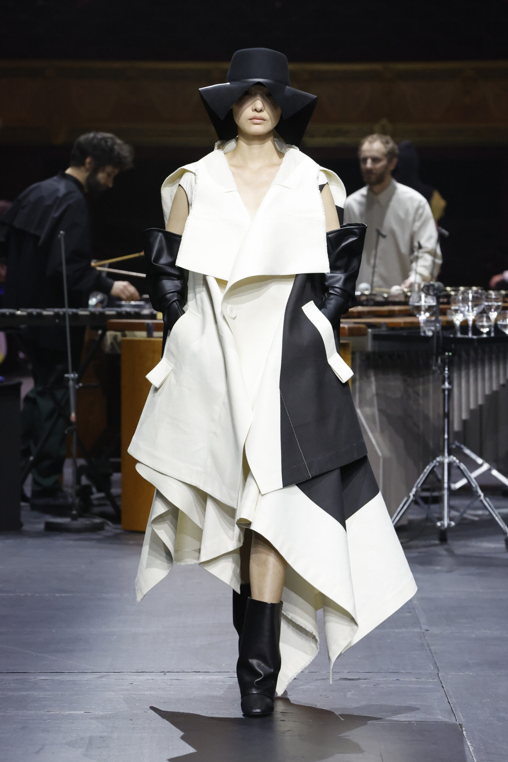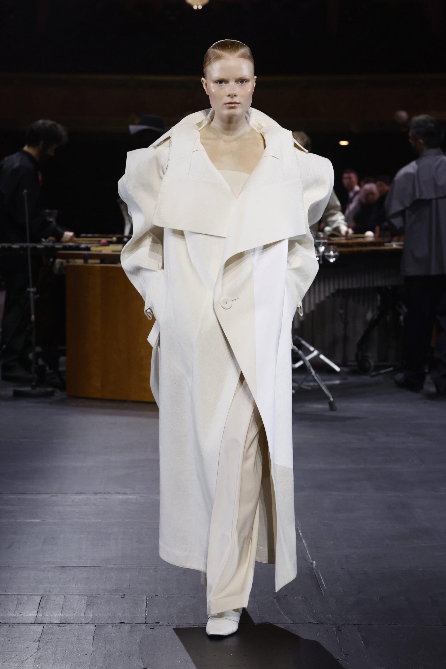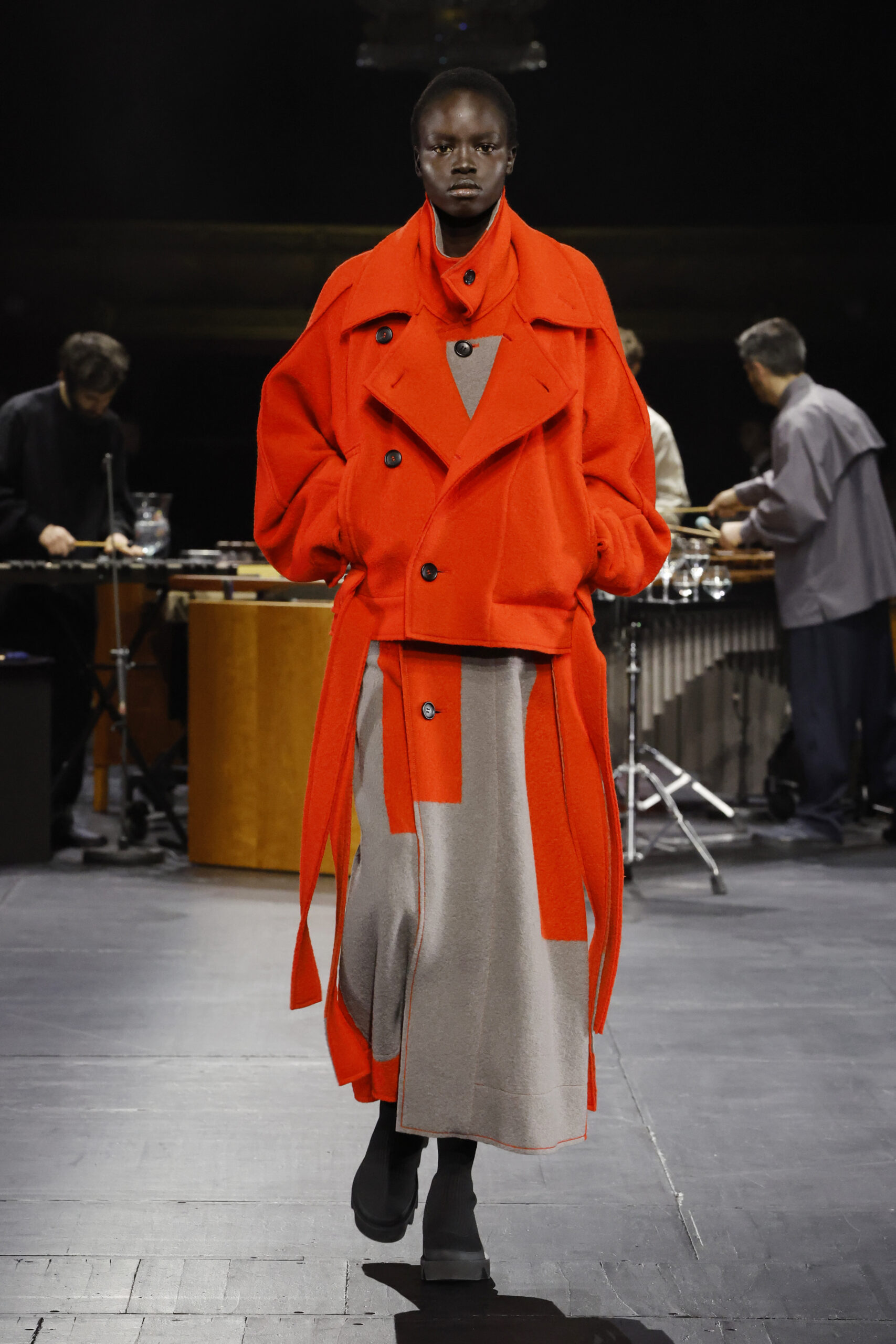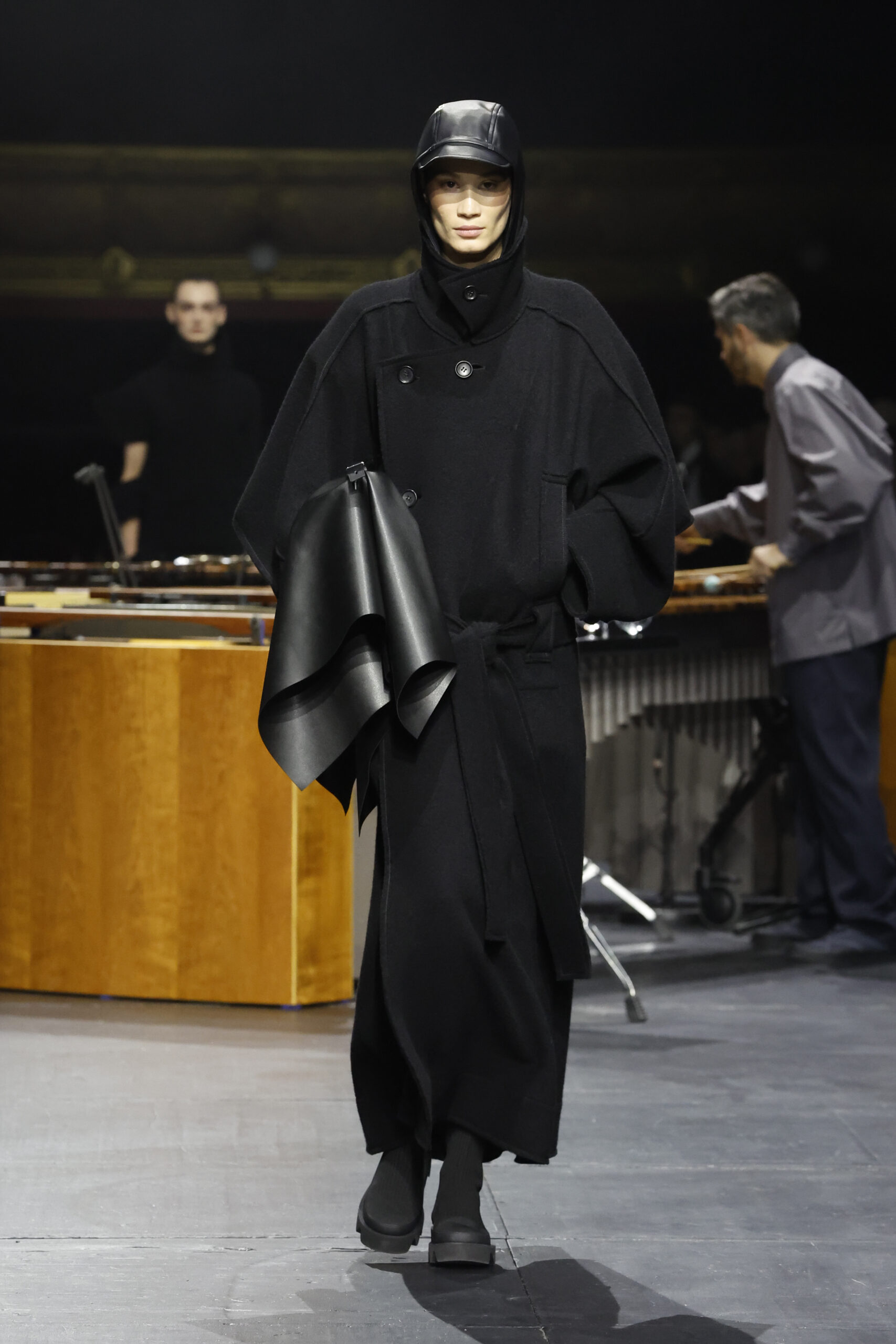 Le défilé a commencé par une performance de marimbas menée par l’ensemble de percussions Trio SR9 sur la scène du théâtre. Les mannequins ont suivi des chemins tracés par la lumière les menant vers un final ayant pour toile de fond le théâtre vide.