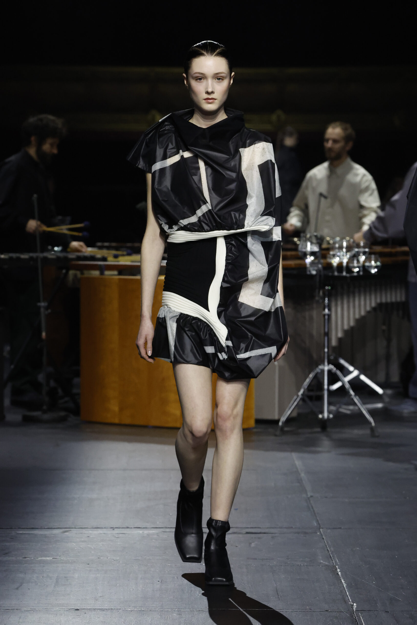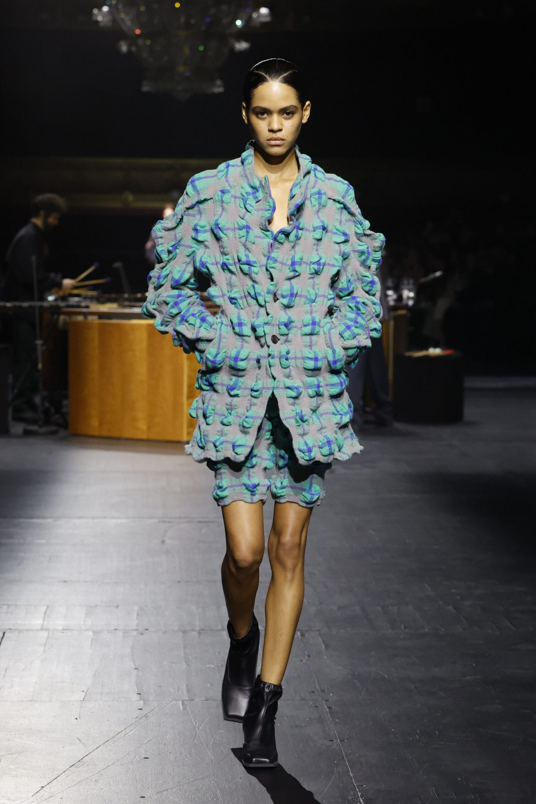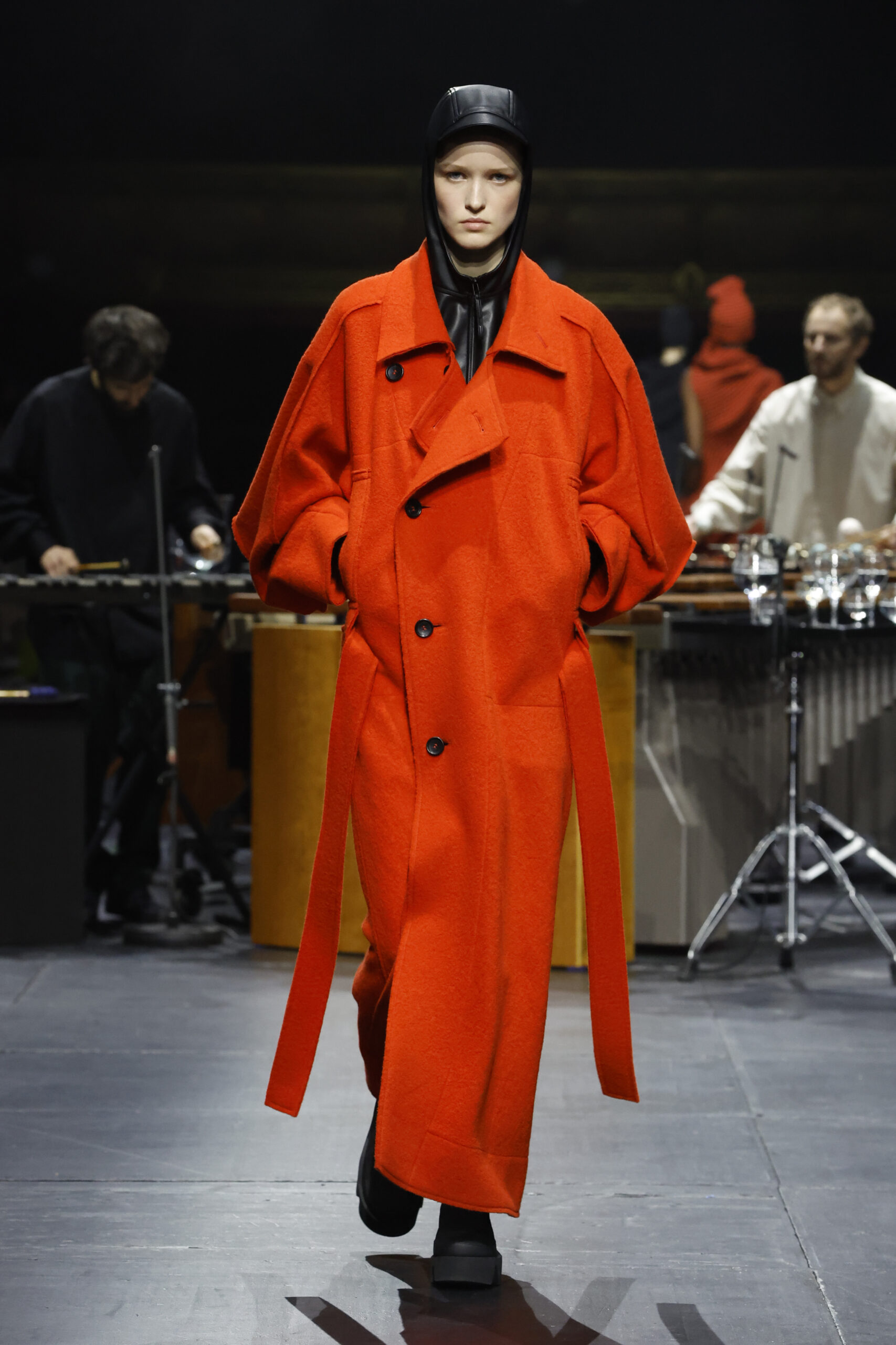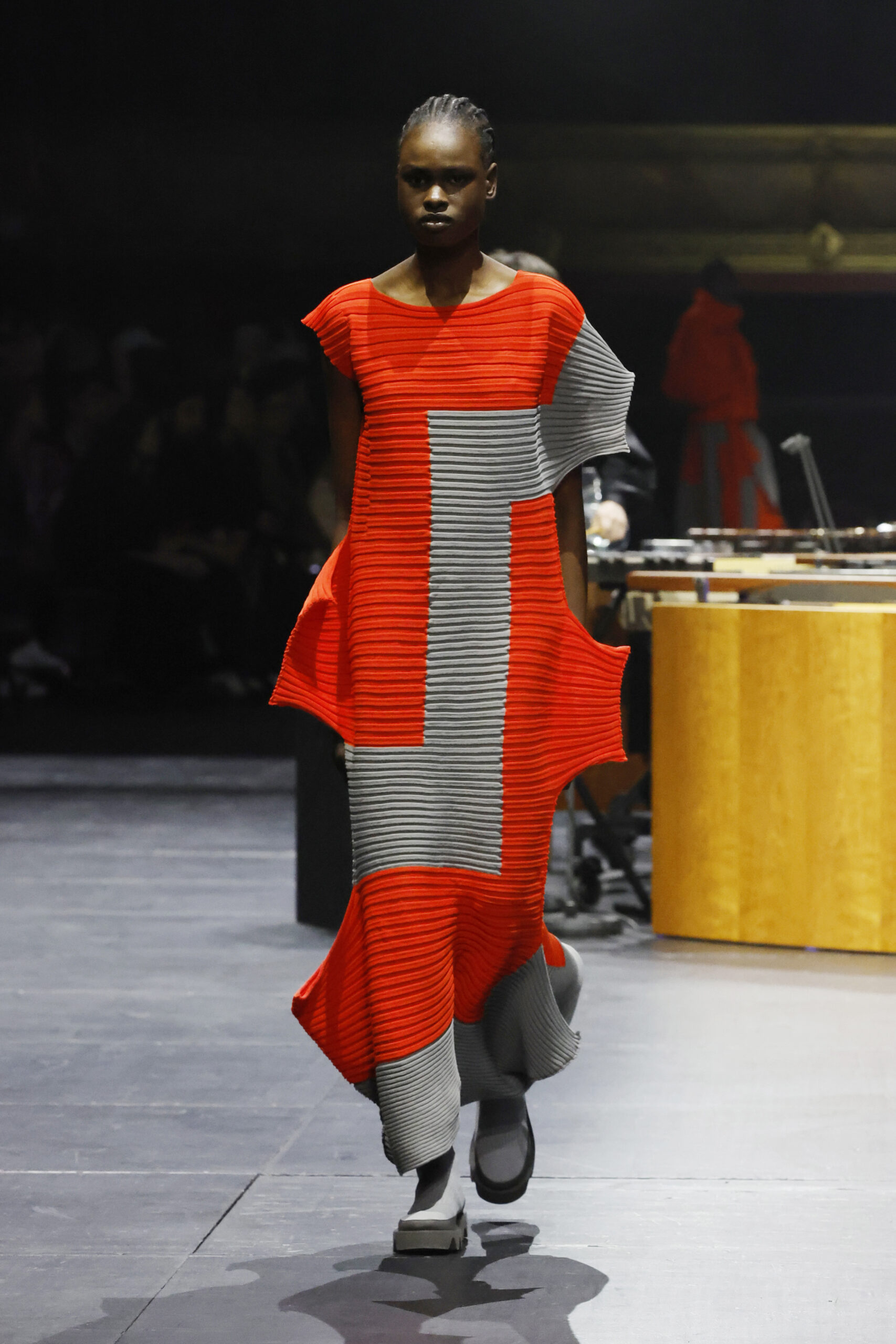 Le défilé a commencé par une performance de marimbas menée par l’ensemble de percussions Trio SR9 sur la scène du théâtre. Les mannequins ont suivi des chemins tracés par la lumière les menant vers un final ayant pour toile de fond le théâtre vide.