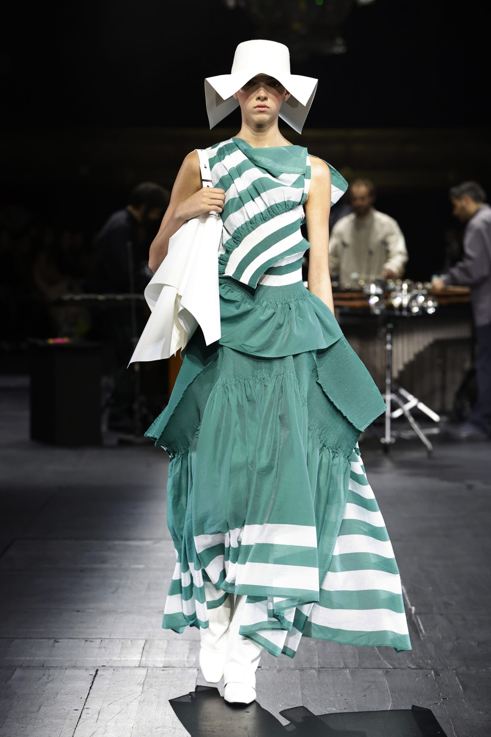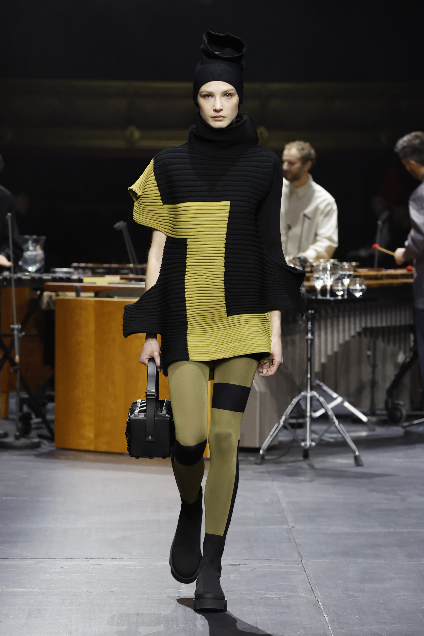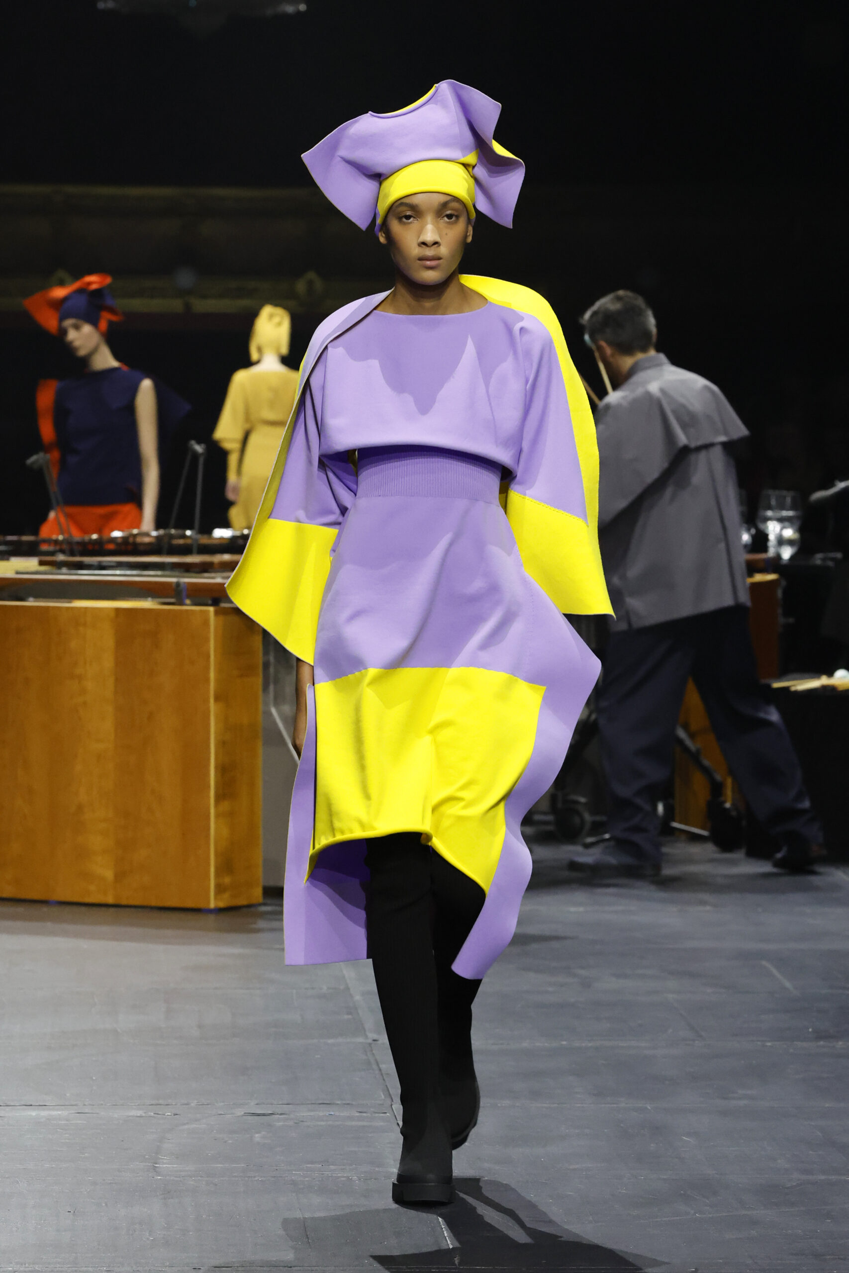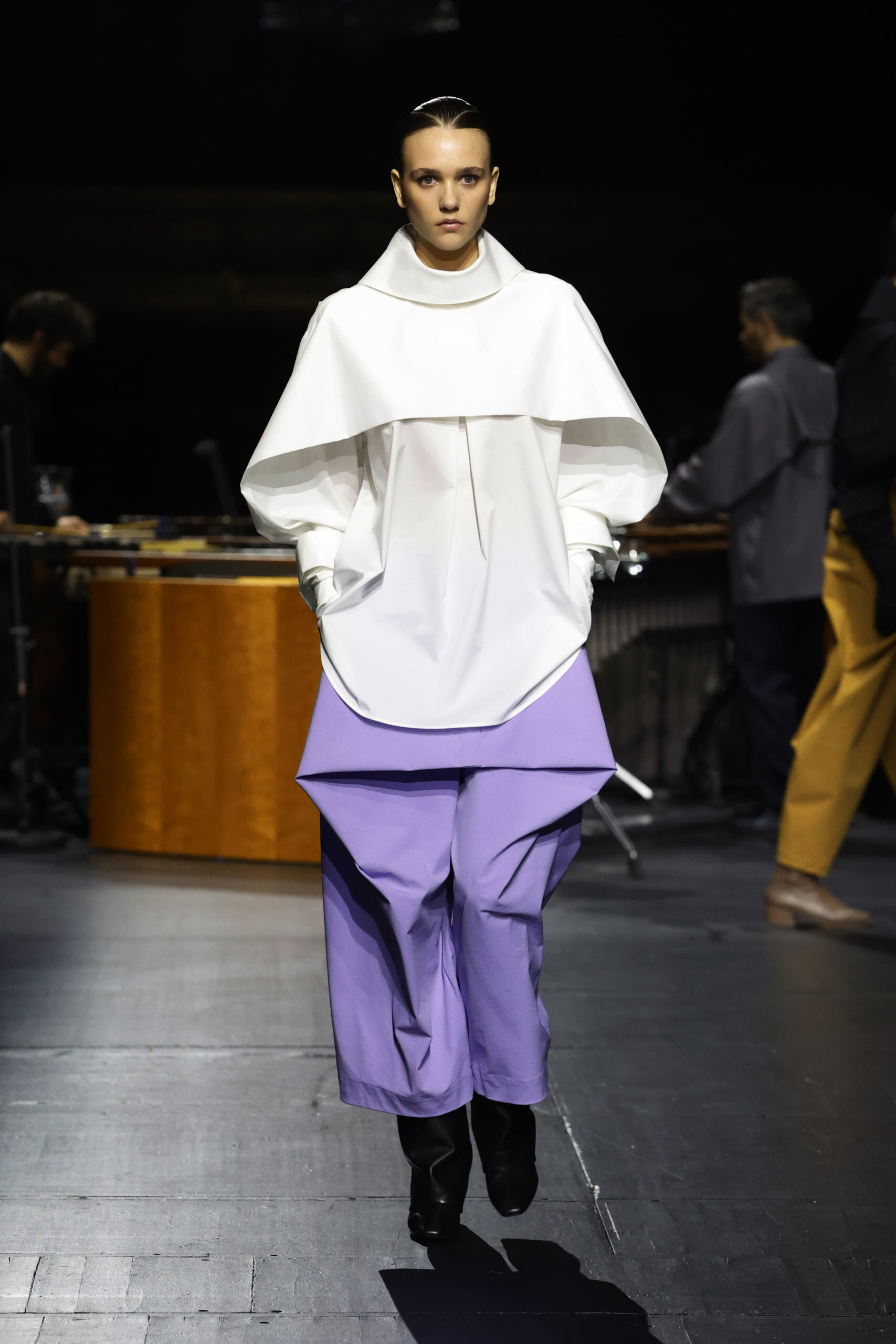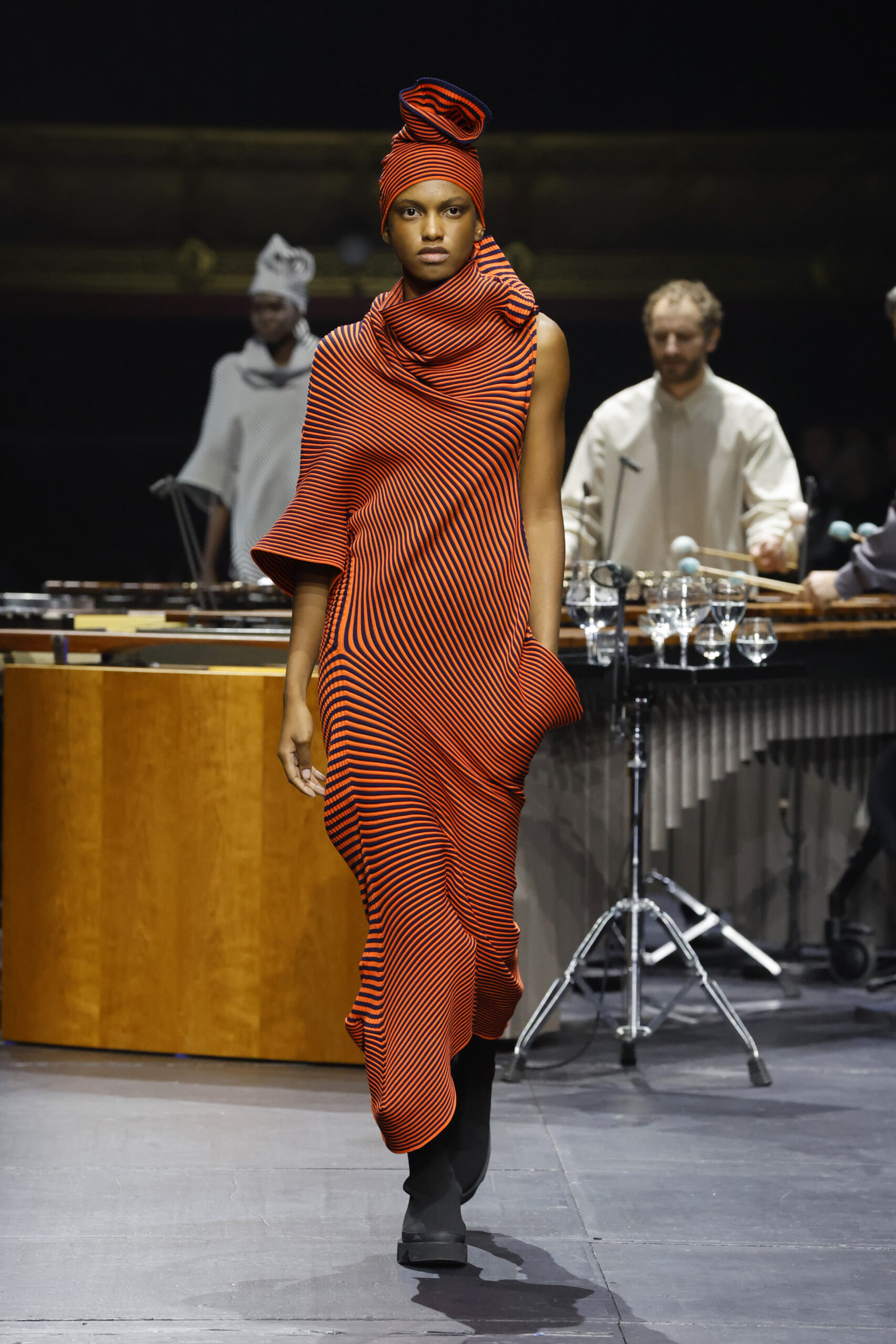 Le défilé a commencé par une performance de marimbas menée par l’ensemble de percussions Trio SR9 sur la scène du théâtre. Les mannequins ont suivi des chemins tracés par la lumière les menant vers un final ayant pour toile de fond le théâtre vide.