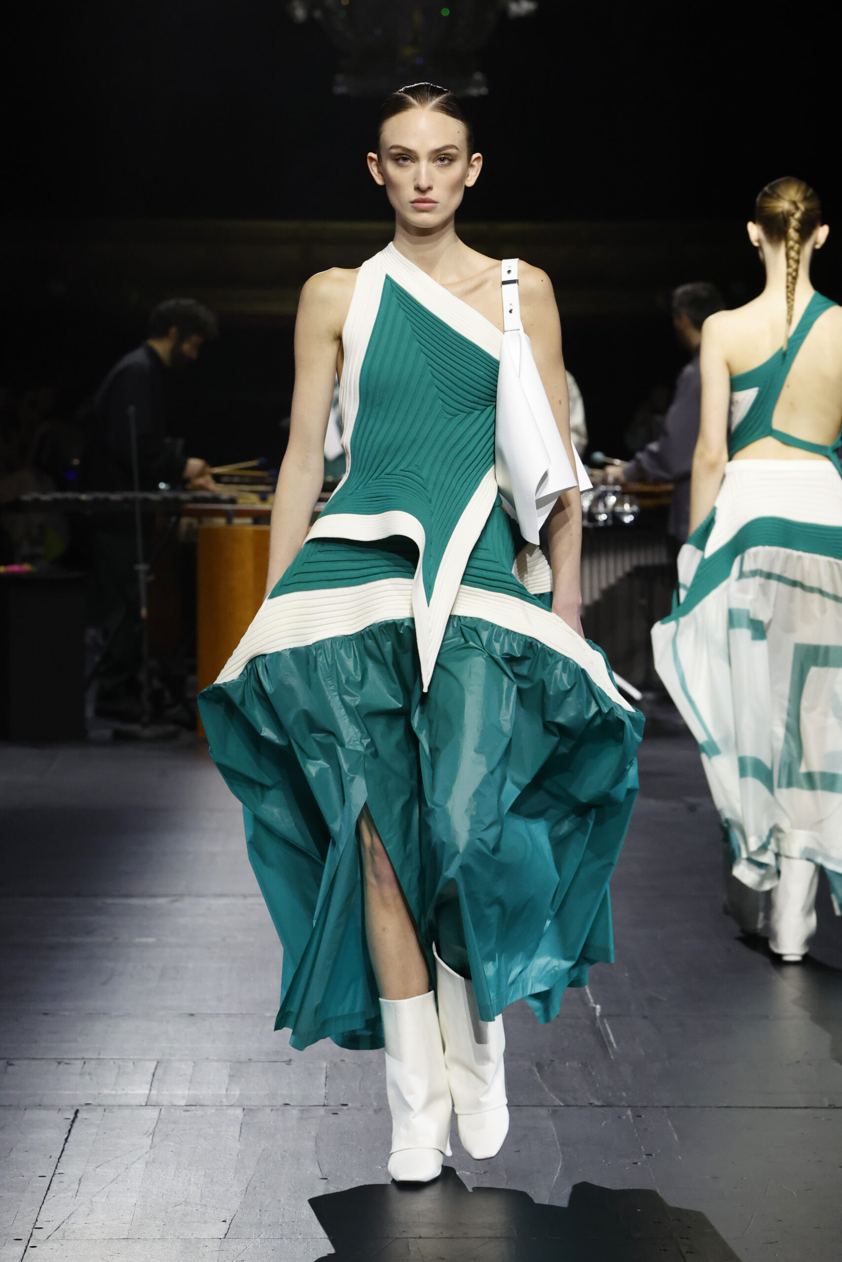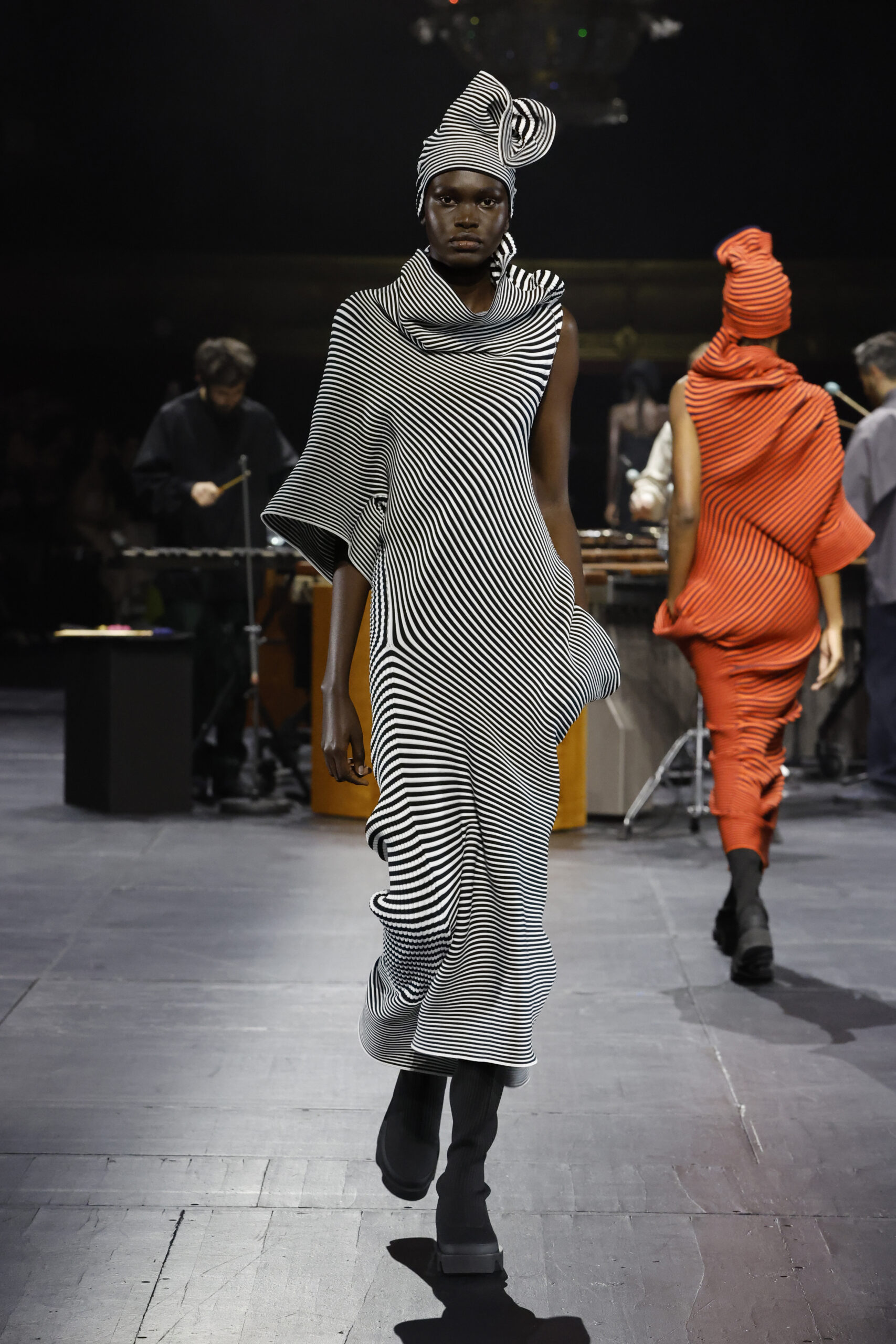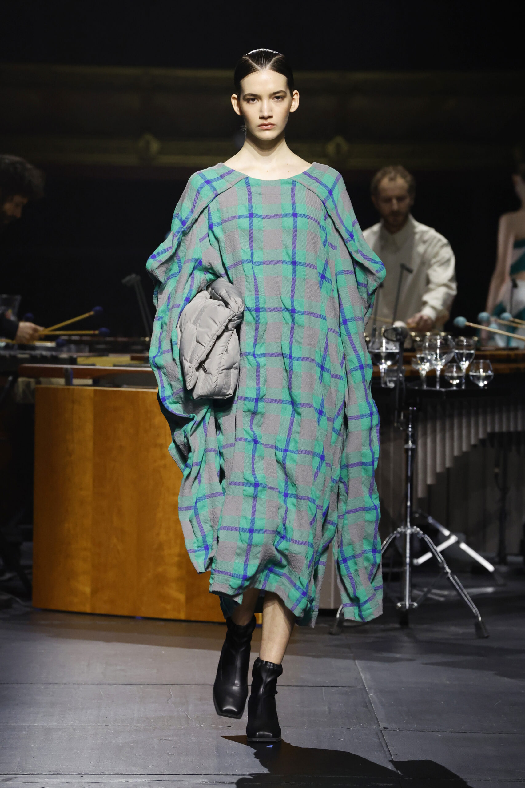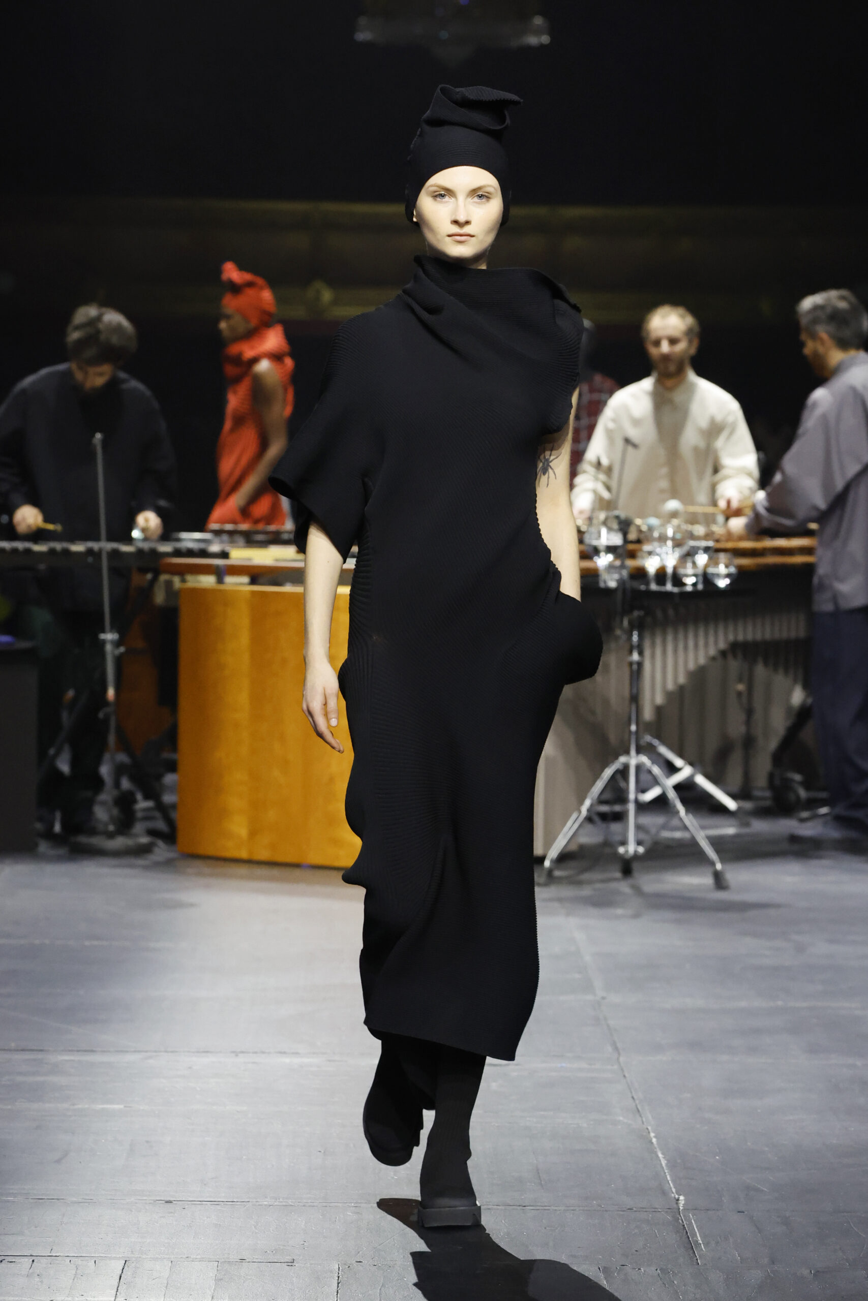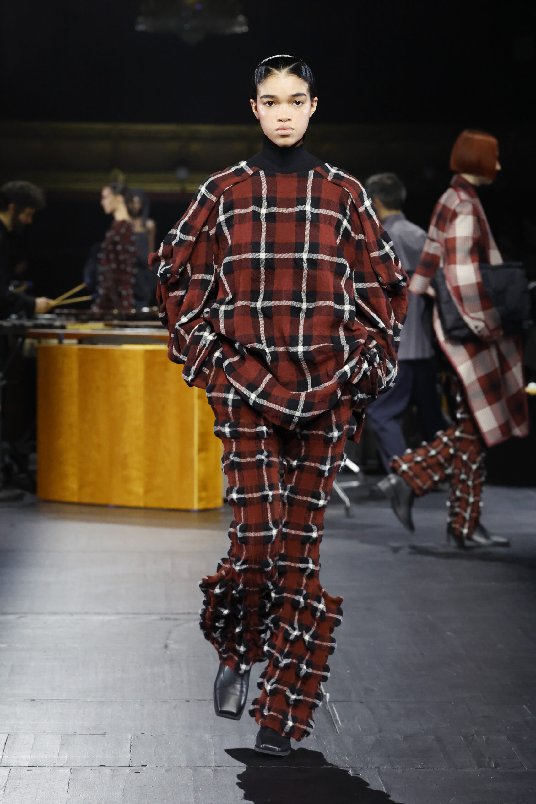 Le défilé a commencé par une performance de marimbas menée par l’ensemble de percussions Trio SR9 sur la scène du théâtre. Les mannequins ont suivi des chemins tracés par la lumière les menant vers un final ayant pour toile de fond le théâtre vide.