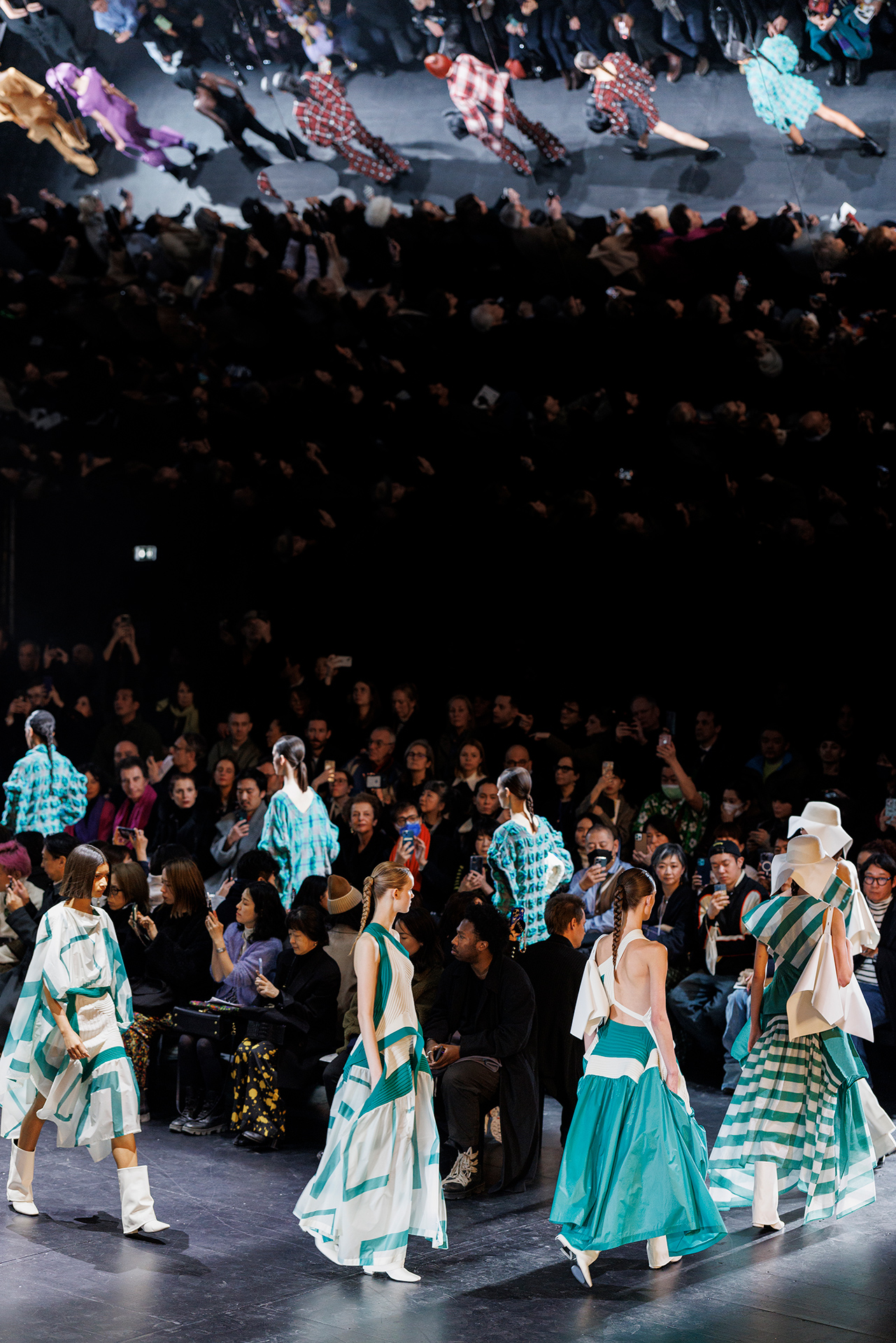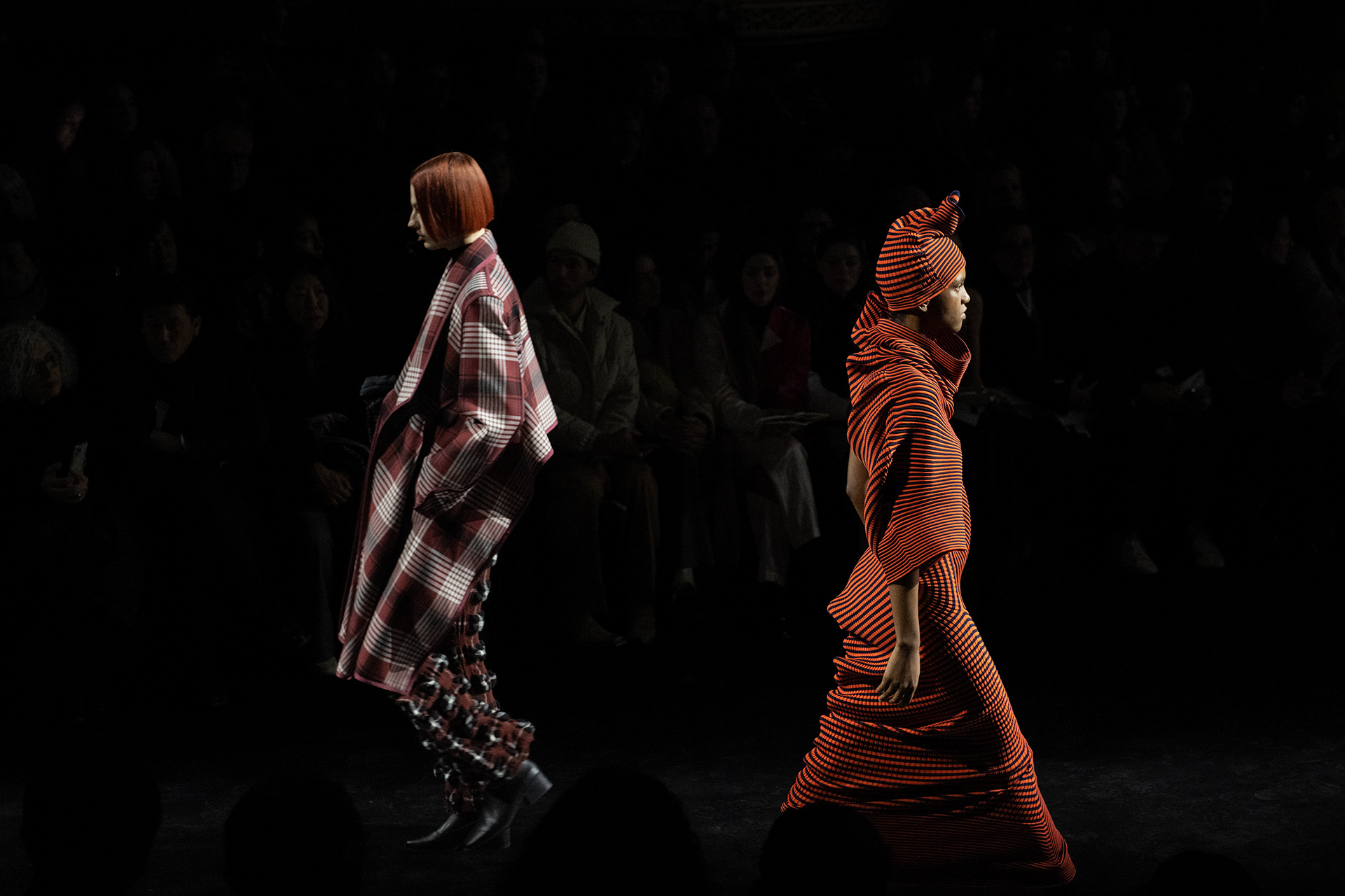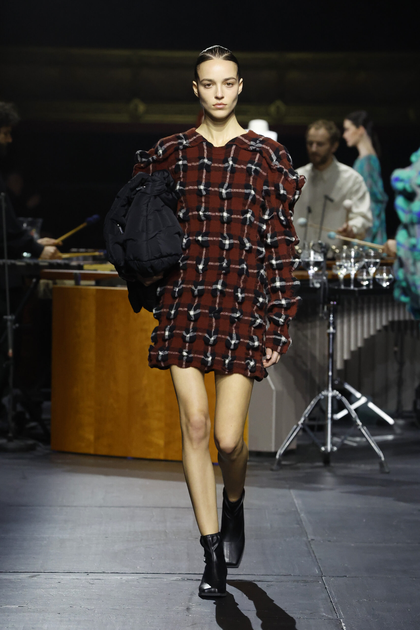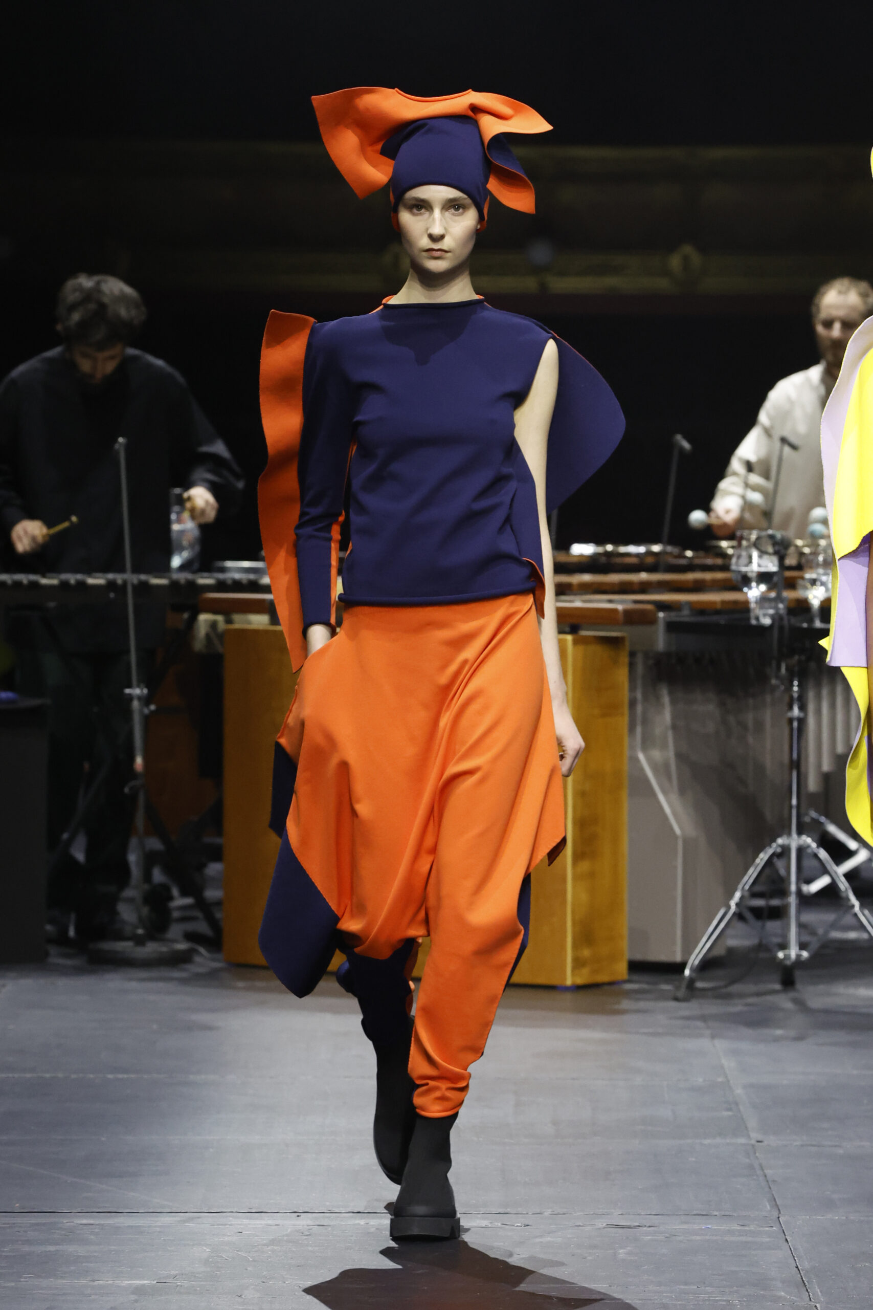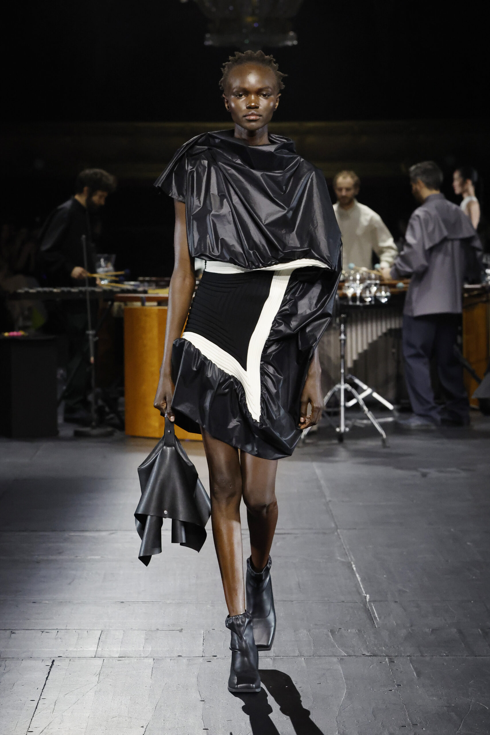 Le défilé a commencé par une performance de marimbas menée par l’ensemble de percussions Trio SR9 sur la scène du théâtre. Les mannequins ont suivi des chemins tracés par la lumière les menant vers un final ayant pour toile de fond le théâtre vide.