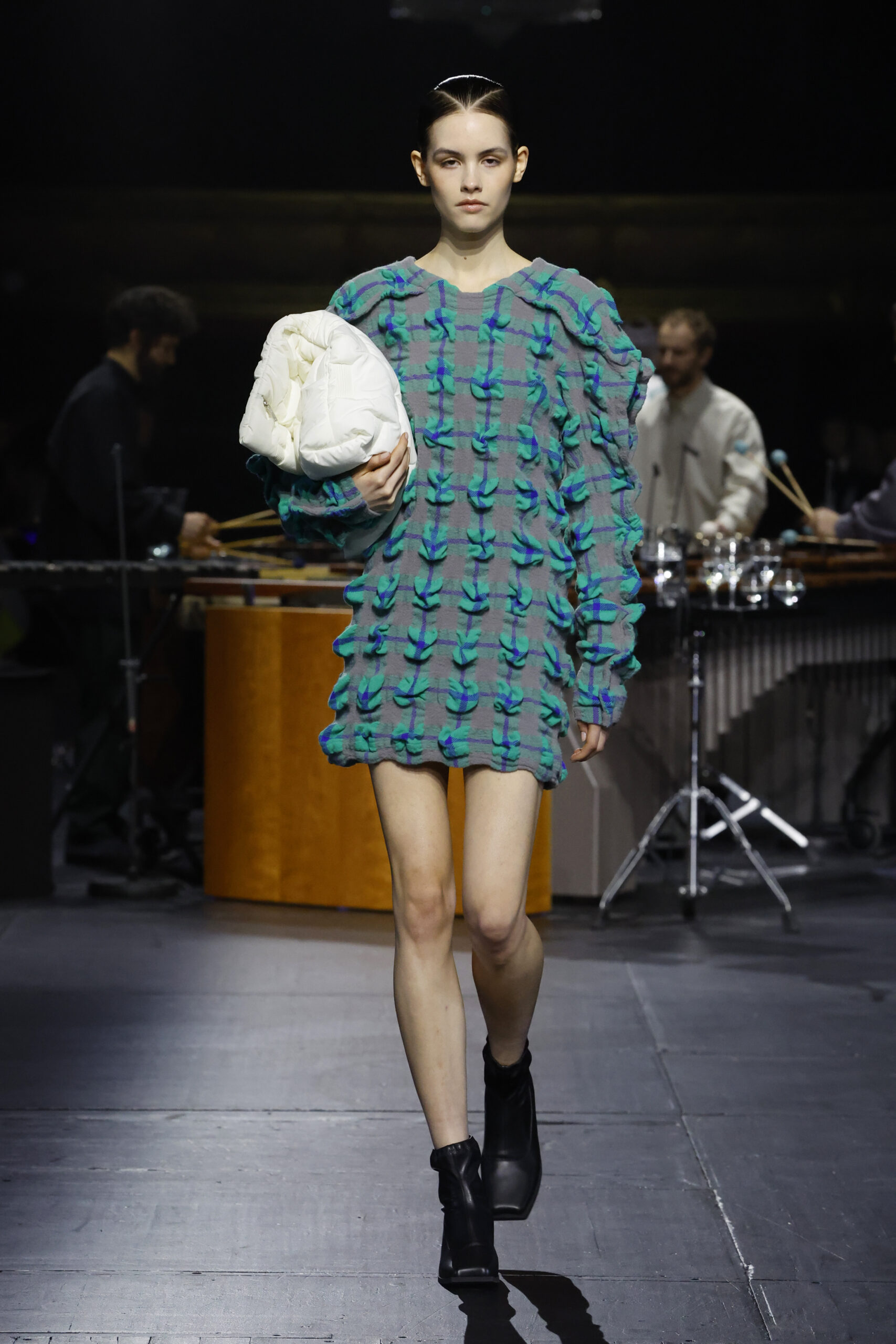 La série « Rhythm Check » est inspirée par le rythme alternant d’un motif à carreau. Un fil qui se rétracte à la chaleur est tissé en suivant un motif de grille. Le vêtement fait alors le double de sa taille avant qu’il ne soit plongé dans une eau très chaude. Le fil se rétracte et apporte une texture unique au vêtement.