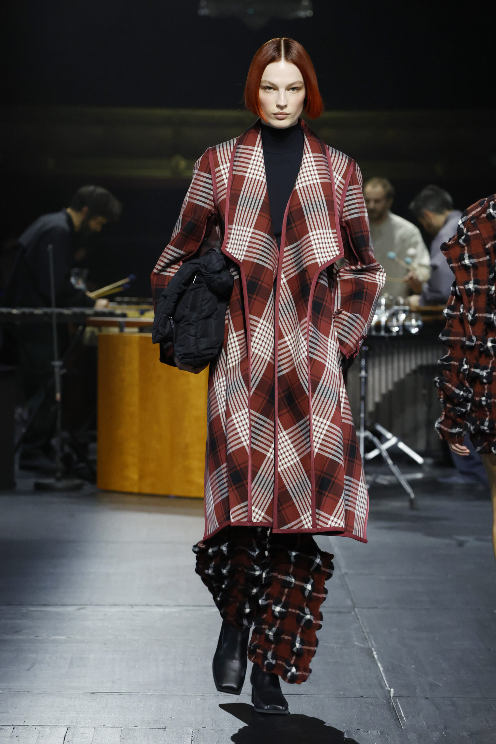 La série « Counterpoint: Check » est composée d’un manteau et d’une veste tous deux réversibles. Elle est conçue pour que le revers crée un contraste avec la partie extérieure permettant d’obtenir des styles différents. Le corsage du manteau est réalisé d’un seul tenant et présente des longueurs différentes à l’avant et à l’arrière, permettant de le porter de multiples façons.