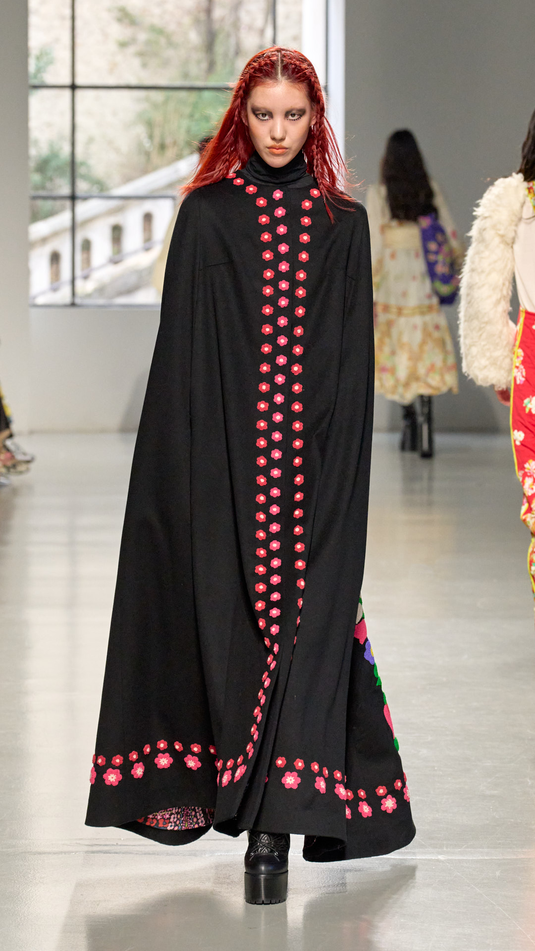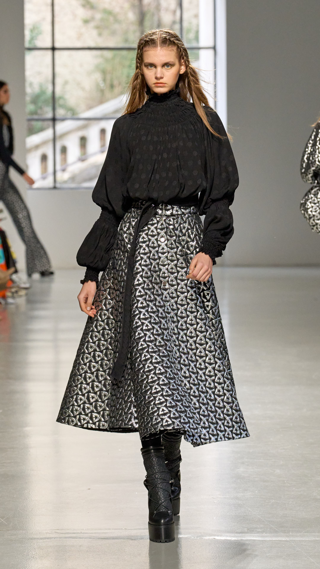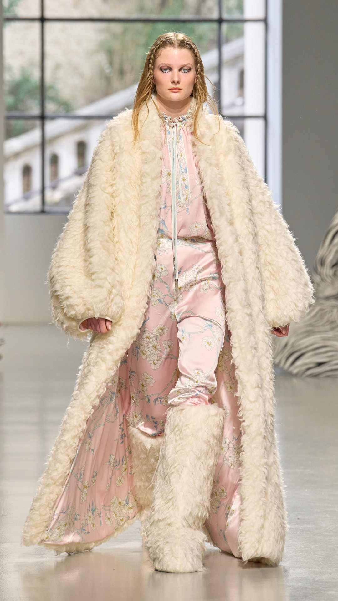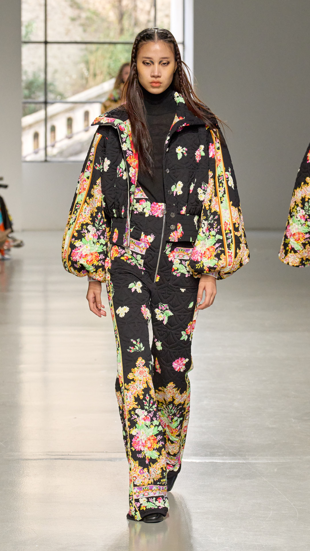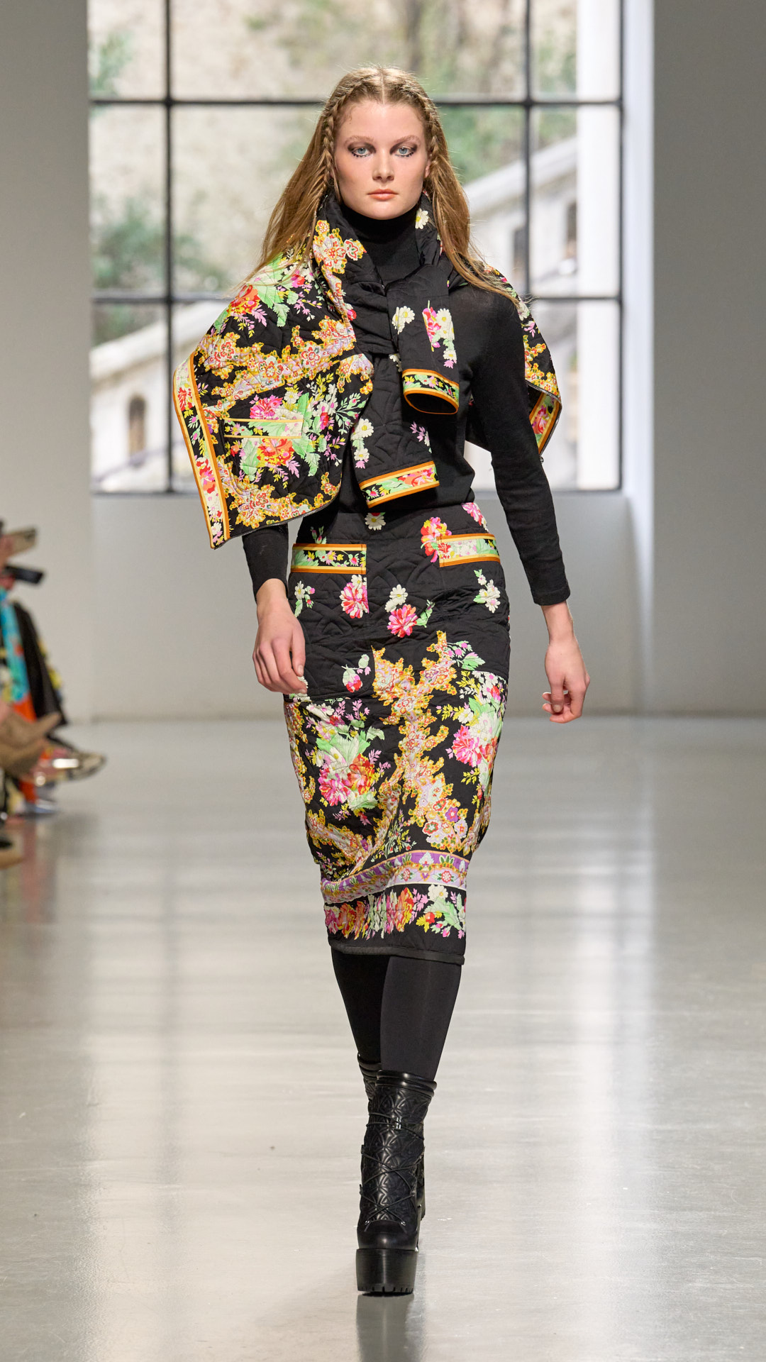 Entre mi-Heidi et mi-Lady Di, notre héroïne s’amuse sur les pistes de ski dans sa salopette rouge lipstick en jersey matelassé. Le soir venu, elle se transforme en une véritable star de la piste de danse, marquant les esprits dans une robe bustier. Au milieu de la nuit, elle se détend sous le ciel étoilé dans une cape de laine noire brodée de bouquets de fleurs folkloriques. Au petit matin, elle retourne sur les pistes, impressionnante dans son manteau aux volumes princiers en brocard cloqué monogrammé. Elle continue de tournoyer, aussi gracieuse que jamais.