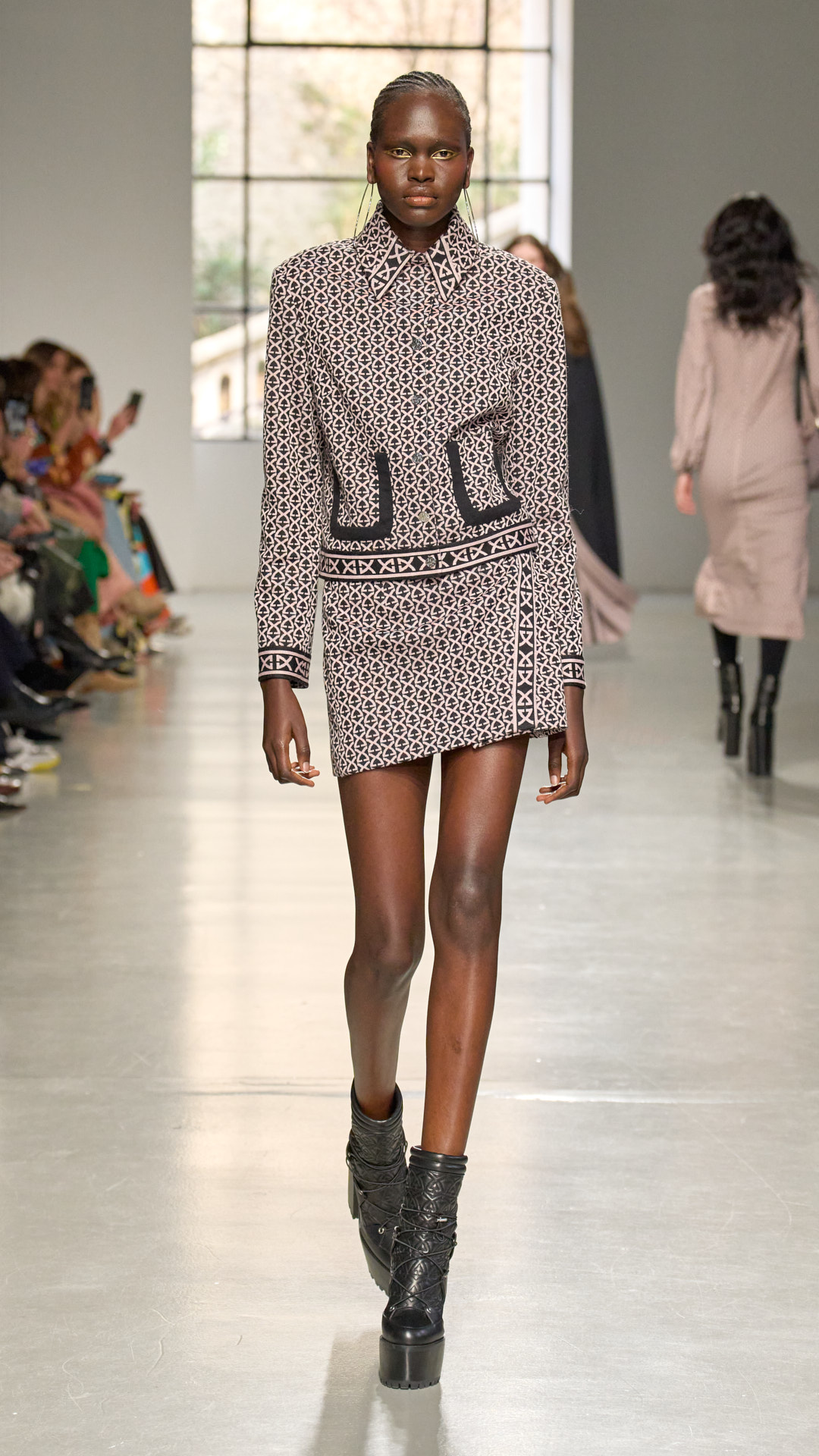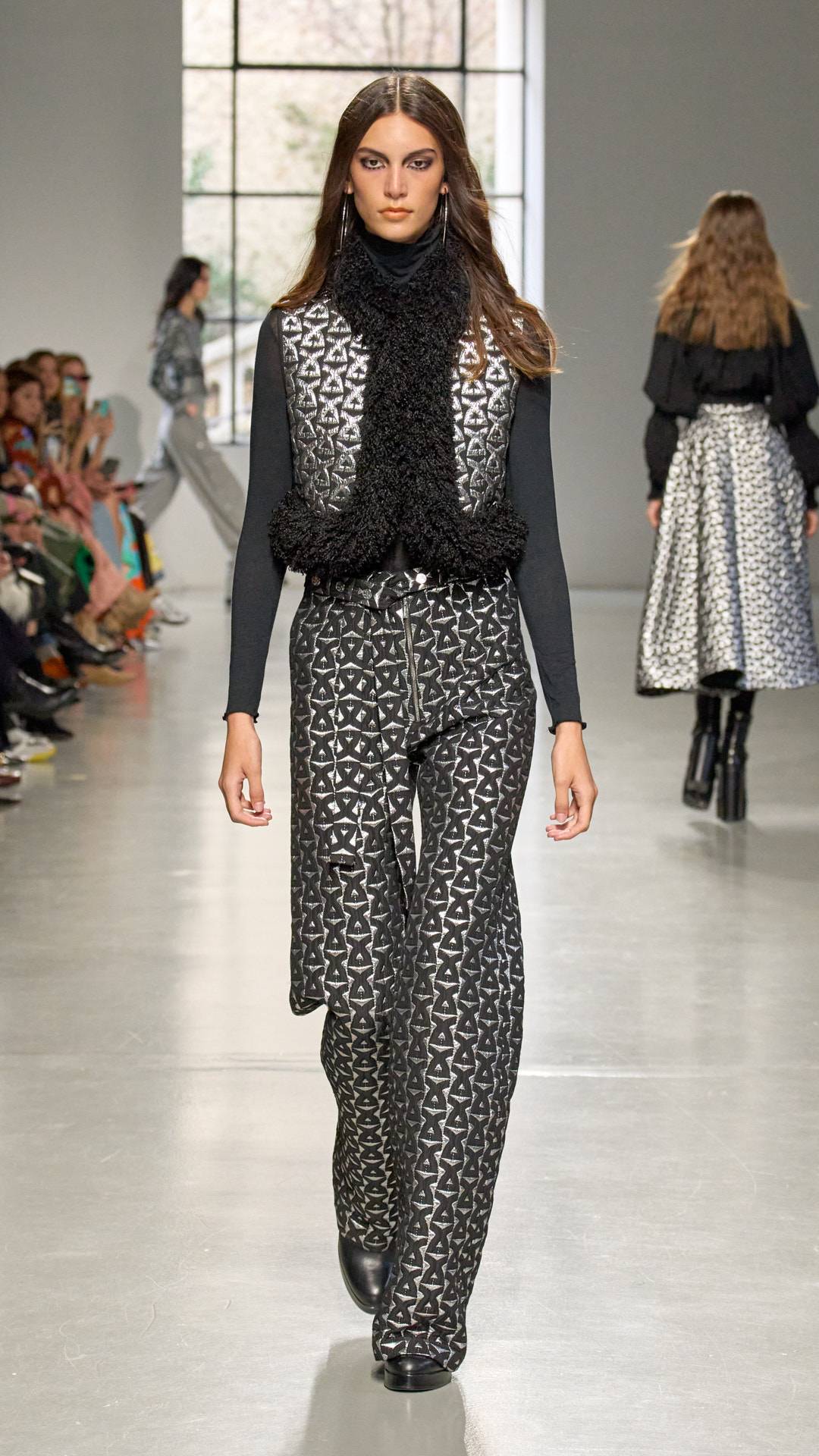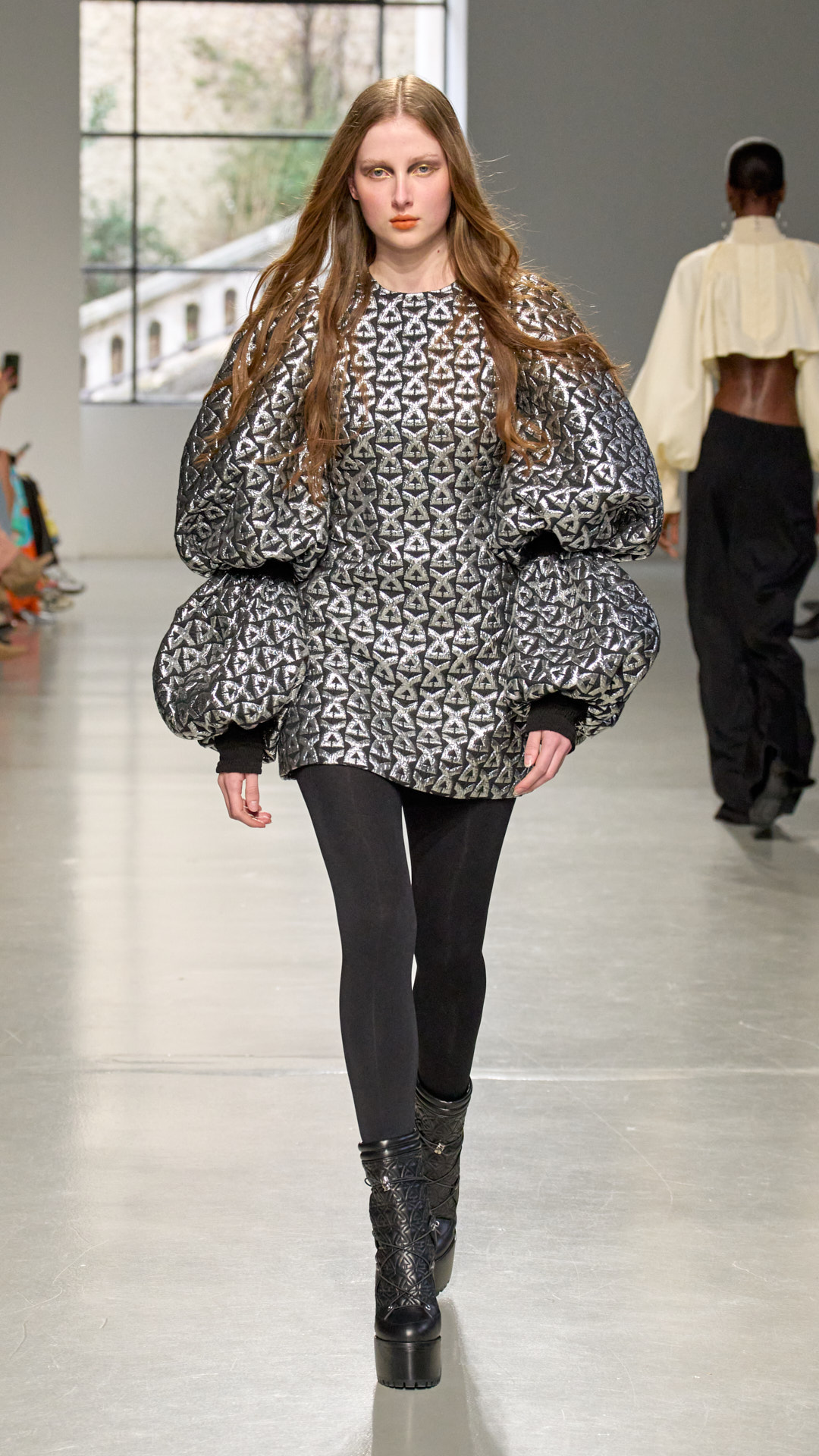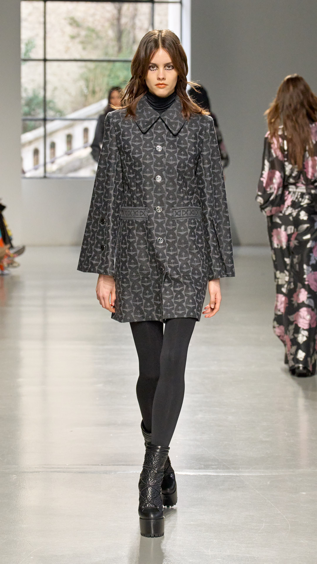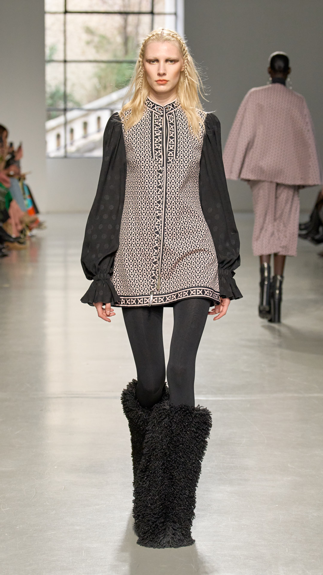 Entre mi-Heidi et mi-Lady Di, notre héroïne s’amuse sur les pistes de ski dans sa salopette rouge lipstick en jersey matelassé. Le soir venu, elle se transforme en une véritable star de la piste de danse, marquant les esprits dans une robe bustier. Au milieu de la nuit, elle se détend sous le ciel étoilé dans une cape de laine noire brodée de bouquets de fleurs folkloriques. Au petit matin, elle retourne sur les pistes, impressionnante dans son manteau aux volumes princiers en brocard cloqué monogrammé. Elle continue de tournoyer, aussi gracieuse que jamais.