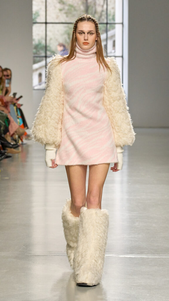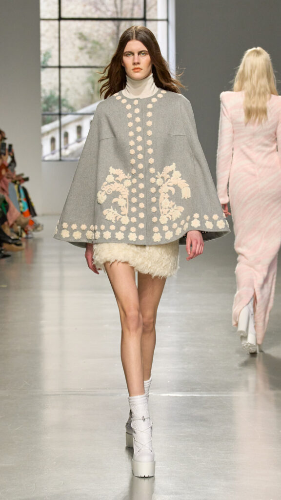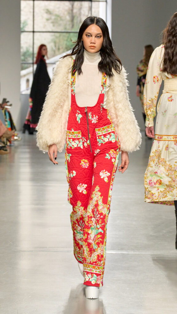 Zwischen halb Heidi und halb Lady Di vergnügt sich unsere Heldin in ihrer lipstick-roten Latzhose aus gestepptem Jersey auf der Skipiste. Am Abend verwandelt sie sich in einen echten Star auf der Tanzfläche und hinterlässt in einem trägerlosen Kleid einen bleibenden Eindruck. Mitten in der Nacht entspannt sie sich unter dem Sternenhimmel in einem schwarzen Wollumhang, der mit folkloristischen Blumensträußen bestickt ist. Am frühen Morgen kehrt sie auf die Piste zurück, beeindruckend in ihrem fürstlich voluminösen Mantel aus Cloqué-Brokat mit Monogramm. Sie wirbelt weiter, so anmutig wie eh und je.