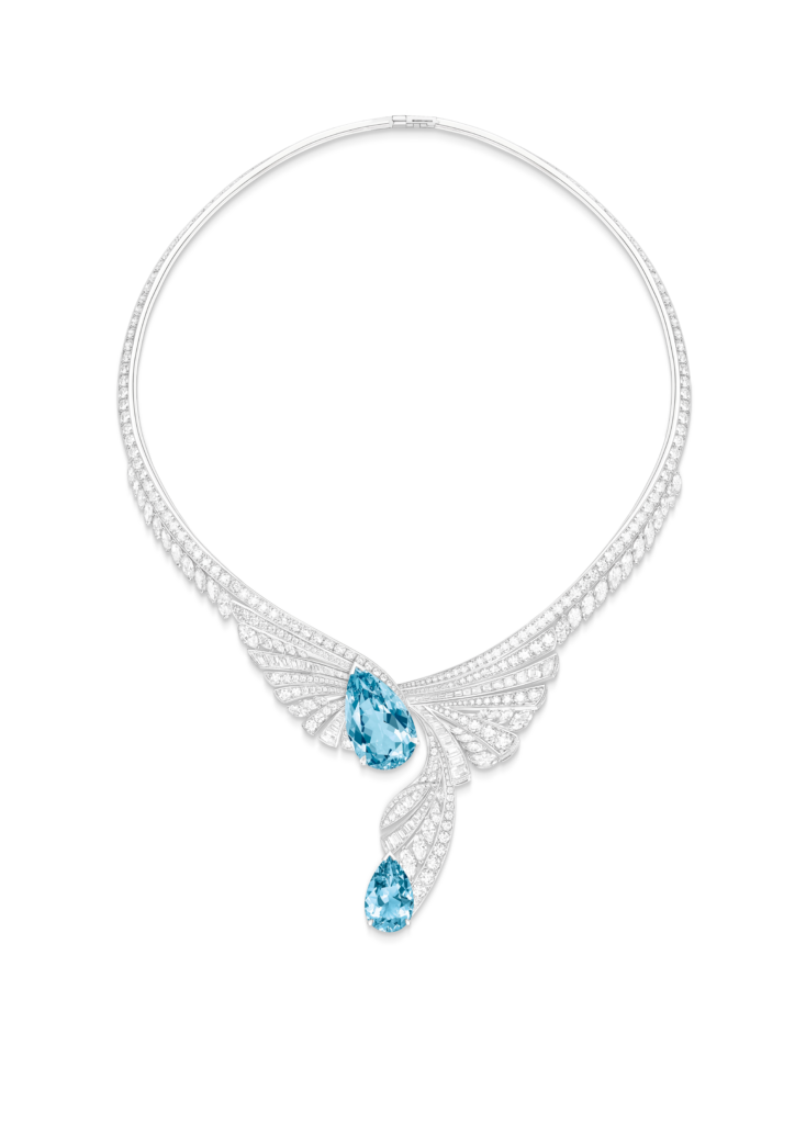 Le collier articulé Exalting Dance est un chef-d’œuvre de fluidité et de confort suprême, orné d’un duo d’aigues-marines bleu intense et d’une volute de diamants. Les boucles d’oreilles en diamants de la parure Exalting Dance sont une alliance d’élégance absolue et d’extravagance, dotées d’un mécanisme exclusif pour un port audacieux ou intemporel.