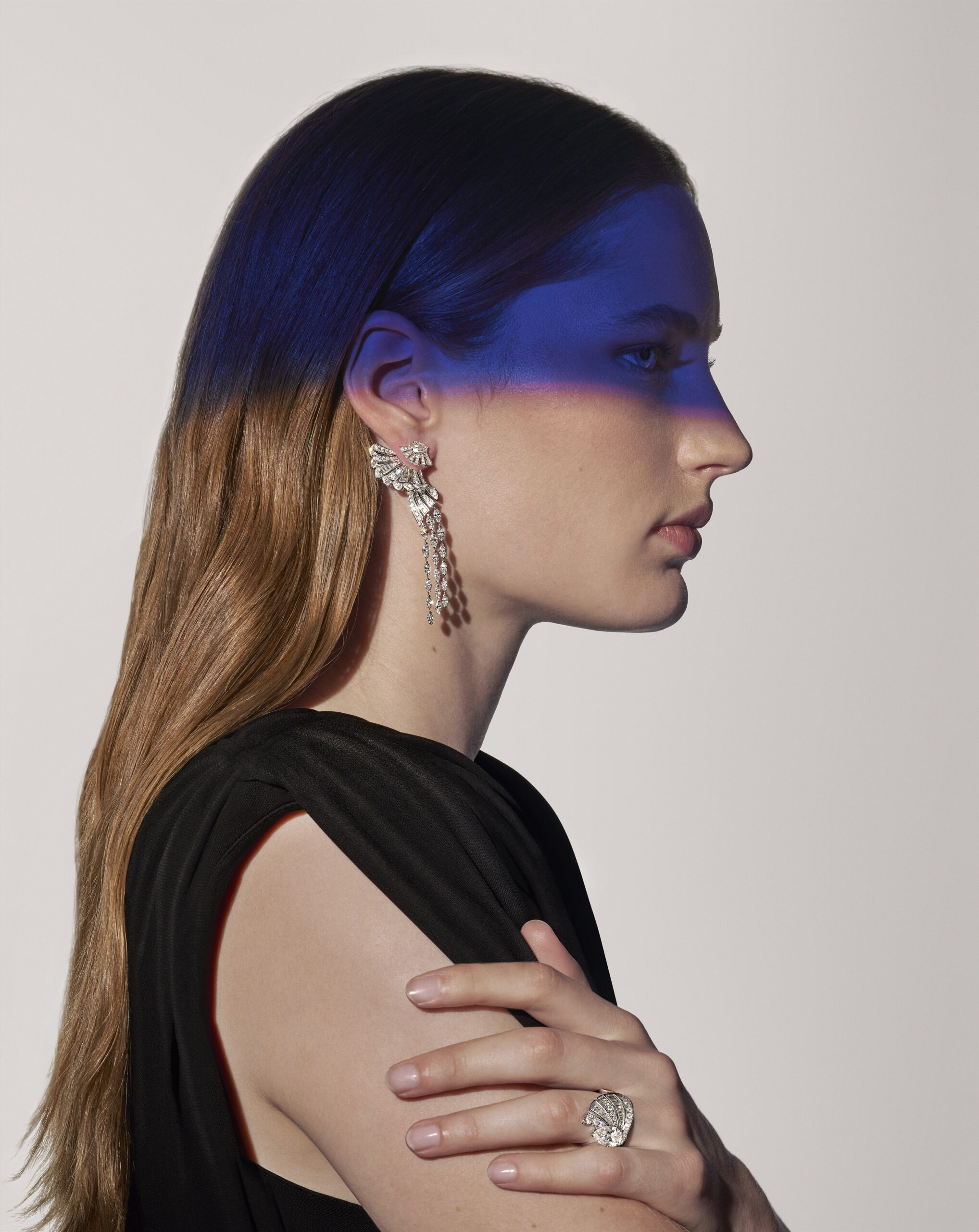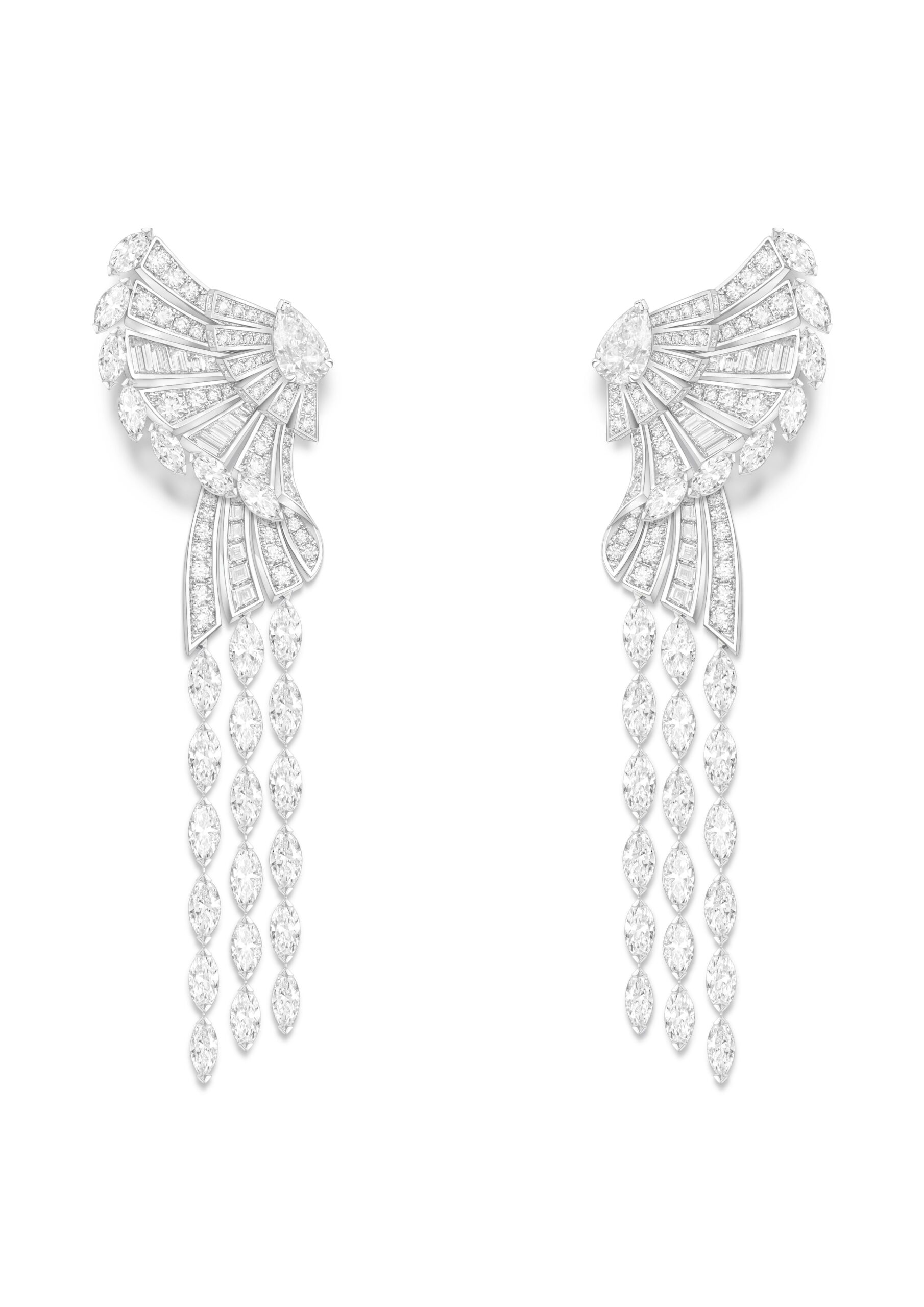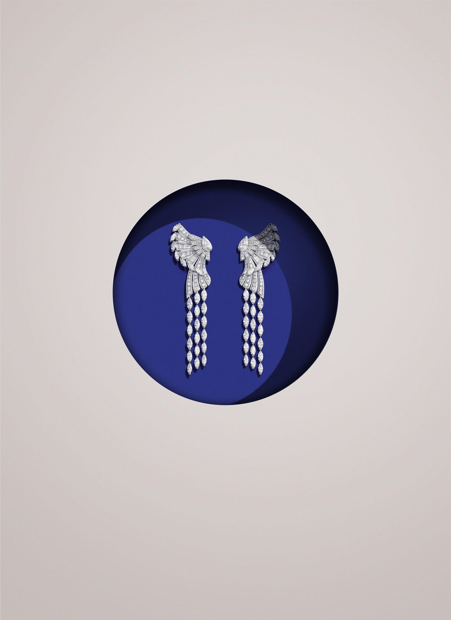 Le collier articulé Exalting Dance est un chef-d’œuvre de fluidité et de confort suprême, orné d’un duo d’aigues-marines bleu intense et d’une volute de diamants. Les boucles d’oreilles en diamants de la parure Exalting Dance sont une alliance d’élégance absolue et d’extravagance, dotées d’un mécanisme exclusif pour un port audacieux ou intemporel.