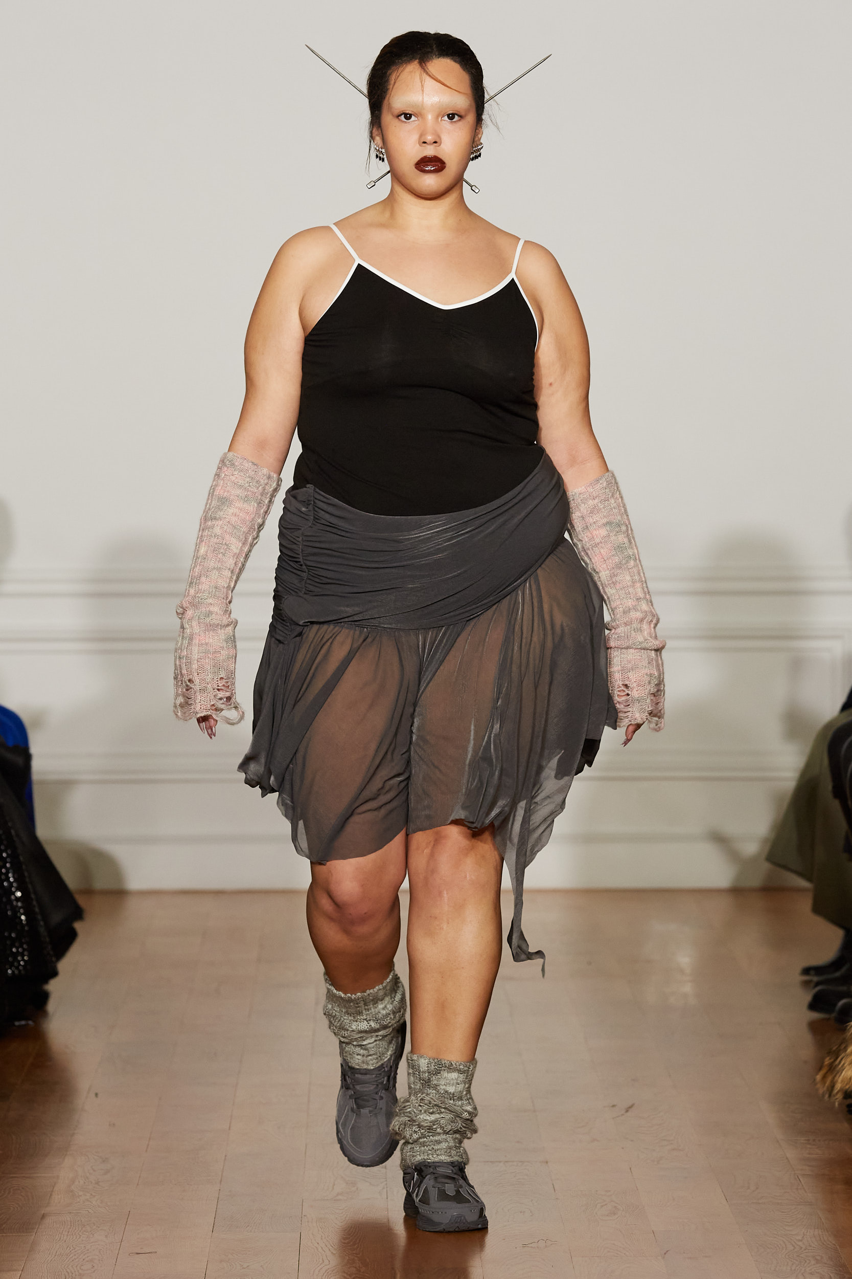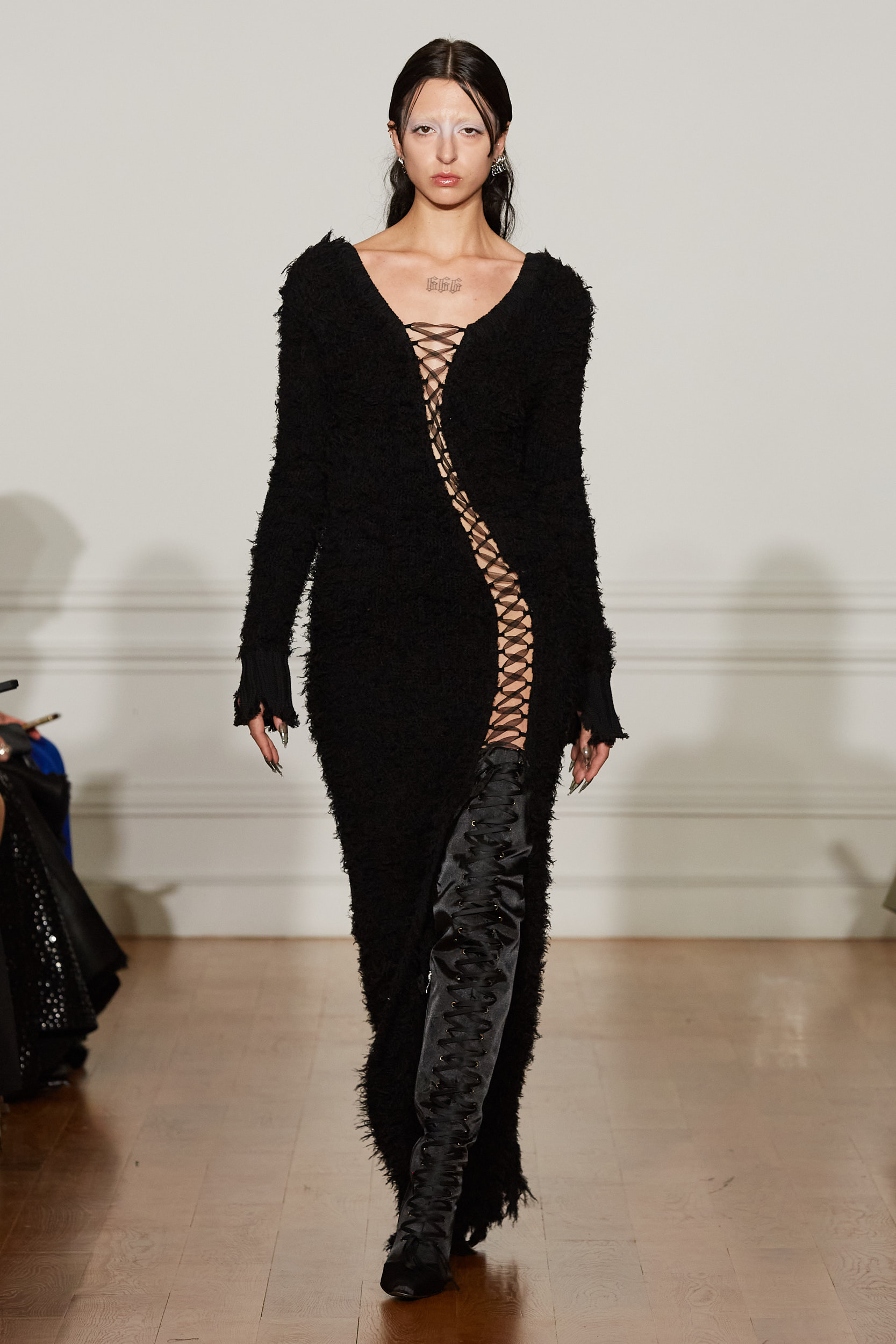 La collection s’inspire à la fois de la délicatesse des costumes de ballet européens et du raffinement du qipao chinois, symbole d’opulence dans le Shanghai des années 1920. Les tissus vaporeux et diaphanes dans des tons gris et charnus se superposent à la peau dans une brume d’un autre monde. Les vêtements de ballet féminins occidentaux se mêlent à des éléments chinois traditionnels, tels que les cols droits et les broderies de fleurs.
