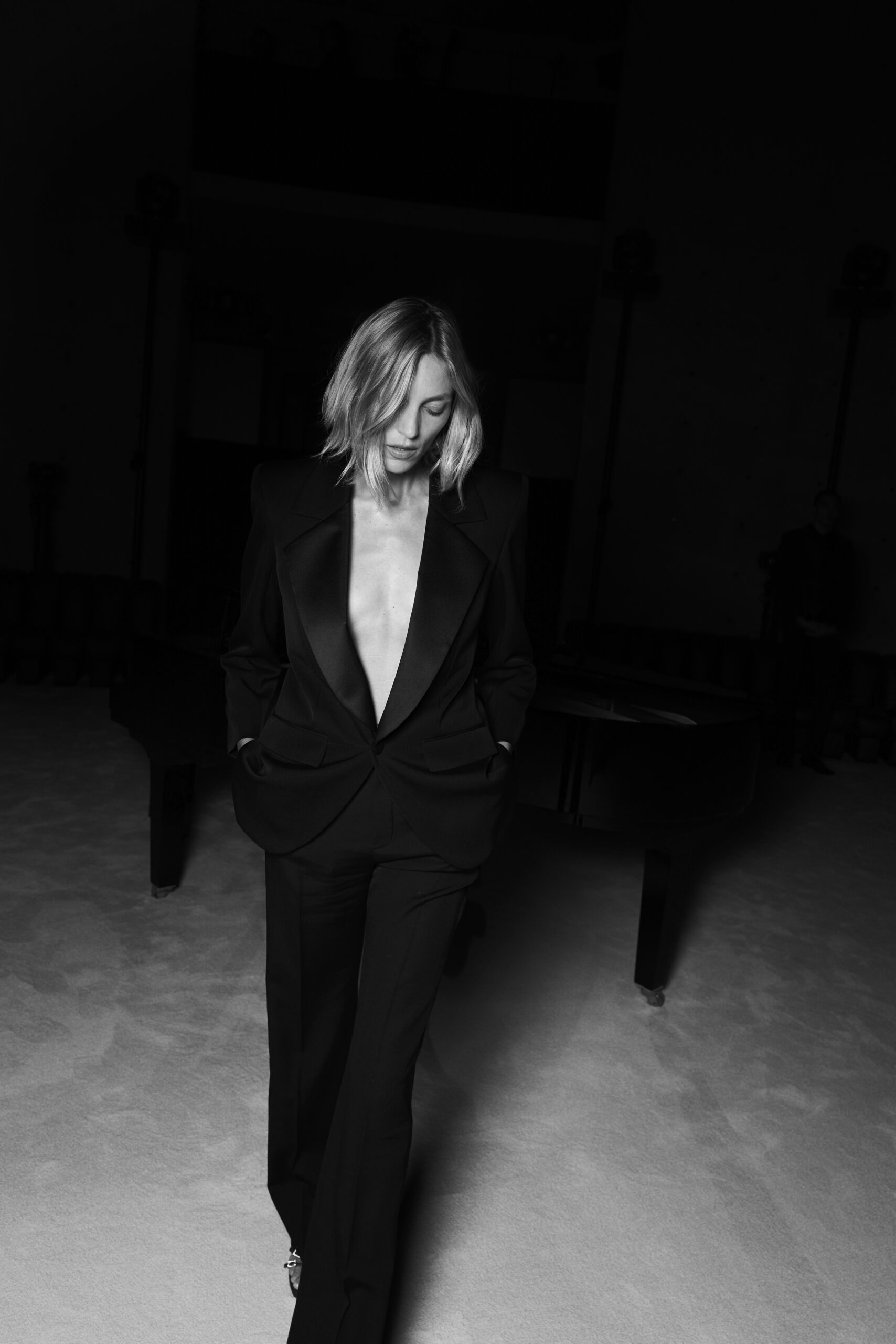 La structure en béton de la rotonde est en parfait accord avec la vision de Vaccarello, qui a su insuffler une dimension radicale à sa collection. La forme en O est omniprésente dans les looks présentés, symbole de perfection et de pureté d’exécution. Chaque détail est minutieusement pensé et les silhouettes, longues et fluides, sont soulignées par des épaules affirmées et une taille étroite.