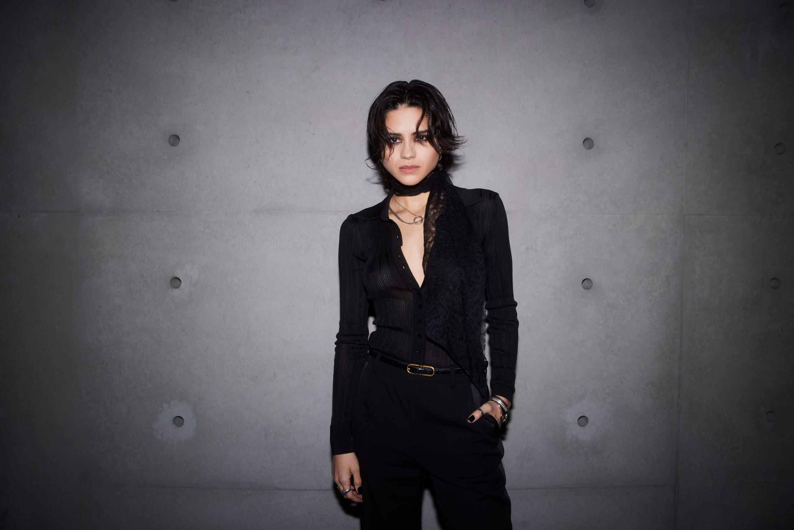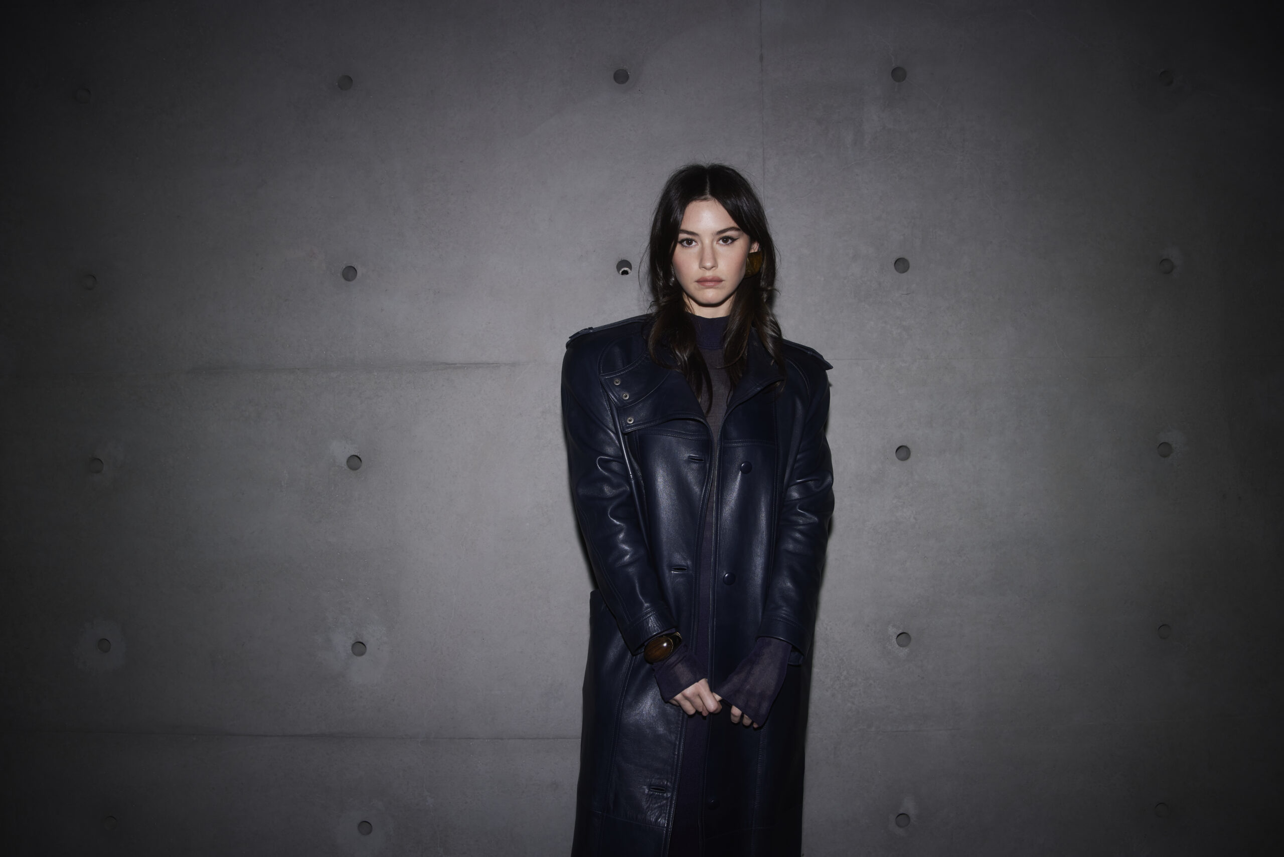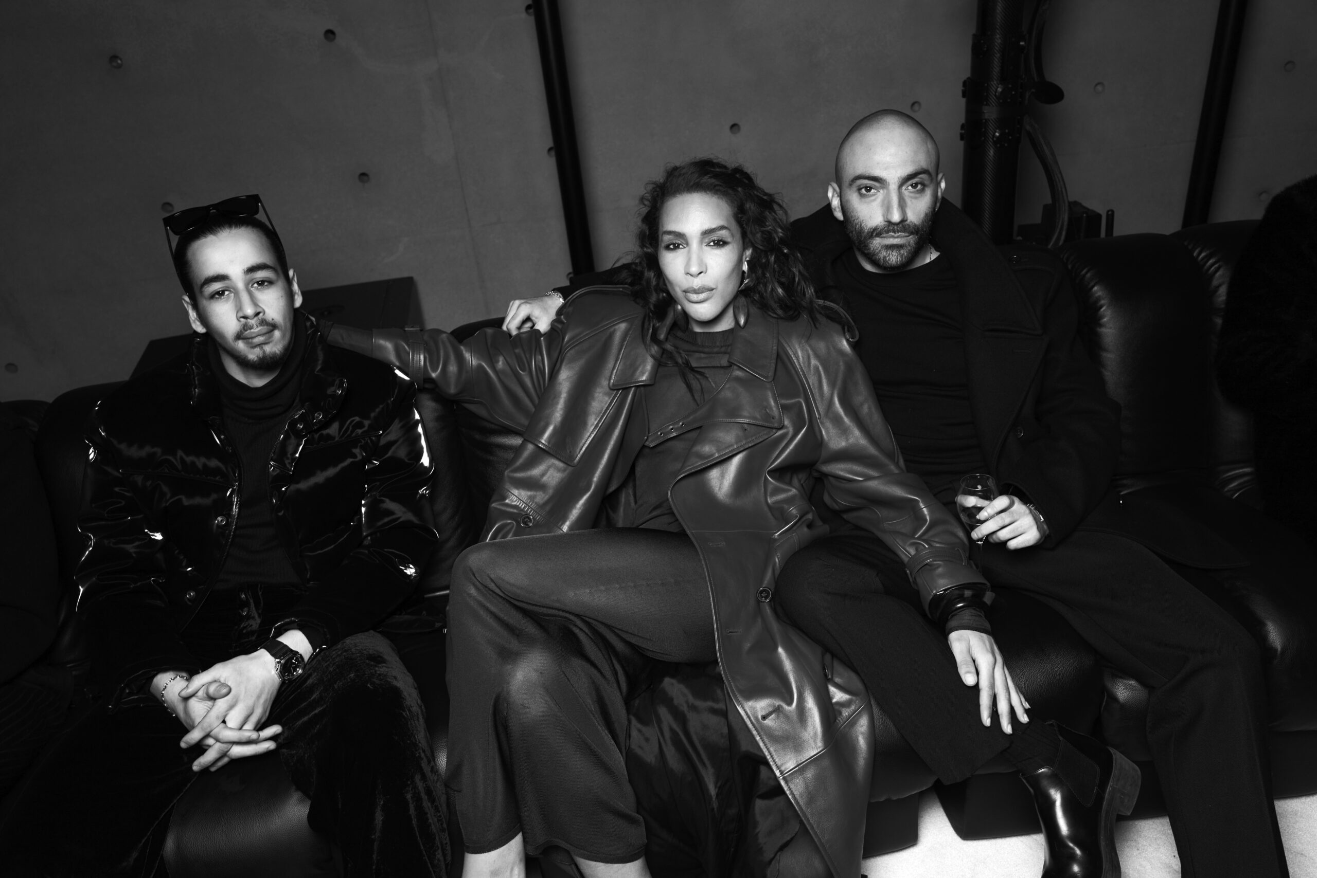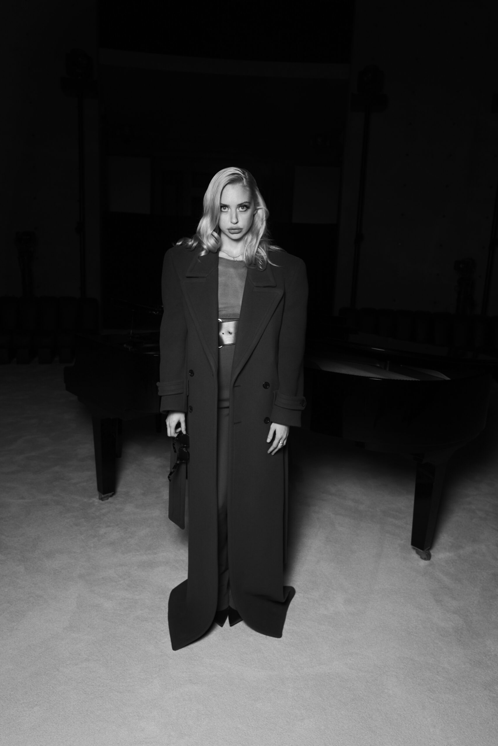 La palette de couleurs est épurée, entre noir, blanc, camel, bleu marine et des touches d’argent qui renforcent l’idée d’une sophistication audacieuse. Des matières douces comme le mohair, le cachemire, le satin et le velours contrastent avec des textures plus rugueuses pour un rendu harmonieux.