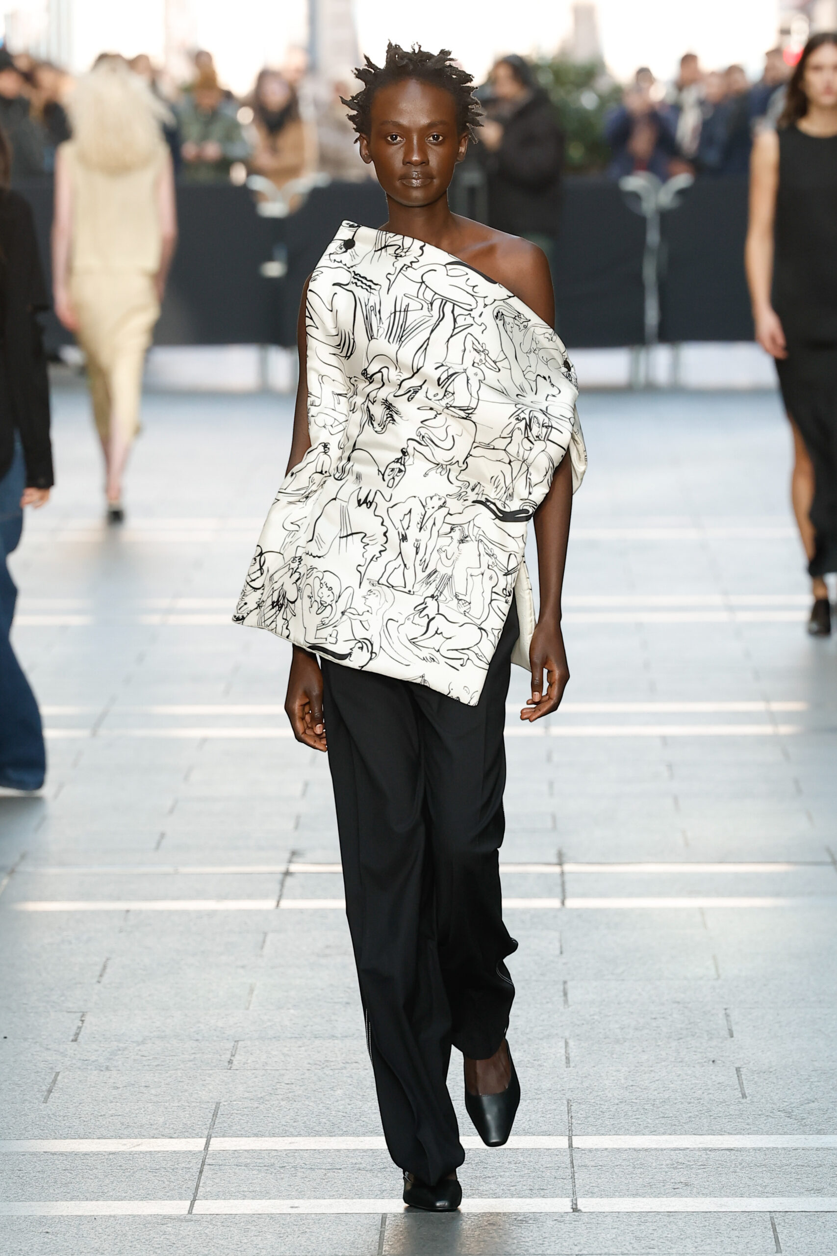 The growing relationship and stimulating dialogue between Marie-Christine Statz and Camille Henrot led to a series of black-and-white looks, including pajamas that might have been worn by Schnabel or Basquiat in the 1980s with an integral motif of Henrot’s erotic drawings, arranged in a dangerous promiscuity.