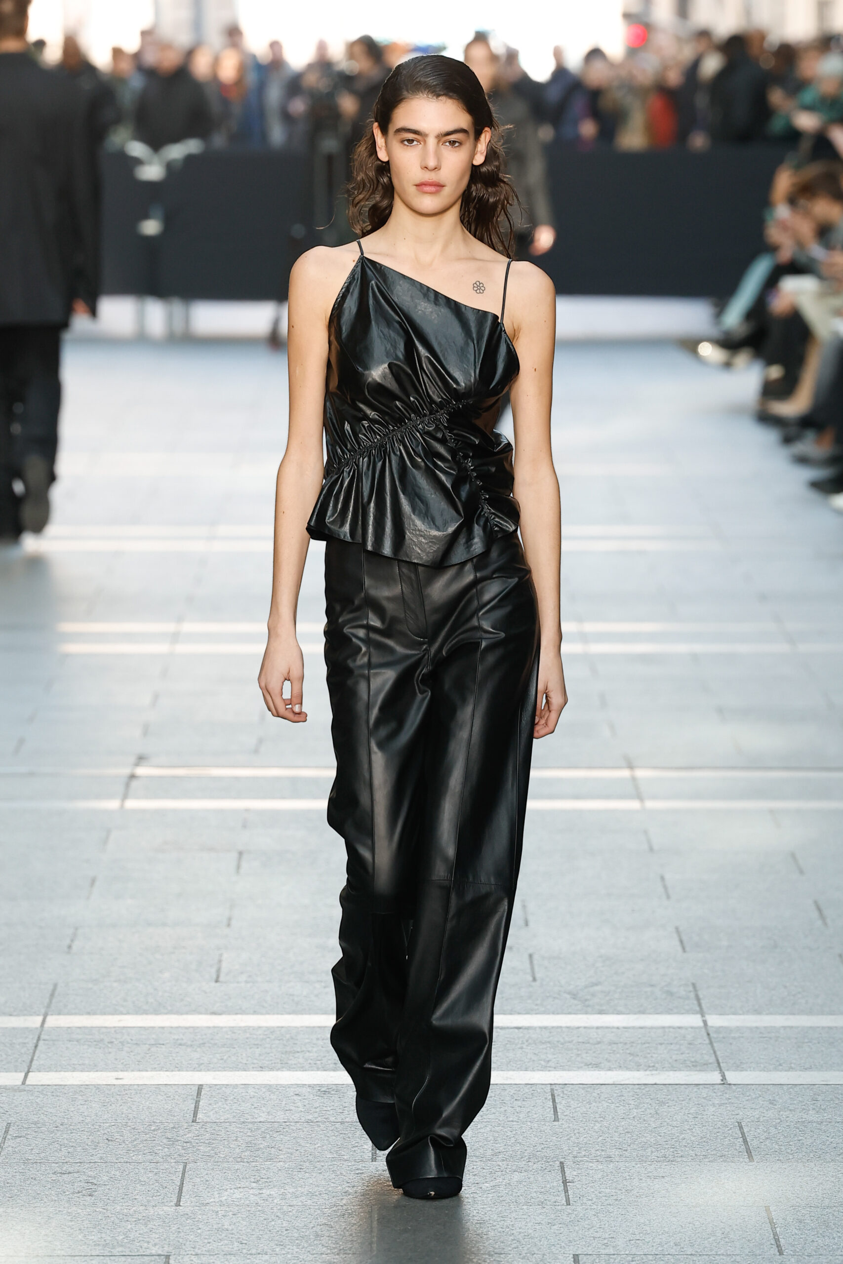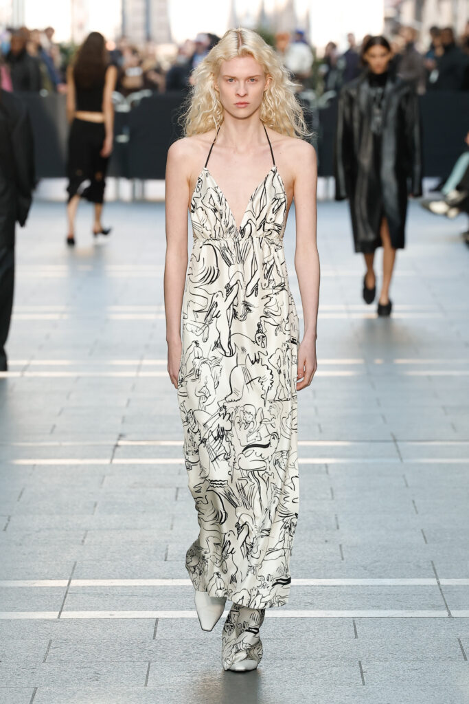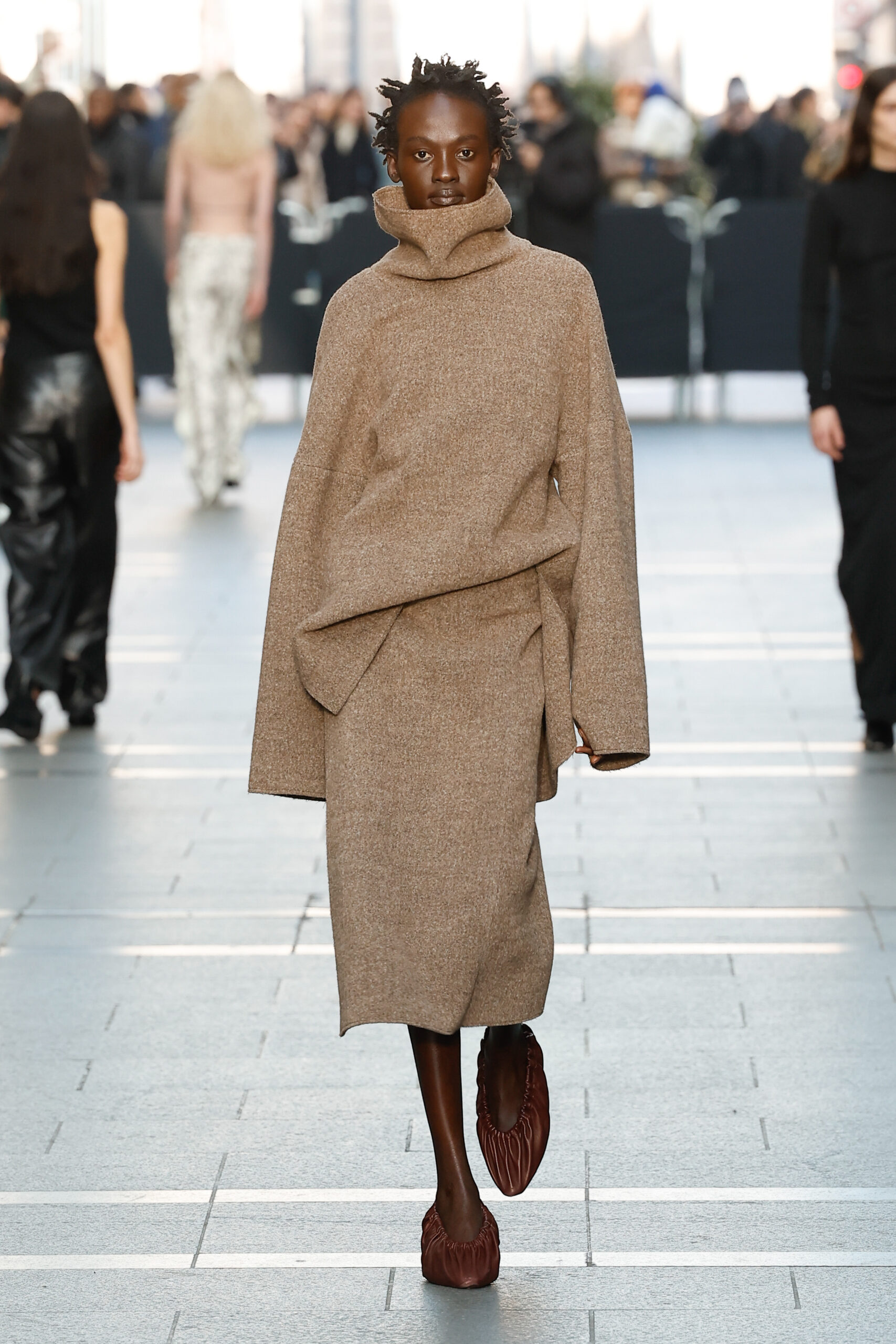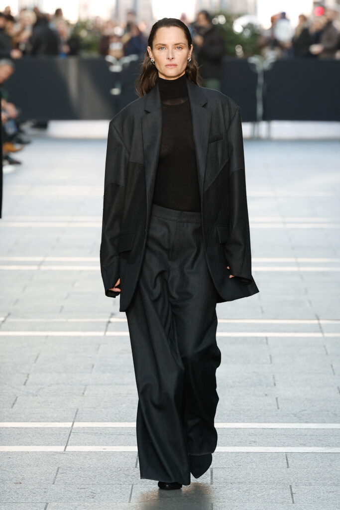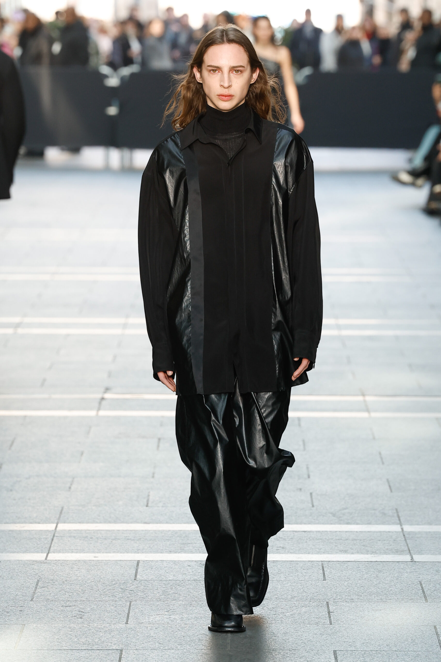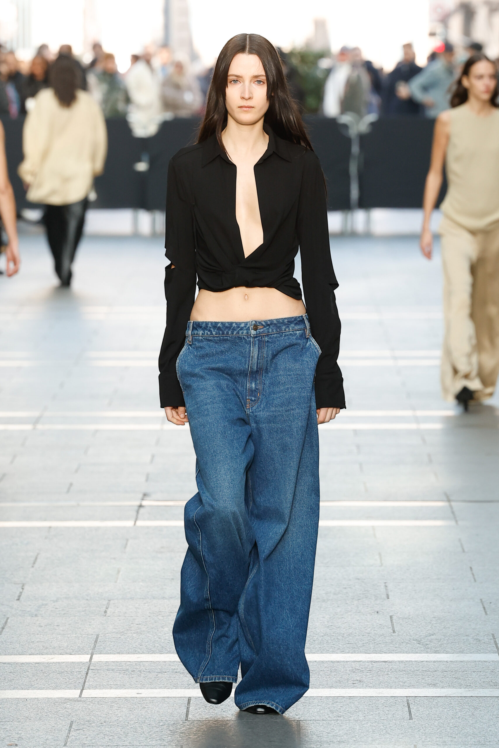 Des vestes et des pantalons en denim gris délavé jouent avec le volume et les plis. Des mailles asymétriques côtelées, plissées ou moulantes sont faites de fil vintage des années 90. Des cotons laqués brillants, du lin verni et des paillettes sont présentés dans des robes à épaules dénudées, des pantalons taille haute et des hauts bouffants. Le cuir noir, la laine brossée texturée, le jersey techno ou en coton et la serge de laine semi-transparente sont coupés en pulls à col roulé surdimensionnés et drapés dans des robes dos nu longues, des jupes midi et des tops courts avec une féminité garçonne.
