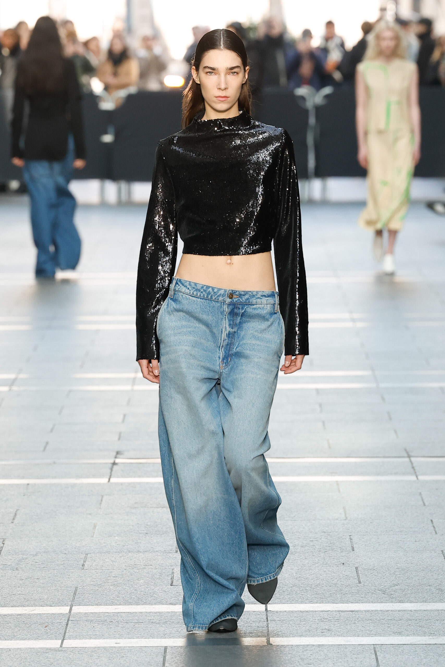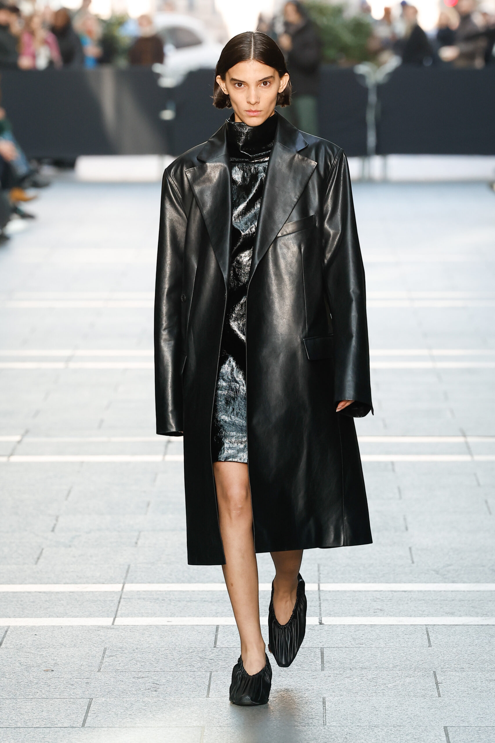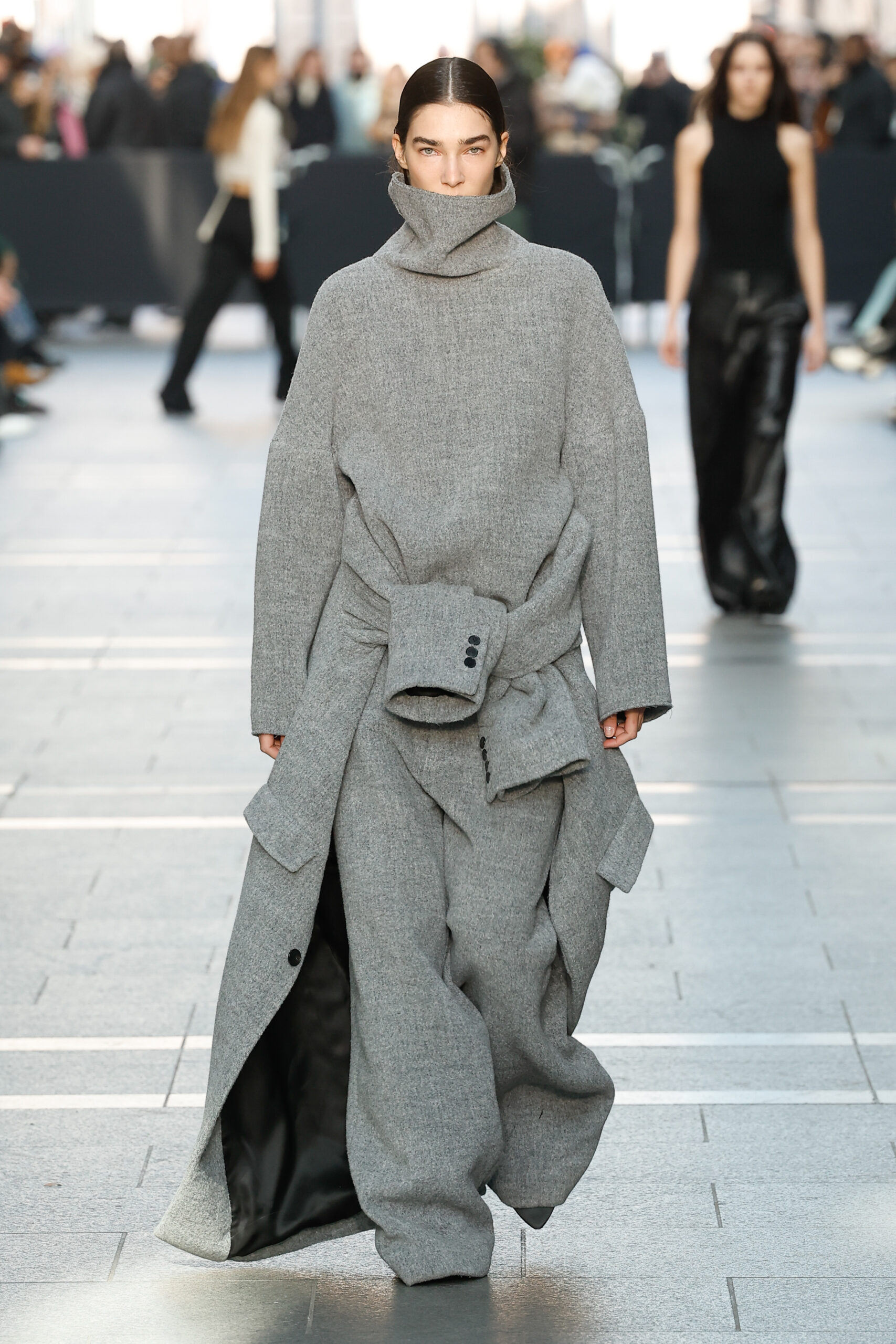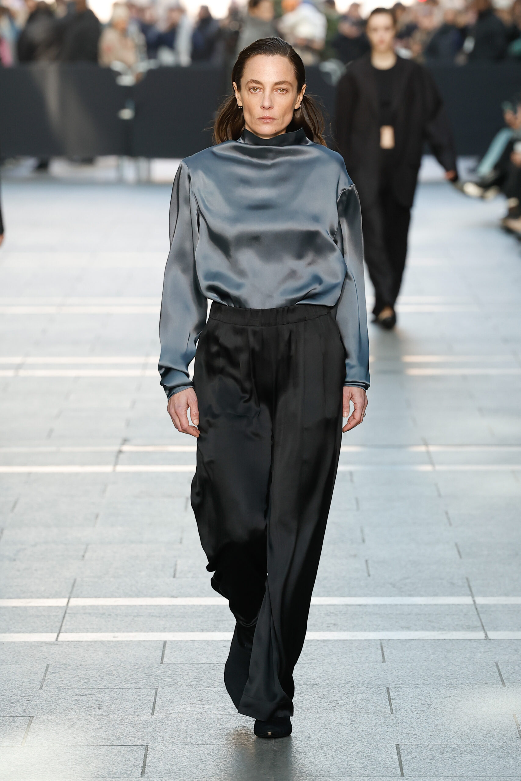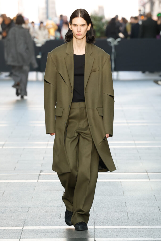Des vestes et des pantalons en denim gris délavé jouent avec le volume et les plis. Des mailles asymétriques côtelées, plissées ou moulantes sont faites de fil vintage des années 90. Des cotons laqués brillants, du lin verni et des paillettes sont présentés dans des robes à épaules dénudées, des pantalons taille haute et des hauts bouffants. Le cuir noir, la laine brossée texturée, le jersey techno ou en coton et la serge de laine semi-transparente sont coupés en pulls à col roulé surdimensionnés et drapés dans des robes dos nu longues, des jupes midi et des tops courts avec une féminité garçonne.