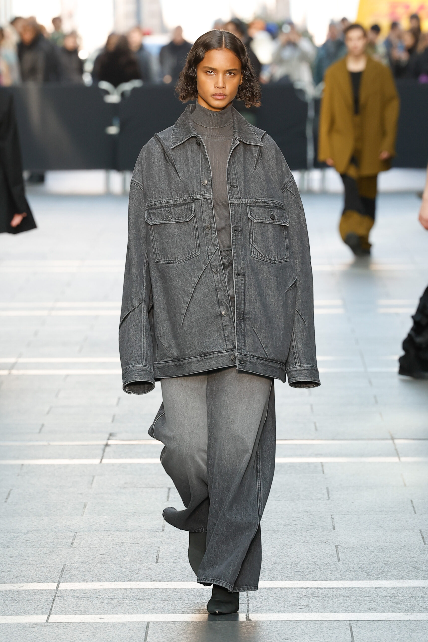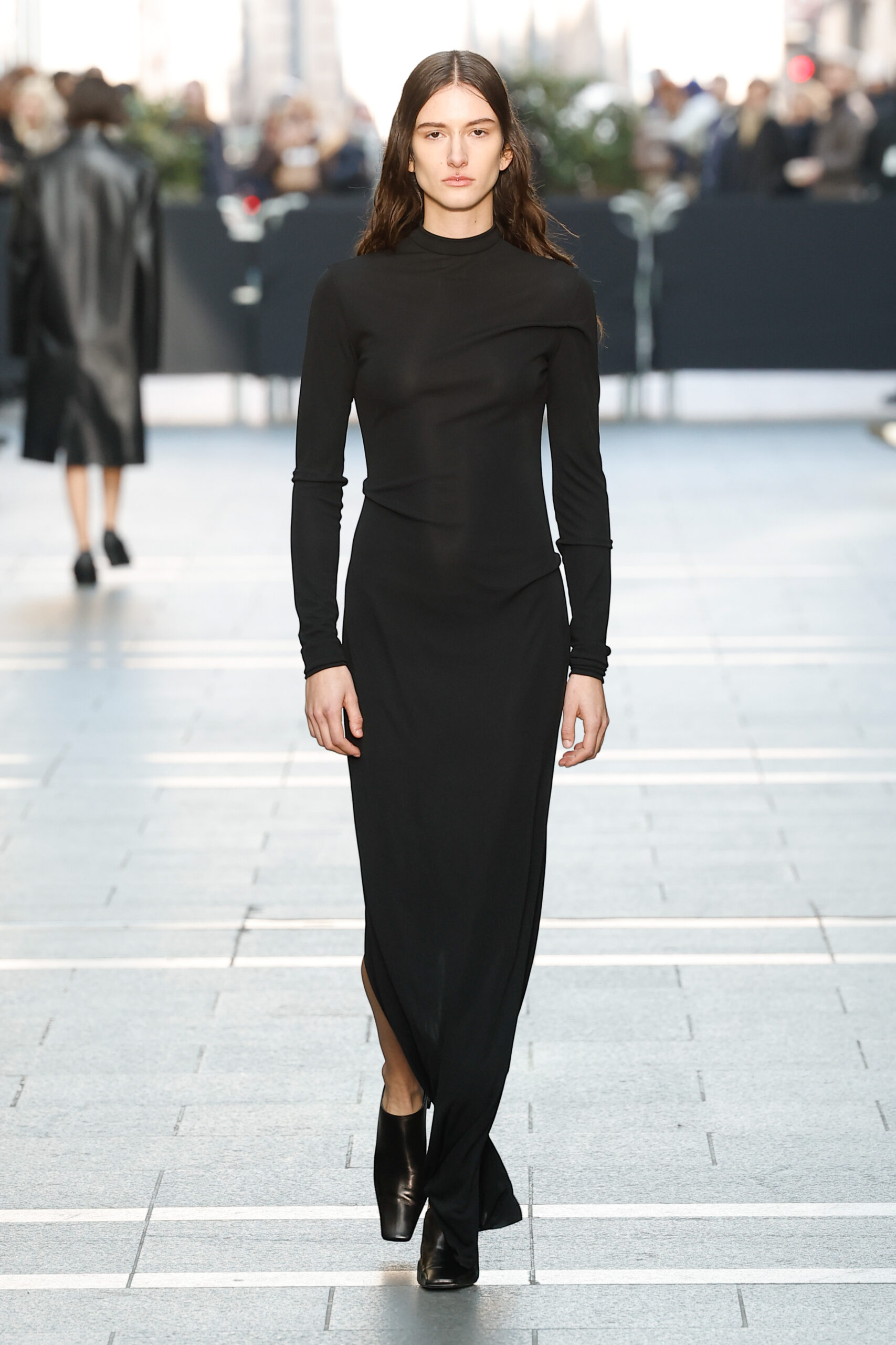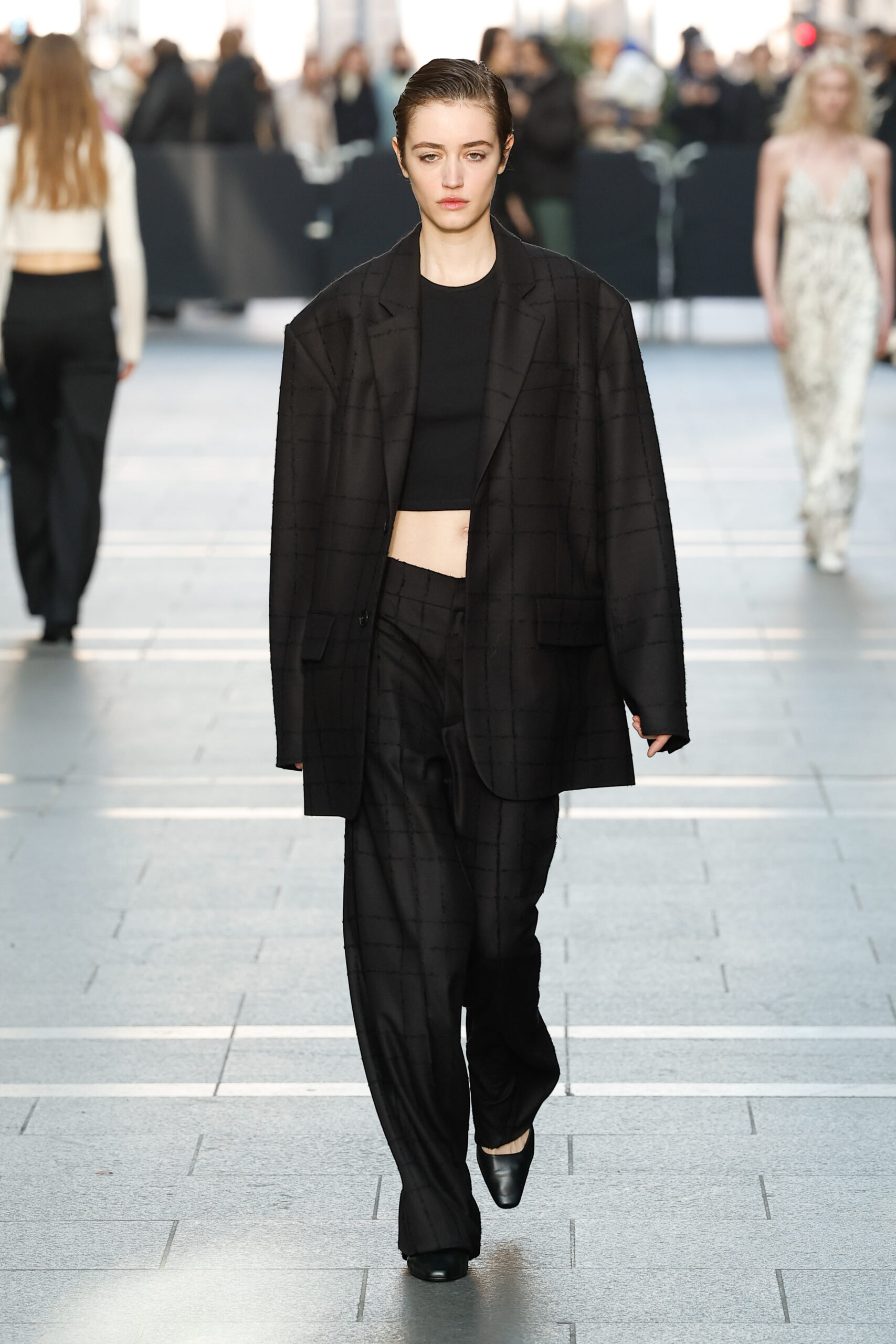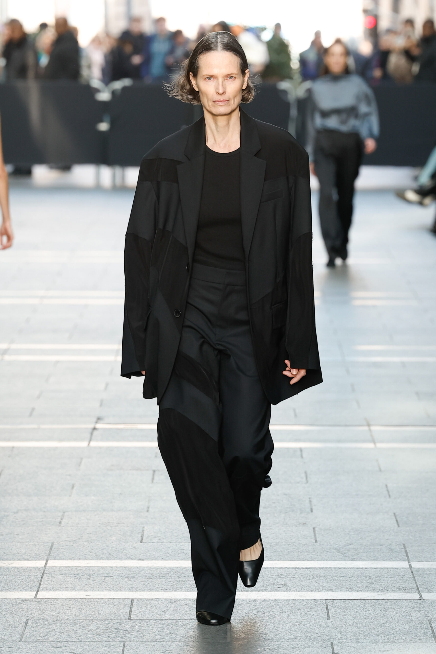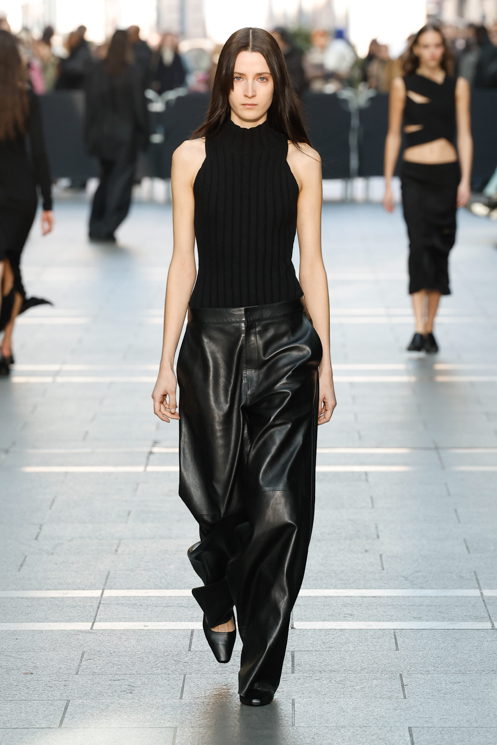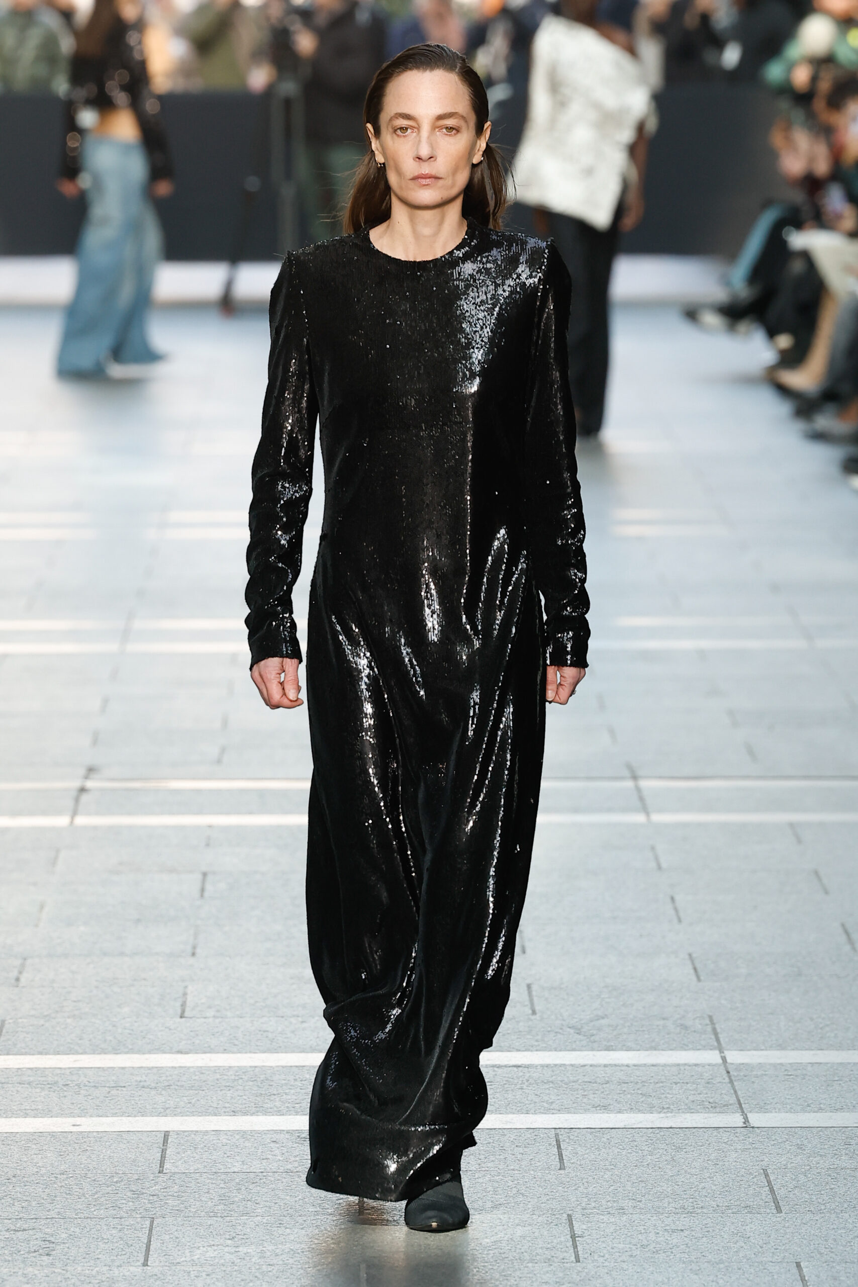 Des vestes et des pantalons en denim gris délavé jouent avec le volume et les plis. Des mailles asymétriques côtelées, plissées ou moulantes sont faites de fil vintage des années 90. Des cotons laqués brillants, du lin verni et des paillettes sont présentés dans des robes à épaules dénudées, des pantalons taille haute et des hauts bouffants. Le cuir noir, la laine brossée texturée, le jersey techno ou en coton et la serge de laine semi-transparente sont coupés en pulls à col roulé surdimensionnés et drapés dans des robes dos nu longues, des jupes midi et des tops courts avec une féminité garçonne.