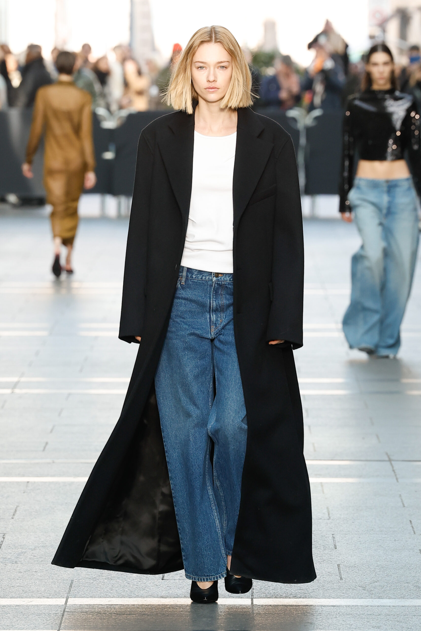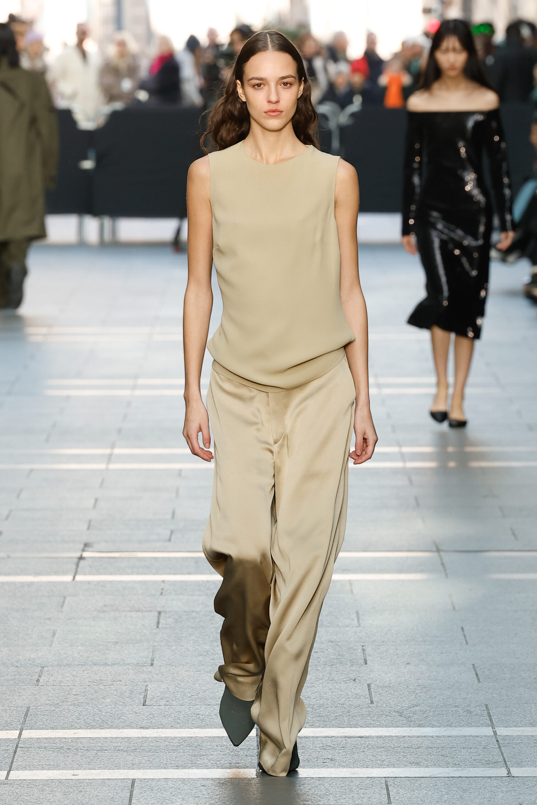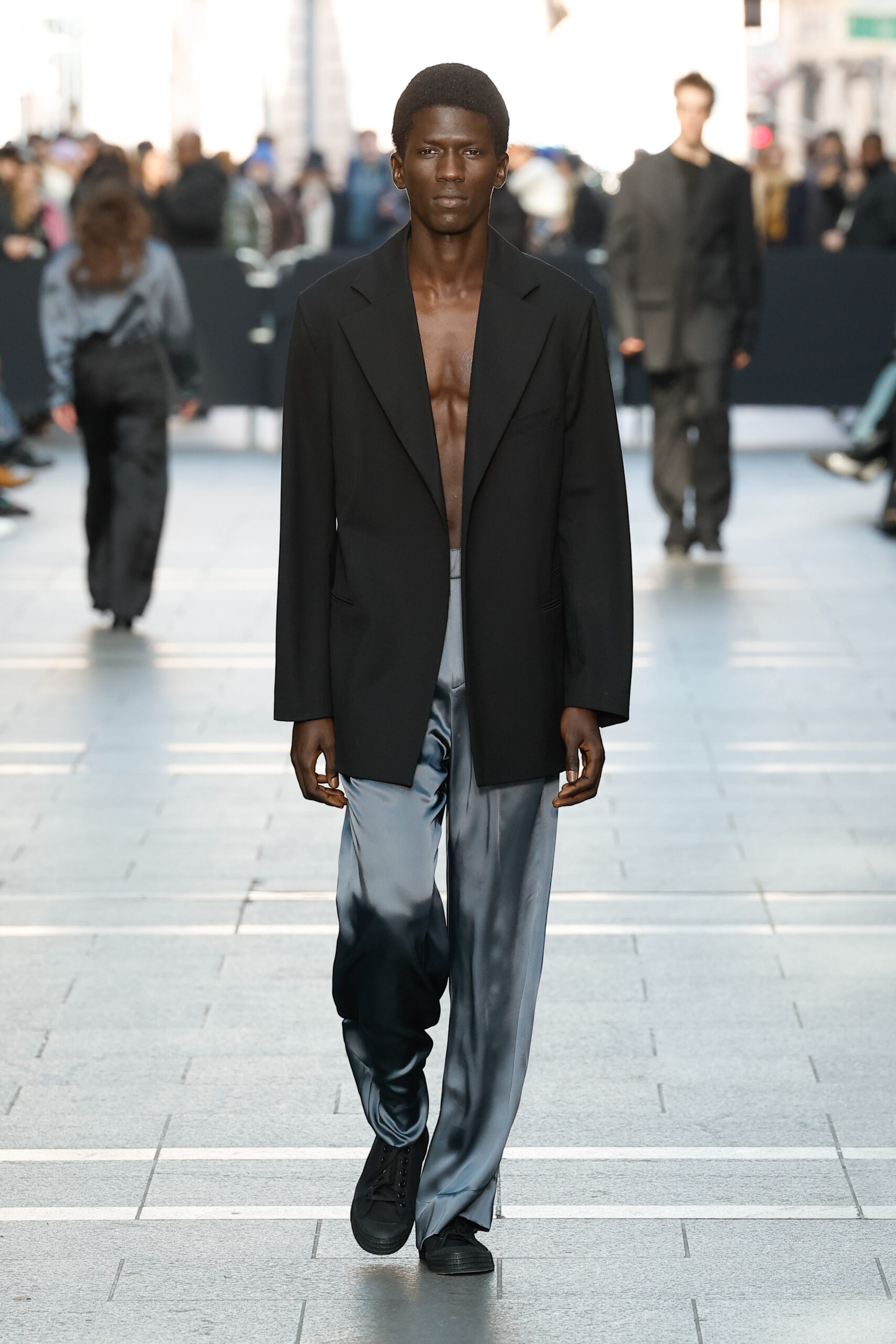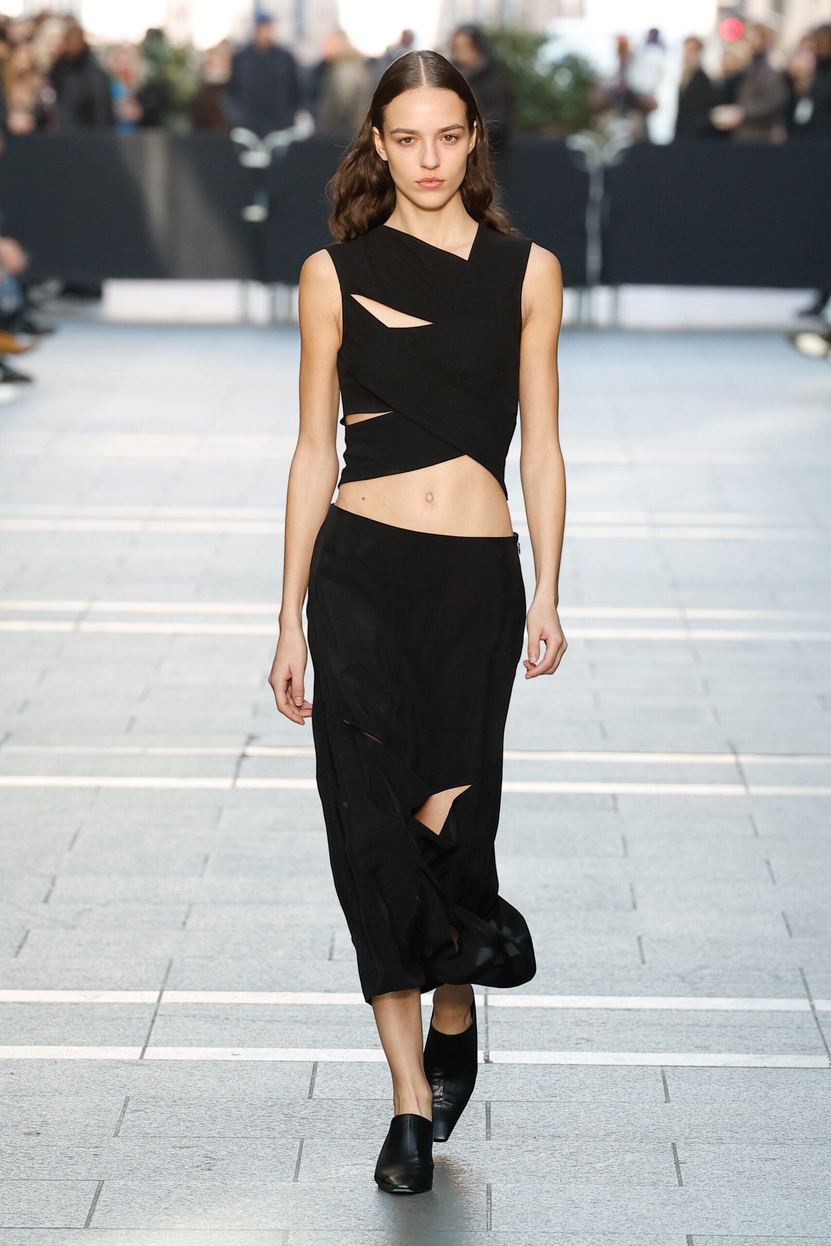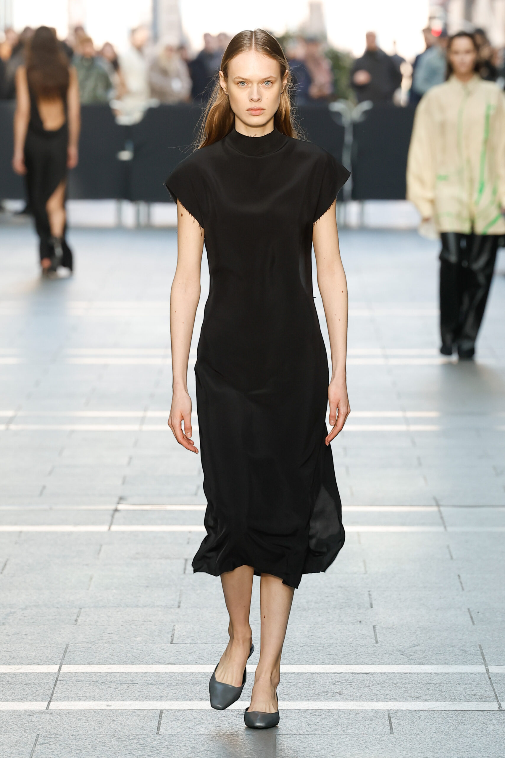 Des vestes et des pantalons en denim gris délavé jouent avec le volume et les plis. Des mailles asymétriques côtelées, plissées ou moulantes sont faites de fil vintage des années 90. Des cotons laqués brillants, du lin verni et des paillettes sont présentés dans des robes à épaules dénudées, des pantalons taille haute et des hauts bouffants. Le cuir noir, la laine brossée texturée, le jersey techno ou en coton et la serge de laine semi-transparente sont coupés en pulls à col roulé surdimensionnés et drapés dans des robes dos nu longues, des jupes midi et des tops courts avec une féminité garçonne.