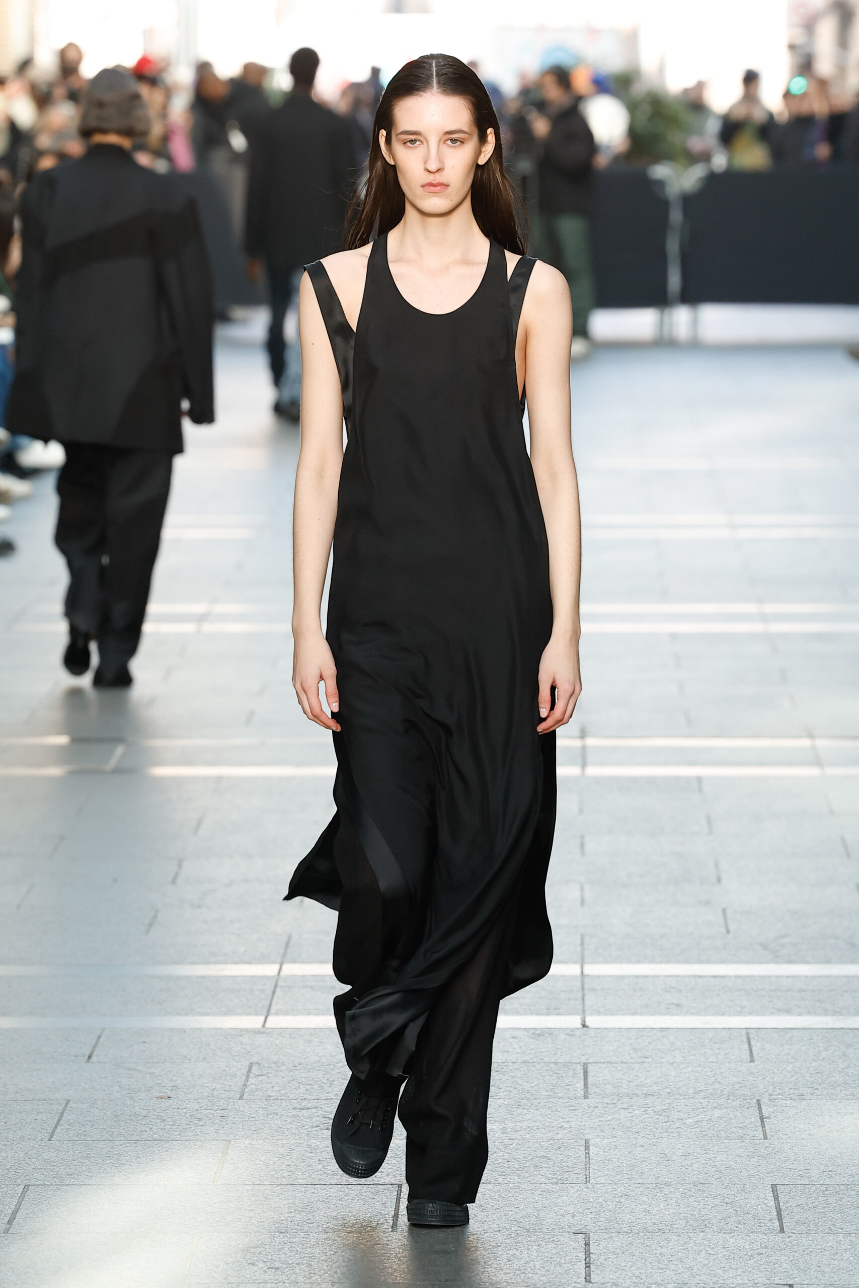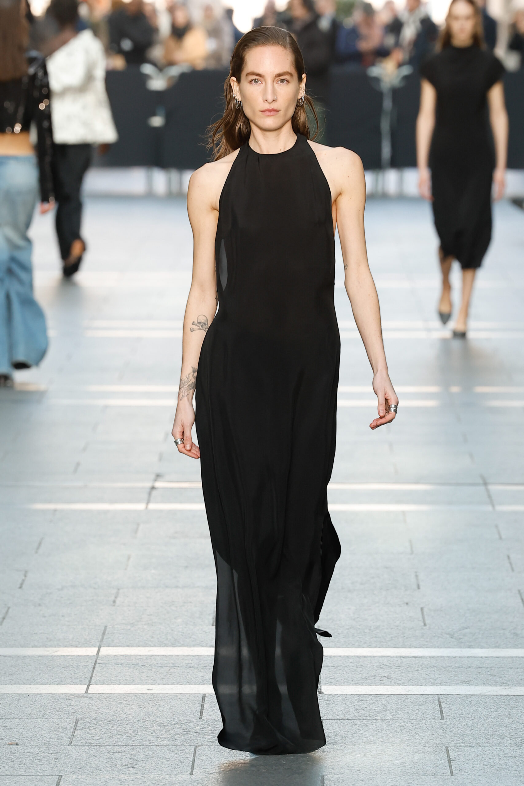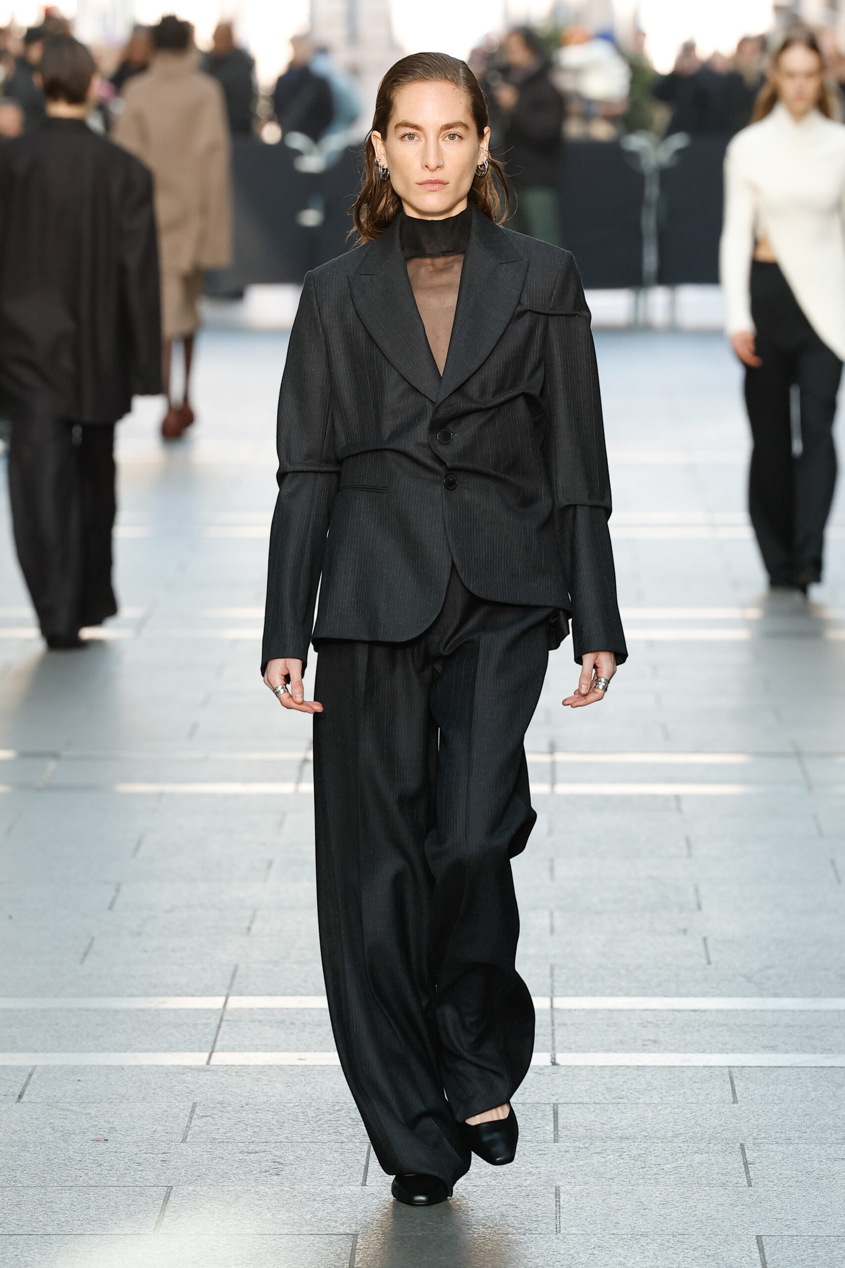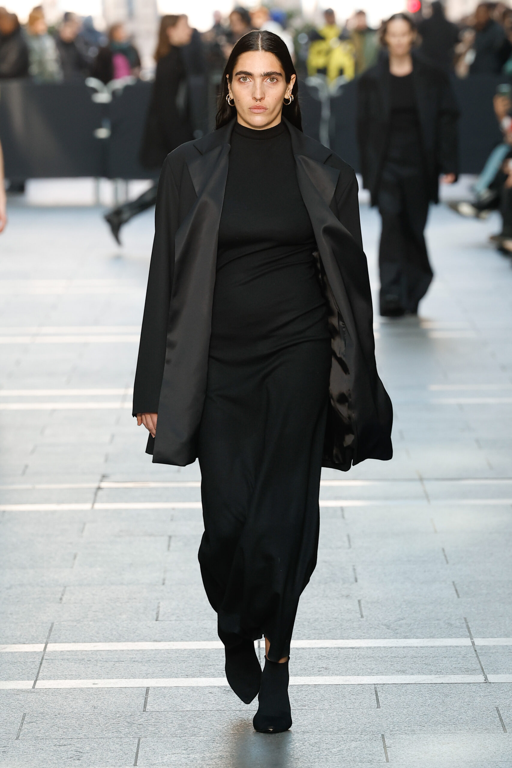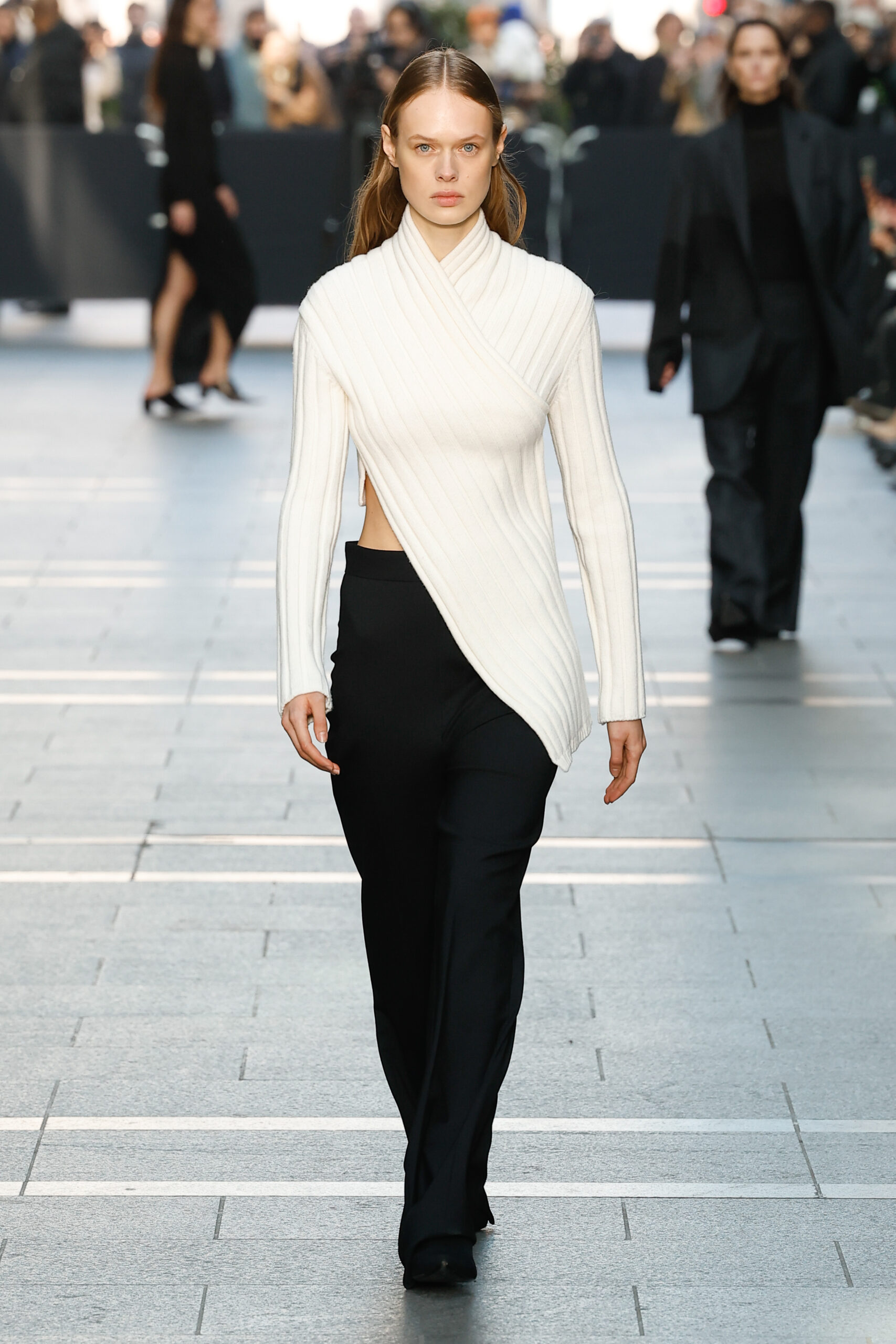 Des vestes et des pantalons en denim gris délavé jouent avec le volume et les plis. Des mailles asymétriques côtelées, plissées ou moulantes sont faites de fil vintage des années 90. Des cotons laqués brillants, du lin verni et des paillettes sont présentés dans des robes à épaules dénudées, des pantalons taille haute et des hauts bouffants. Le cuir noir, la laine brossée texturée, le jersey techno ou en coton et la serge de laine semi-transparente sont coupés en pulls à col roulé surdimensionnés et drapés dans des robes dos nu longues, des jupes midi et des tops courts avec une féminité garçonne.