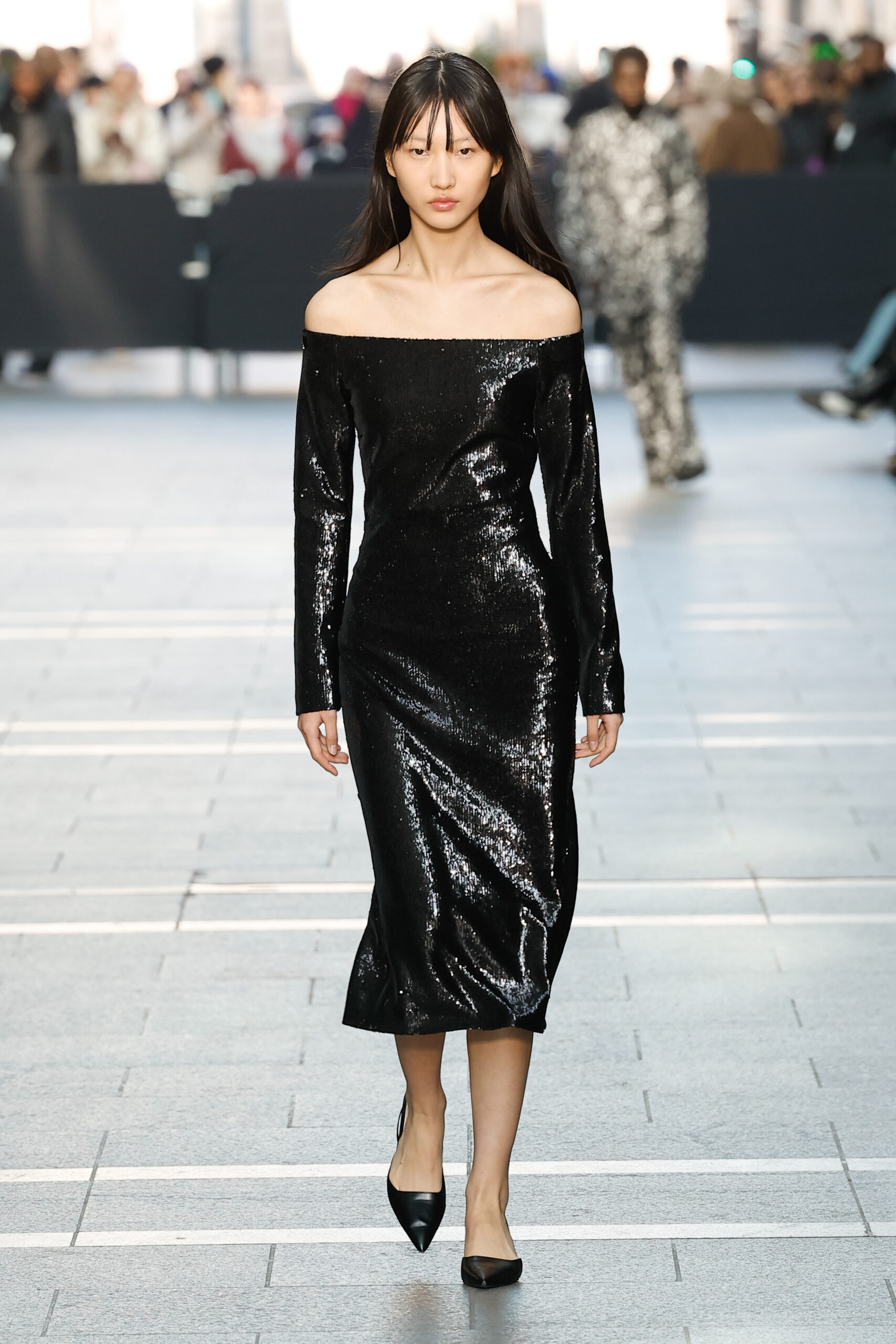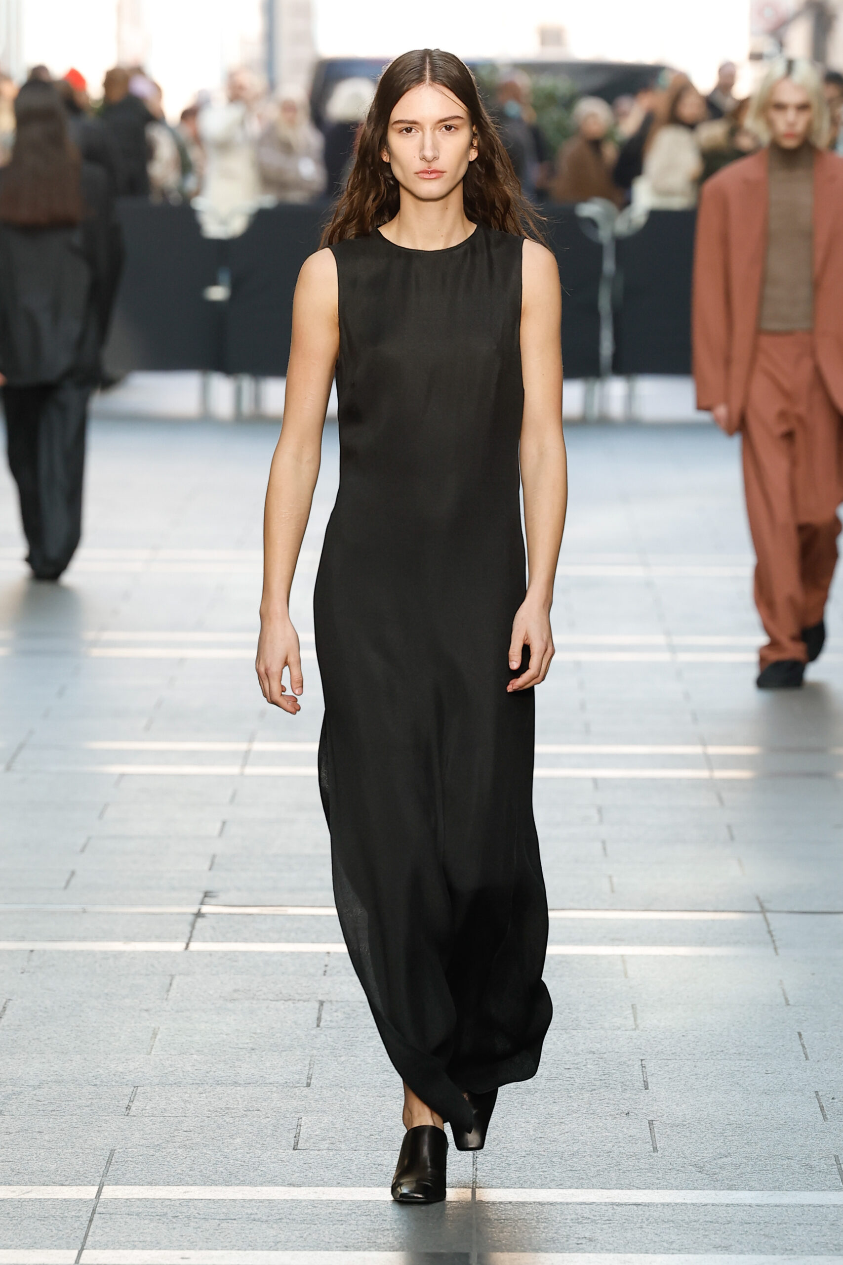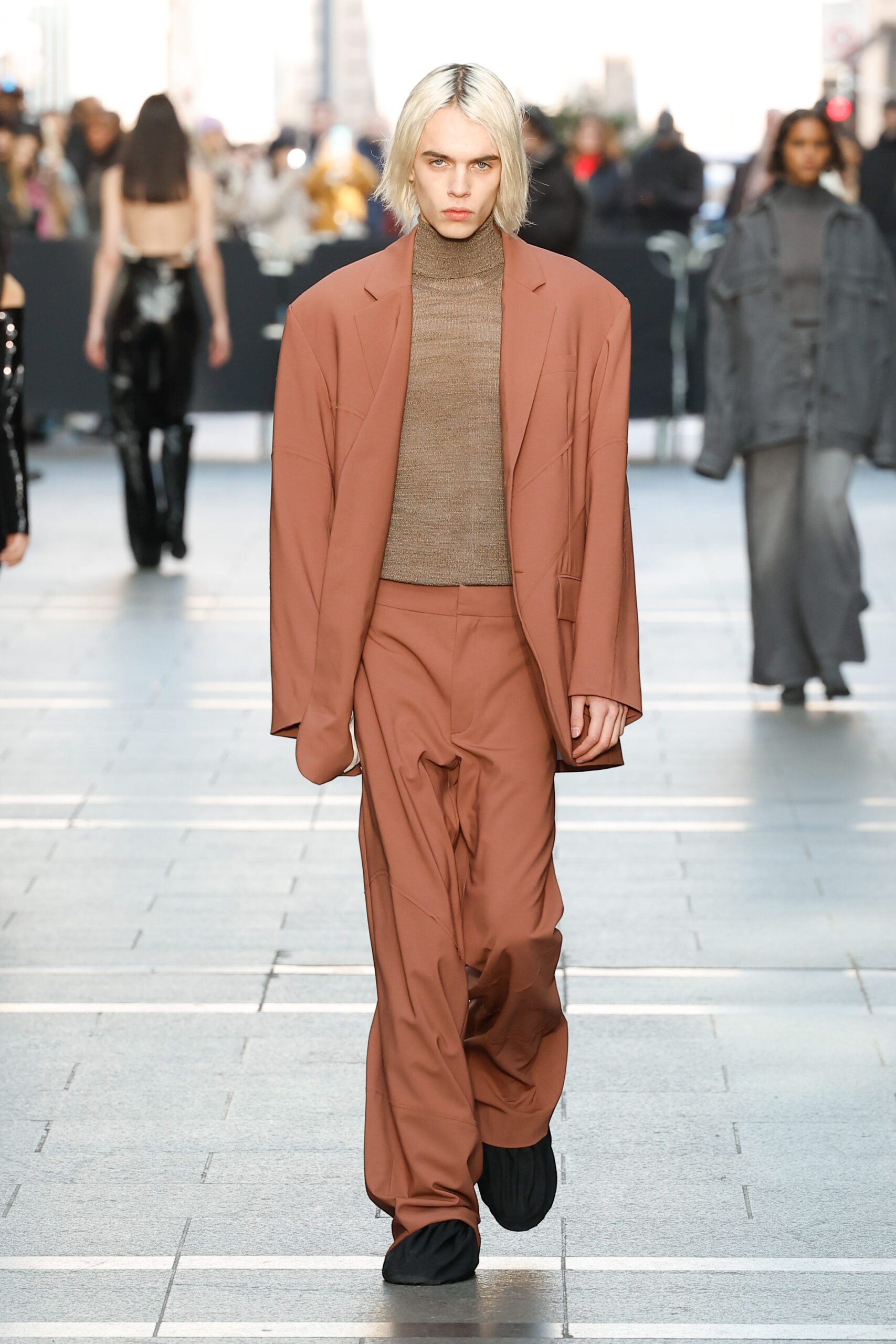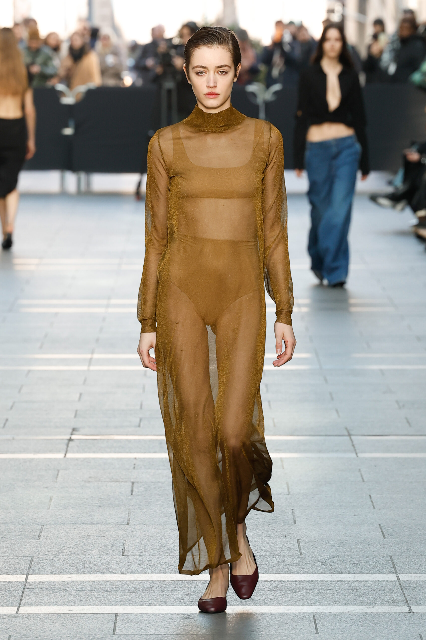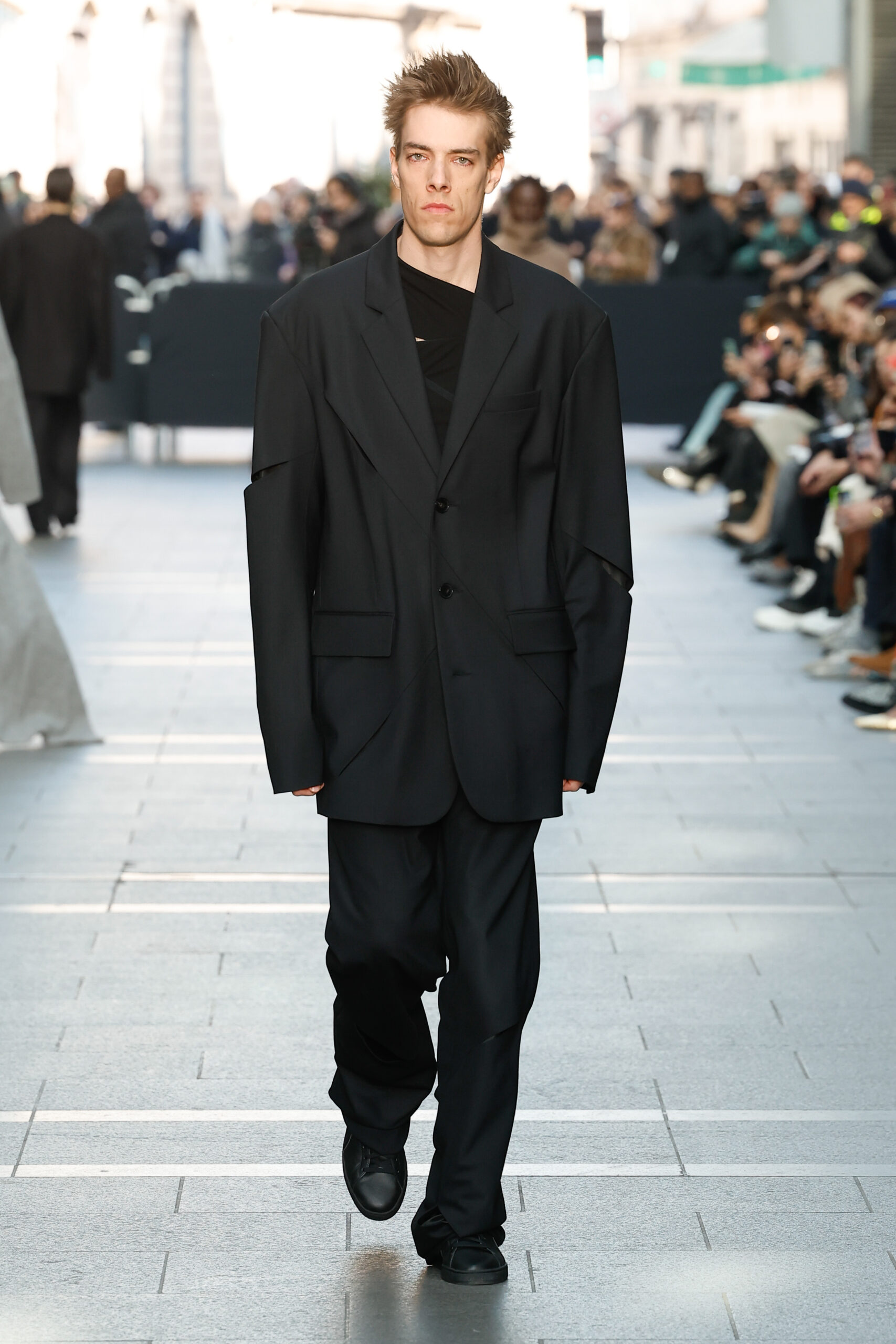 Des vestes et des pantalons en denim gris délavé jouent avec le volume et les plis. Des mailles asymétriques côtelées, plissées ou moulantes sont faites de fil vintage des années 90. Des cotons laqués brillants, du lin verni et des paillettes sont présentés dans des robes à épaules dénudées, des pantalons taille haute et des hauts bouffants. Le cuir noir, la laine brossée texturée, le jersey techno ou en coton et la serge de laine semi-transparente sont coupés en pulls à col roulé surdimensionnés et drapés dans des robes dos nu longues, des jupes midi et des tops courts avec une féminité garçonne.