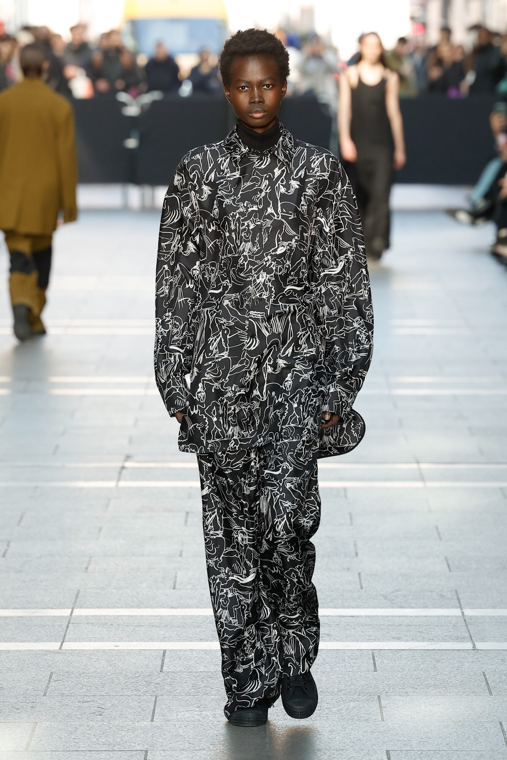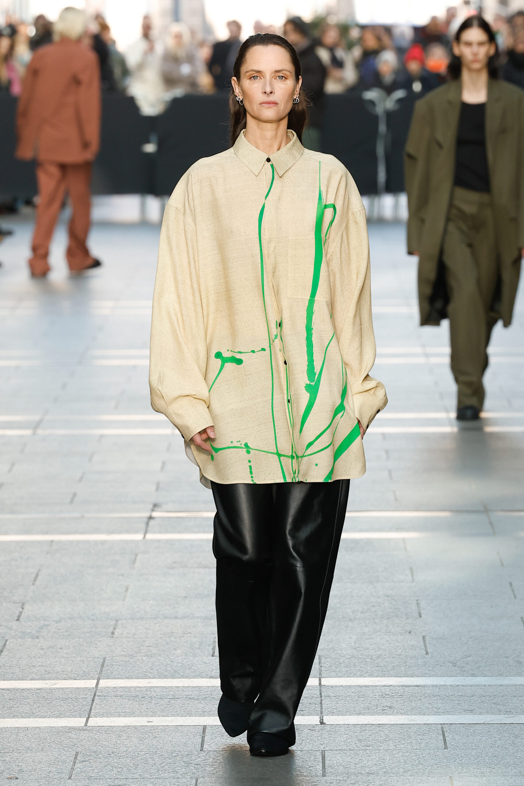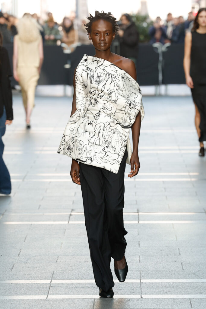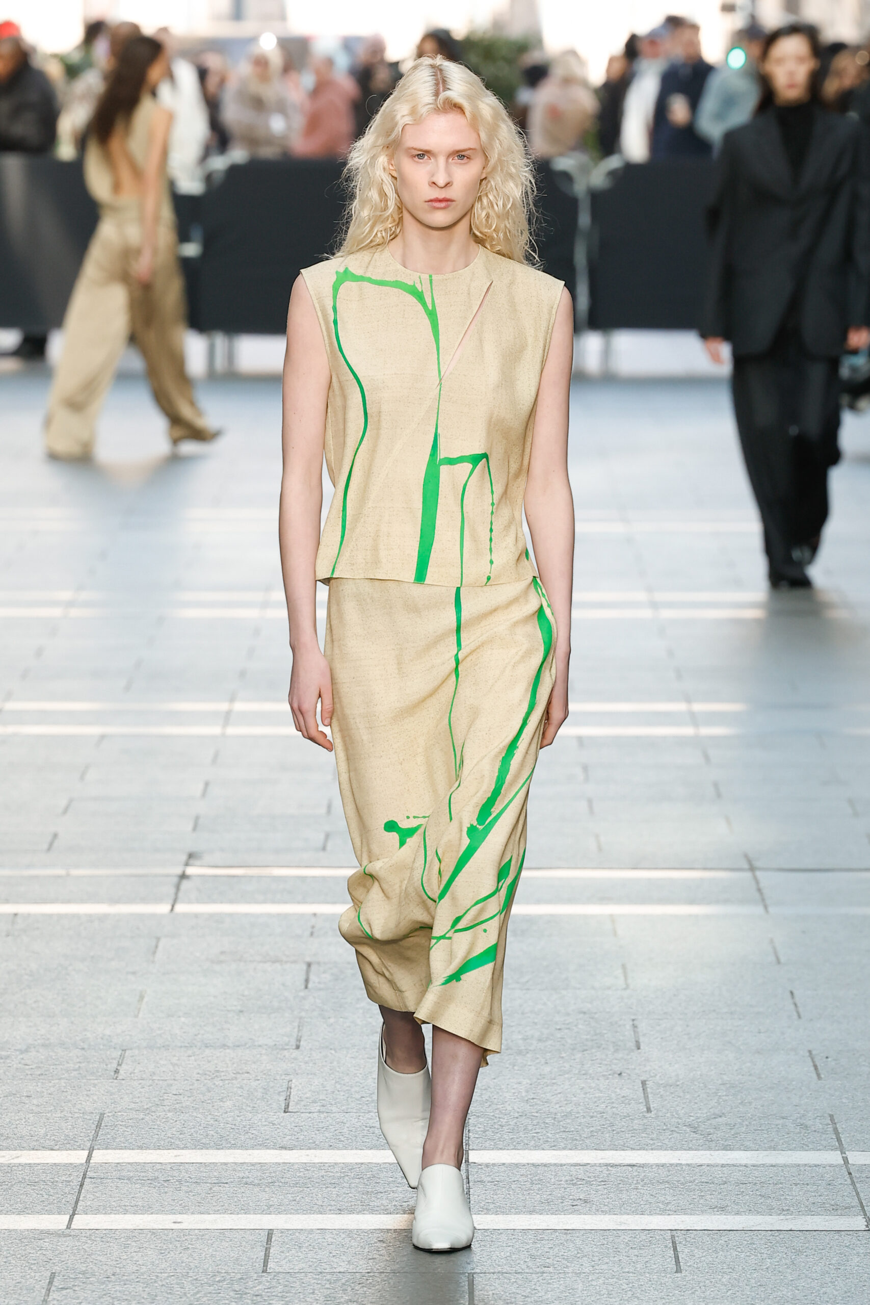 La palette de couleurs est principalement composée de différentes nuances de gris, de tons marron clair, de crème, de blanc et de beaucoup de noir. Les looks principalement monochromes sont accentués par un imprimé vert vif. Marie-Christine Statz a extrait le motif d’une œuvre sans titre que Camille Henrot a peinte en 2022. Il a été transformé sur une viscose couleur sable ressemblant à une toile. La chemise surdimensionnée, la jupe mi-longue et le haut sans manches sont construits avec des fentes placées qui forment leur forme individuelle et remodèlent l’œuvre d’art en mouvement.