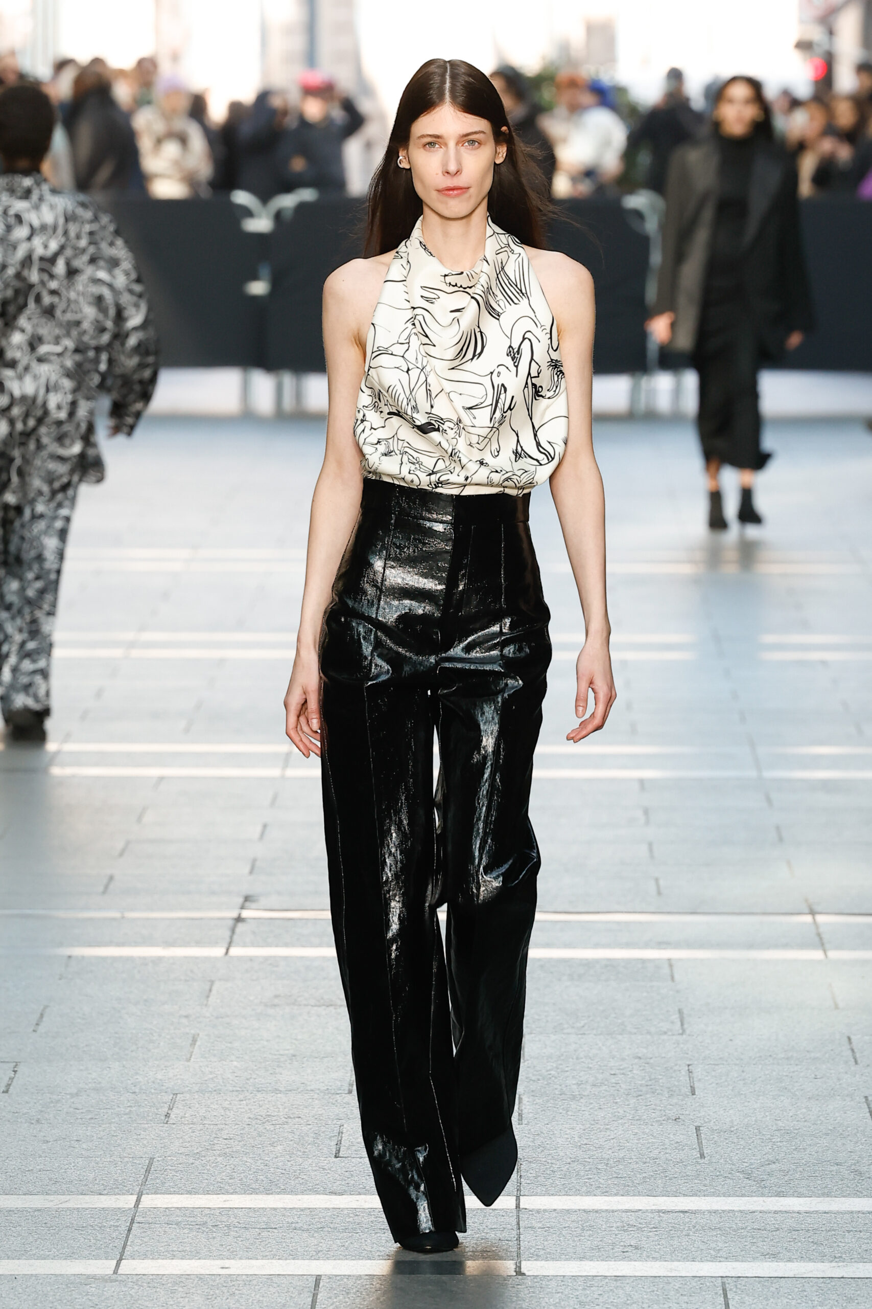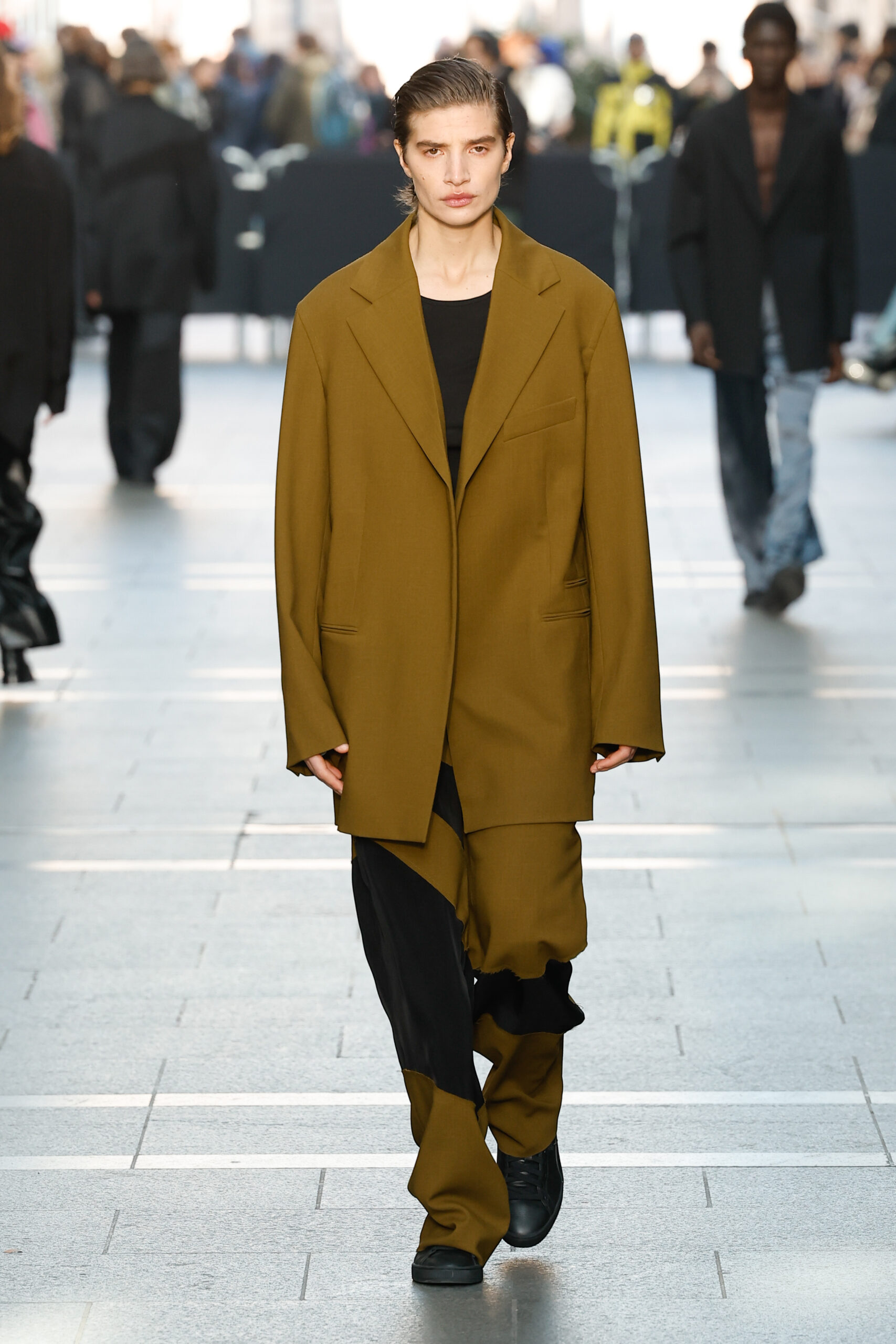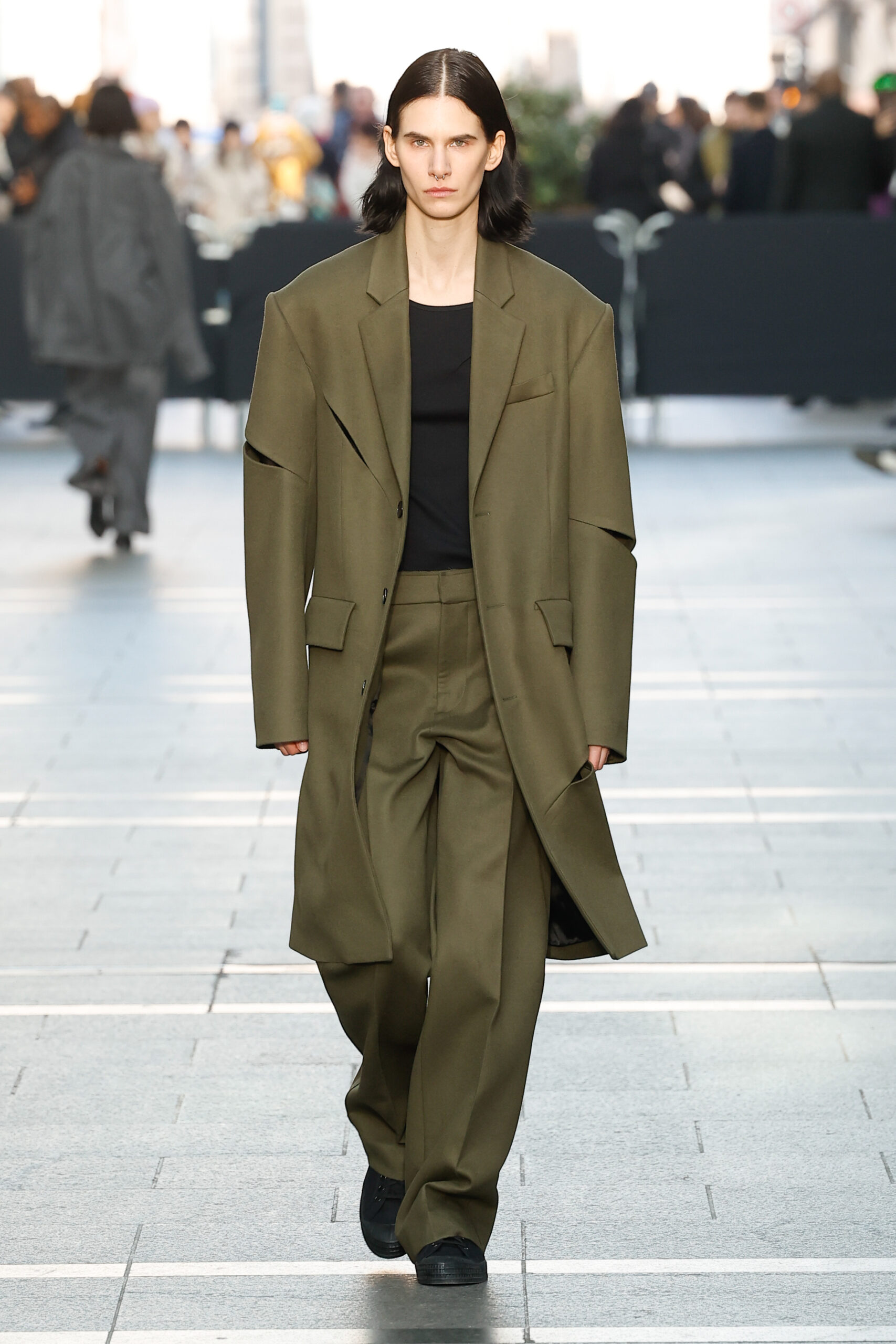 La palette de couleurs est principalement composée de différentes nuances de gris, de tons marron clair, de crème, de blanc et de beaucoup de noir. Les looks principalement monochromes sont accentués par un imprimé vert vif. Marie-Christine Statz a extrait le motif d’une œuvre sans titre que Camille Henrot a peinte en 2022. Il a été transformé sur une viscose couleur sable ressemblant à une toile. La chemise surdimensionnée, la jupe mi-longue et le haut sans manches sont construits avec des fentes placées qui forment leur forme individuelle et remodèlent l’œuvre d’art en mouvement.