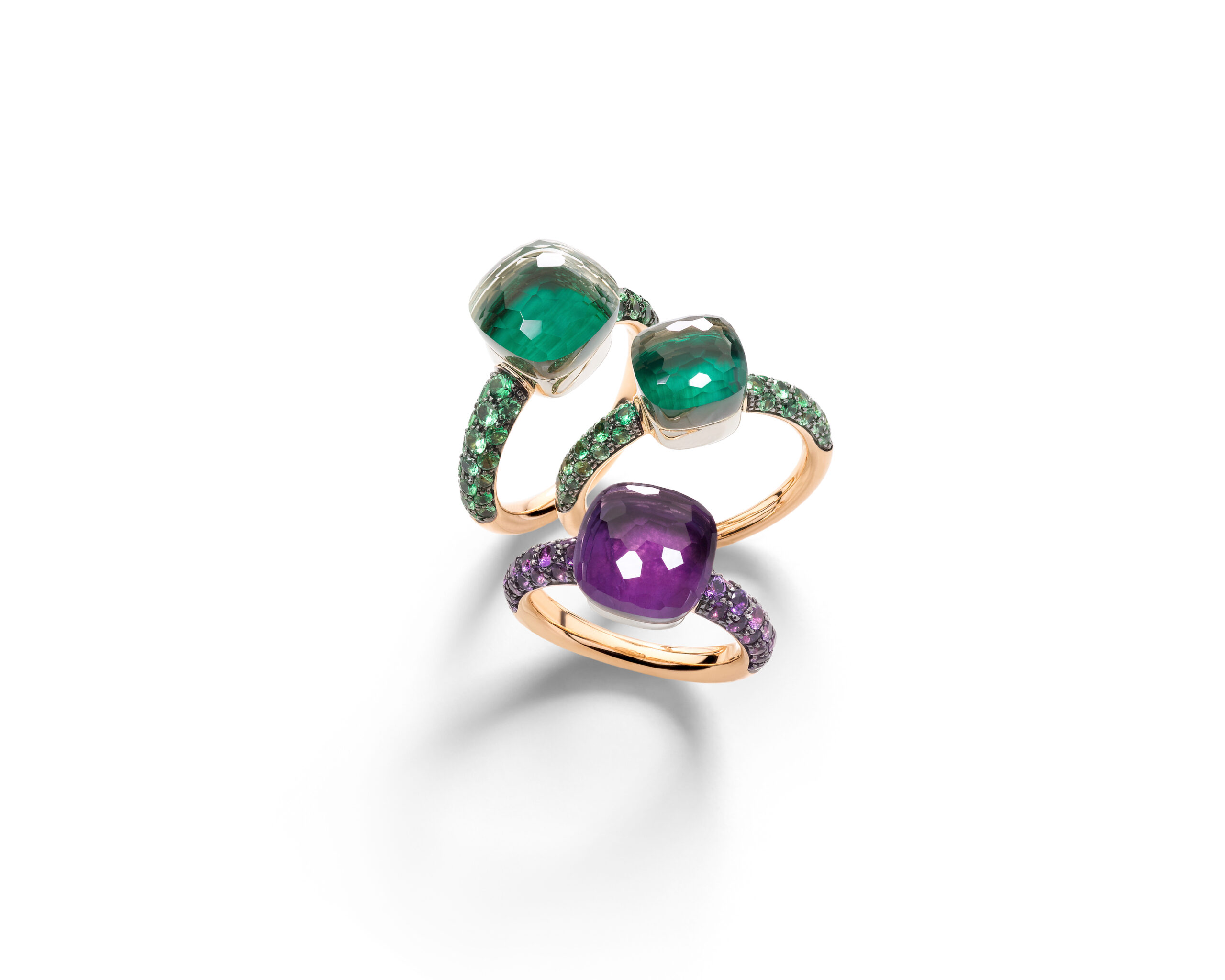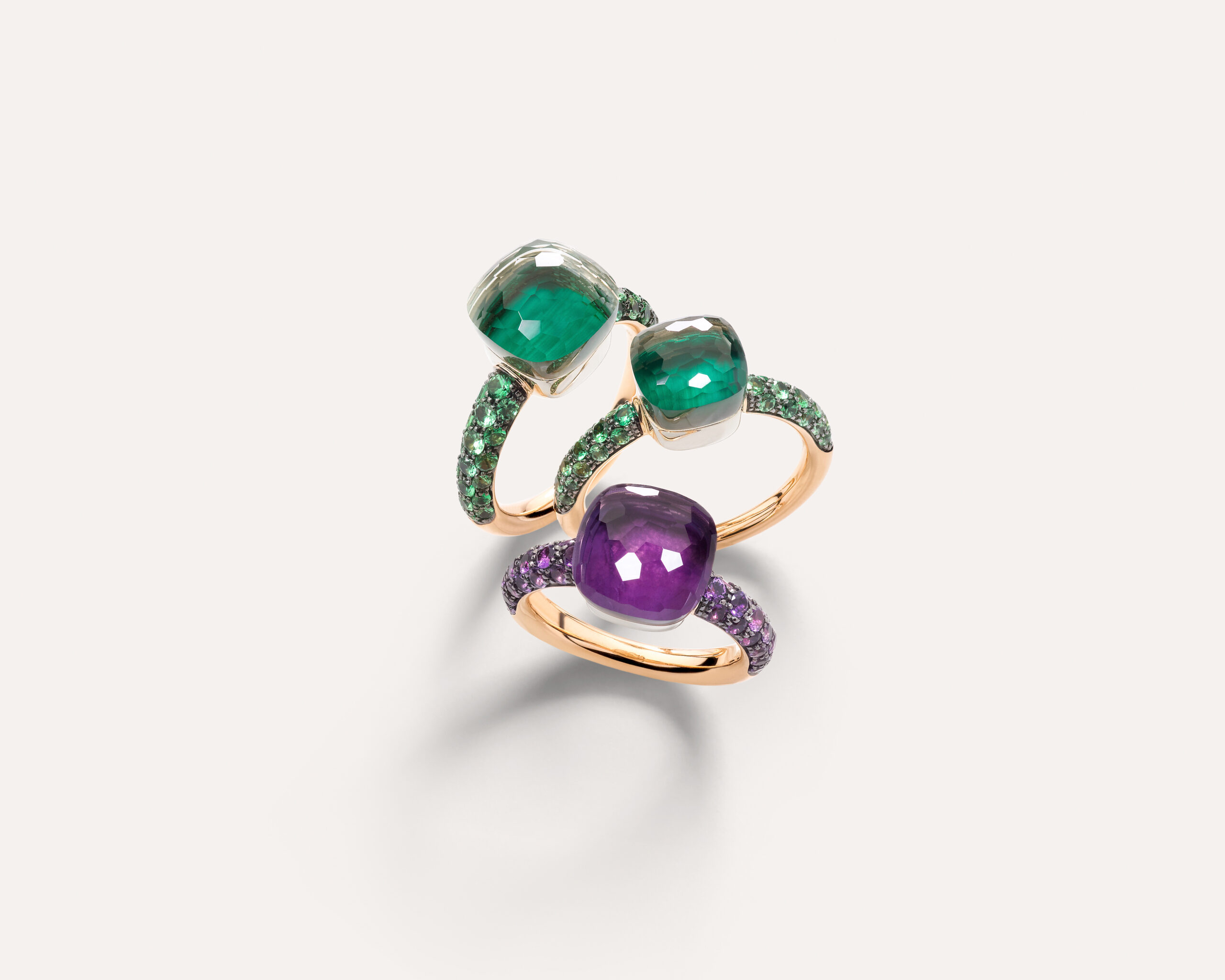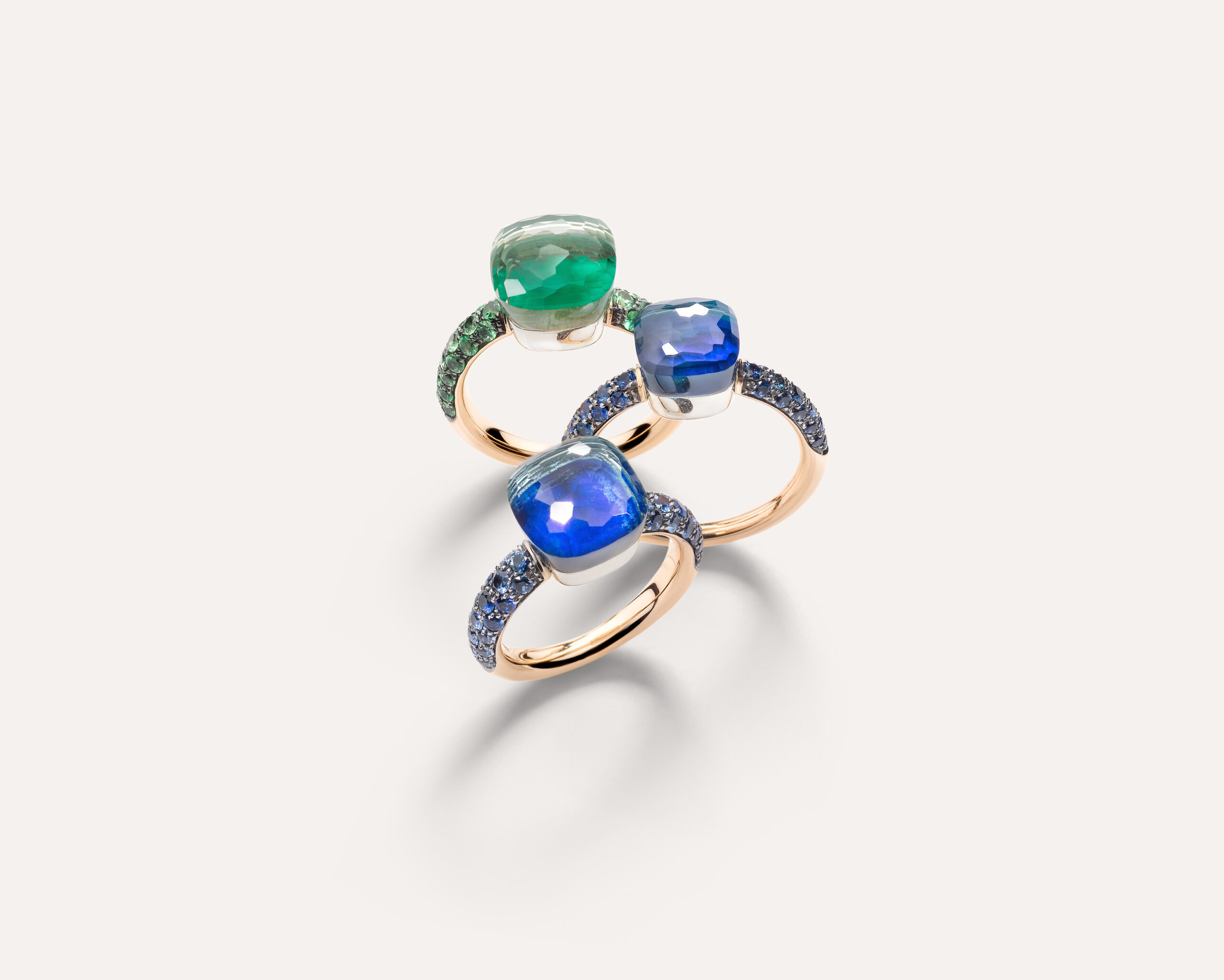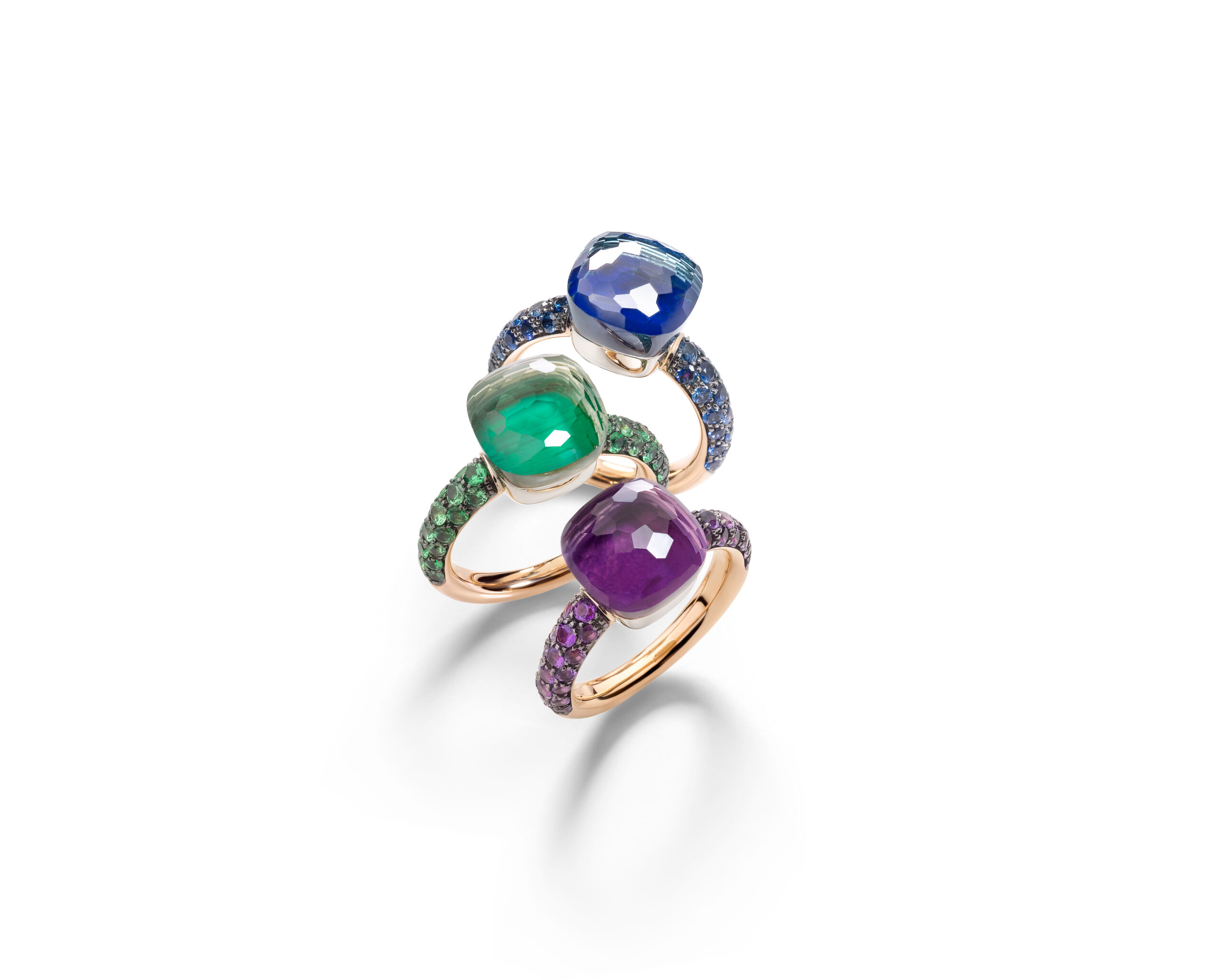 La folie du Nudo continue et cette saison voit l’arrivée de trois toutes nouvelles combinaisons de doublets de pierres. Le vert, le violet et le bleu sont les couleurs de pierres précieuses les plus populaires de la gamme Nudo et les nouveaux doublets offrent des variations dans ces tons pour compléter l’empilement de bagues parfait ou être portés seuls.