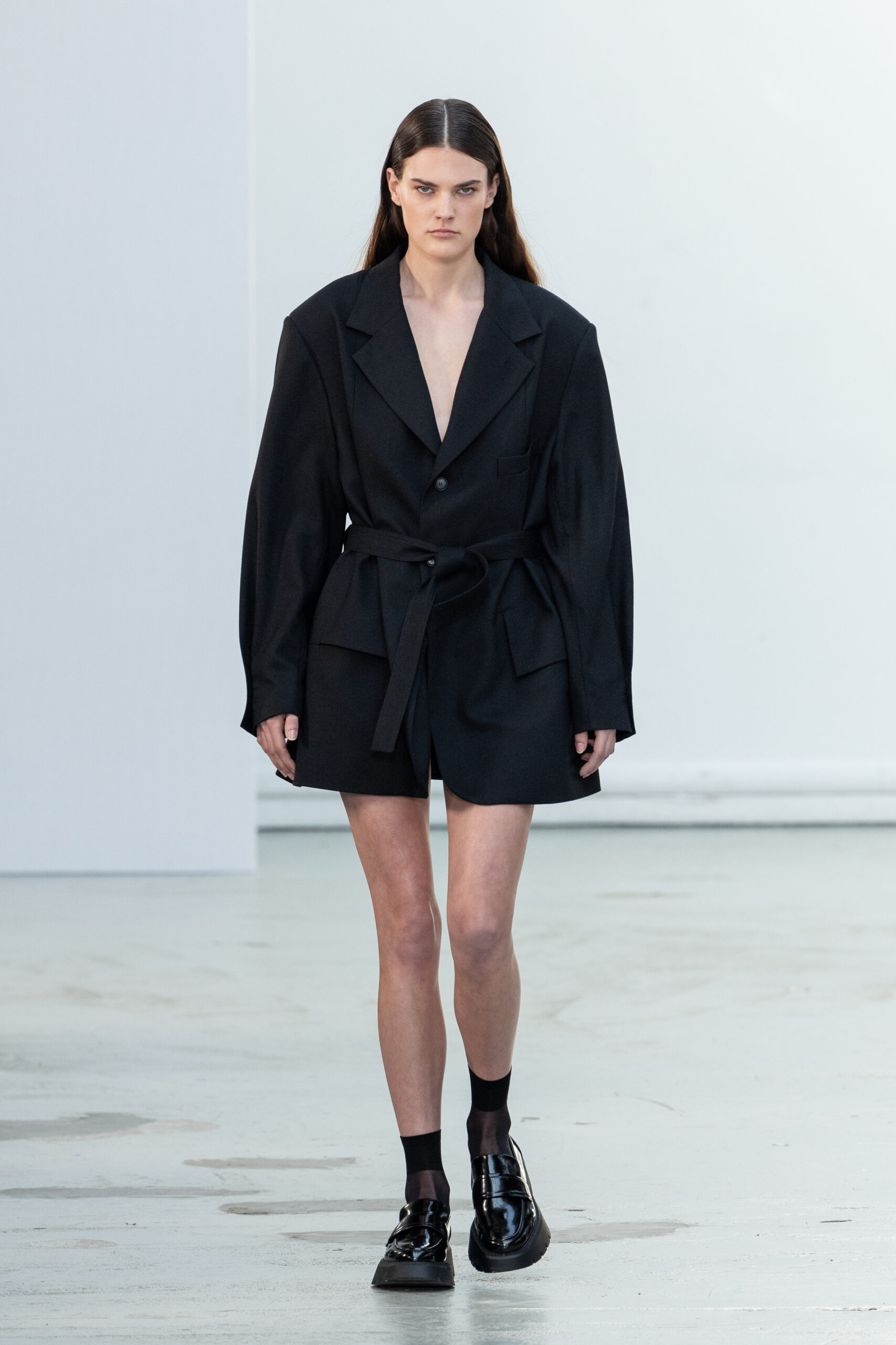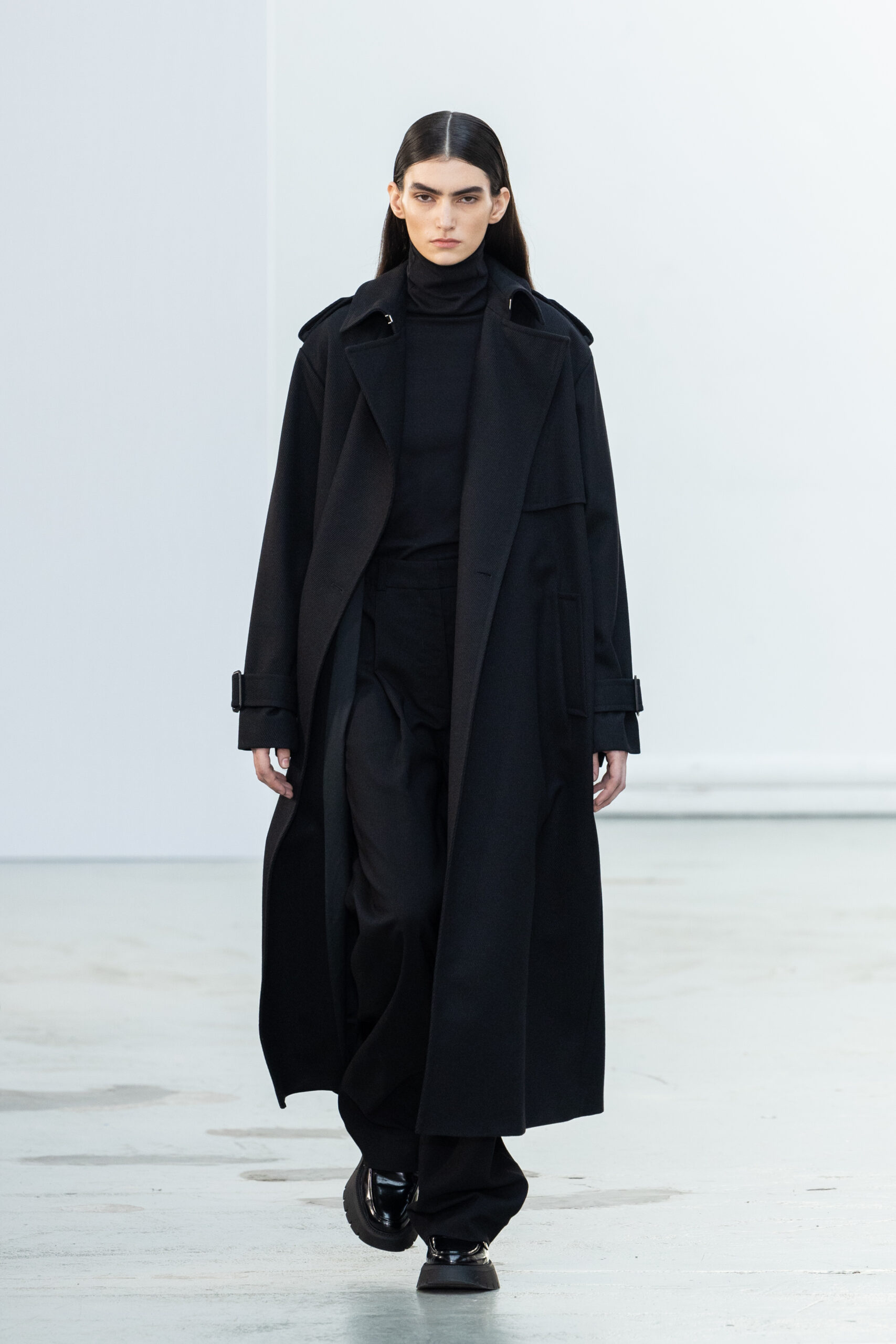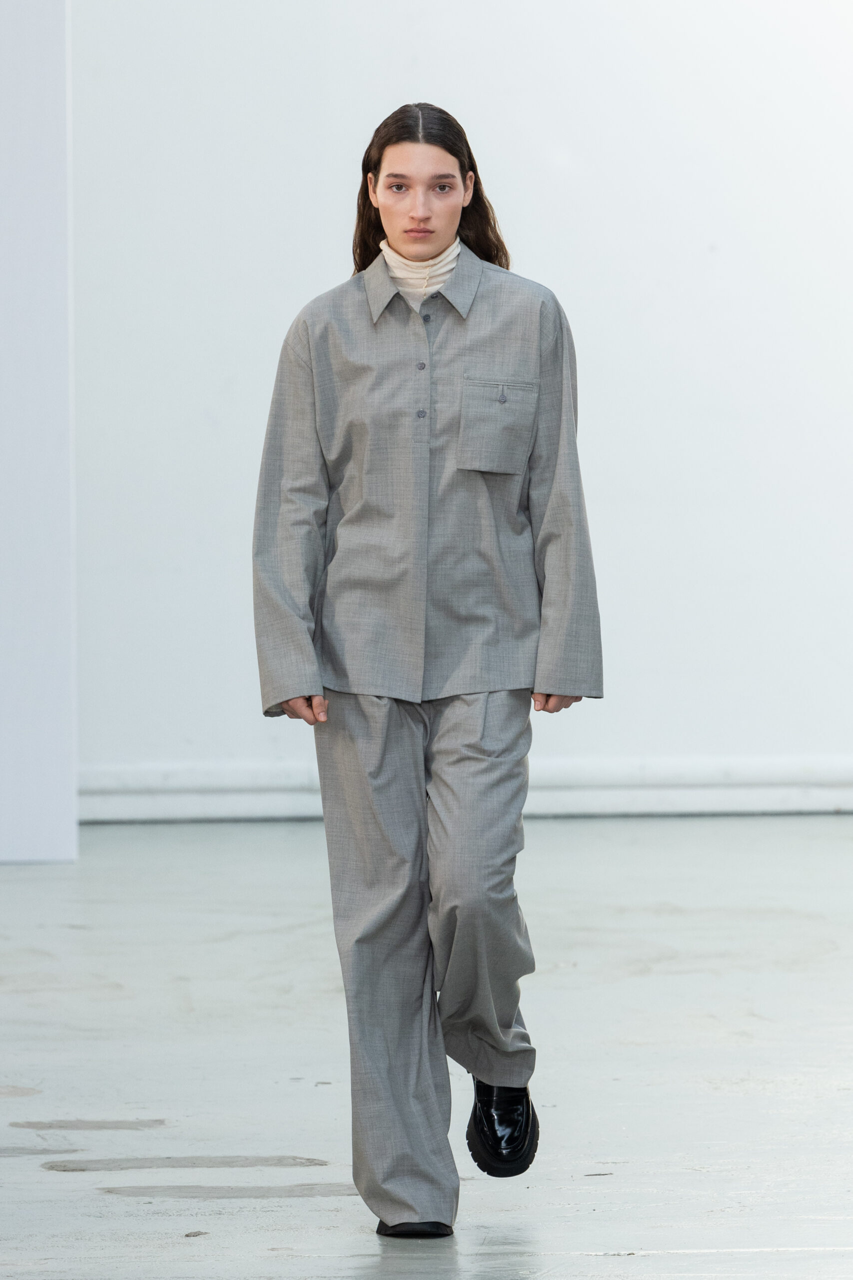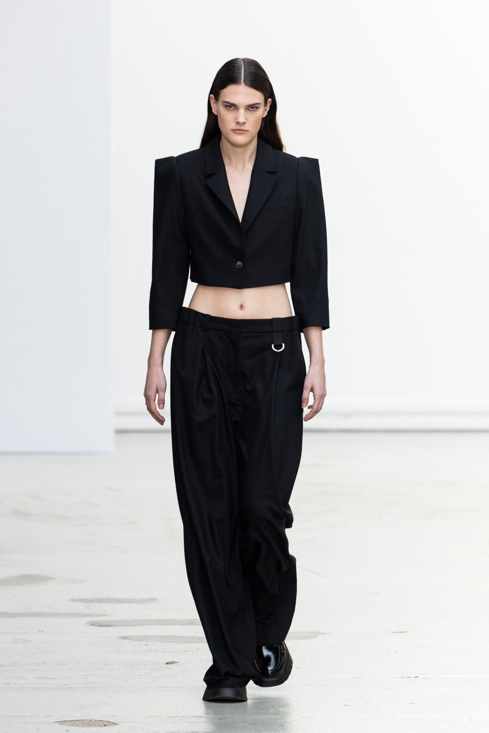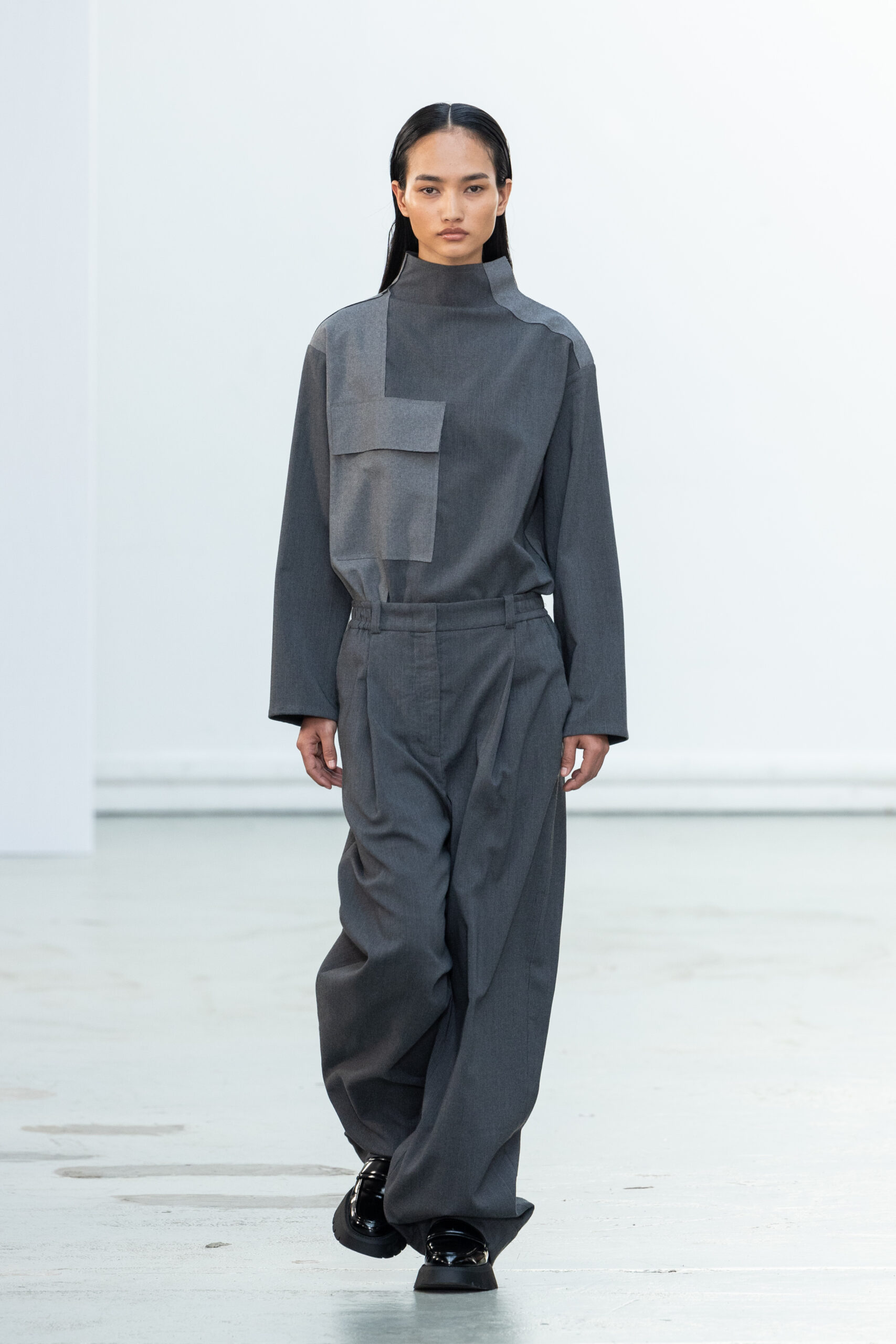 La collection explore les tons ombrés, mélangeant les genres avec des silhouettes genderless et puissantes, mises en valeur par un casting intense. Les coupes sont strictes, mais les matières sont délicates, permettant au styliste Sheila Single d’effectuer des silhouettes intenses. Nehera continue d’explorer l’ajustement parfait du tailoring avec des pantalons, des hauts et des vestes ajustables.