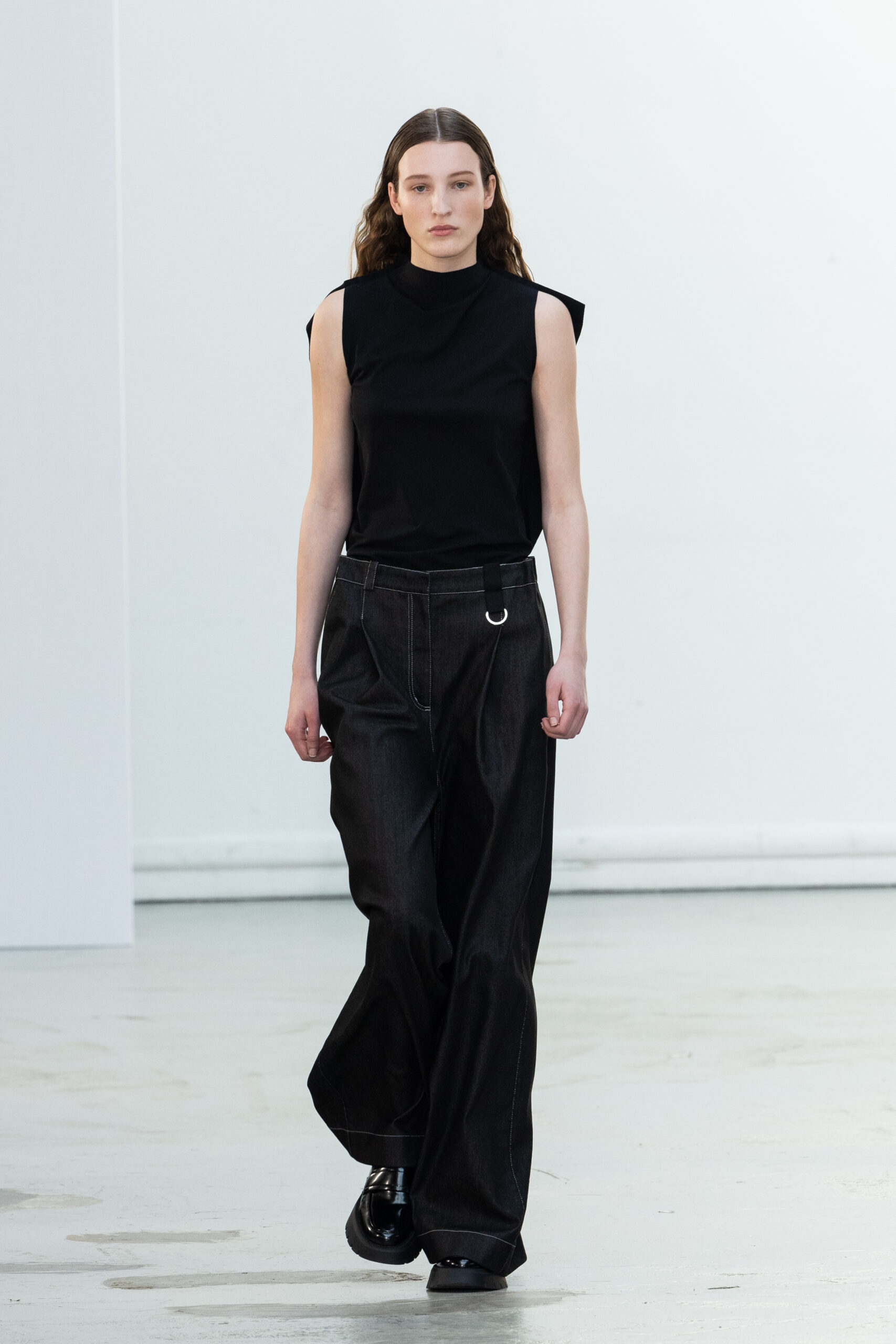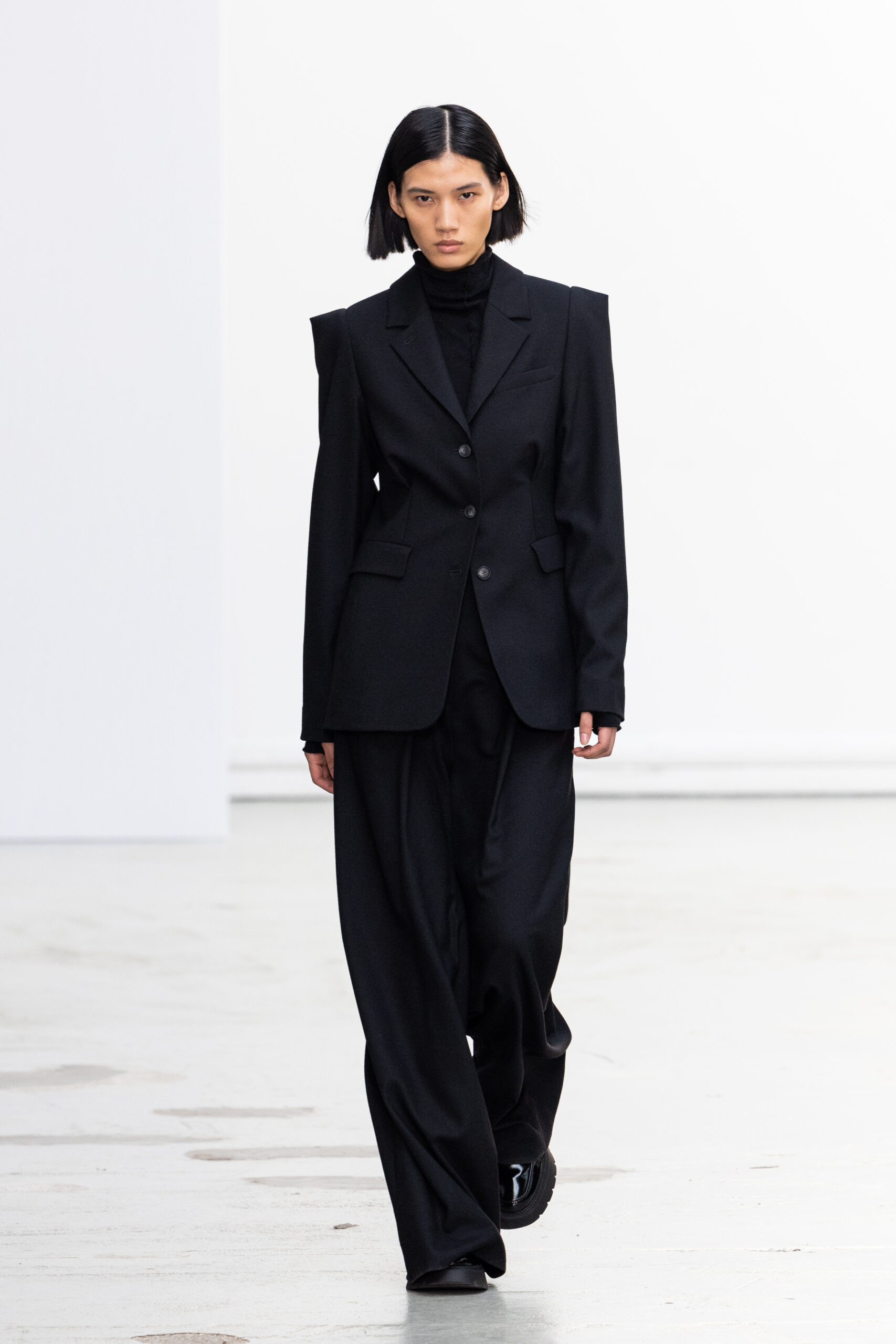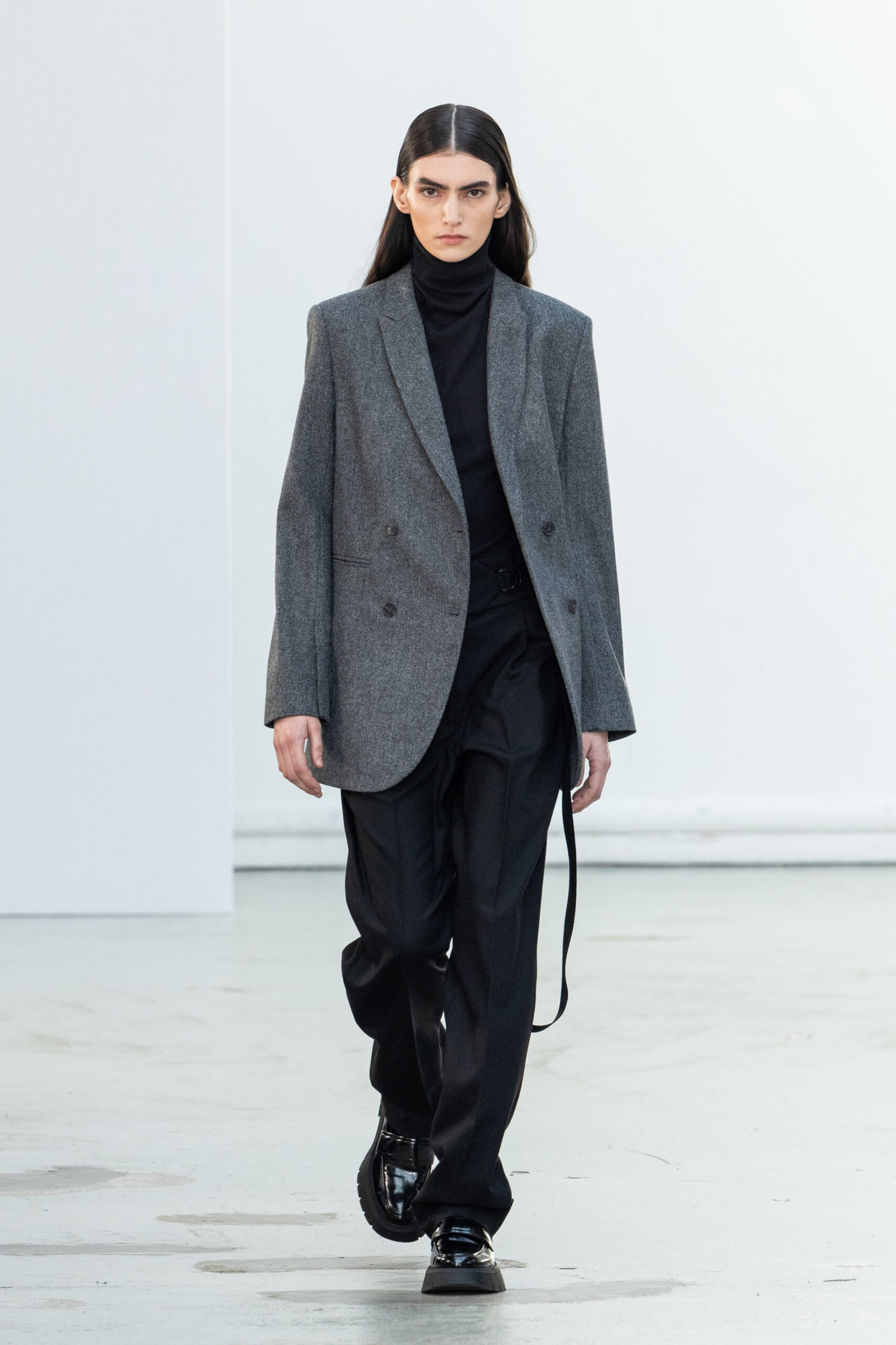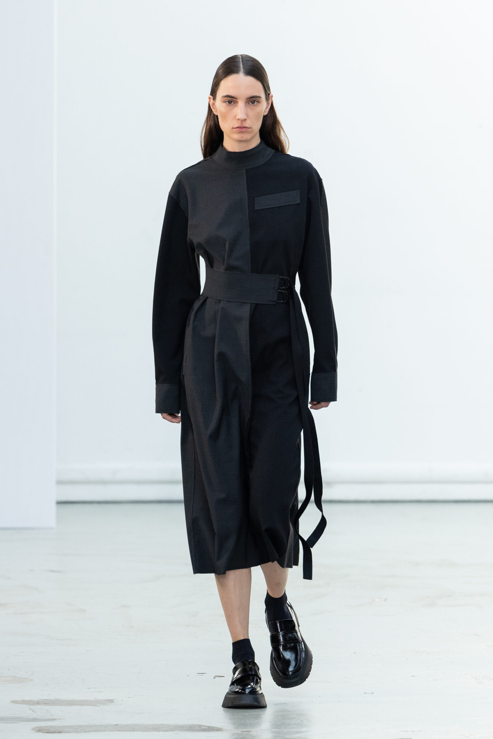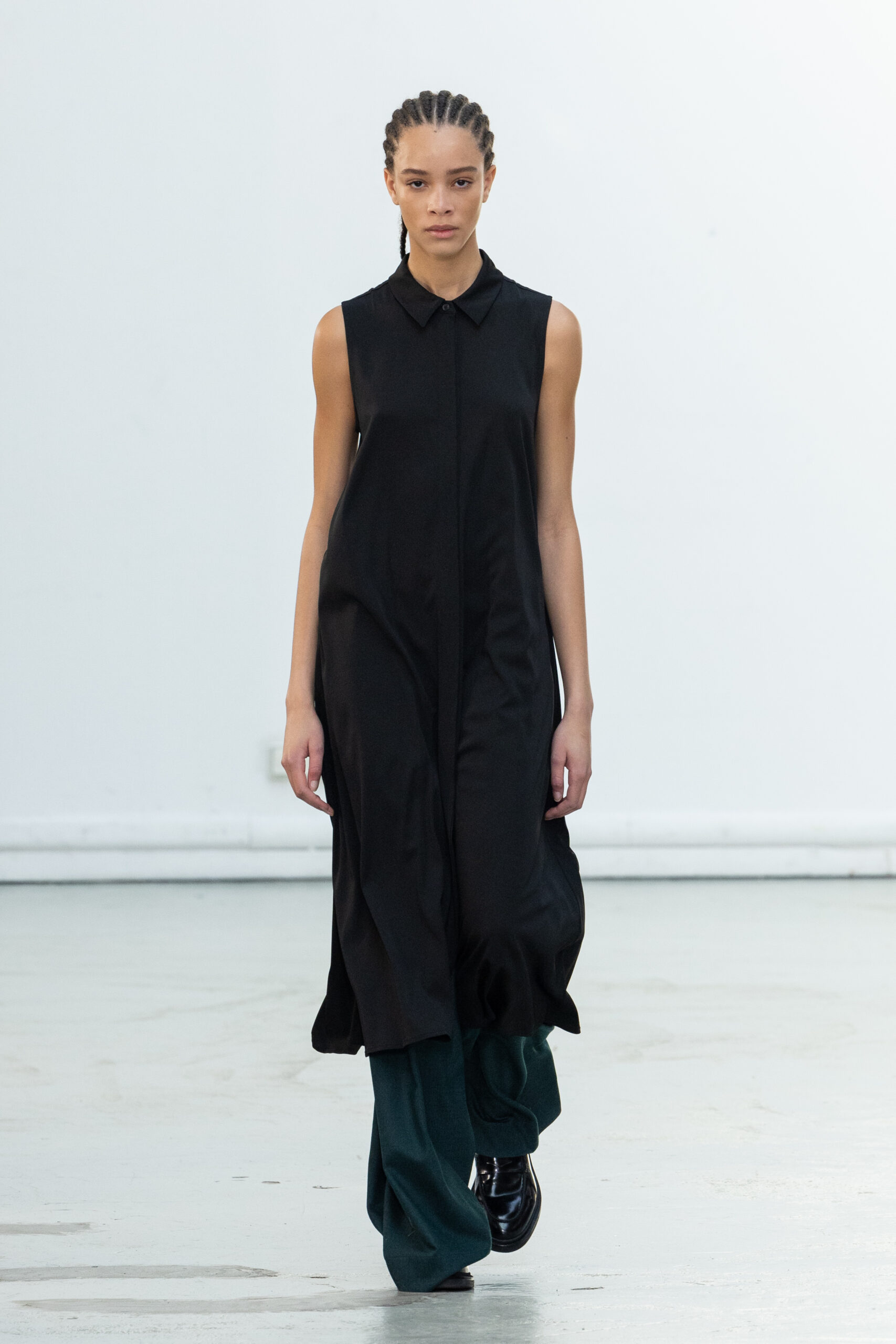 La collection explore les tons ombrés, mélangeant les genres avec des silhouettes genderless et puissantes, mises en valeur par un casting intense. Les coupes sont strictes, mais les matières sont délicates, permettant au styliste Sheila Single d’effectuer des silhouettes intenses. Nehera continue d’explorer l’ajustement parfait du tailoring avec des pantalons, des hauts et des vestes ajustables.