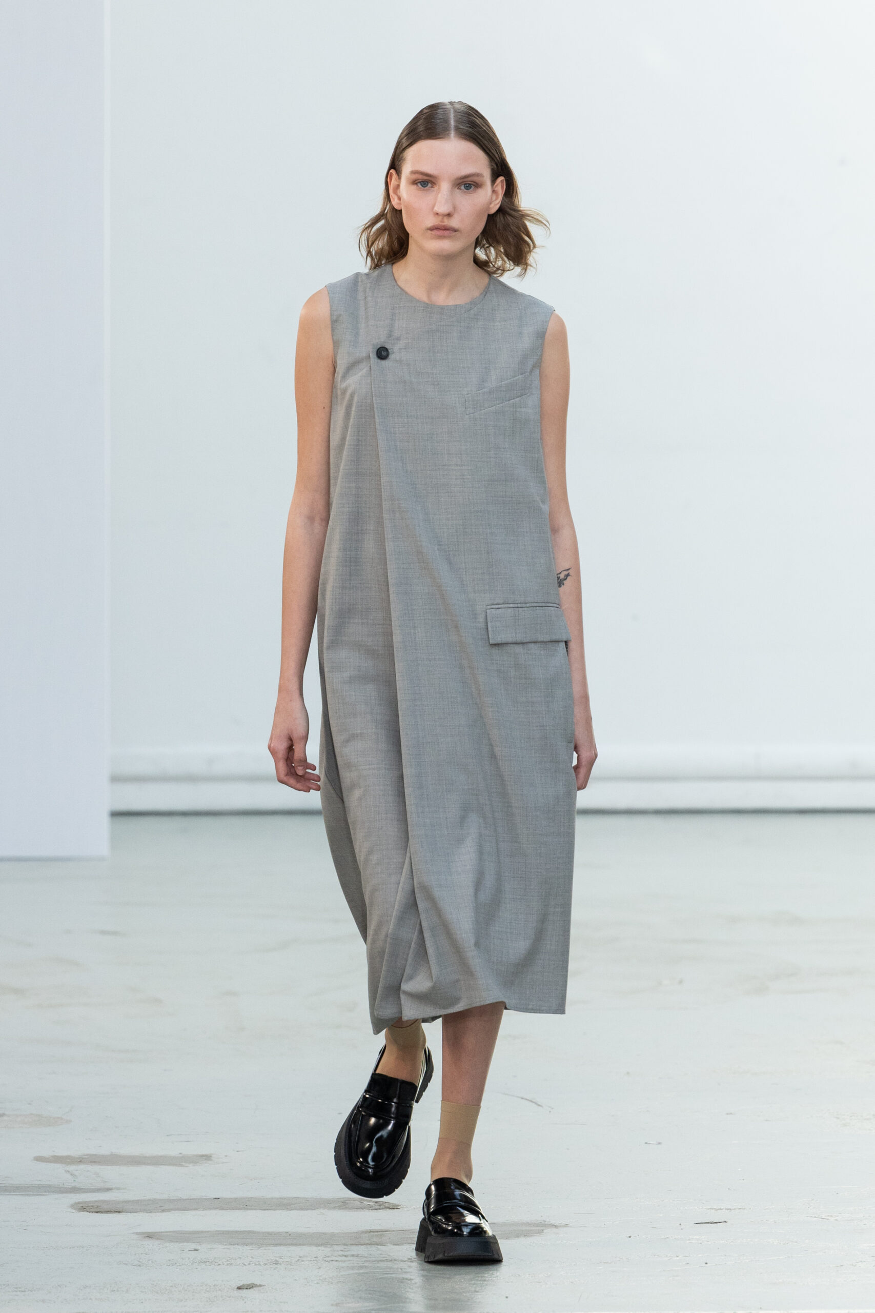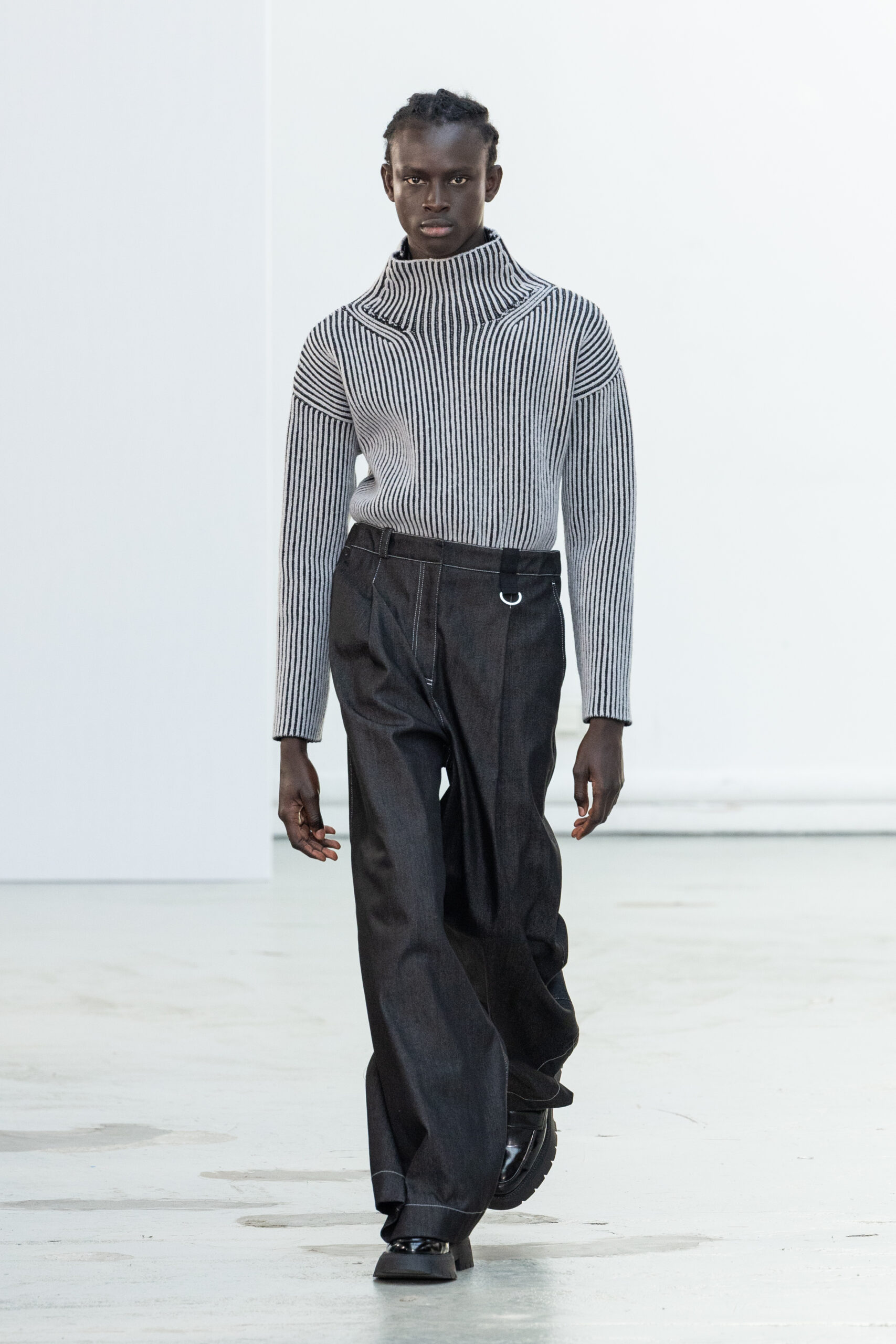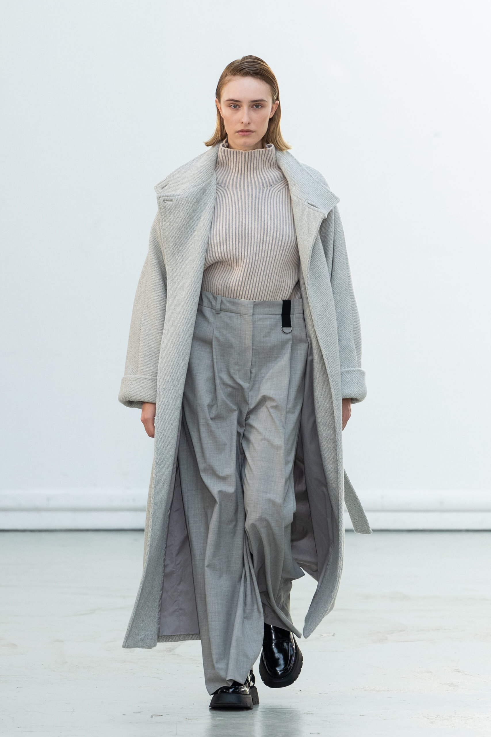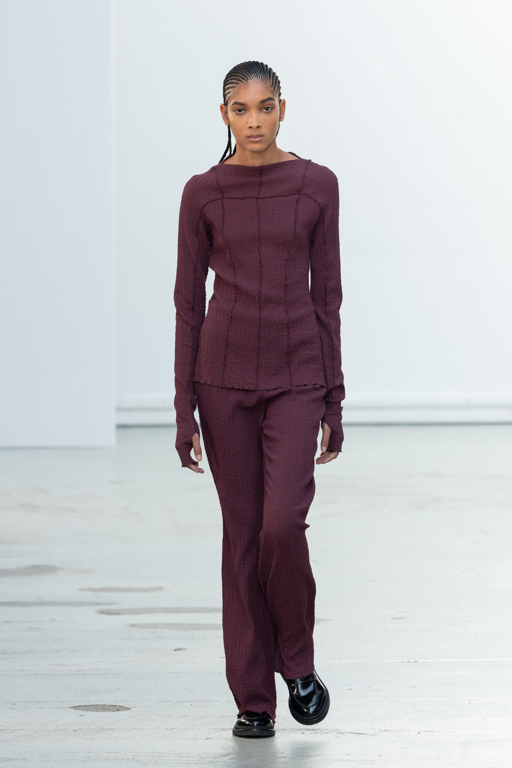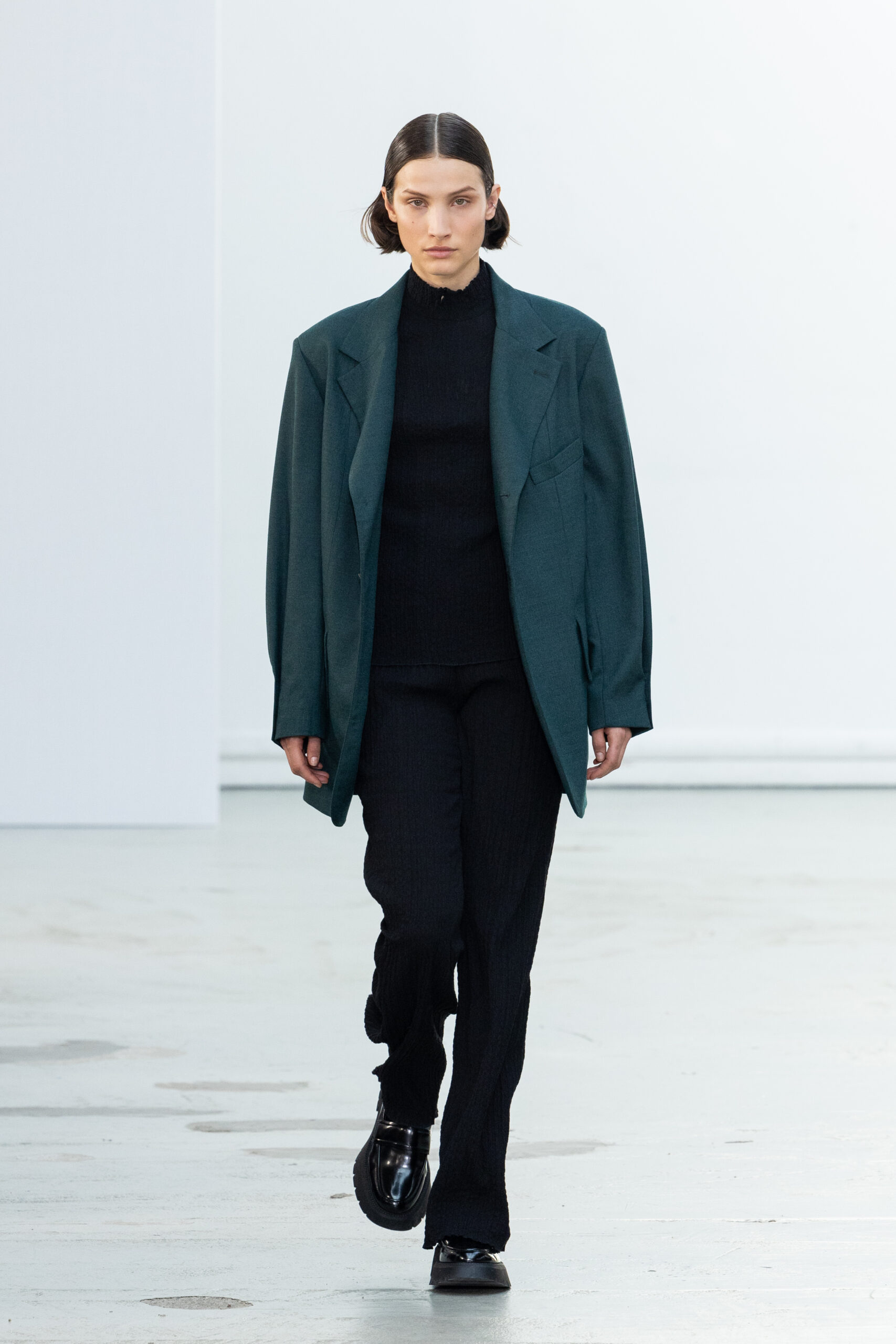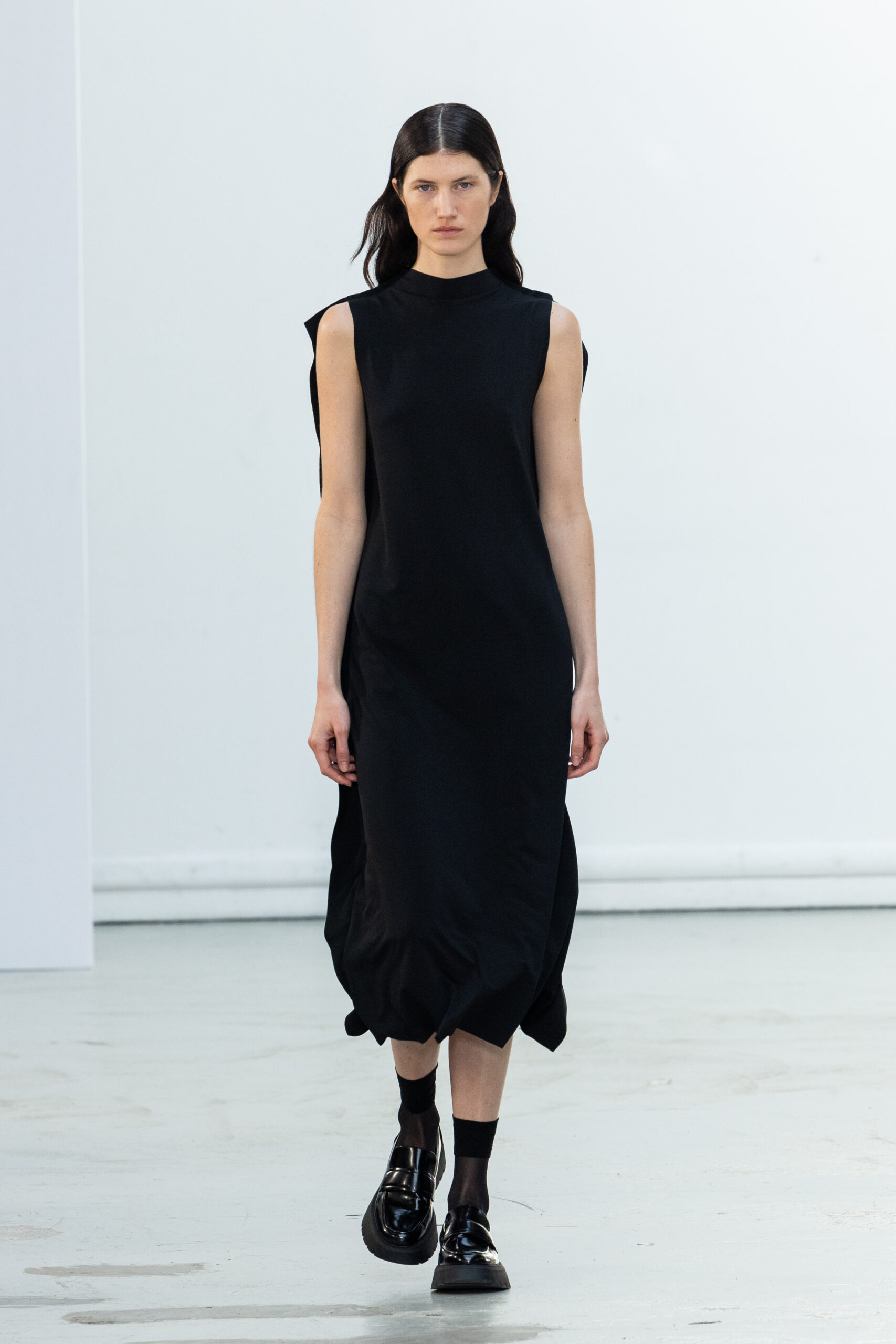 La collection explore les tons ombrés, mélangeant les genres avec des silhouettes genderless et puissantes, mises en valeur par un casting intense. Les coupes sont strictes, mais les matières sont délicates, permettant au styliste Sheila Single d’effectuer des silhouettes intenses. Nehera continue d’explorer l’ajustement parfait du tailoring avec des pantalons, des hauts et des vestes ajustables.