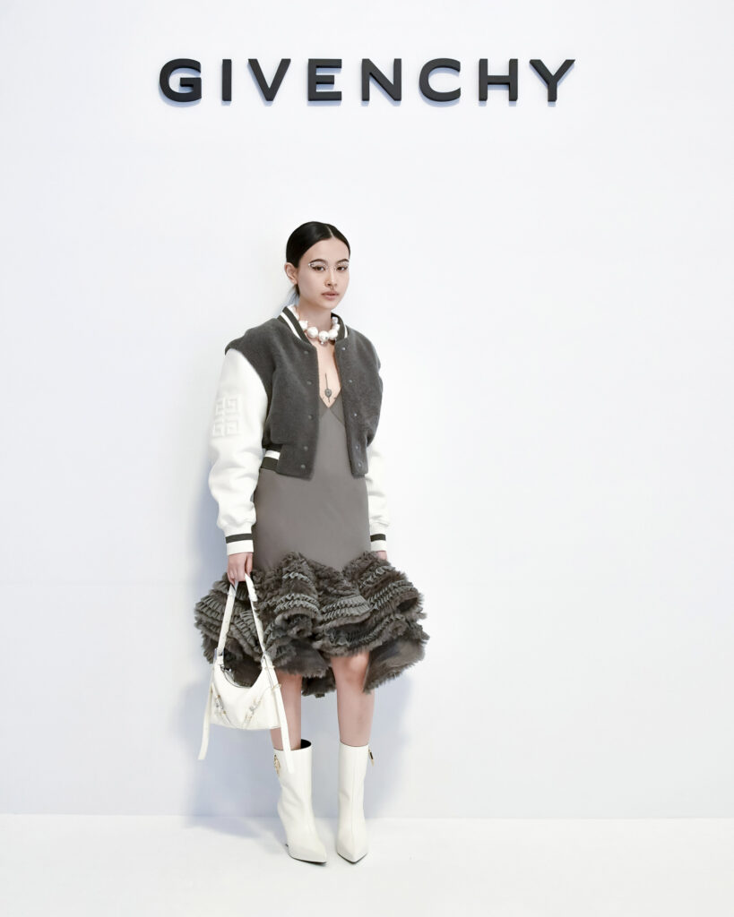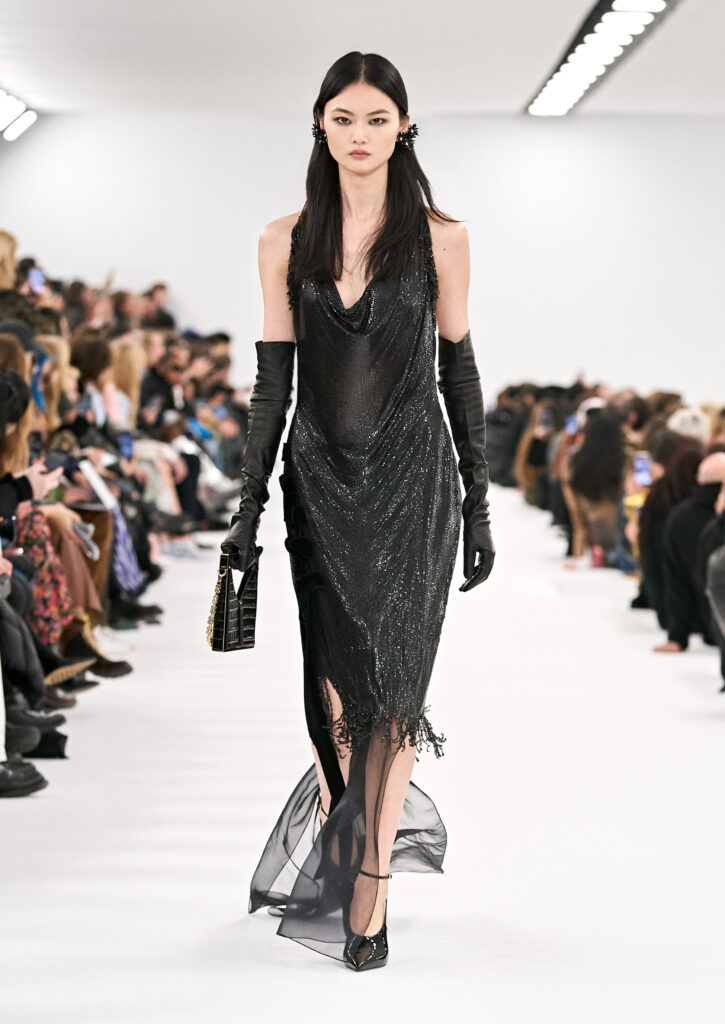 Les robes de soirée inspirées des créations d’archives sont réalisées dans les ateliers de haute couture de la Maison Givenchy. Les chenilles pannier et les robes en tulle noir sont entièrement brodées d’applications en nylon micro-floral, tandis que les détails de pavé-stitch sont présents sur les épaules des robes et les bijoux. Les sacs à main Voyou sont proposés dans des matériaux luxueux tels que le cuir vieilli, le shearling, le cuir métallique et les exotiques. Le sac à main Cut Out est interprété de manière minimaliste en spazzolato avec des silhouettes arrondies, tandis que le cadenas 4G apparaît sur une nouvelle silhouette de seau.
