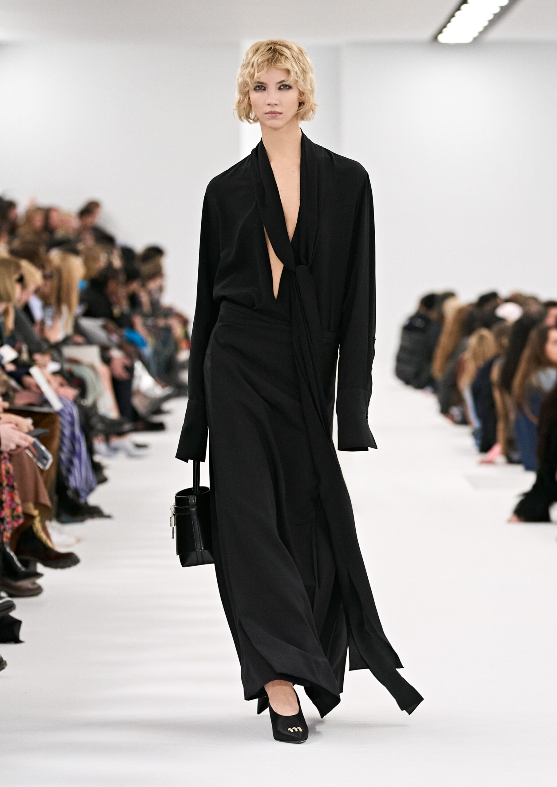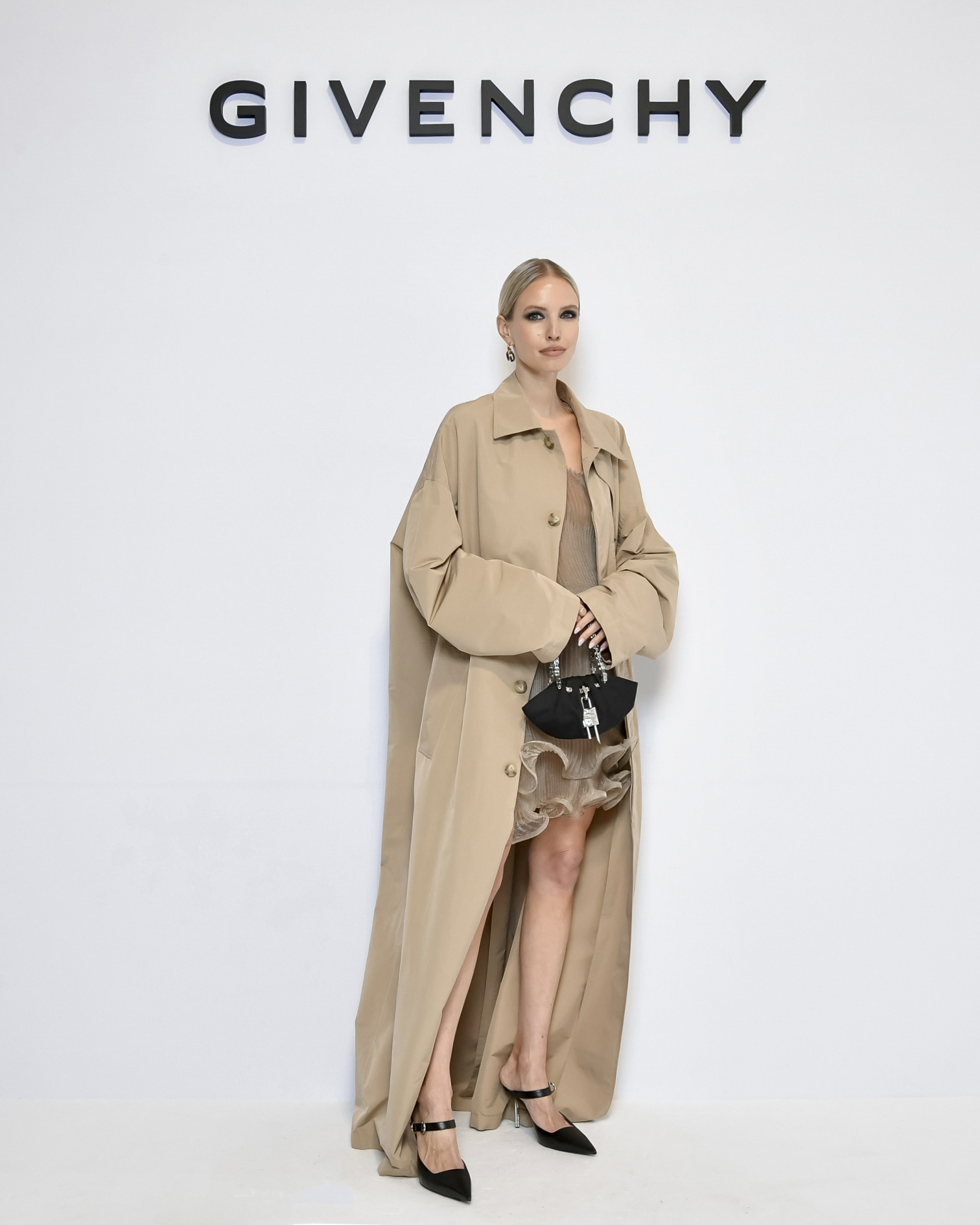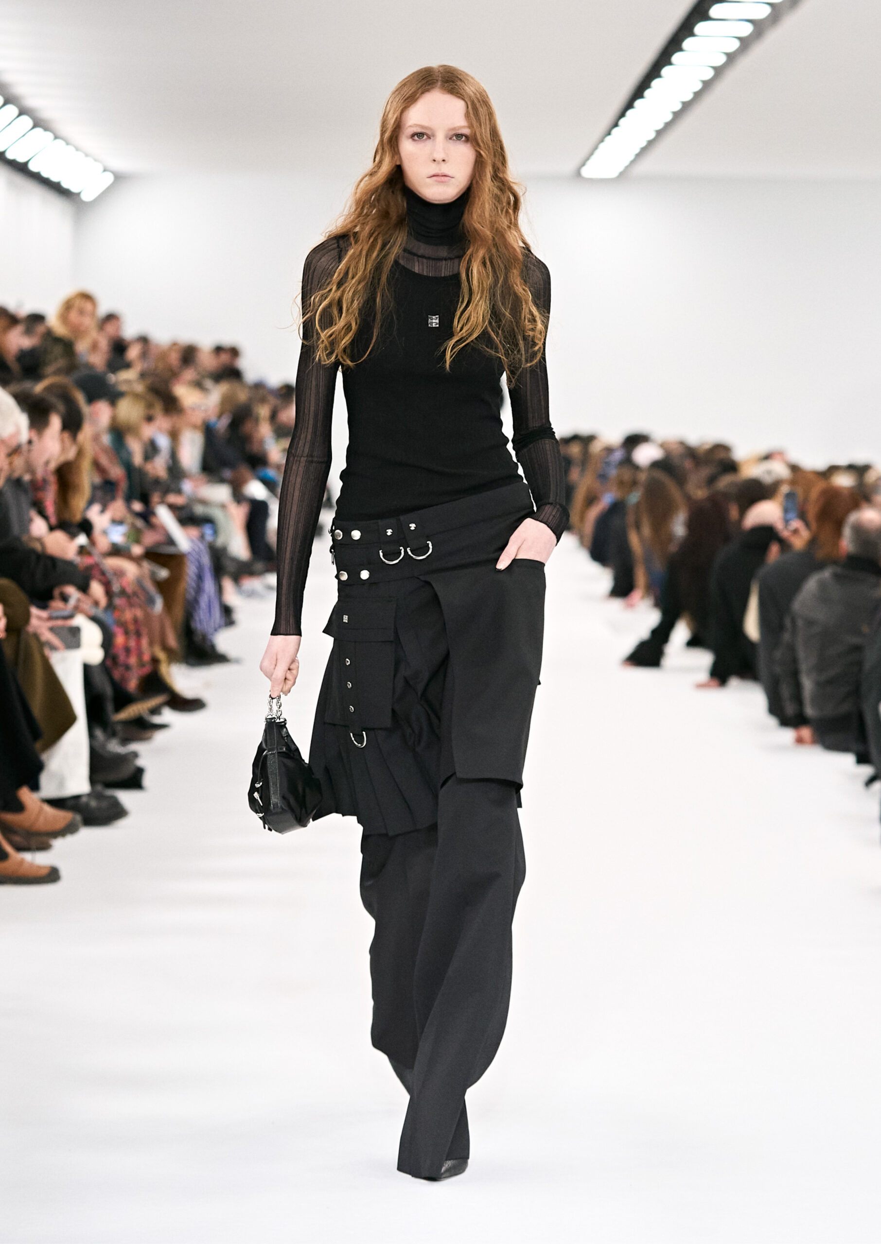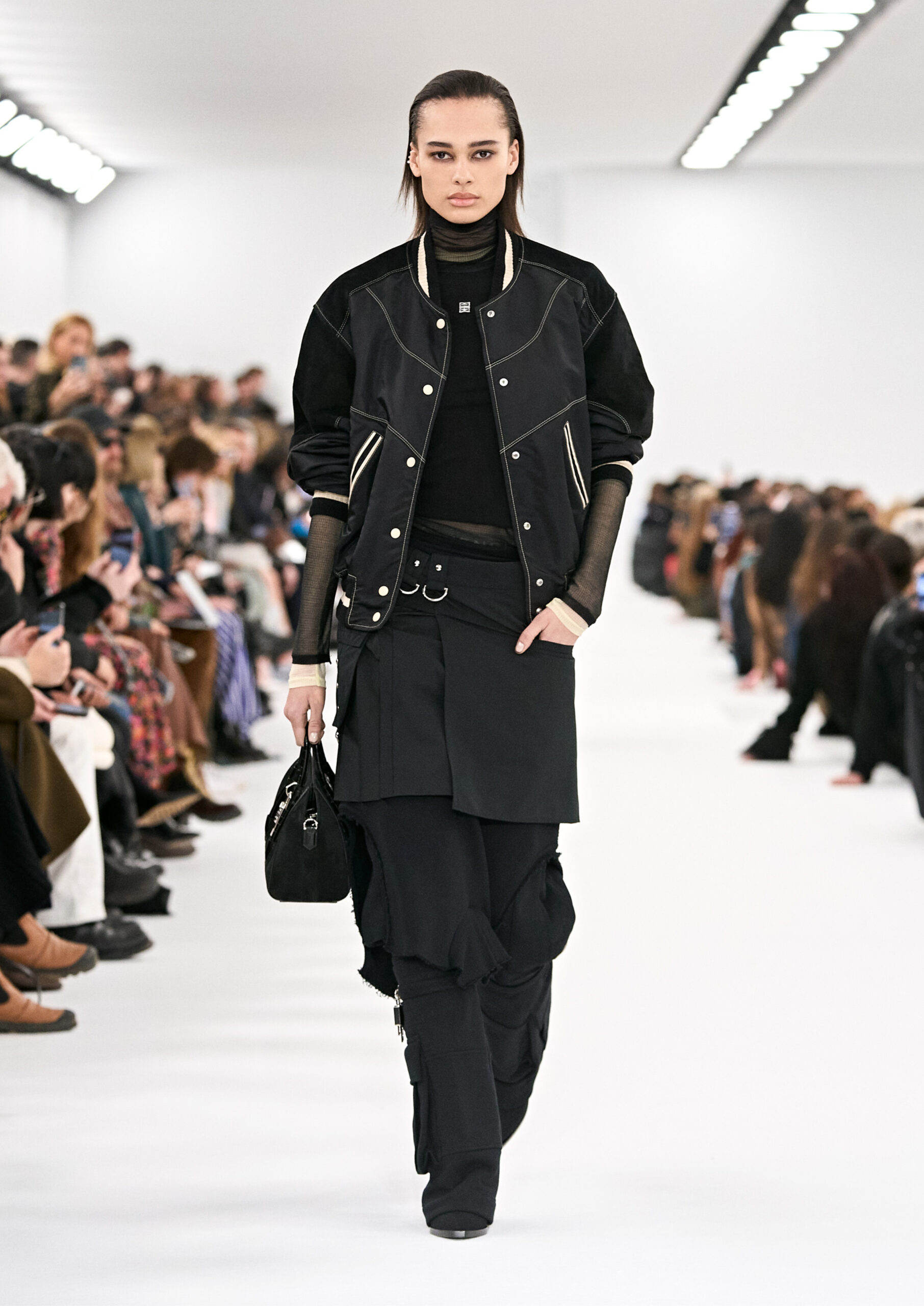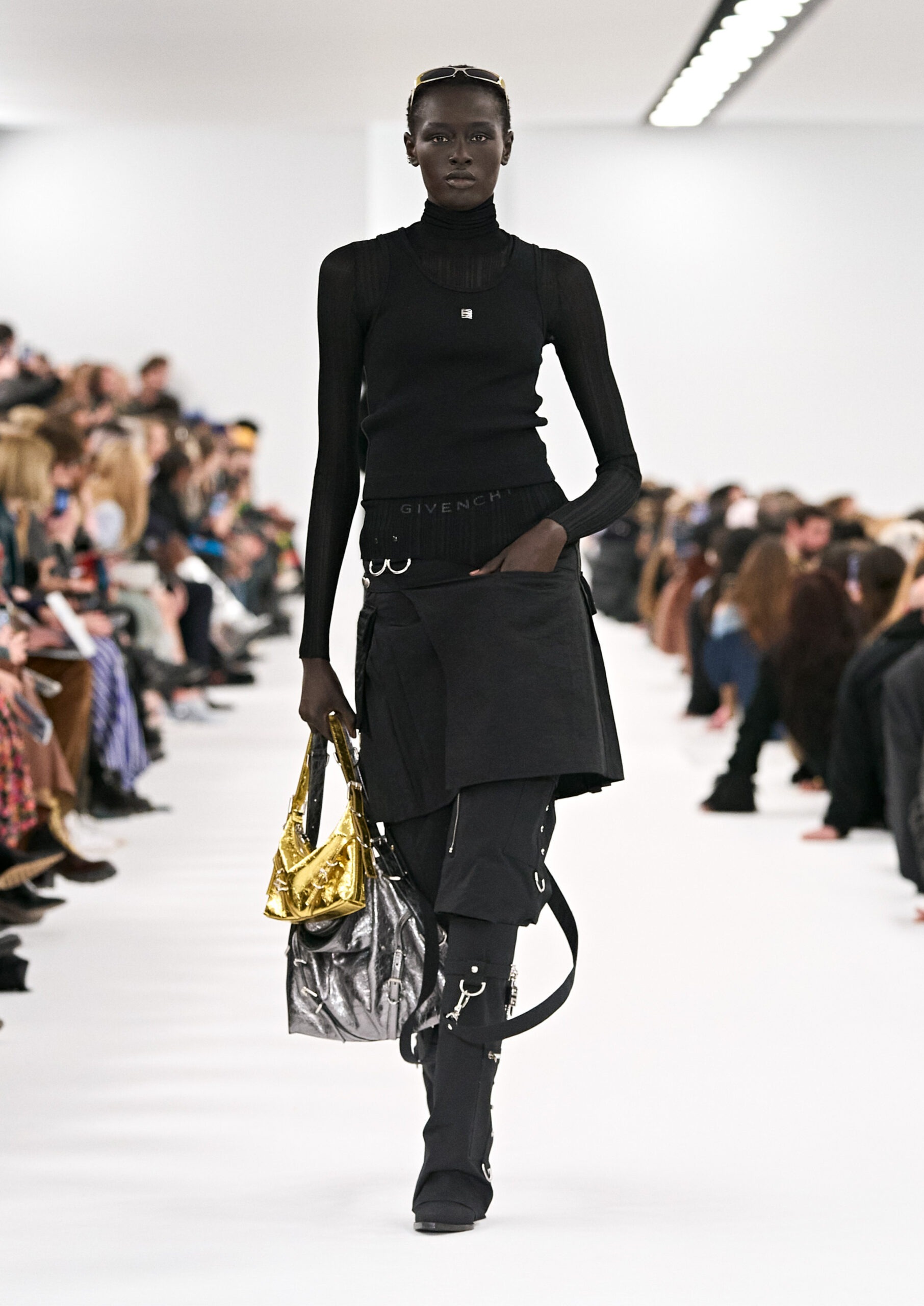 Les robes de soirée inspirées des créations d’archives sont réalisées dans les ateliers de haute couture de la Maison Givenchy. Les chenilles pannier et les robes en tulle noir sont entièrement brodées d’applications en nylon micro-floral, tandis que les détails de pavé-stitch sont présents sur les épaules des robes et les bijoux. Les sacs à main Voyou sont proposés dans des matériaux luxueux tels que le cuir vieilli, le shearling, le cuir métallique et les exotiques. Le sac à main Cut Out est interprété de manière minimaliste en spazzolato avec des silhouettes arrondies, tandis que le cadenas 4G apparaît sur une nouvelle silhouette de seau.