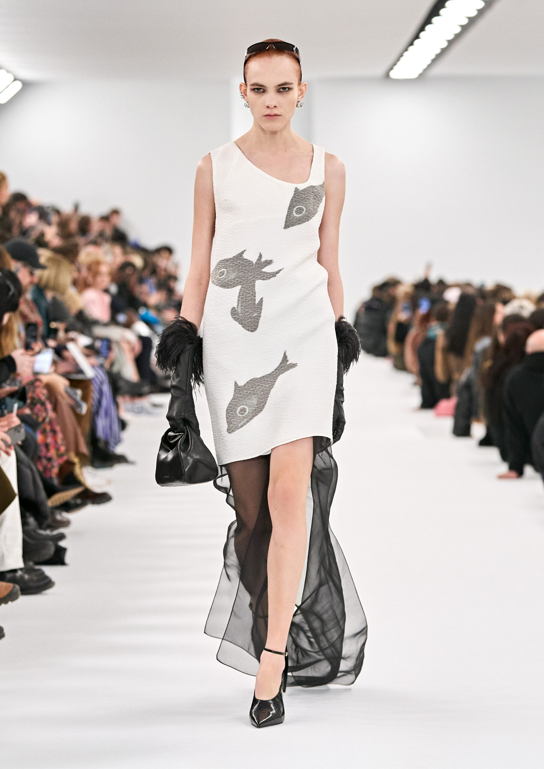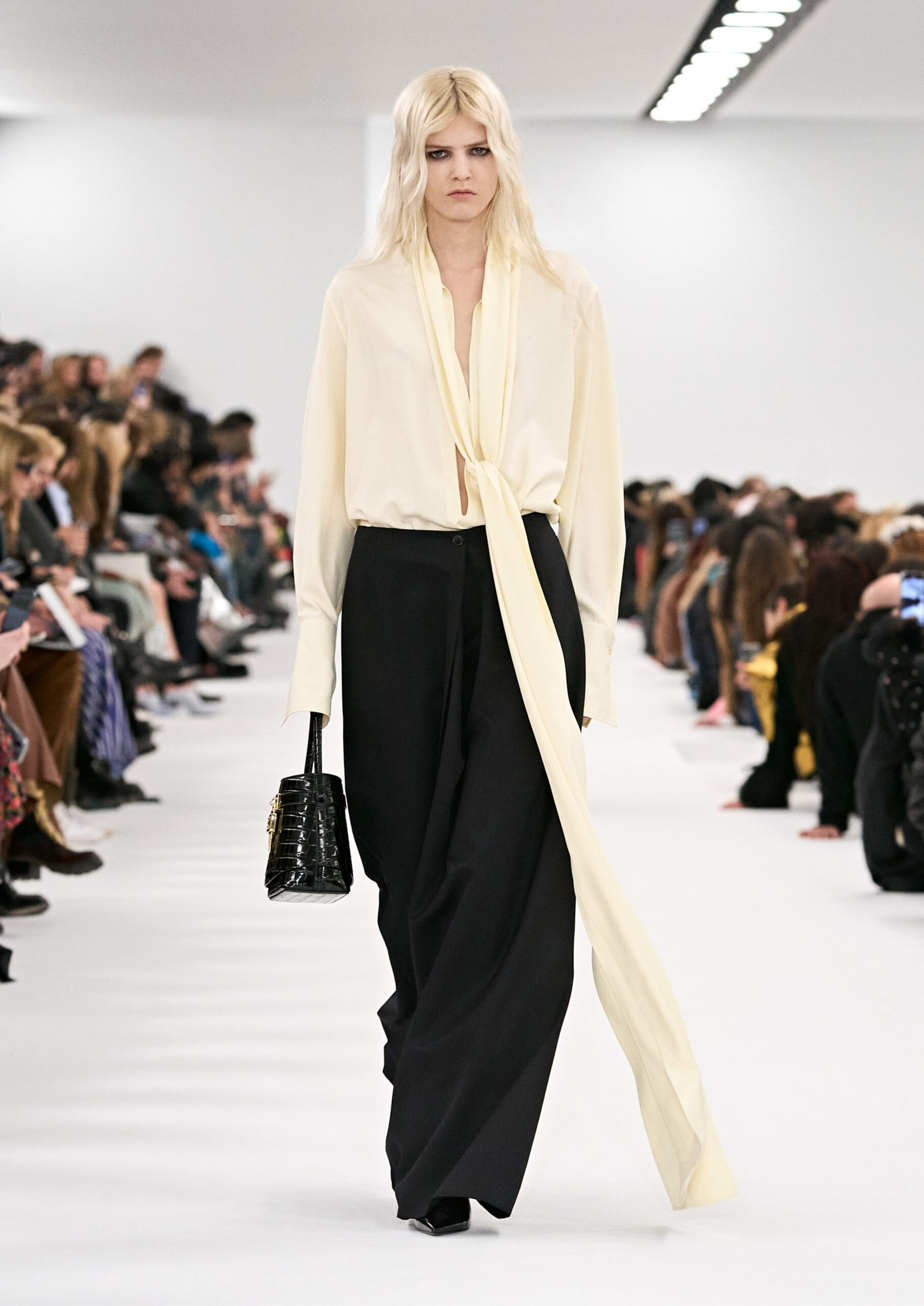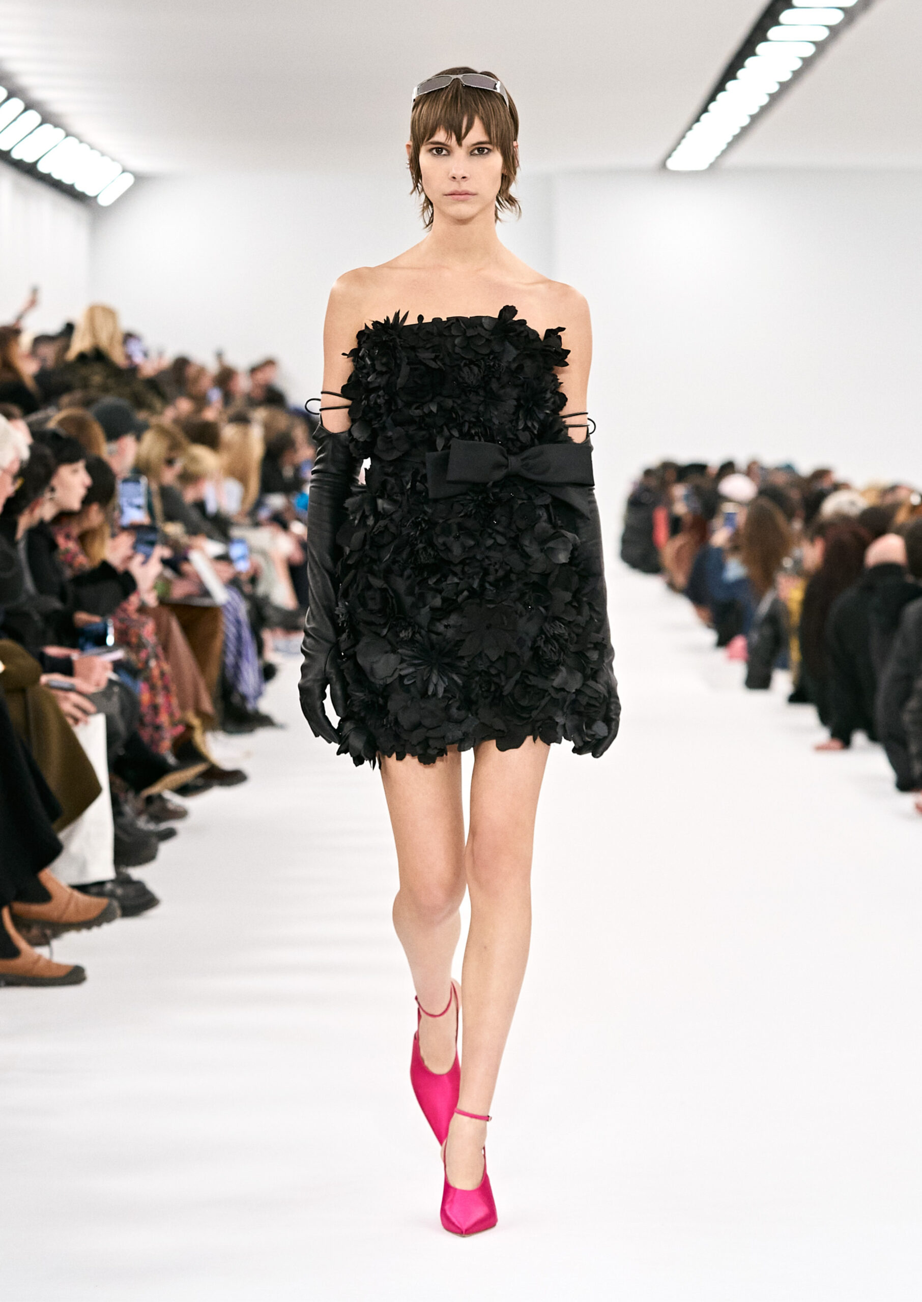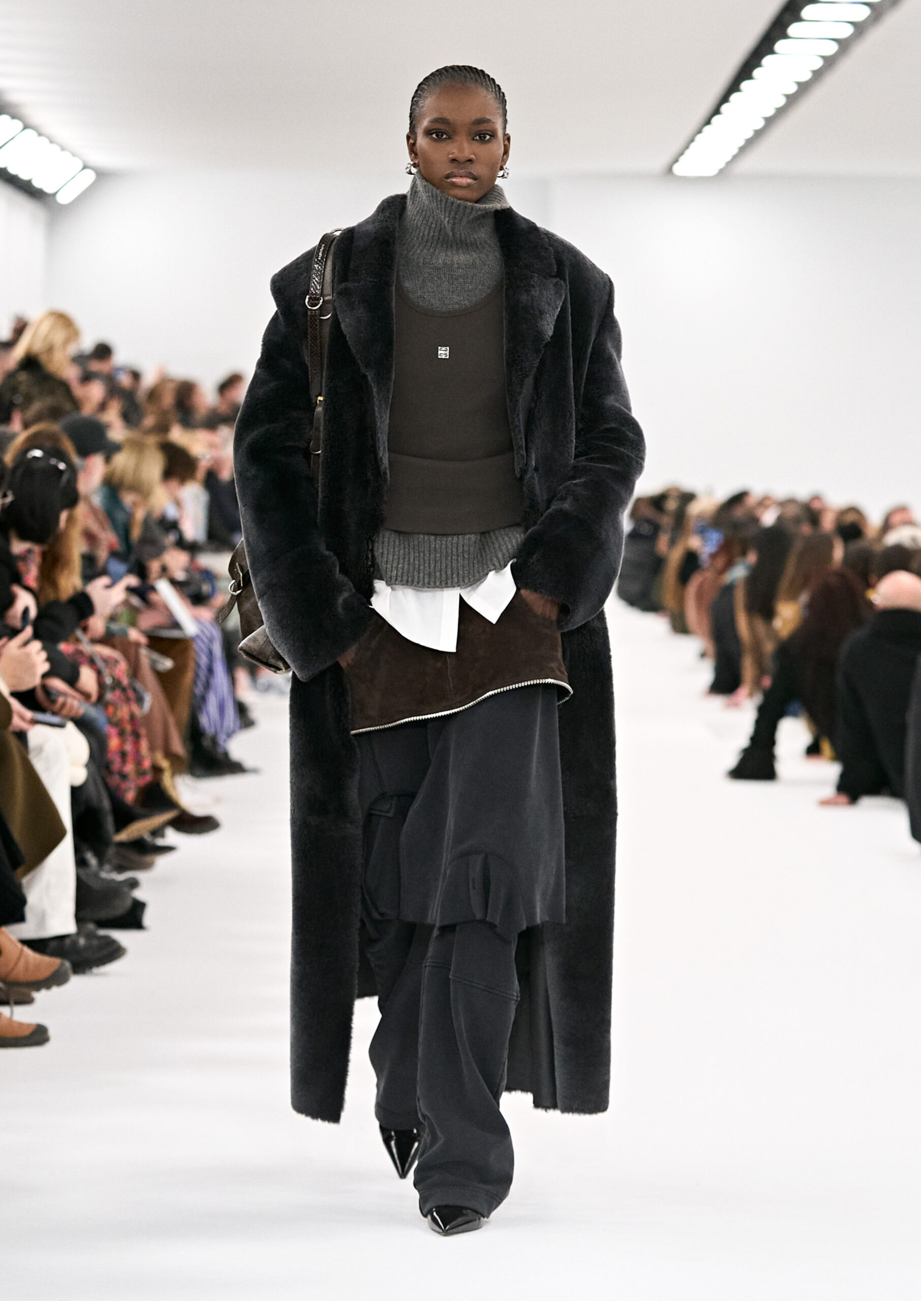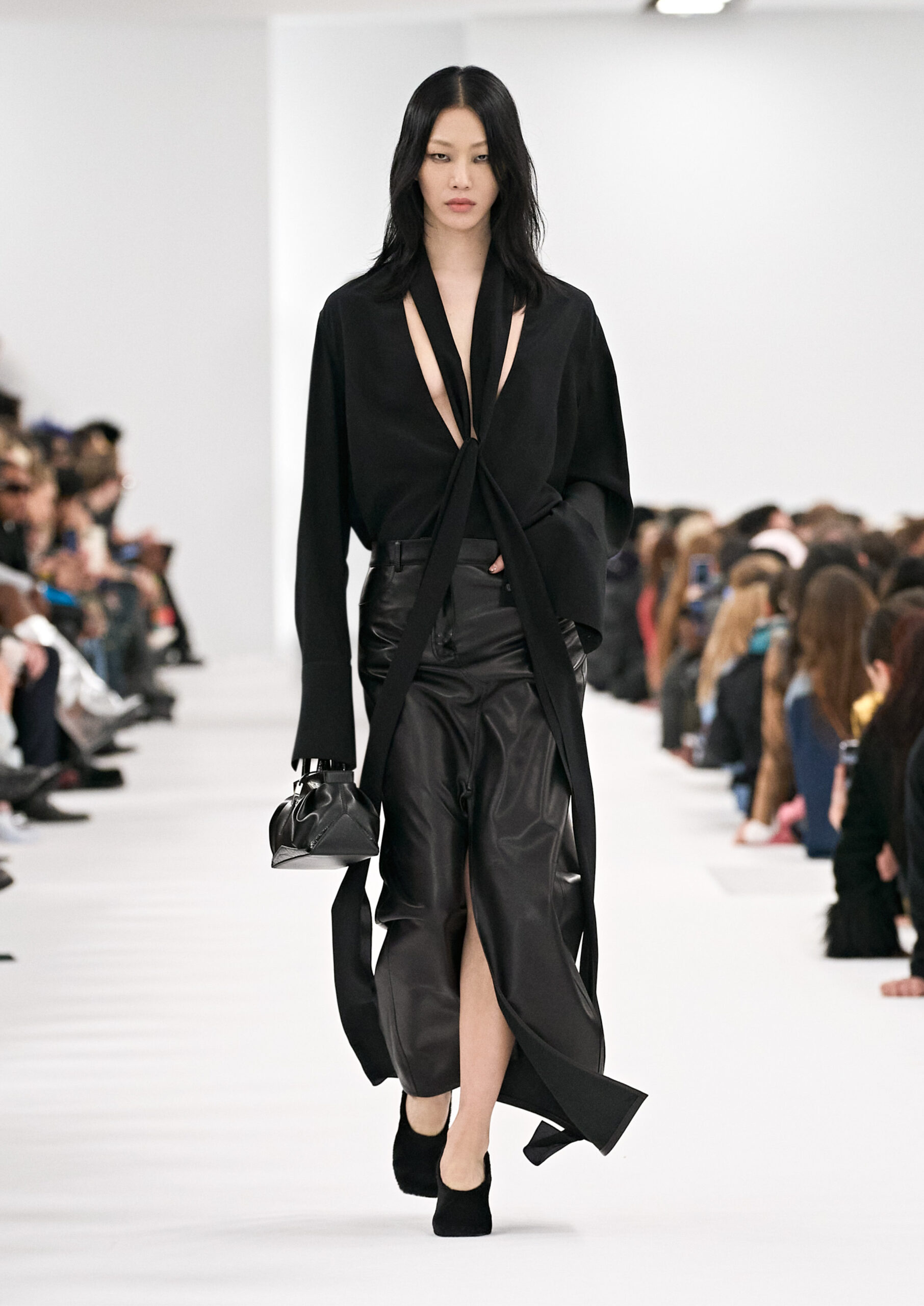 Les robes de soirée inspirées des créations d’archives sont réalisées dans les ateliers de haute couture de la Maison Givenchy. Les chenilles pannier et les robes en tulle noir sont entièrement brodées d’applications en nylon micro-floral, tandis que les détails de pavé-stitch sont présents sur les épaules des robes et les bijoux. Les sacs à main Voyou sont proposés dans des matériaux luxueux tels que le cuir vieilli, le shearling, le cuir métallique et les exotiques. Le sac à main Cut Out est interprété de manière minimaliste en spazzolato avec des silhouettes arrondies, tandis que le cadenas 4G apparaît sur une nouvelle silhouette de seau.