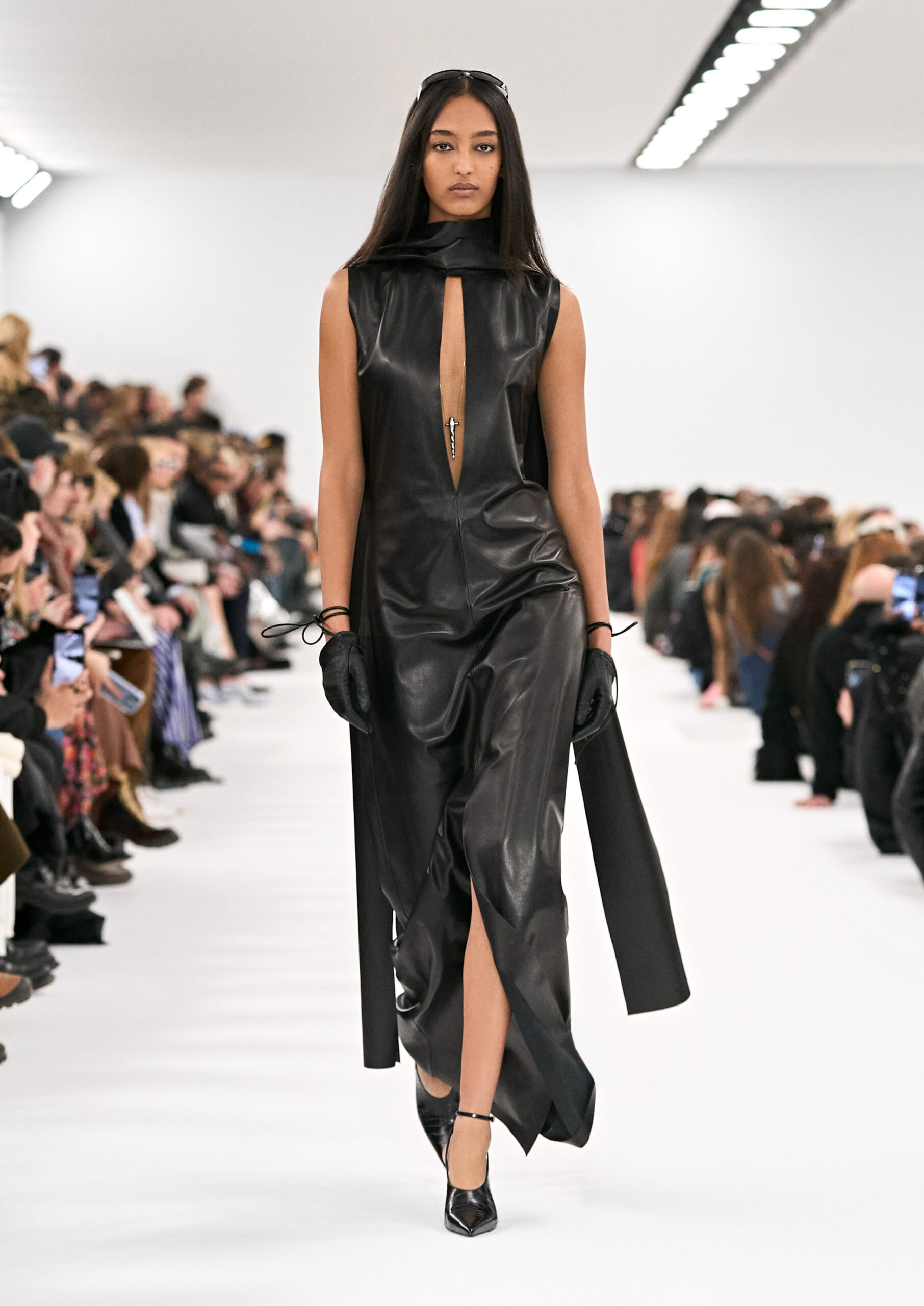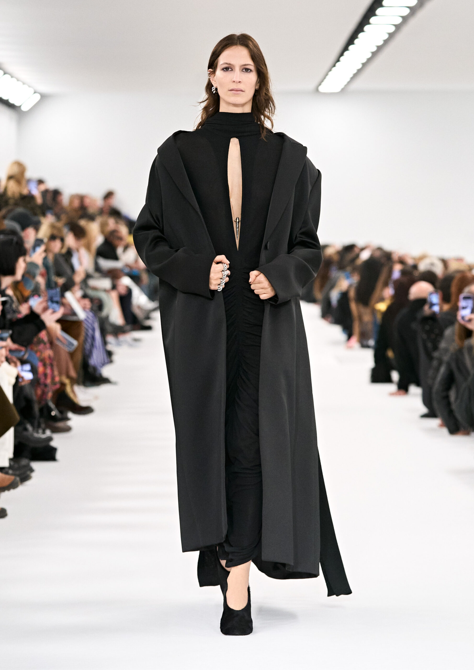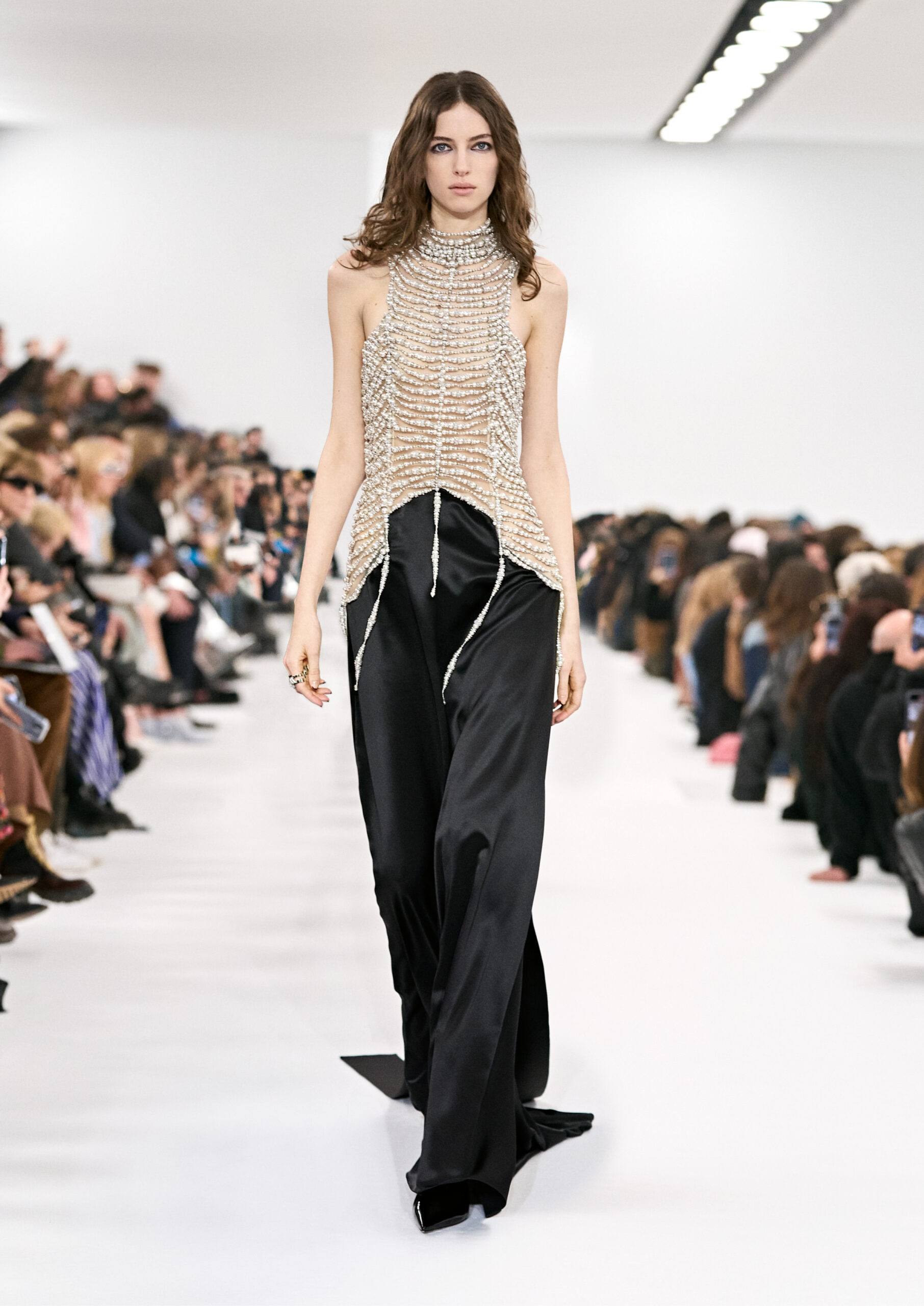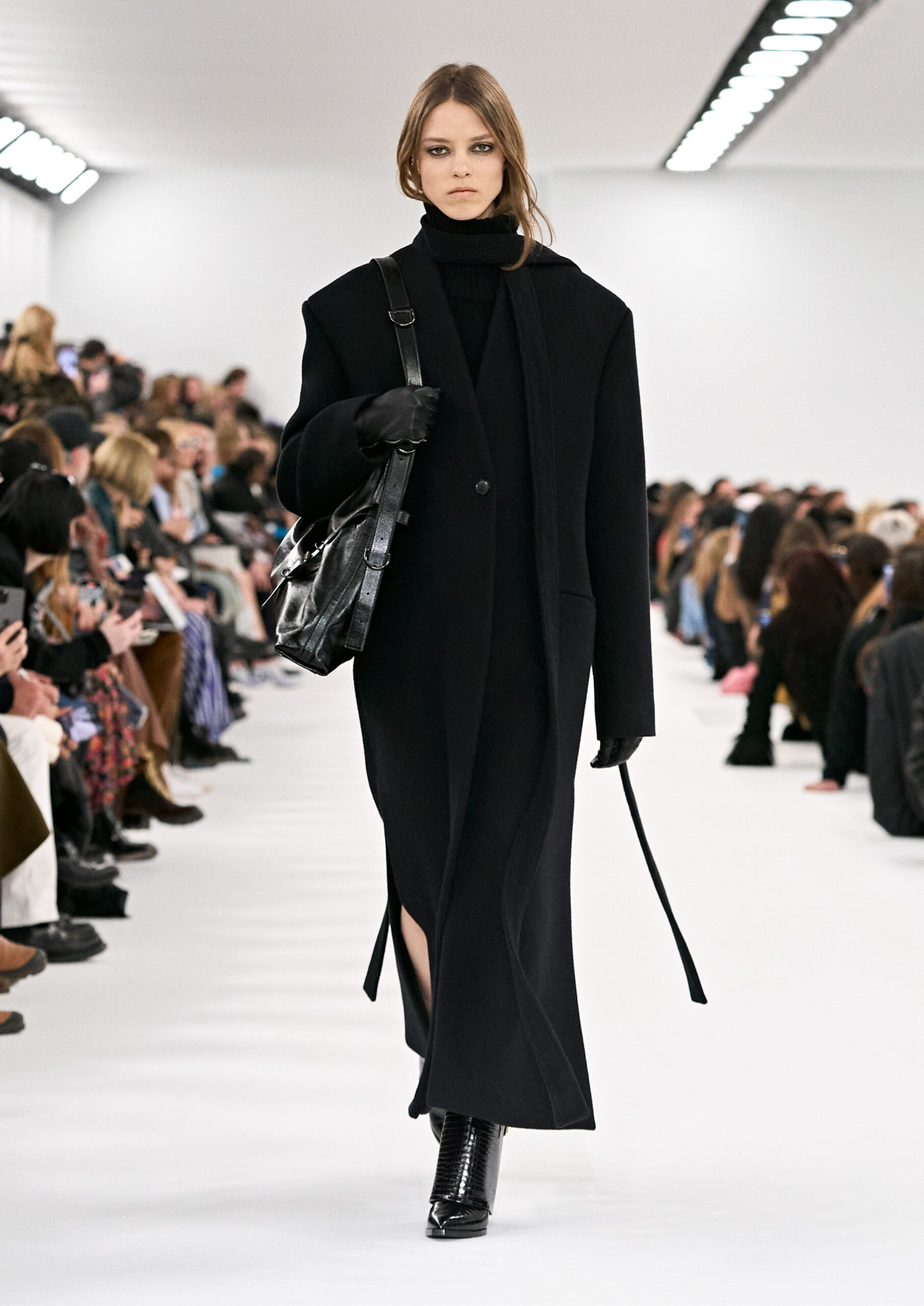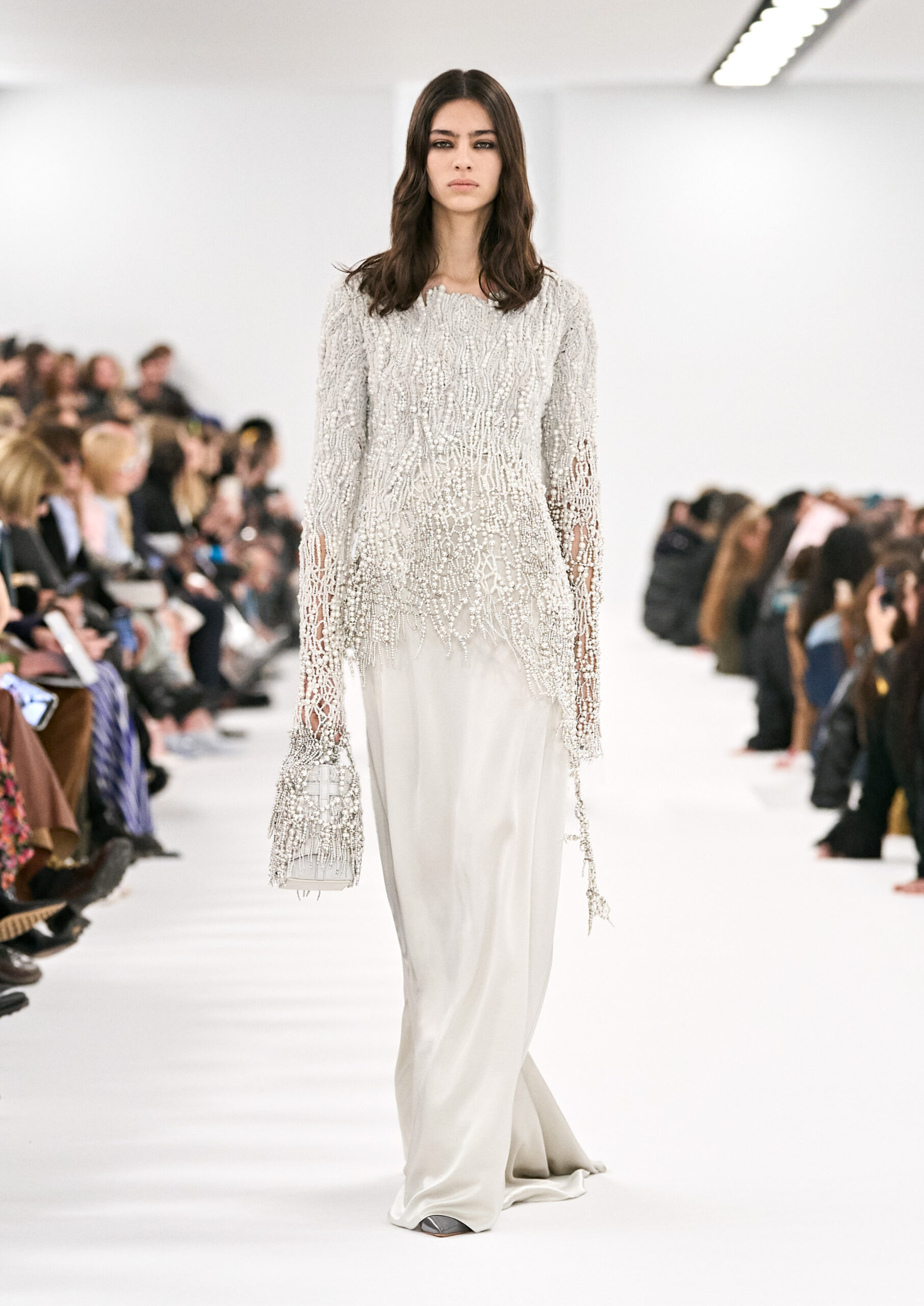 Les robes de soirée inspirées des créations d’archives sont réalisées dans les ateliers de haute couture de la Maison Givenchy. Les chenilles pannier et les robes en tulle noir sont entièrement brodées d’applications en nylon micro-floral, tandis que les détails de pavé-stitch sont présents sur les épaules des robes et les bijoux. Les sacs à main Voyou sont proposés dans des matériaux luxueux tels que le cuir vieilli, le shearling, le cuir métallique et les exotiques. Le sac à main Cut Out est interprété de manière minimaliste en spazzolato avec des silhouettes arrondies, tandis que le cadenas 4G apparaît sur une nouvelle silhouette de seau.