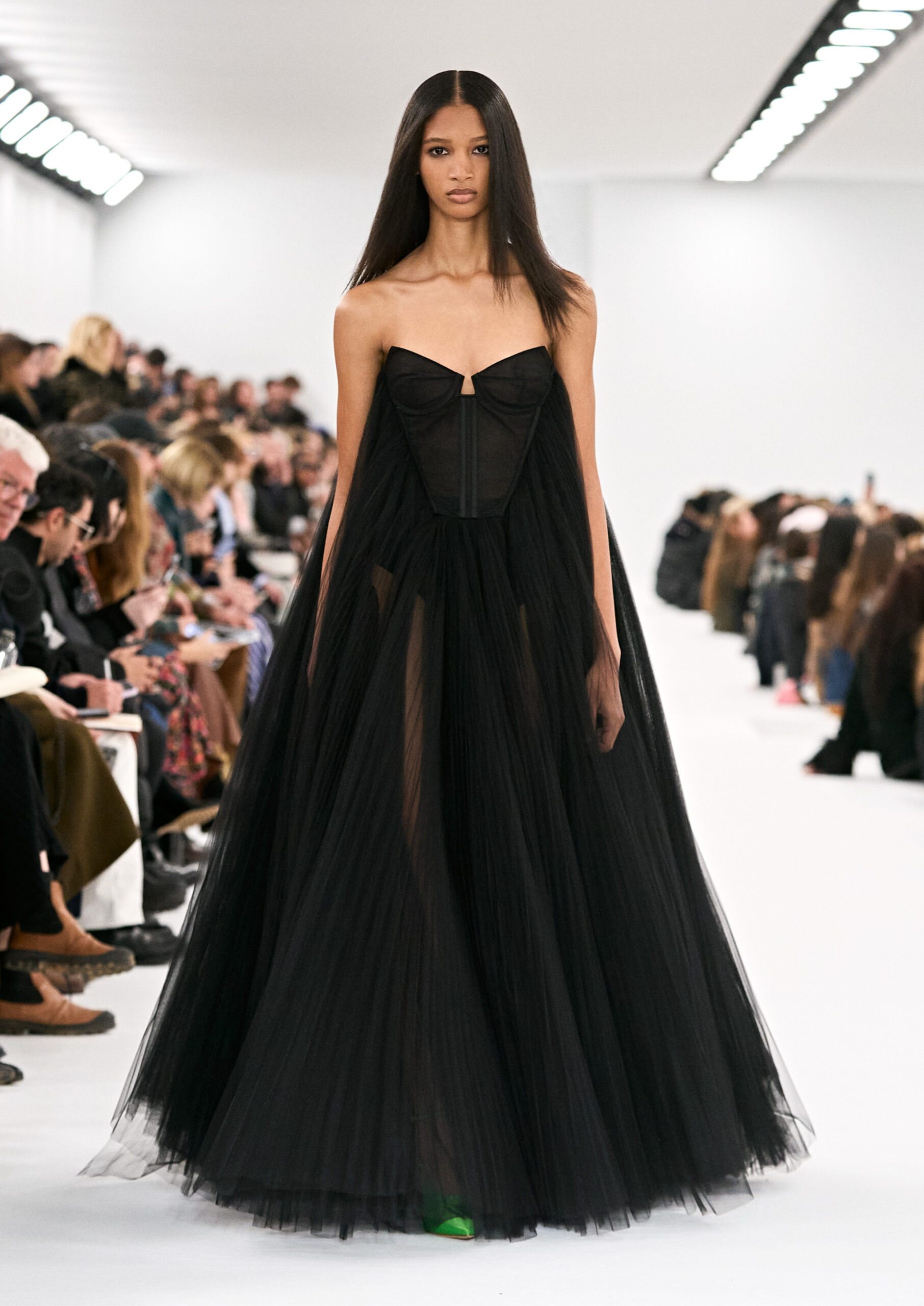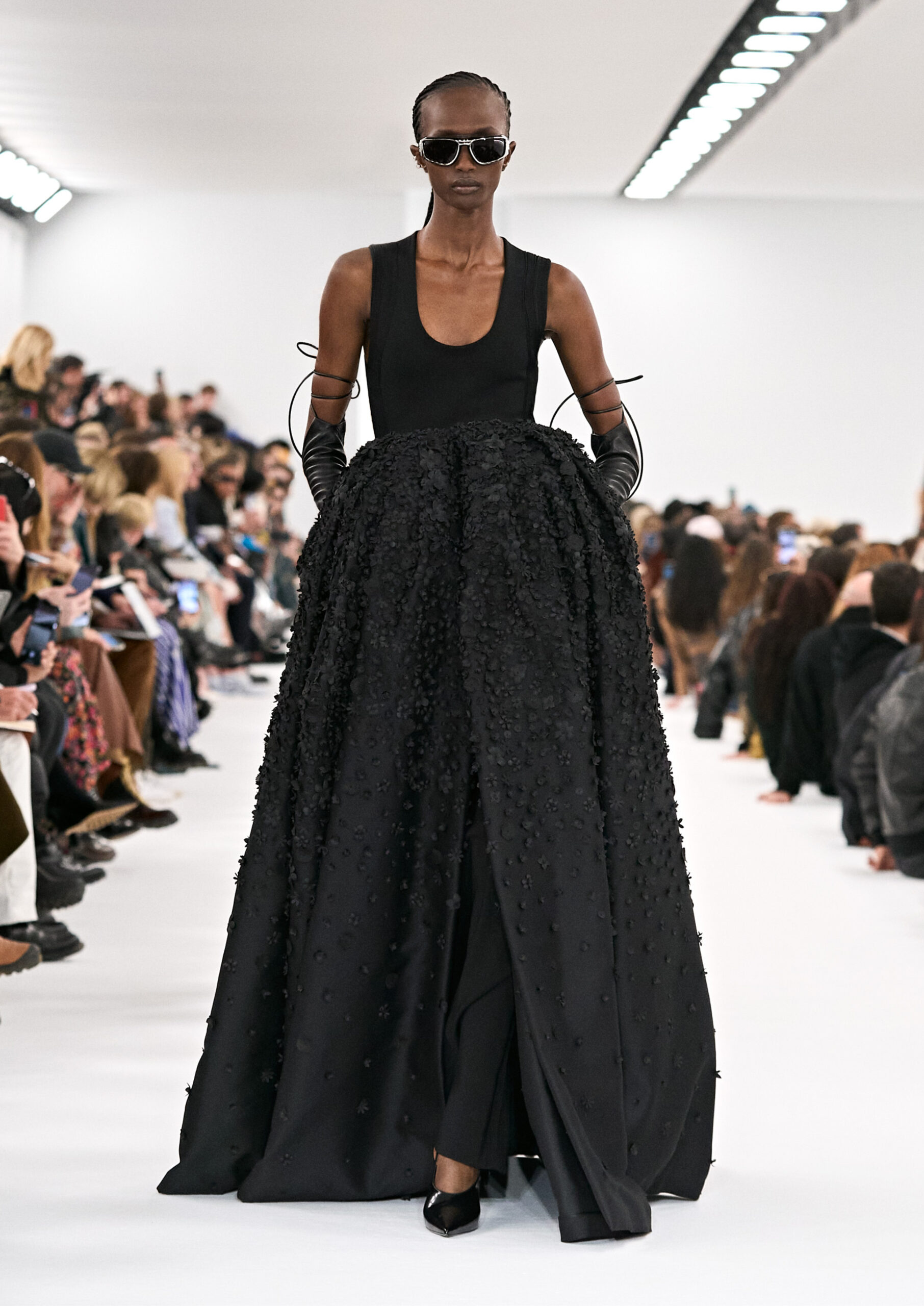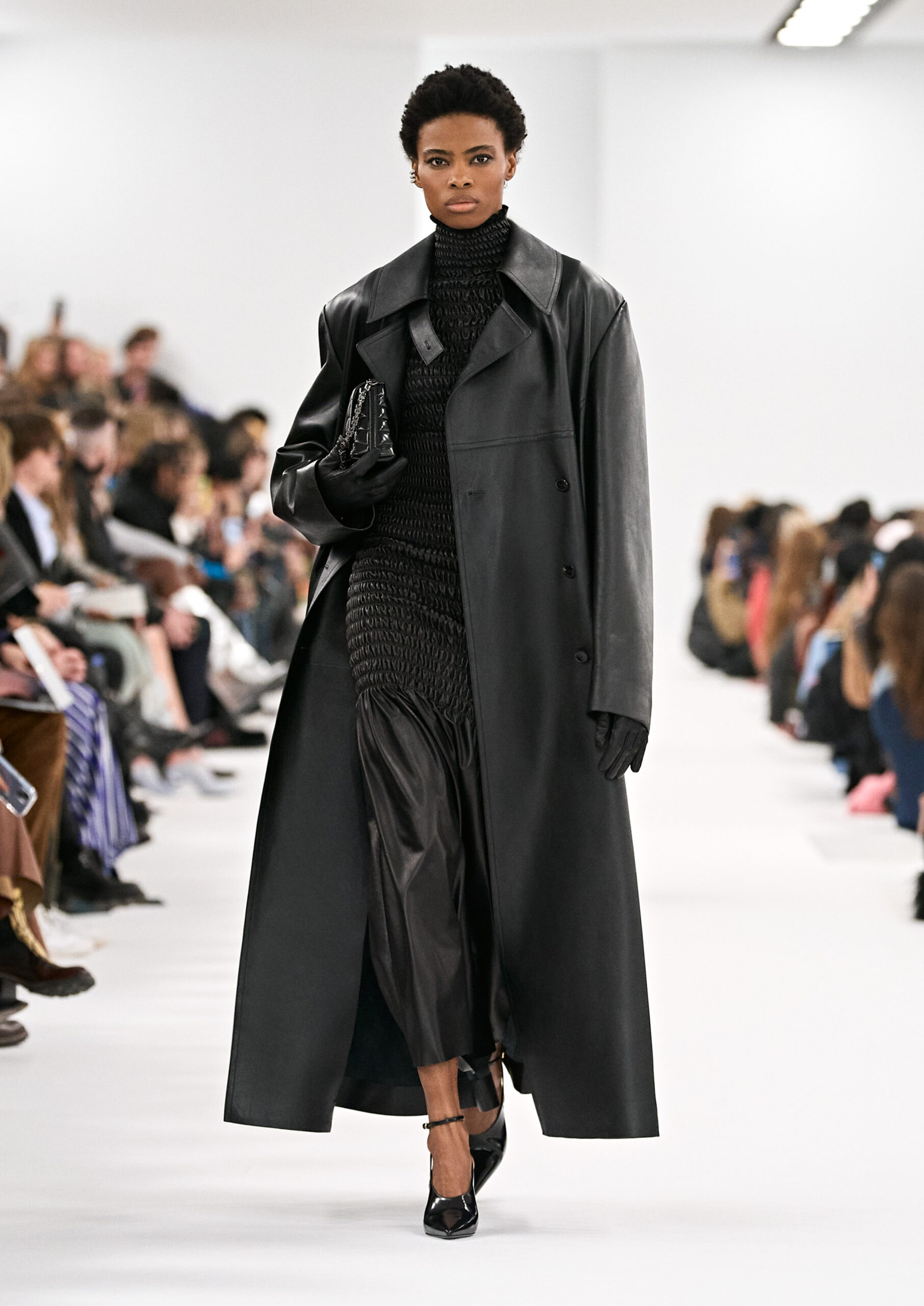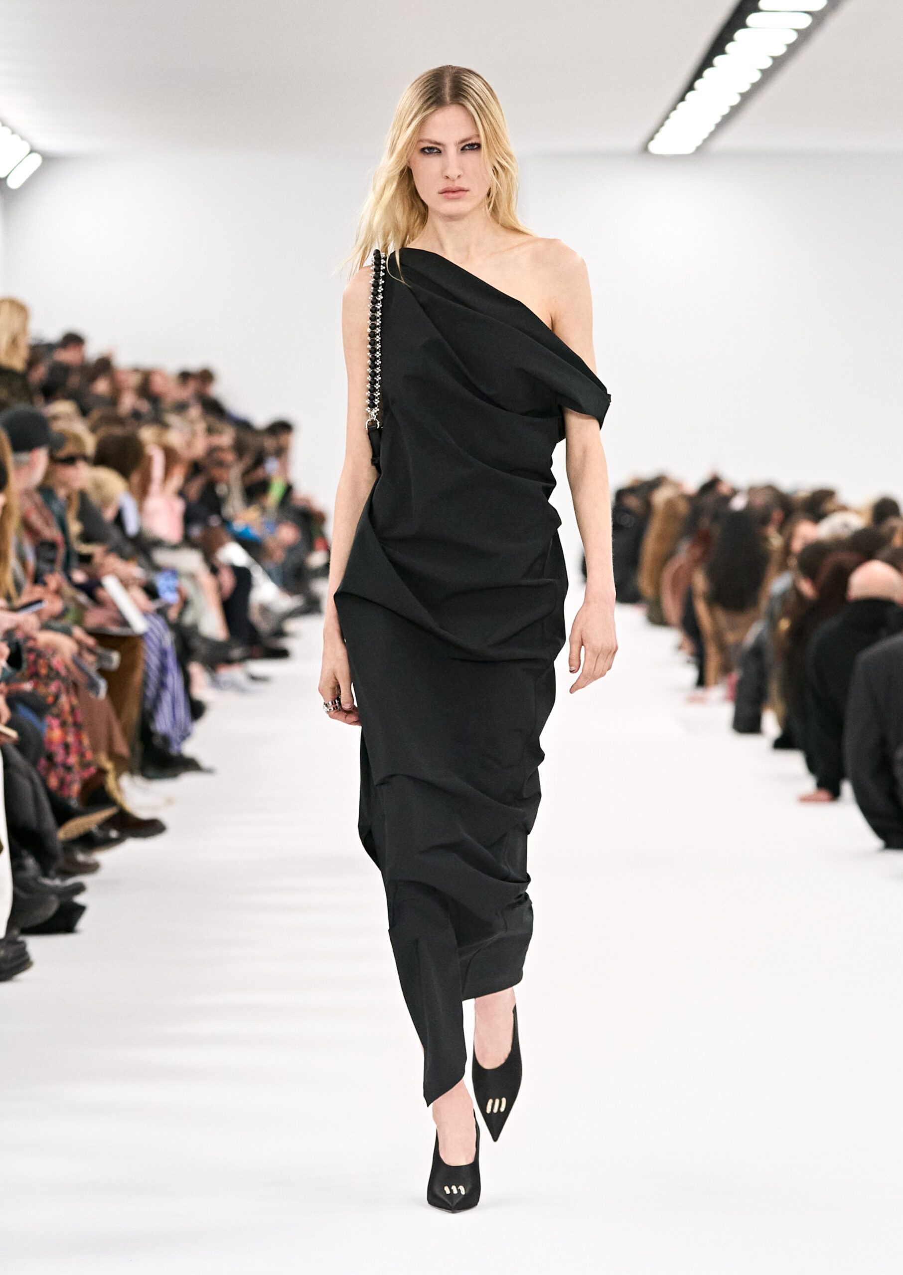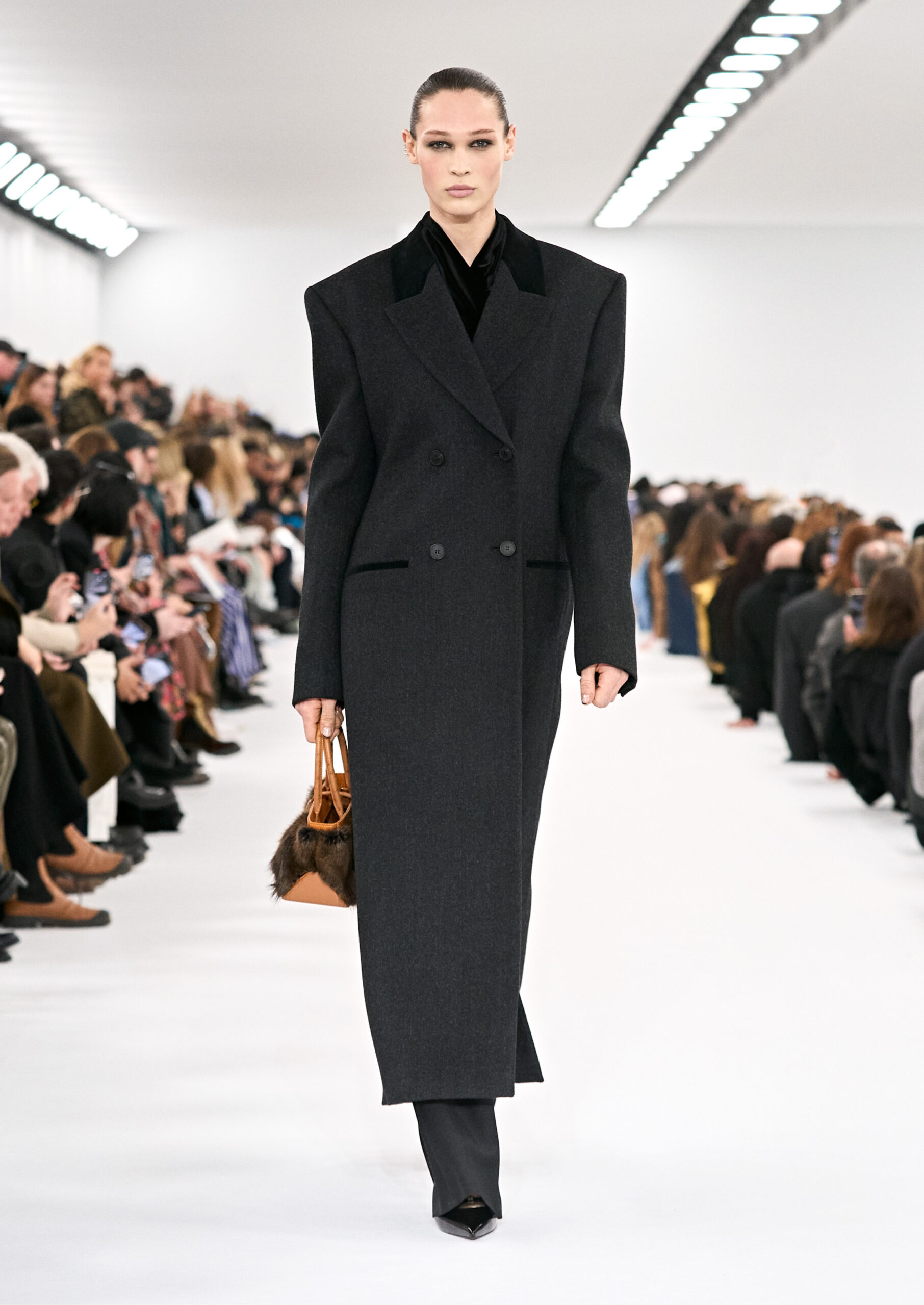 Les robes de soirée inspirées des créations d’archives sont réalisées dans les ateliers de haute couture de la Maison Givenchy. Les chenilles pannier et les robes en tulle noir sont entièrement brodées d’applications en nylon micro-floral, tandis que les détails de pavé-stitch sont présents sur les épaules des robes et les bijoux. Les sacs à main Voyou sont proposés dans des matériaux luxueux tels que le cuir vieilli, le shearling, le cuir métallique et les exotiques. Le sac à main Cut Out est interprété de manière minimaliste en spazzolato avec des silhouettes arrondies, tandis que le cadenas 4G apparaît sur une nouvelle silhouette de seau.