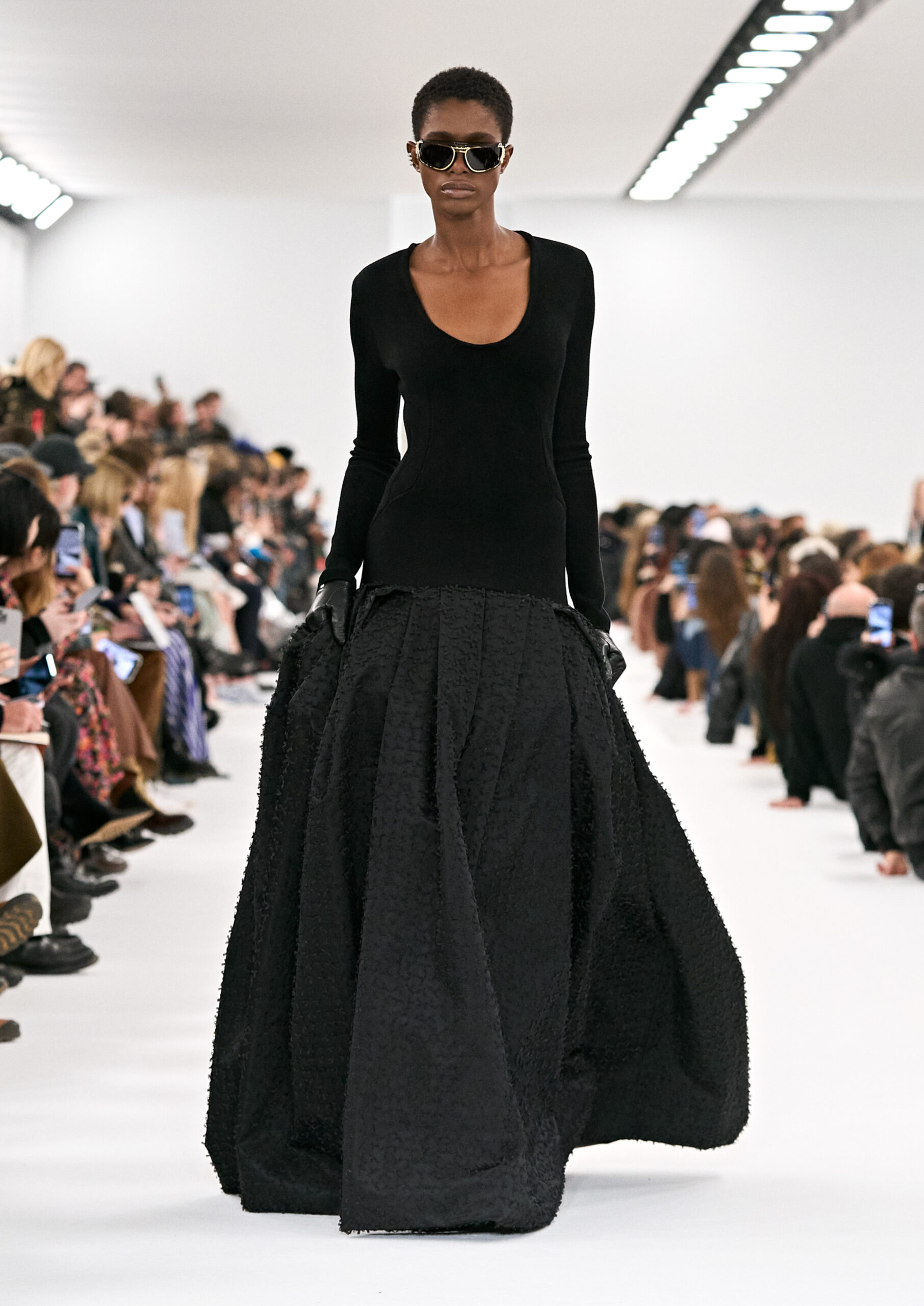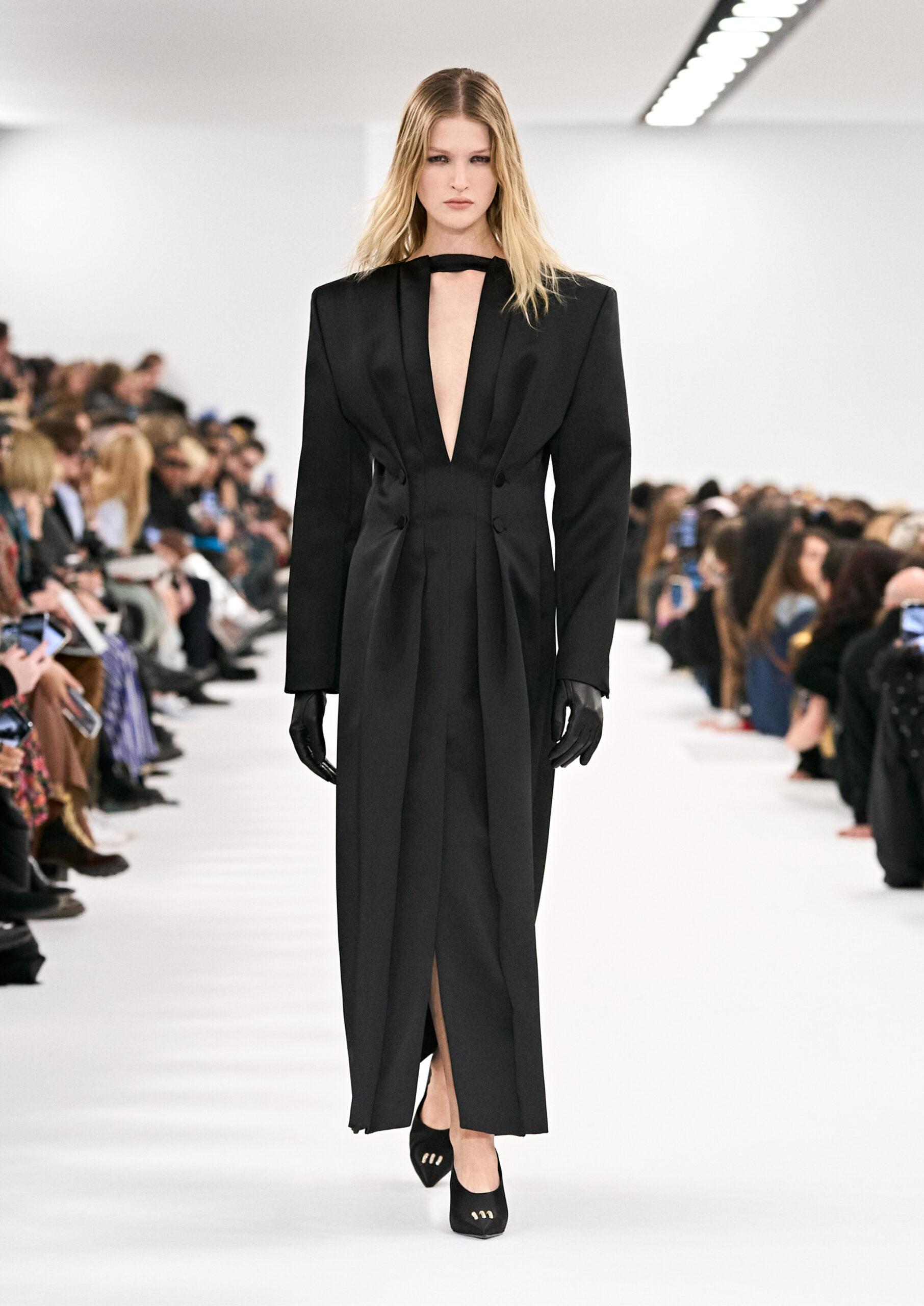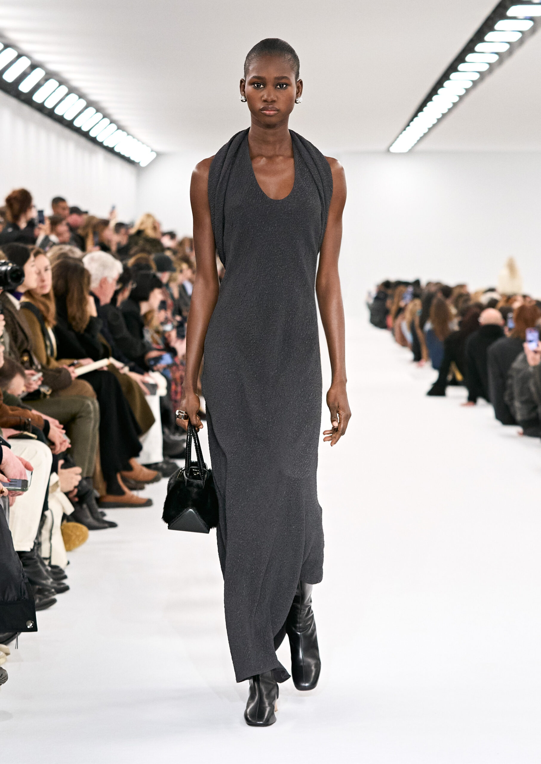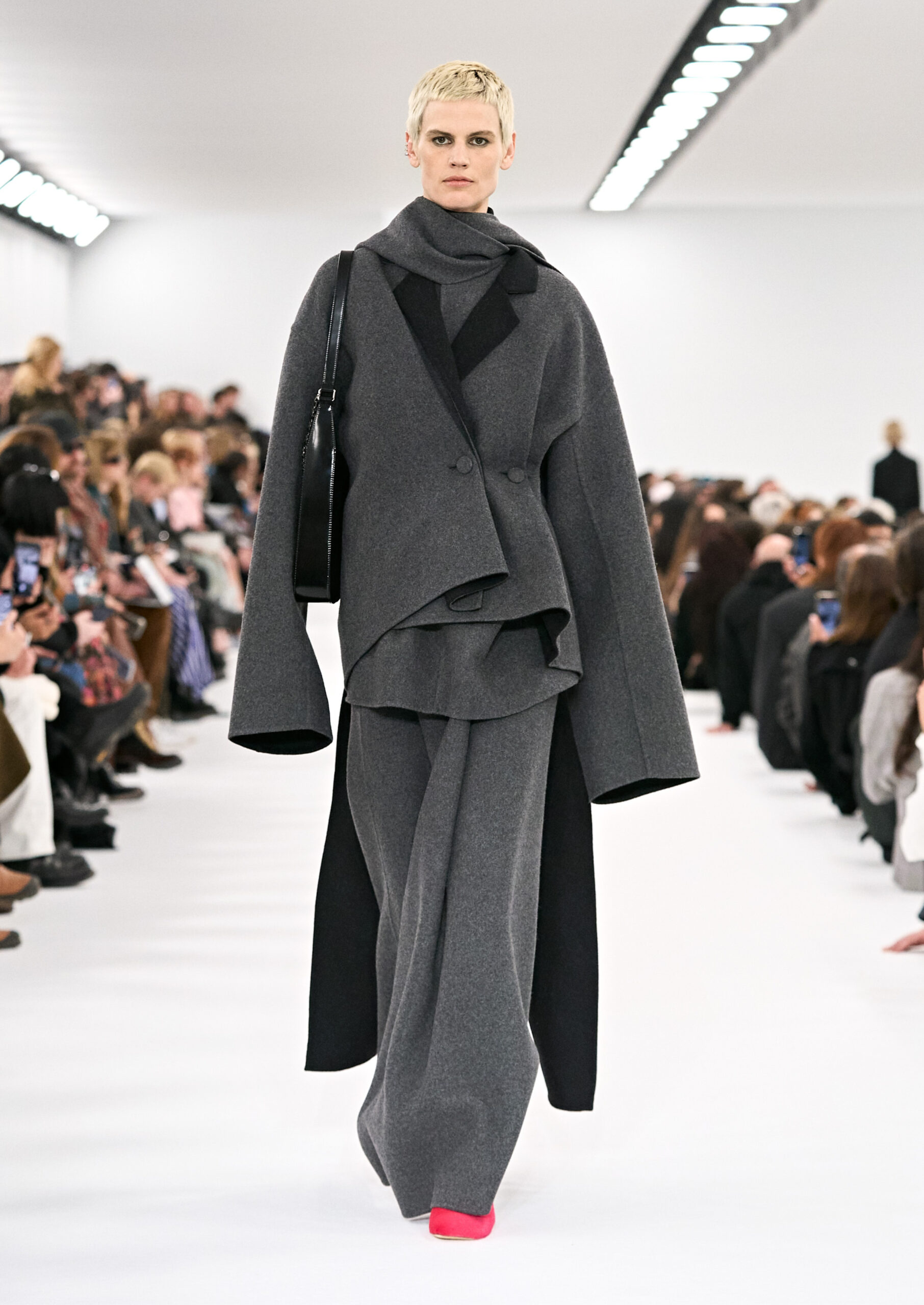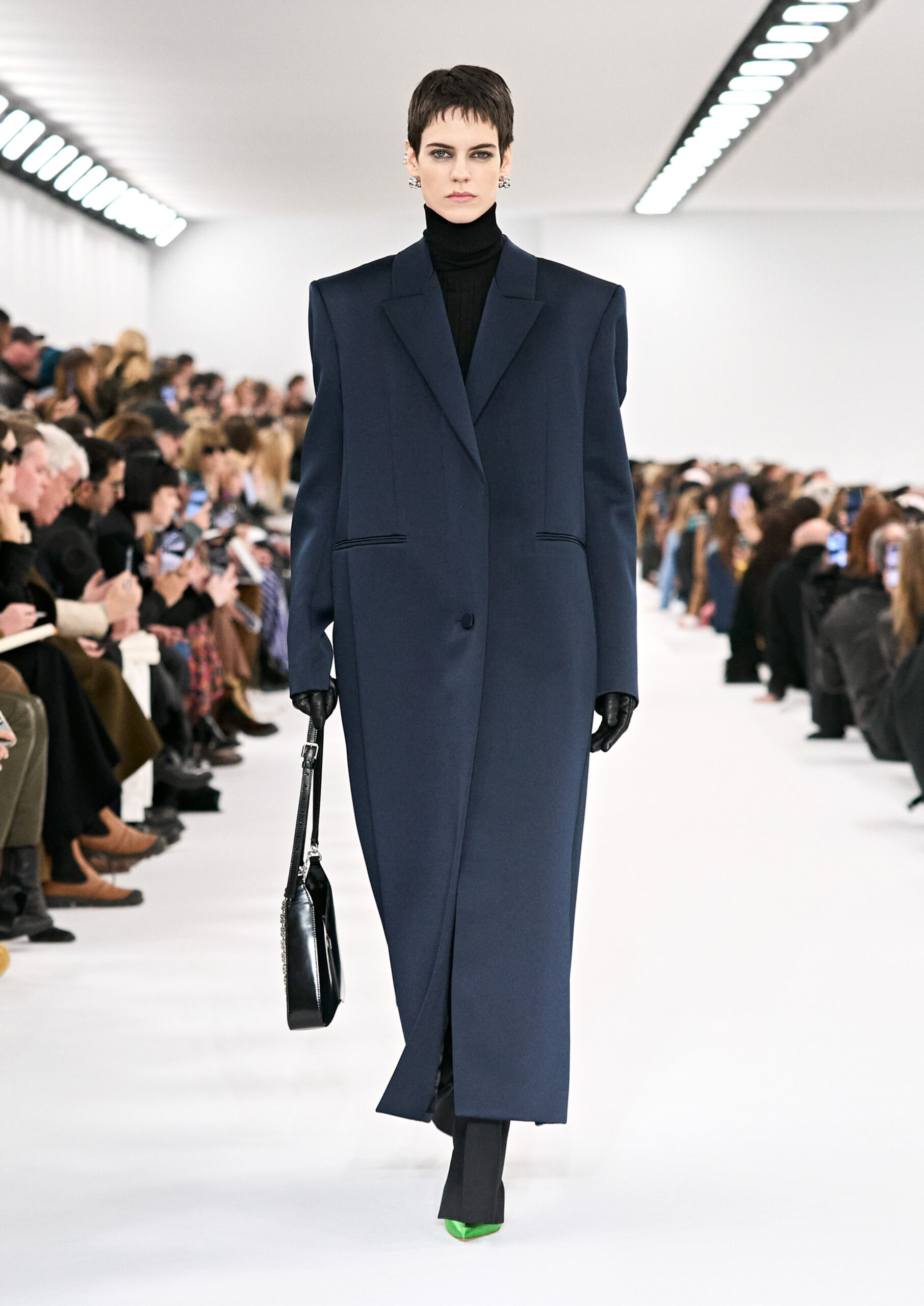 Les robes de soirée inspirées des créations d’archives sont réalisées dans les ateliers de haute couture de la Maison Givenchy. Les chenilles pannier et les robes en tulle noir sont entièrement brodées d’applications en nylon micro-floral, tandis que les détails de pavé-stitch sont présents sur les épaules des robes et les bijoux. Les sacs à main Voyou sont proposés dans des matériaux luxueux tels que le cuir vieilli, le shearling, le cuir métallique et les exotiques. Le sac à main Cut Out est interprété de manière minimaliste en spazzolato avec des silhouettes arrondies, tandis que le cadenas 4G apparaît sur une nouvelle silhouette de seau.