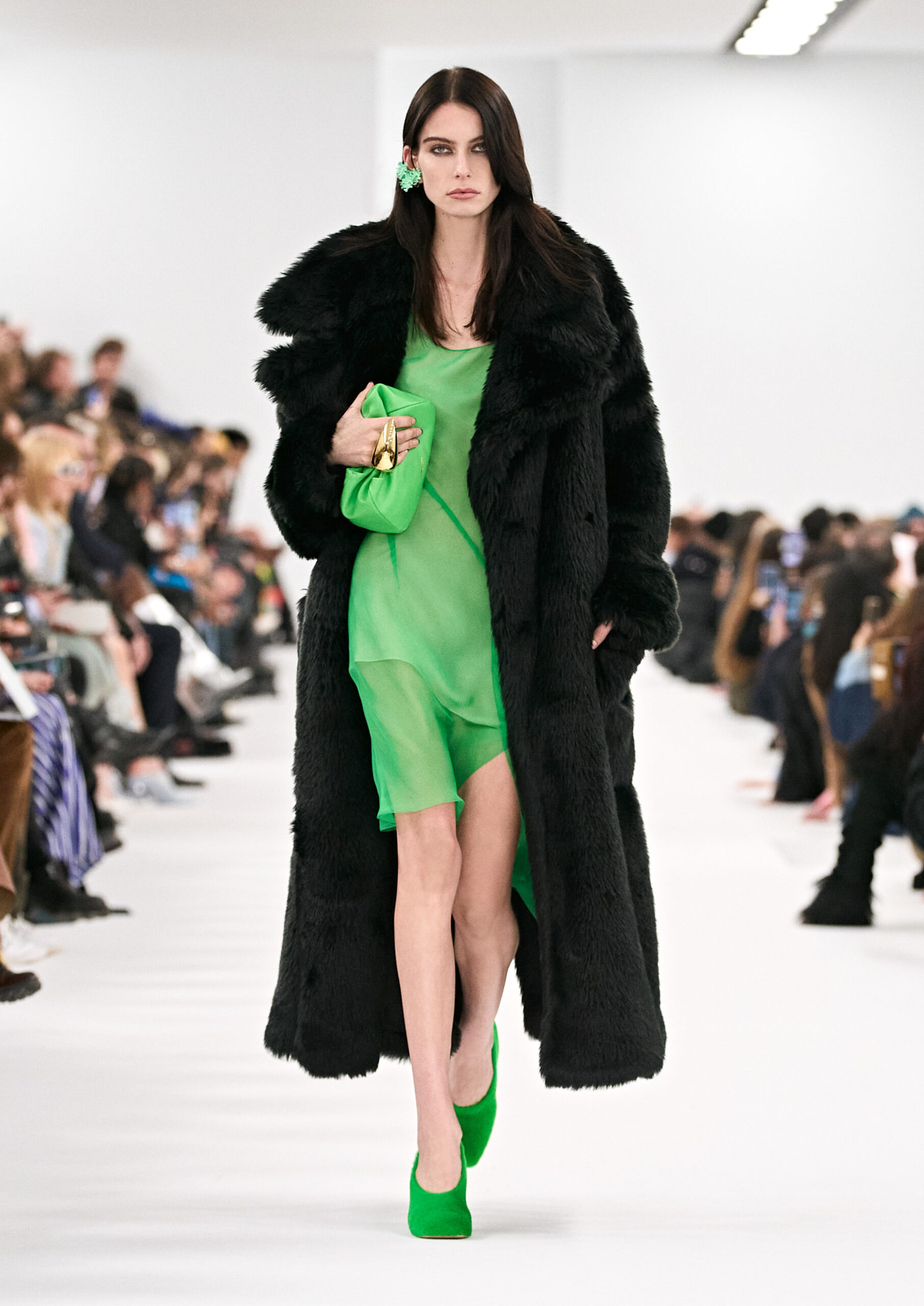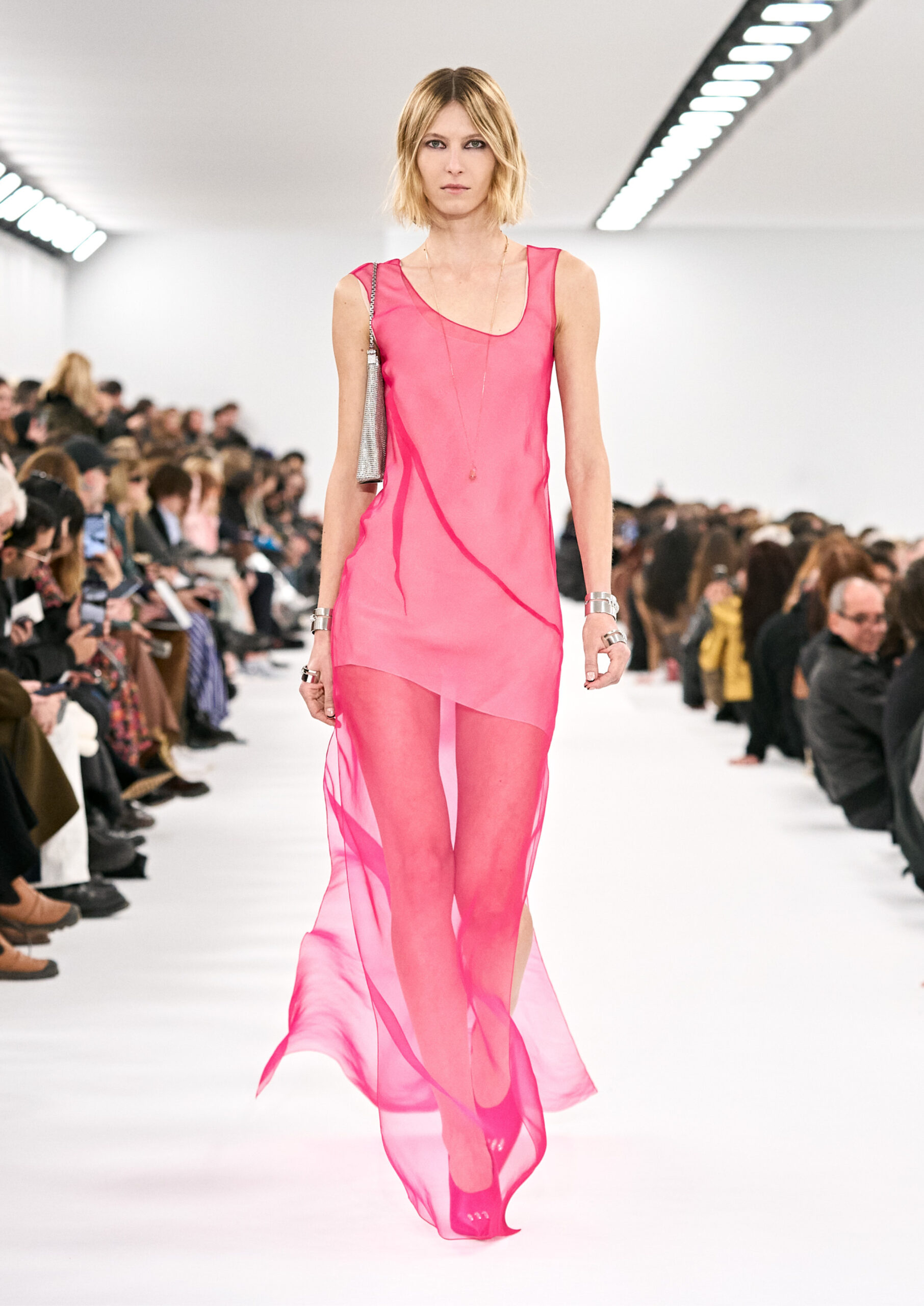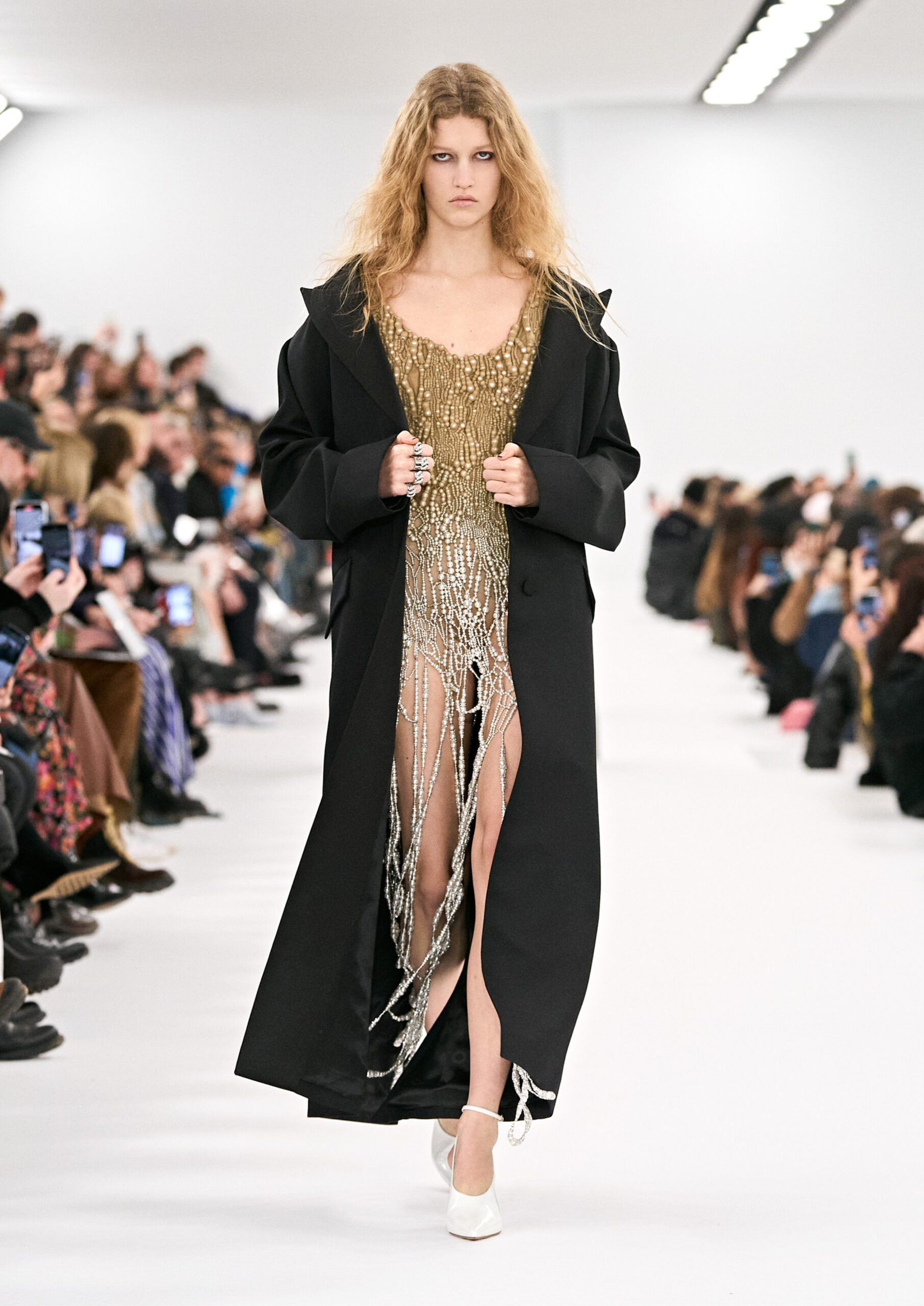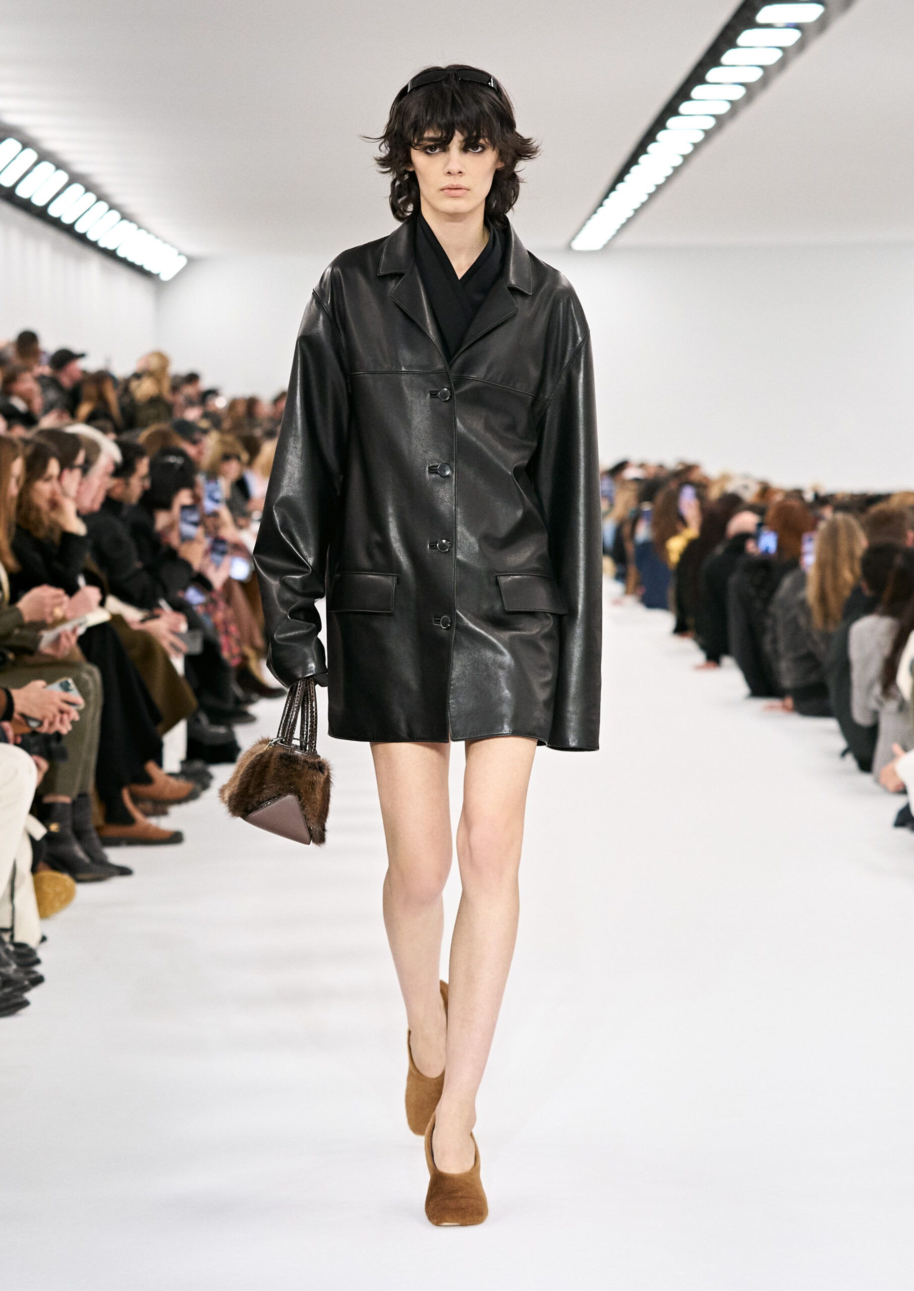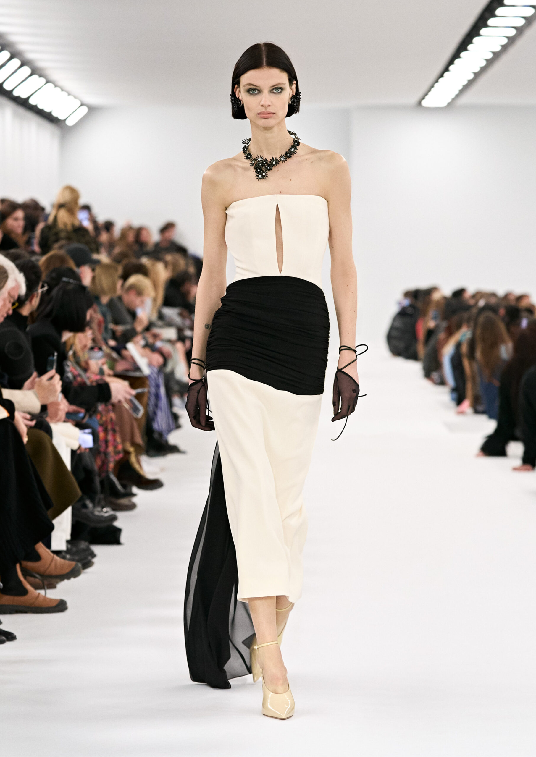Les robes de soirée inspirées des créations d’archives sont réalisées dans les ateliers de haute couture de la Maison Givenchy. Les chenilles pannier et les robes en tulle noir sont entièrement brodées d’applications en nylon micro-floral, tandis que les détails de pavé-stitch sont présents sur les épaules des robes et les bijoux. Les sacs à main Voyou sont proposés dans des matériaux luxueux tels que le cuir vieilli, le shearling, le cuir métallique et les exotiques. Le sac à main Cut Out est interprété de manière minimaliste en spazzolato avec des silhouettes arrondies, tandis que le cadenas 4G apparaît sur une nouvelle silhouette de seau.
