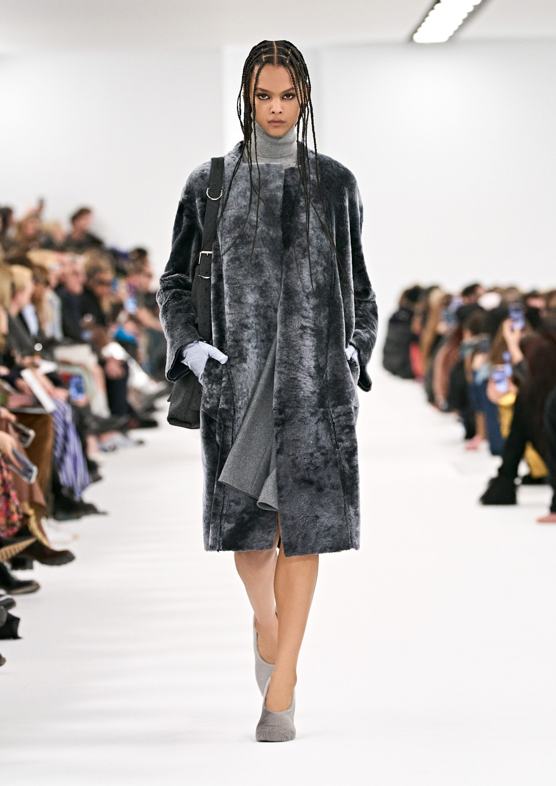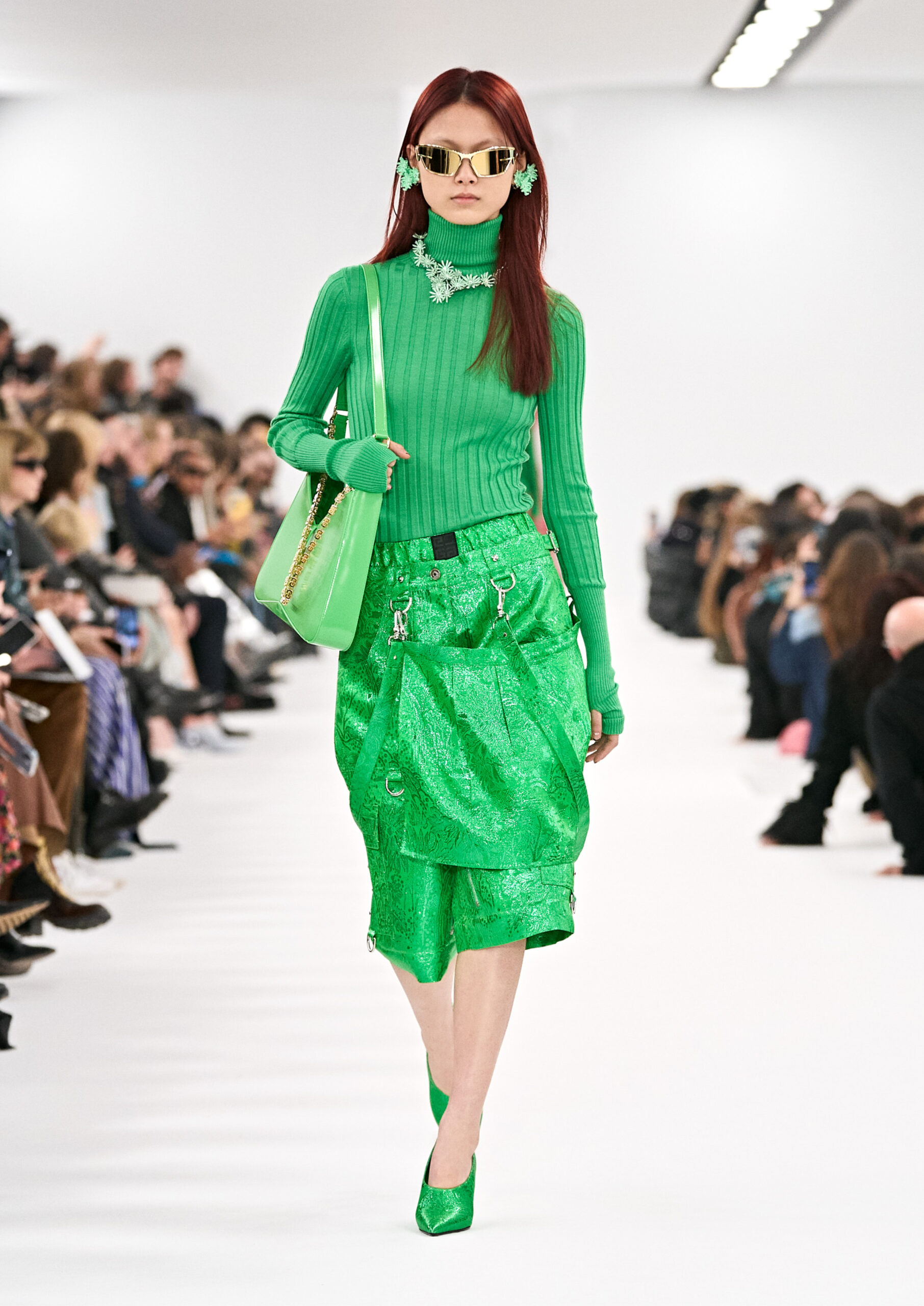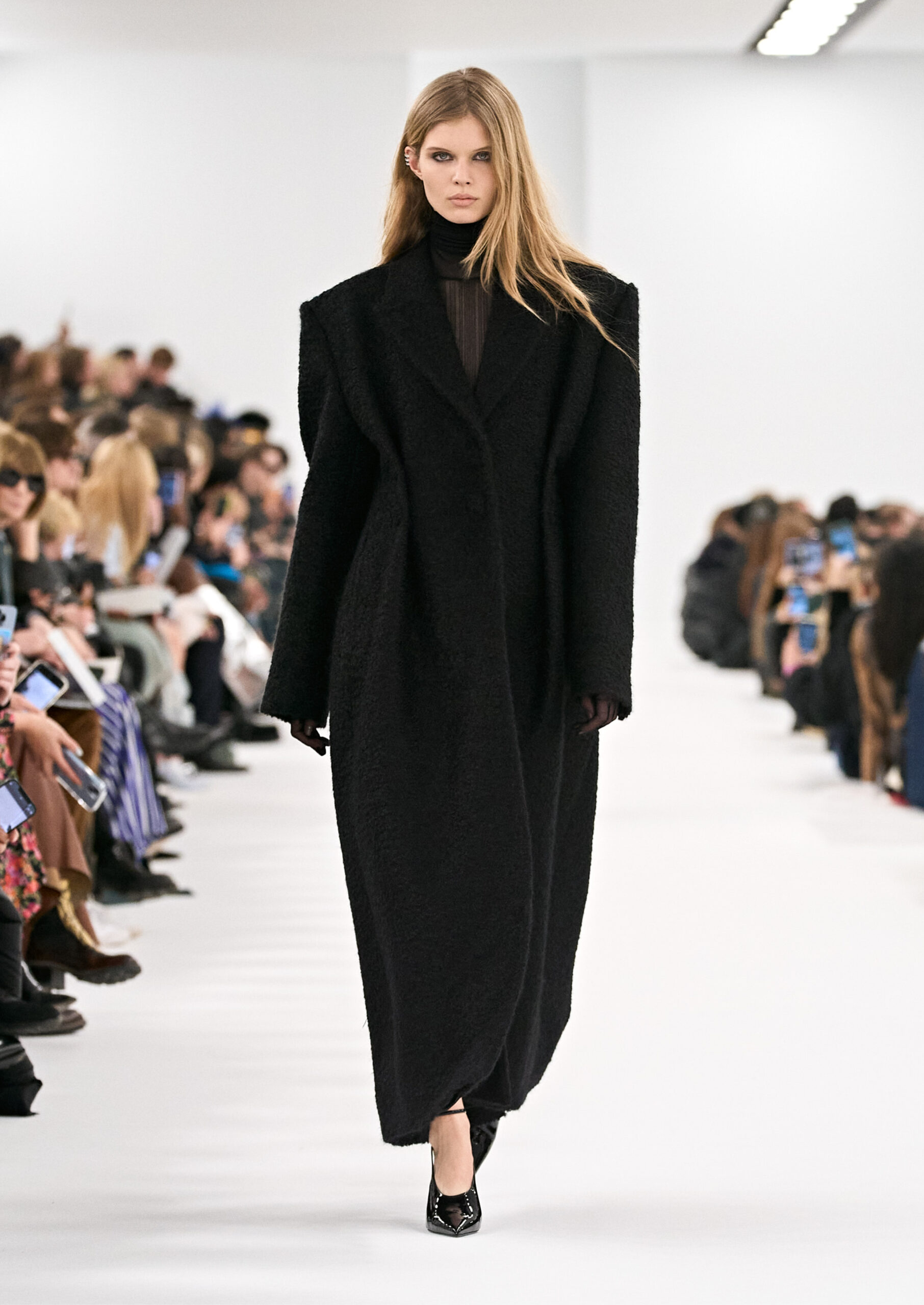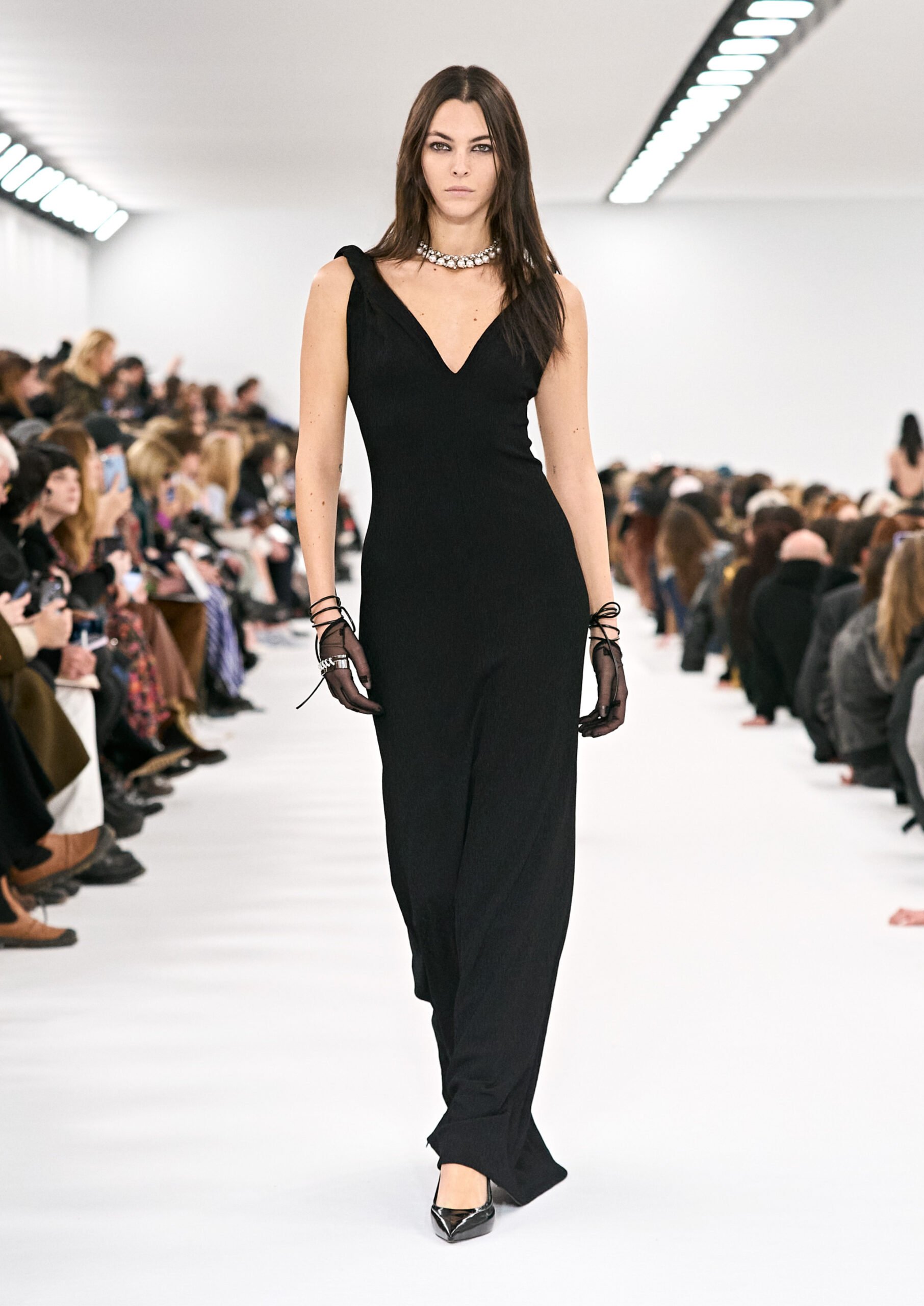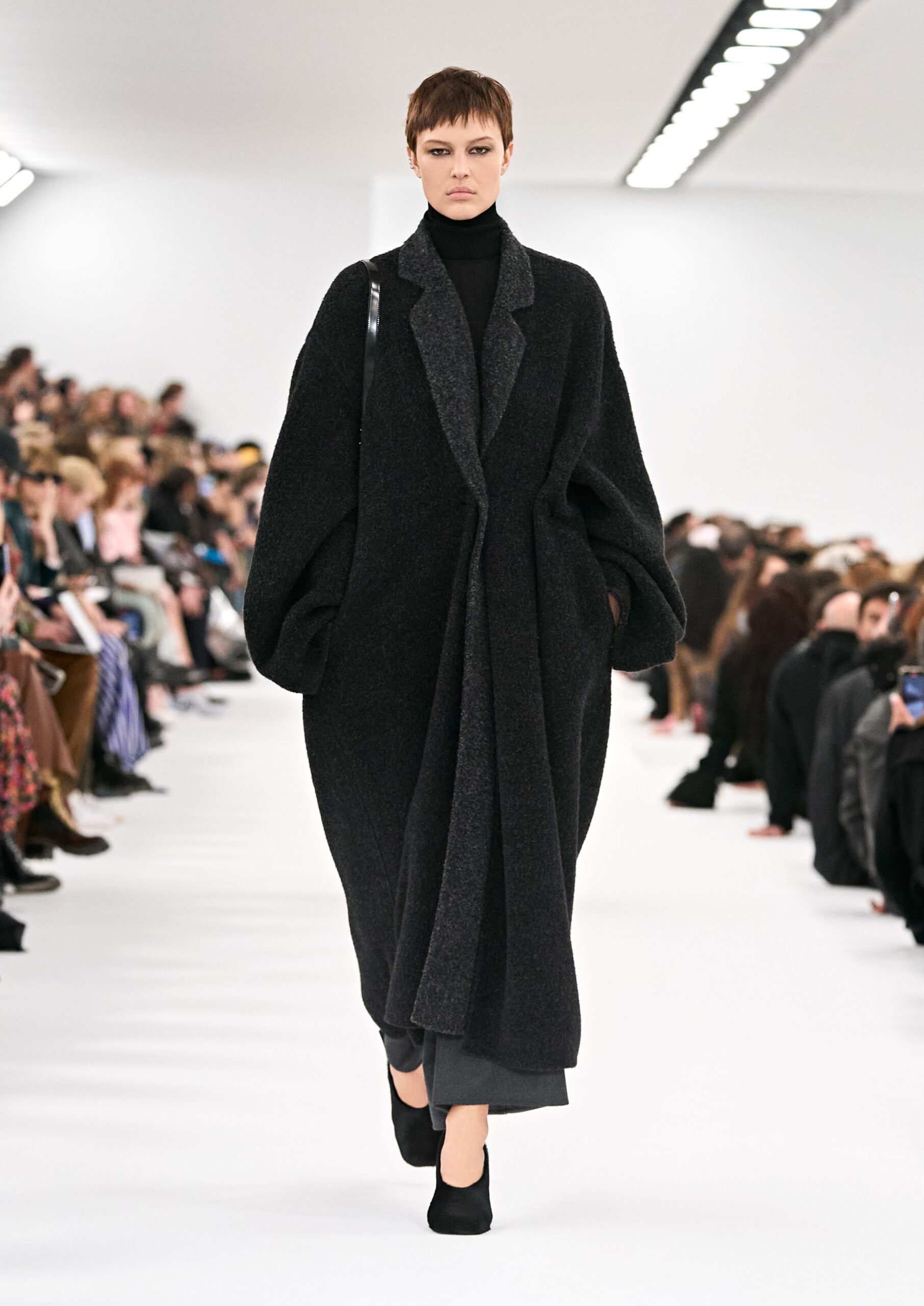 Les robes de soirée inspirées des créations d’archives sont réalisées dans les ateliers de haute couture de la Maison Givenchy. Les chenilles pannier et les robes en tulle noir sont entièrement brodées d’applications en nylon micro-floral, tandis que les détails de pavé-stitch sont présents sur les épaules des robes et les bijoux. Les sacs à main Voyou sont proposés dans des matériaux luxueux tels que le cuir vieilli, le shearling, le cuir métallique et les exotiques. Le sac à main Cut Out est interprété de manière minimaliste en spazzolato avec des silhouettes arrondies, tandis que le cadenas 4G apparaît sur une nouvelle silhouette de seau.