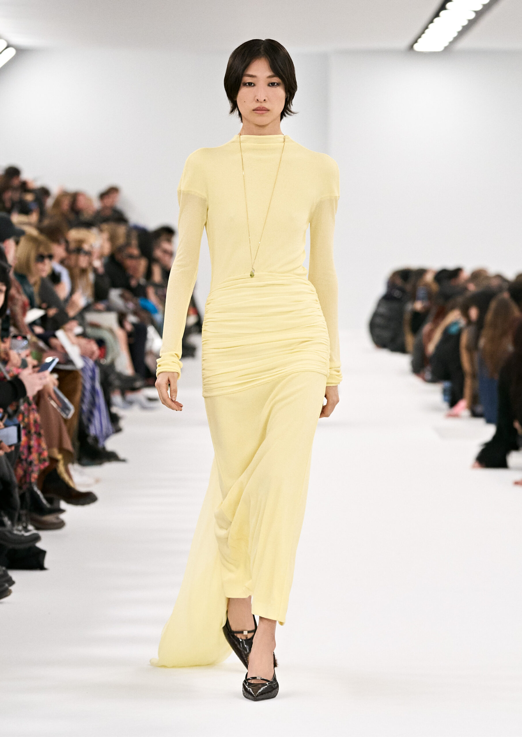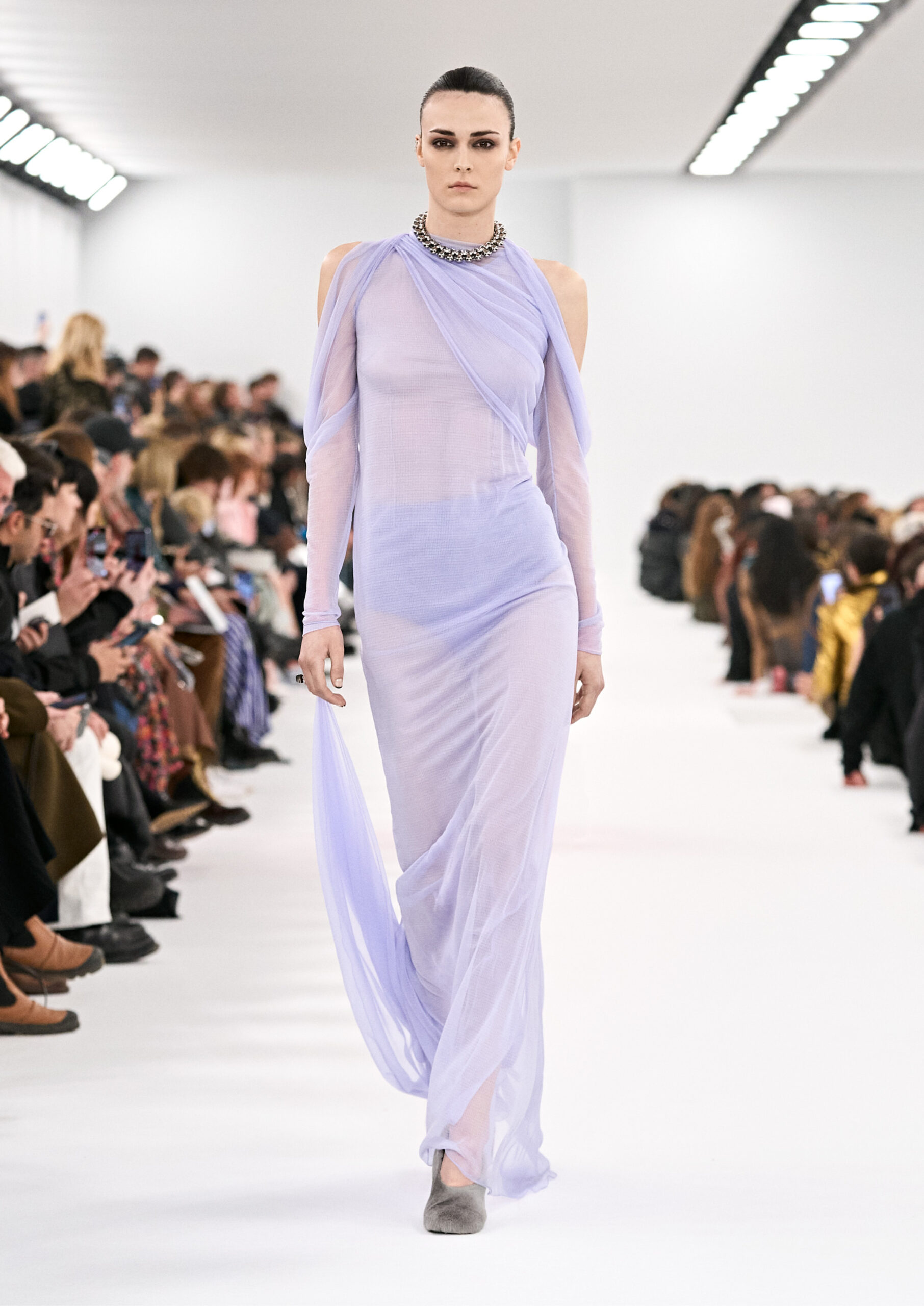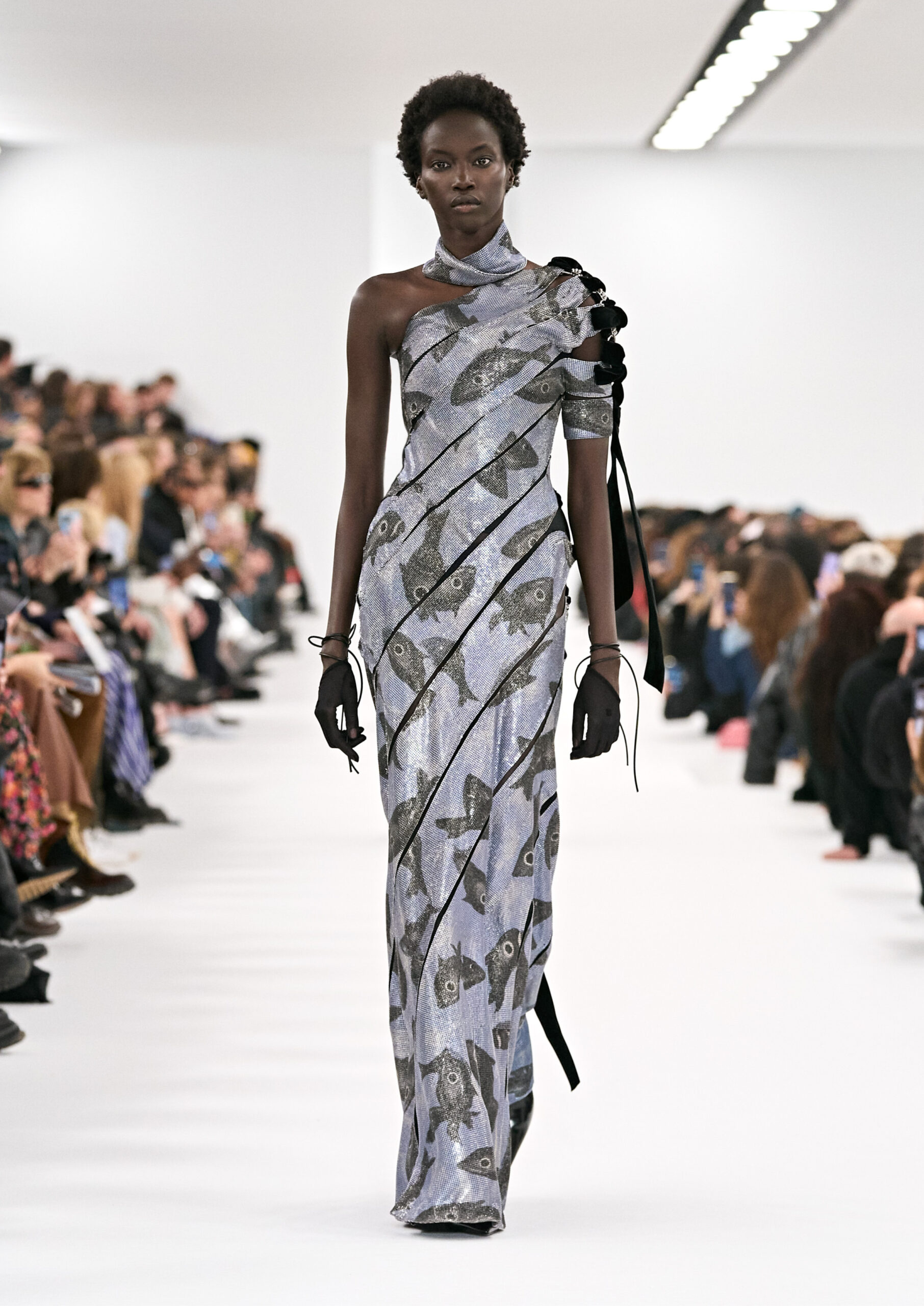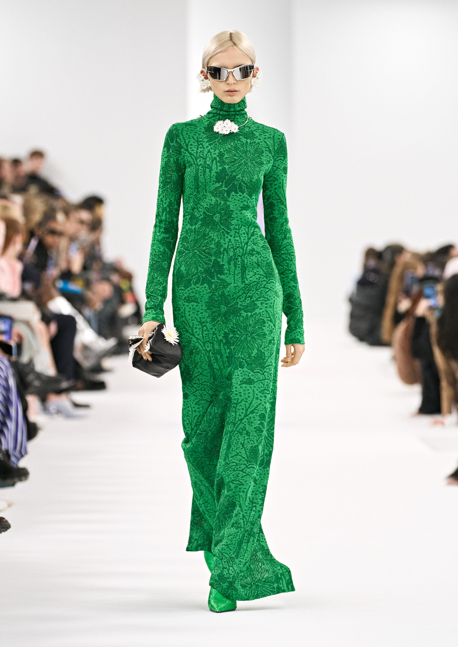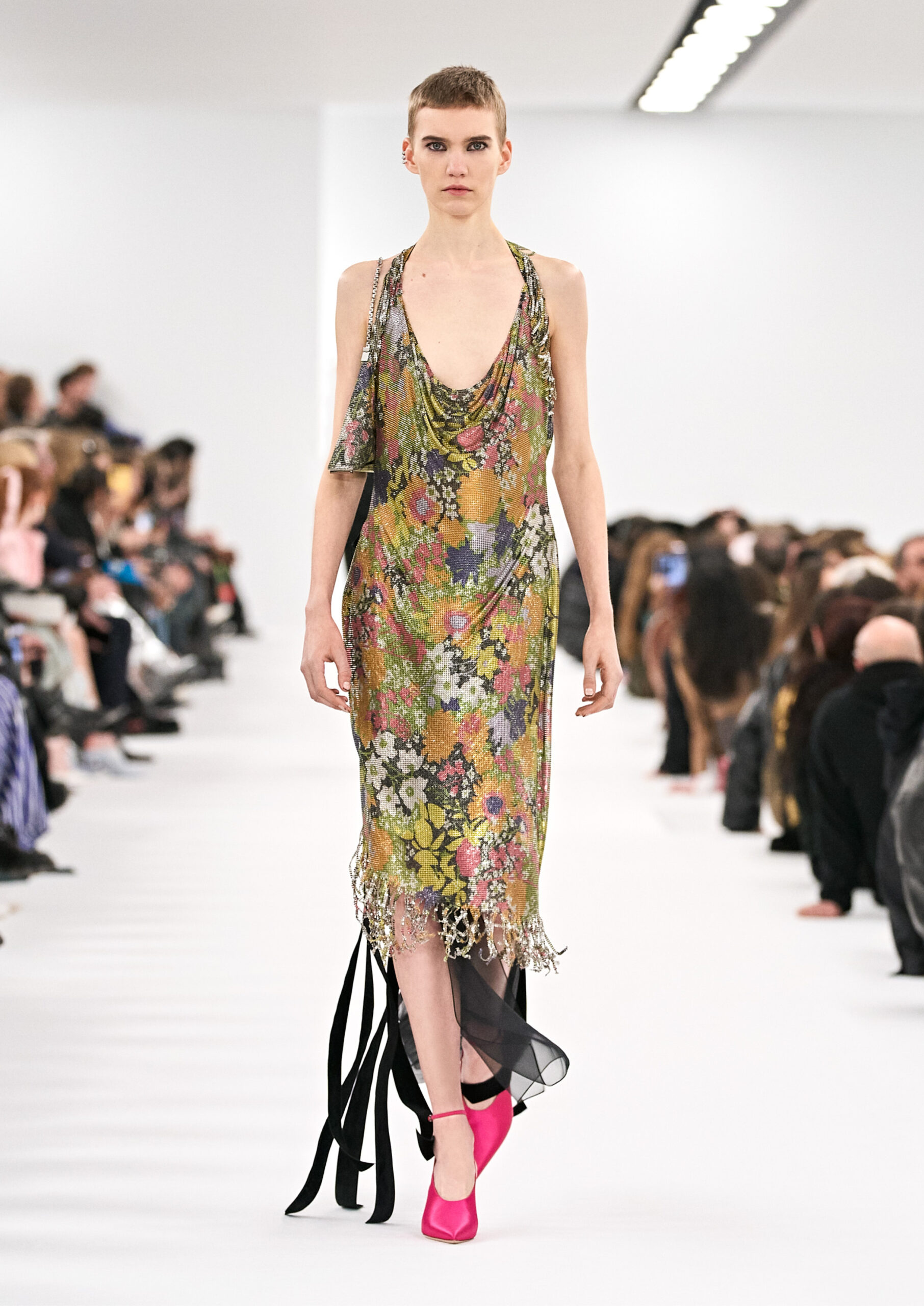 La collection met en avant des motifs floraux et des pois, issus des archives de la Maison Givenchy, qui sont réinterprétés sur des matériaux modernes tels que le nylon laser, la maille et les bandes qui s’enroulent autour du corps. Des robes drapées avec des traînes, des robes en chaîne et des robes de soirée composées de bandes torsadées autour du corps reflètent l’expression de soi caractéristique de la nouvelle culture vestimentaire. Les accents de couleur se marient parfaitement avec des robes lavallière en cuir ou en satin martelé.