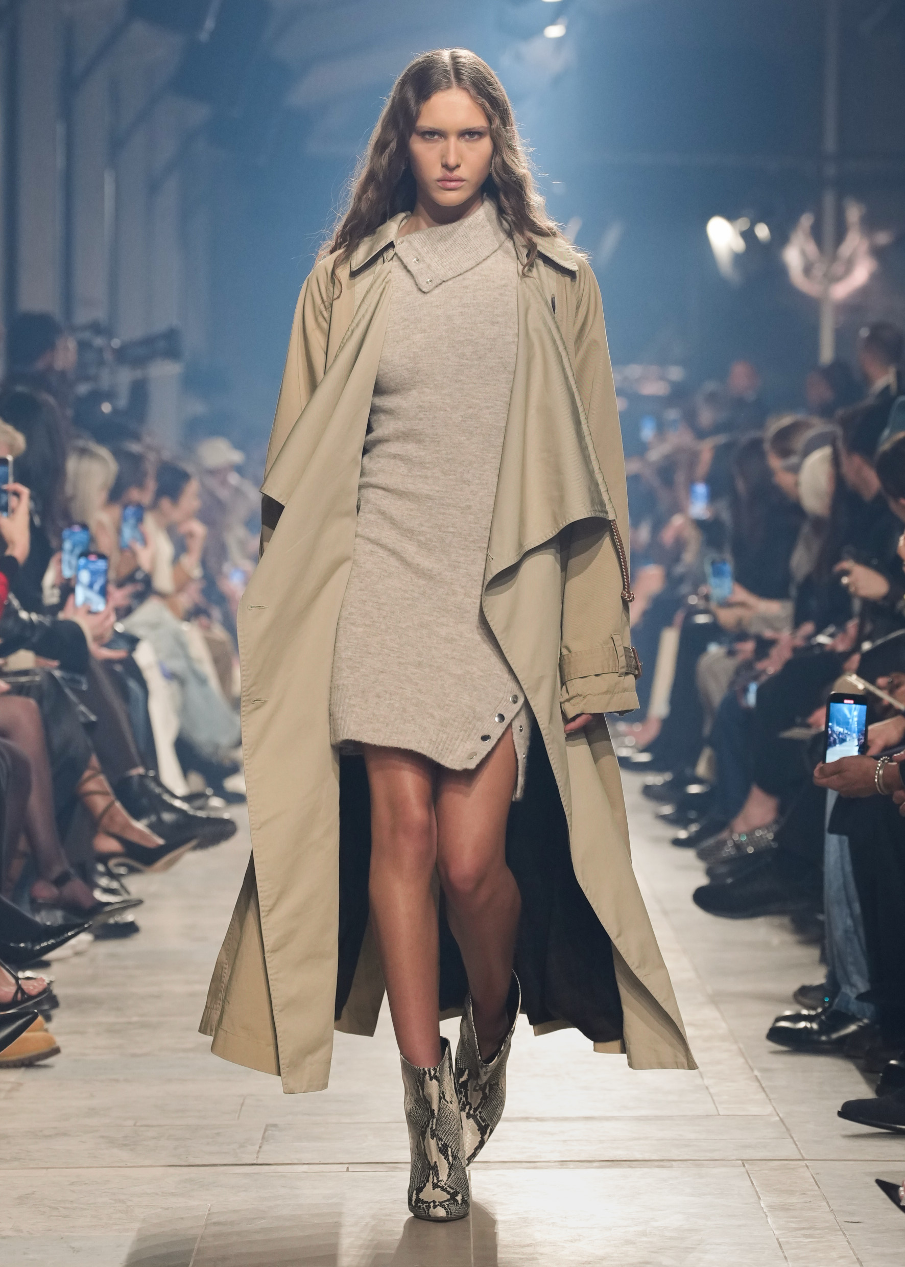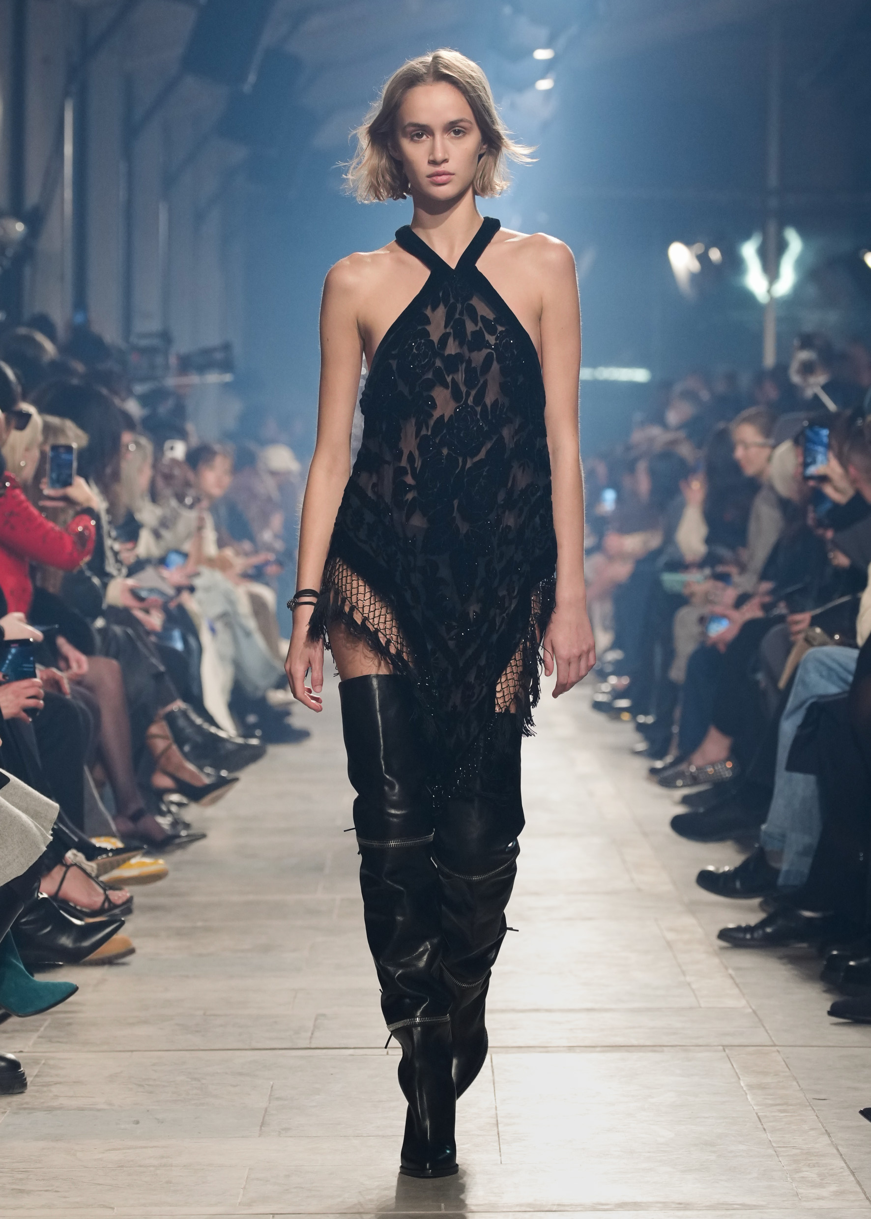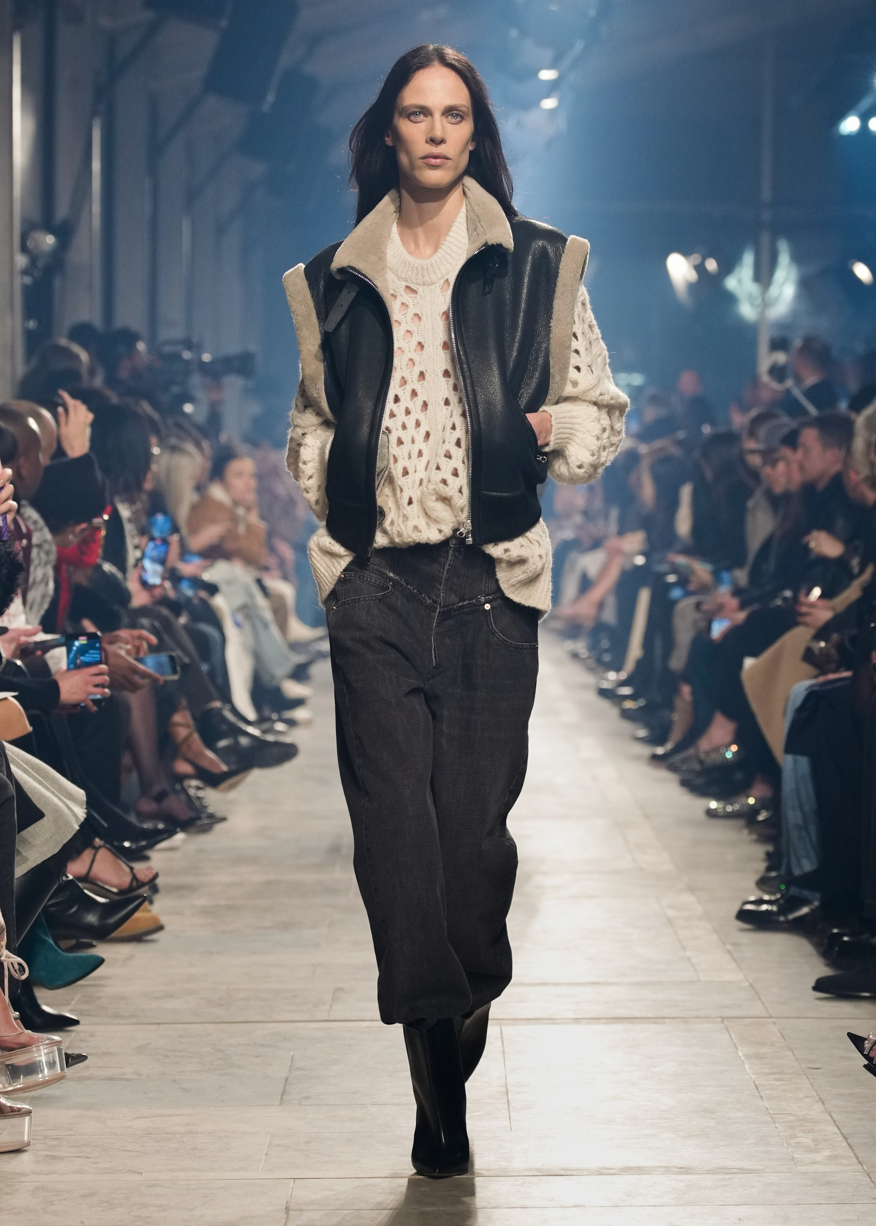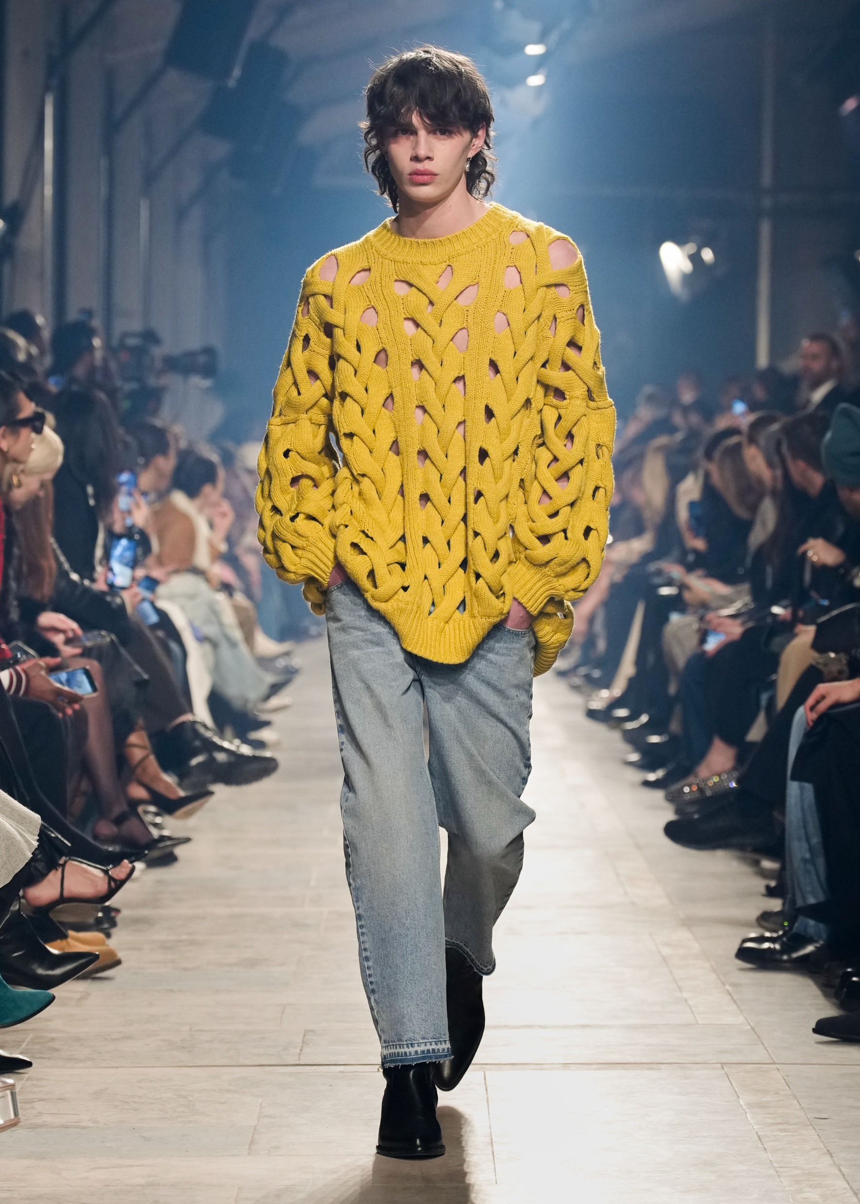 Les découpes graphiques de la flou créent de nouveaux décolletés tandis que les jeux de transparence révèlent subtilement des parties du corps. Ces tissus souples et féminins contrastent avec des tricots épais en câble, des denims teints, de la laine et des shearlings chauds.