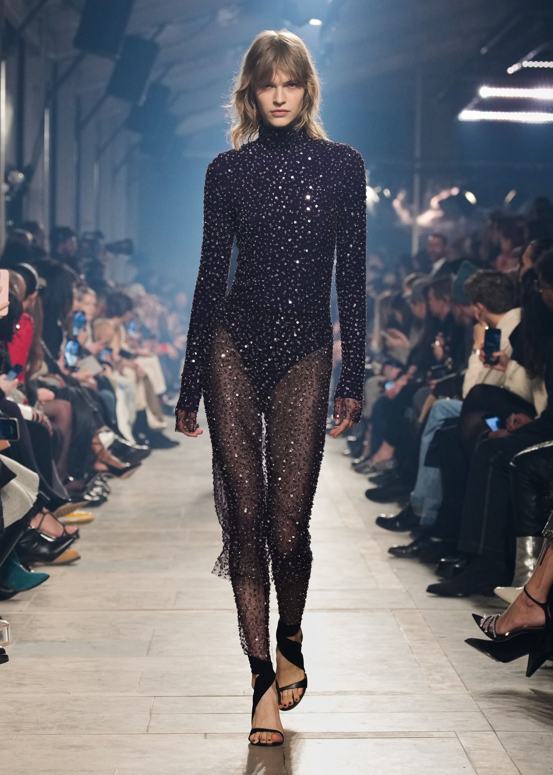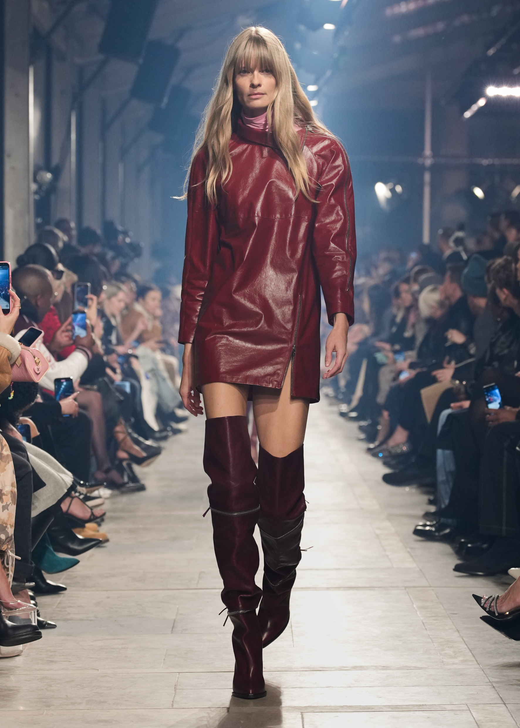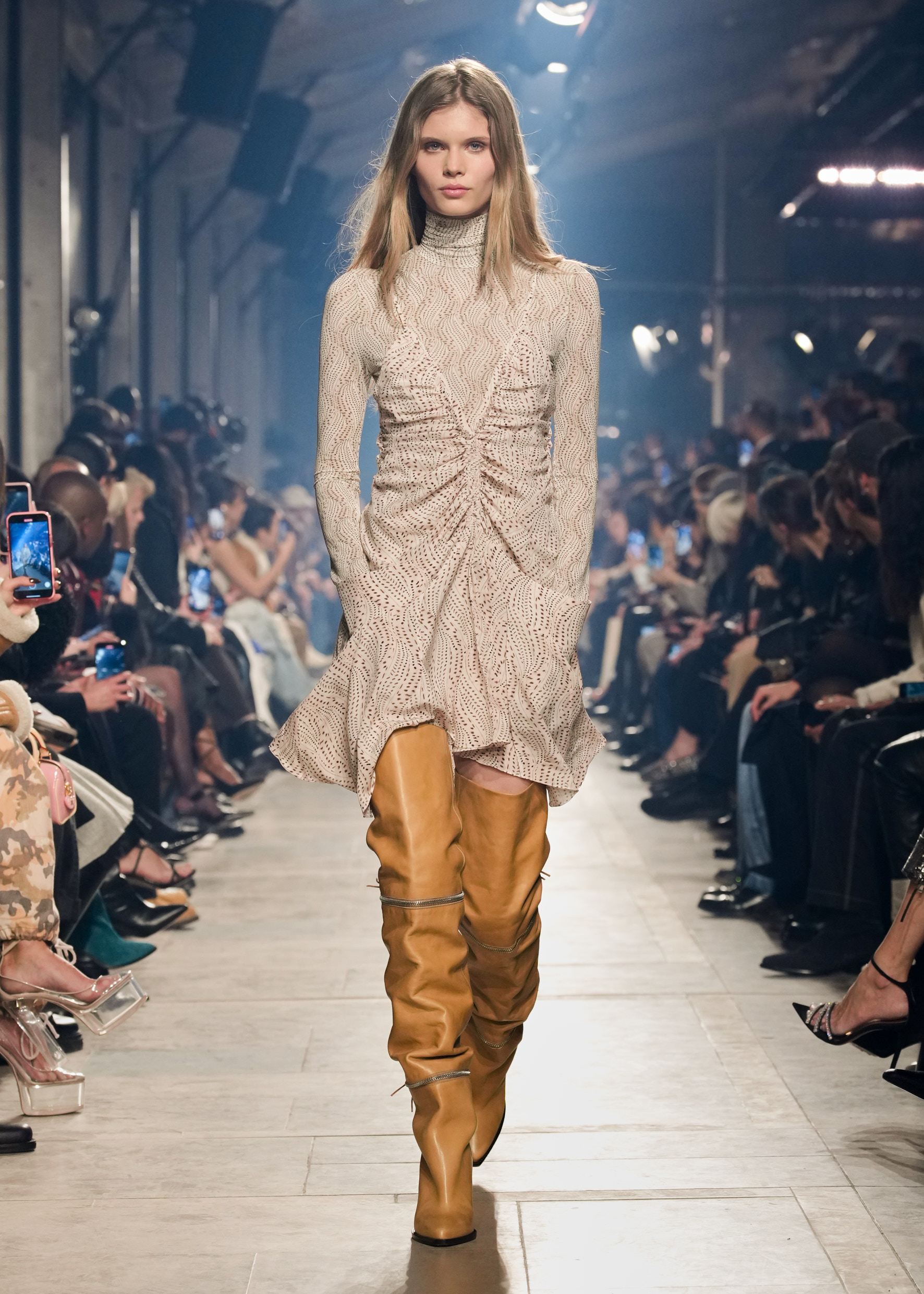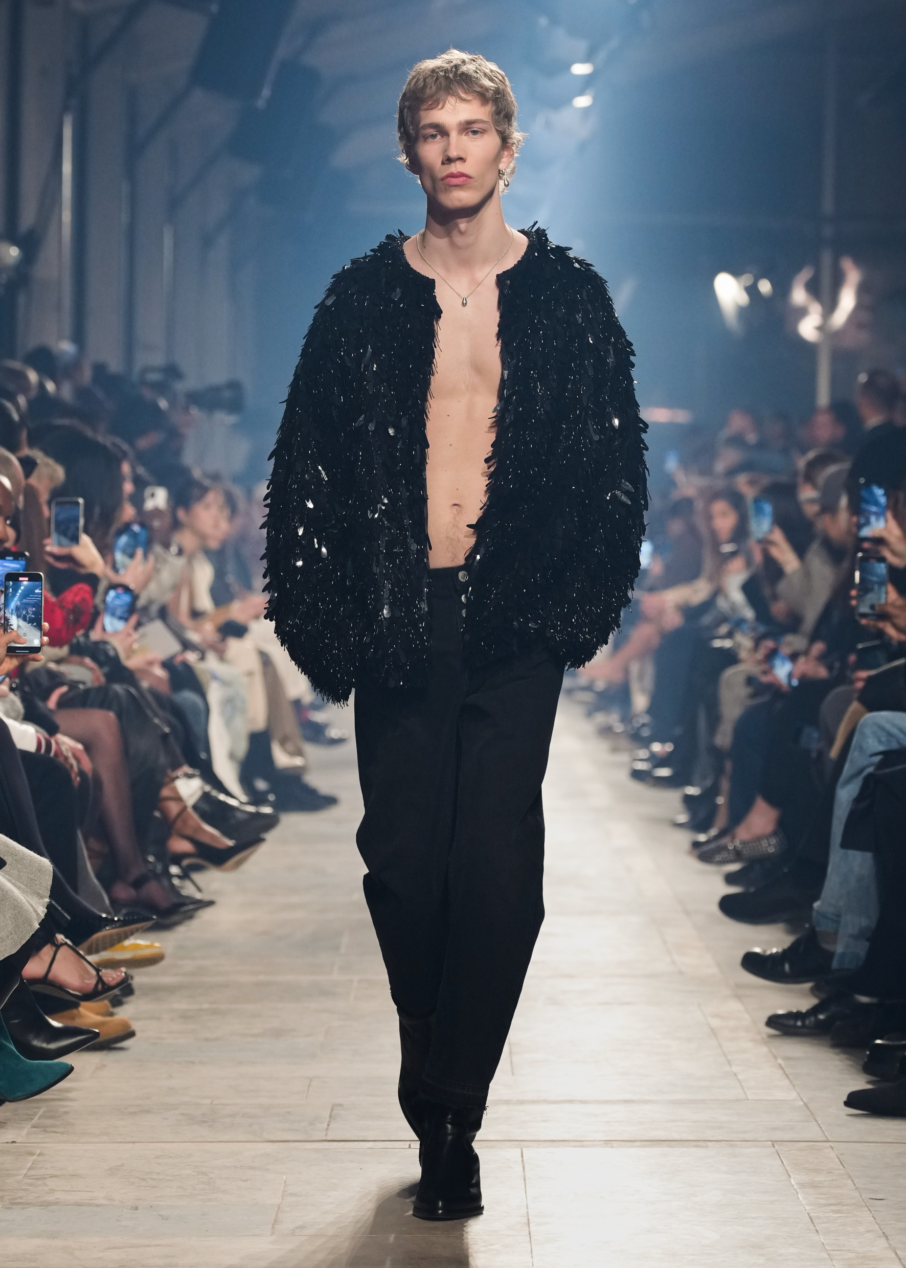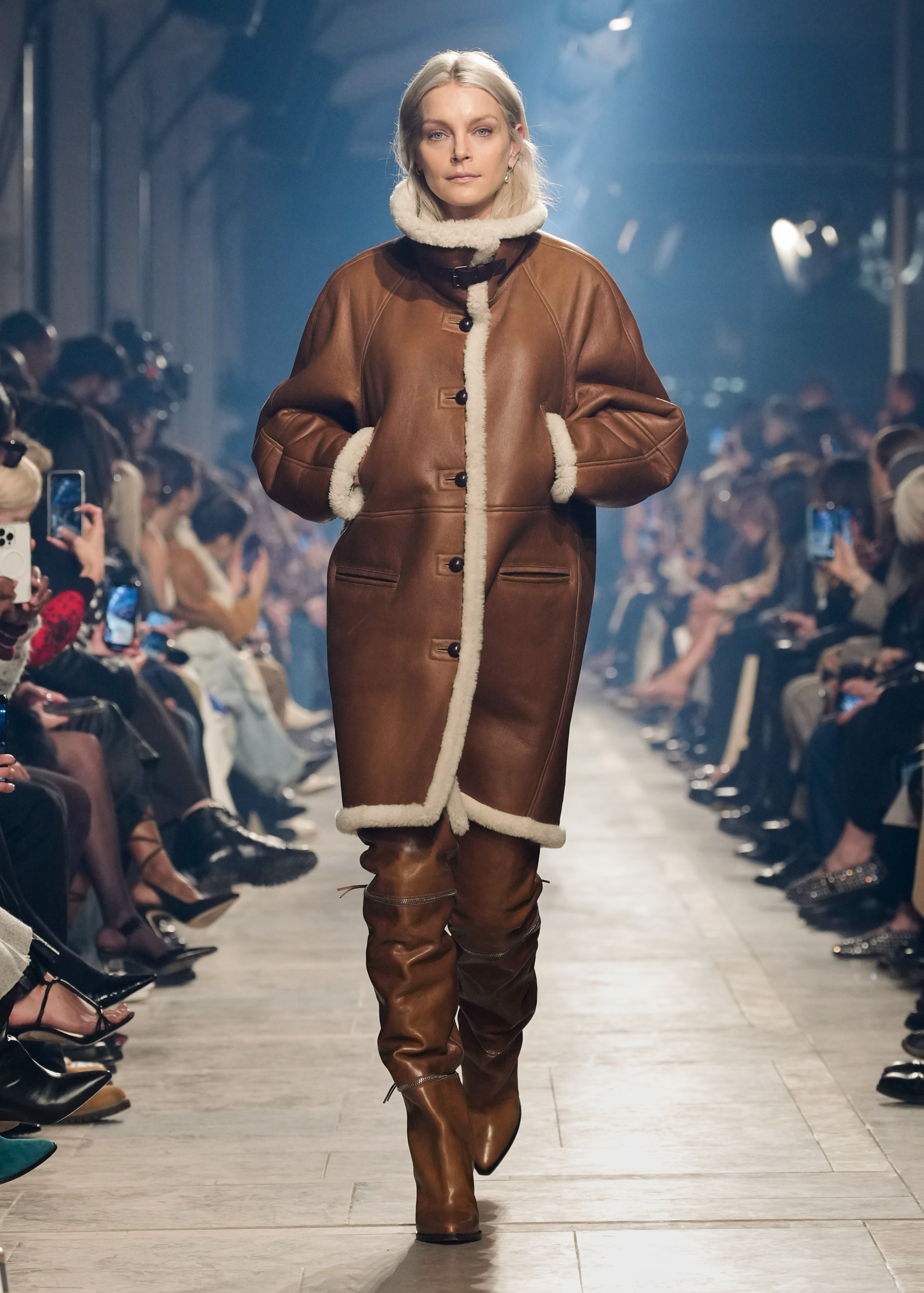 Les découpes graphiques de la flou créent de nouveaux décolletés tandis que les jeux de transparence révèlent subtilement des parties du corps. Ces tissus souples et féminins contrastent avec des tricots épais en câble, des denims teints, de la laine et des shearlings chauds.