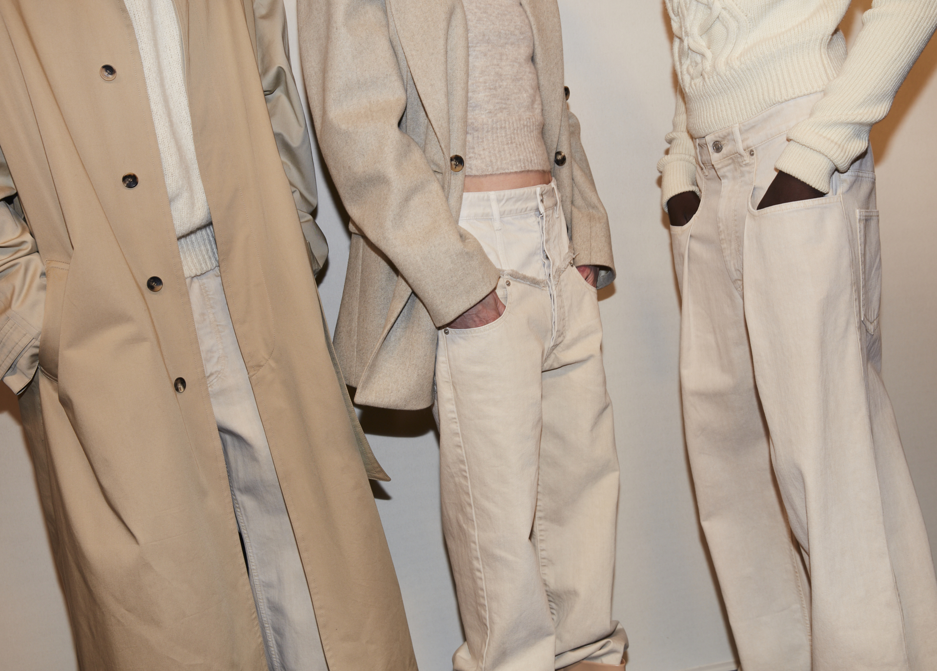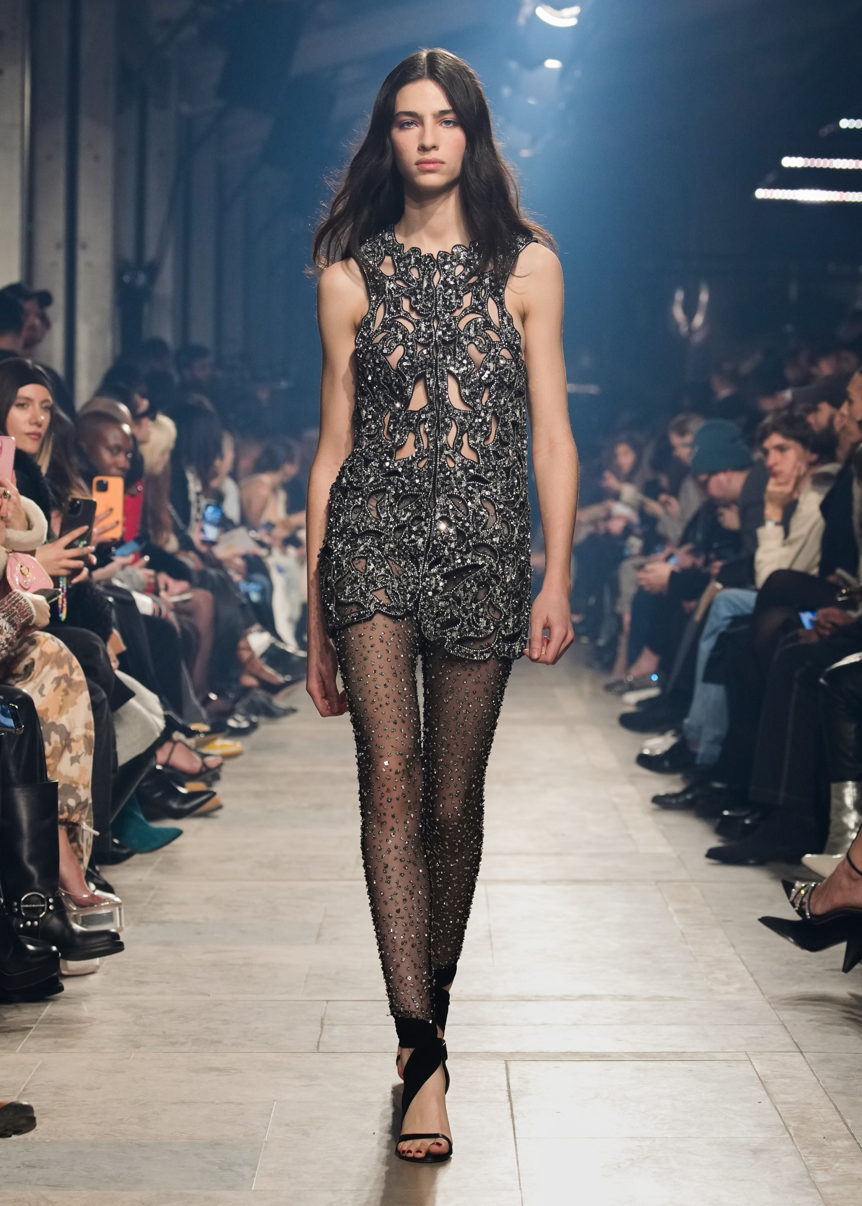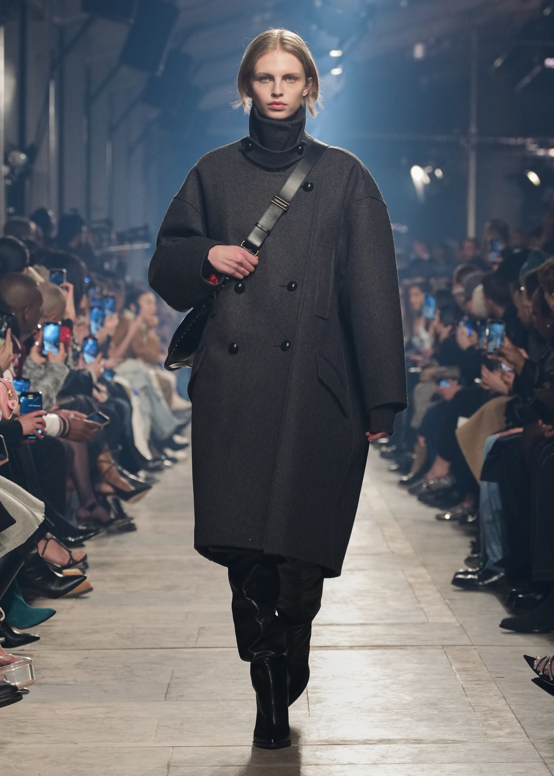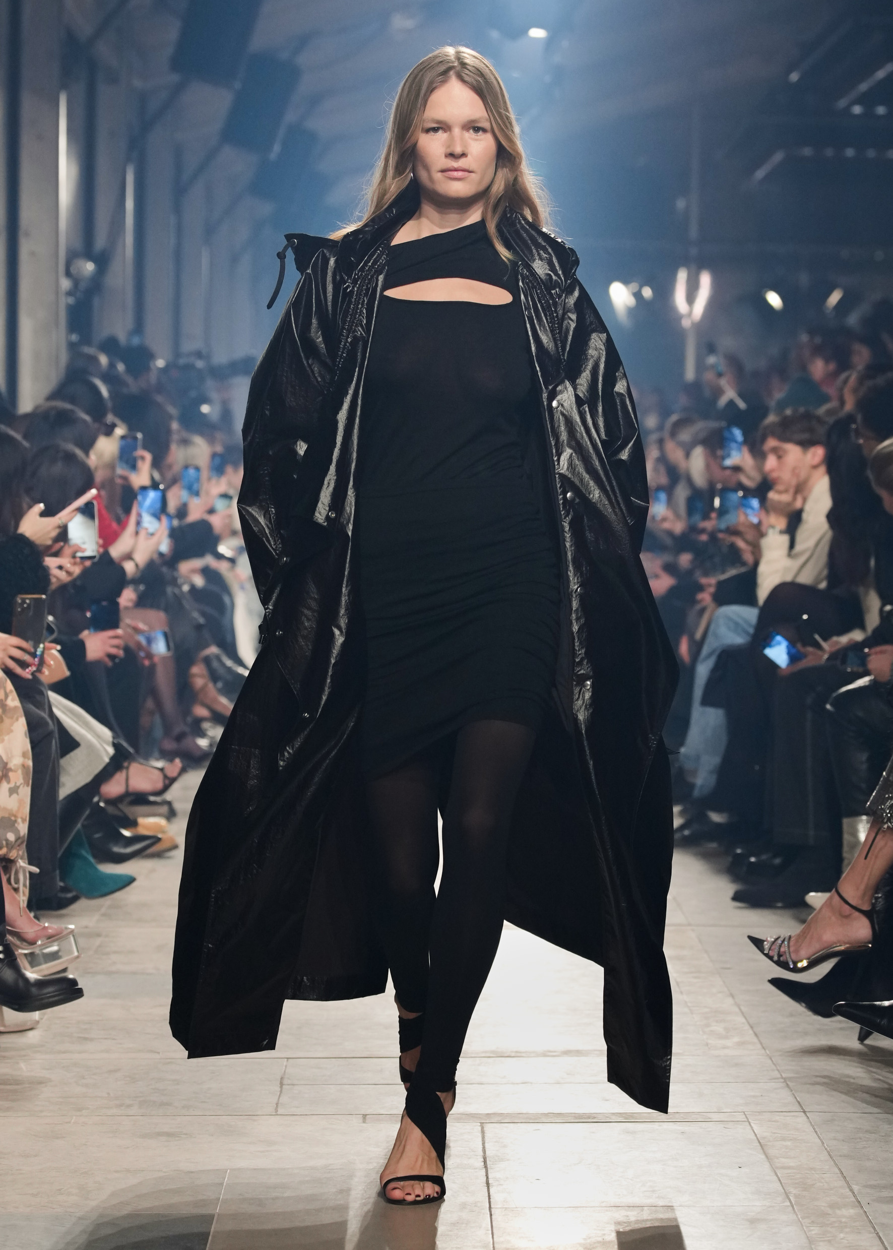 Les découpes graphiques de la flou créent de nouveaux décolletés tandis que les jeux de transparence révèlent subtilement des parties du corps. Ces tissus souples et féminins contrastent avec des tricots épais en câble, des denims teints, de la laine et des shearlings chauds.